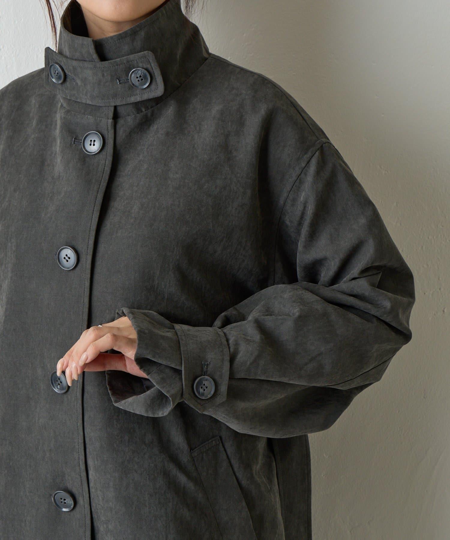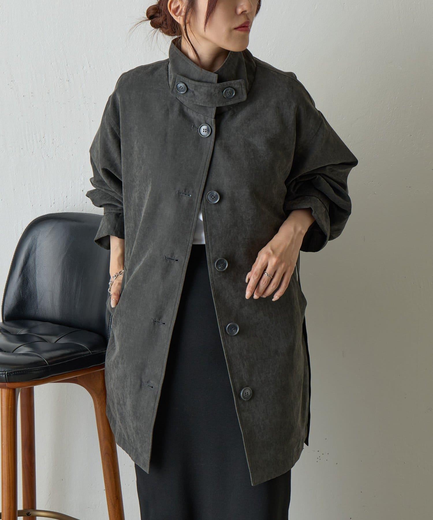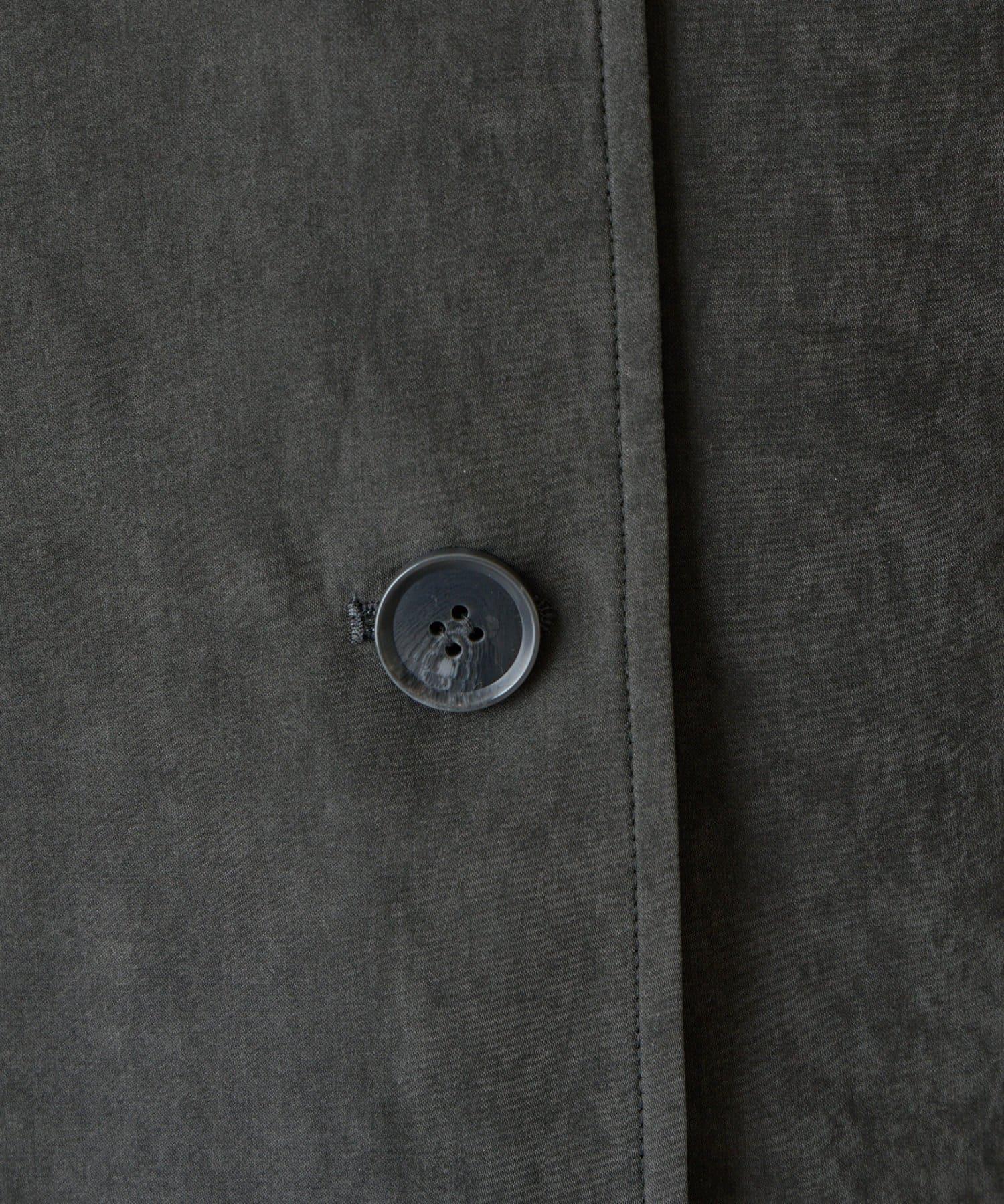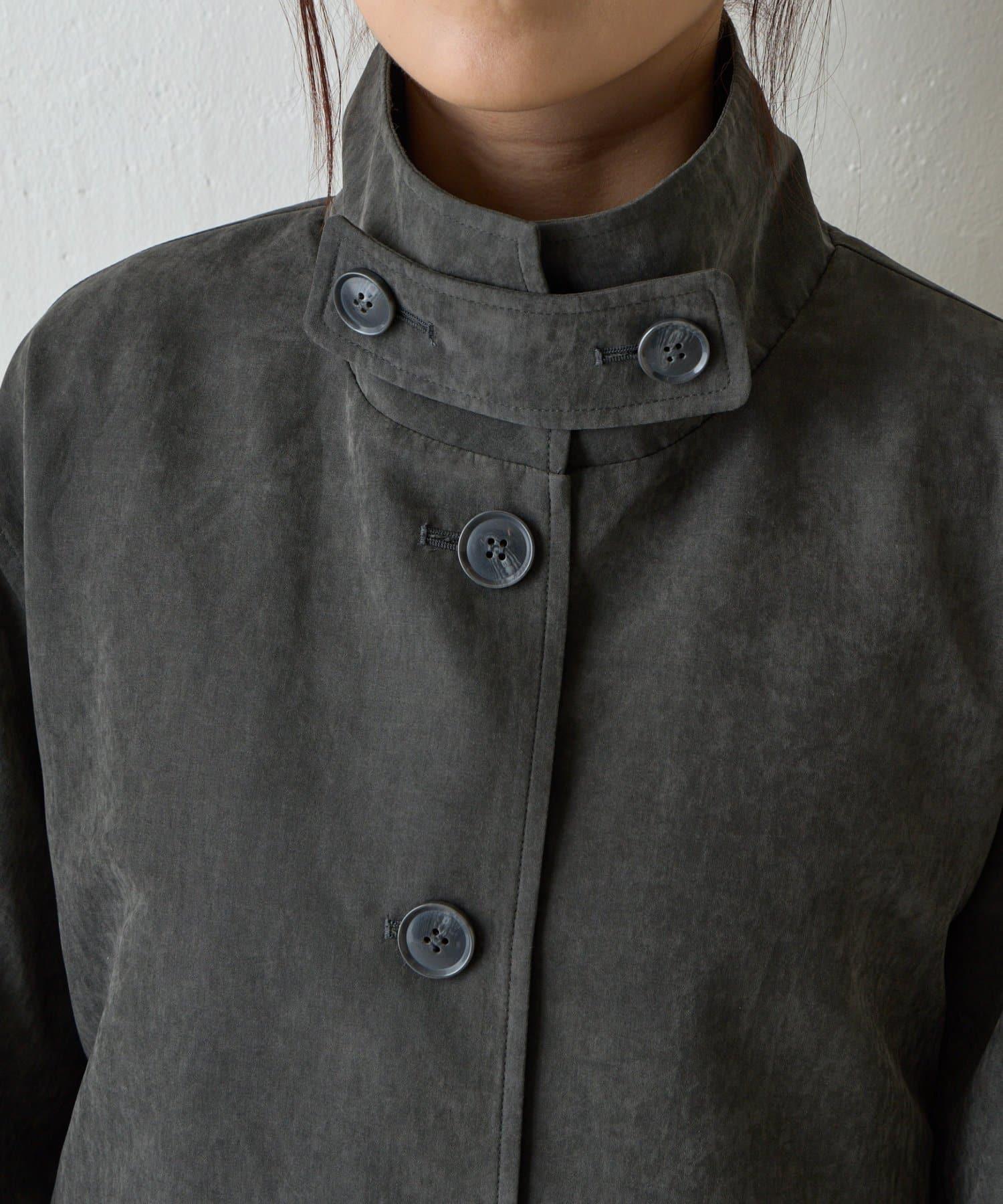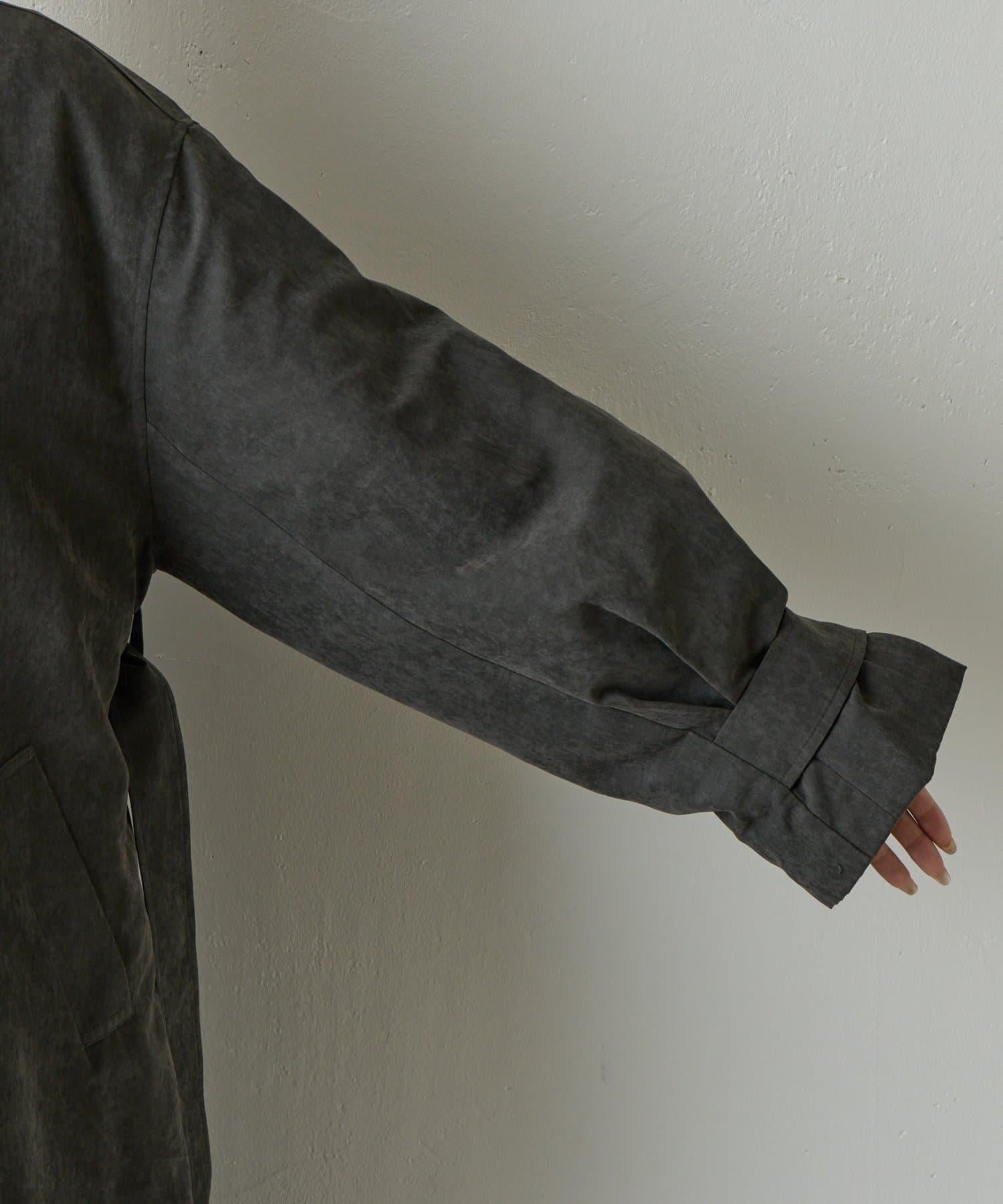 這款中款風衣採用略帶拉毛的桃皮材質製成,具有優雅的光澤和柔軟的觸感。