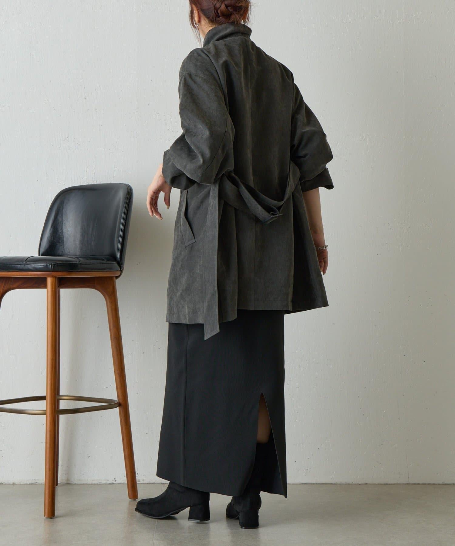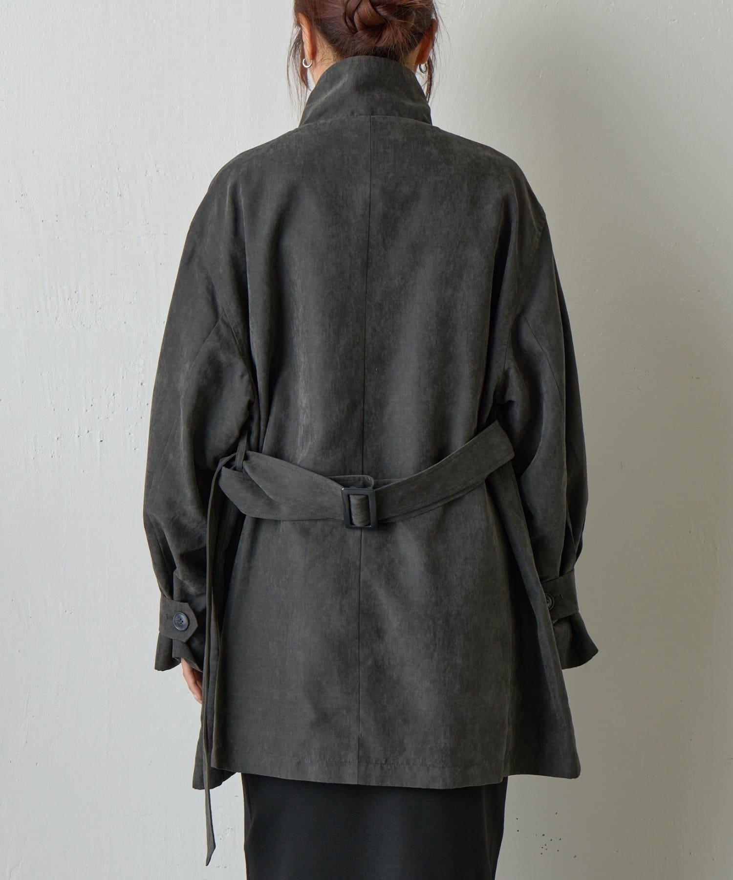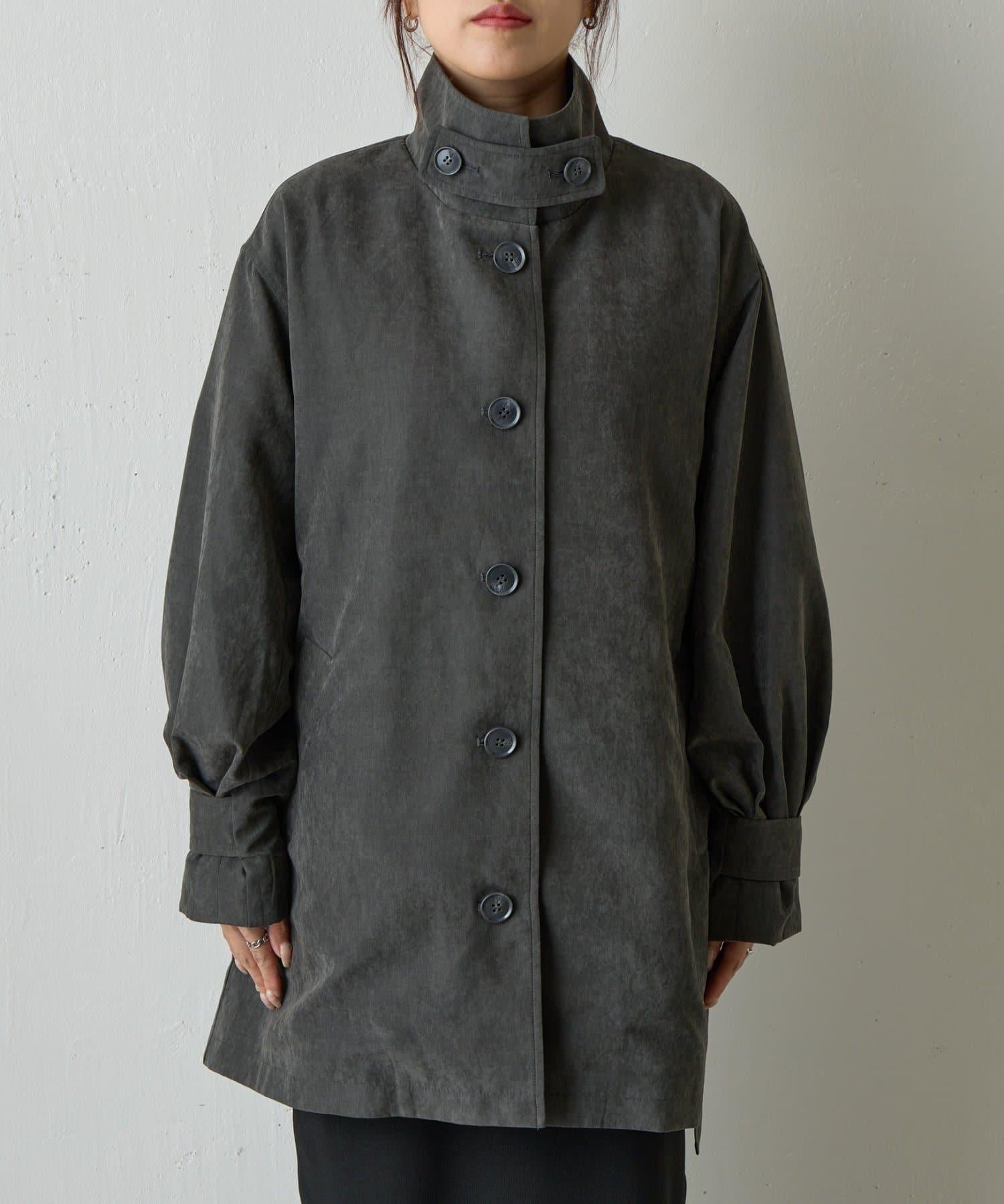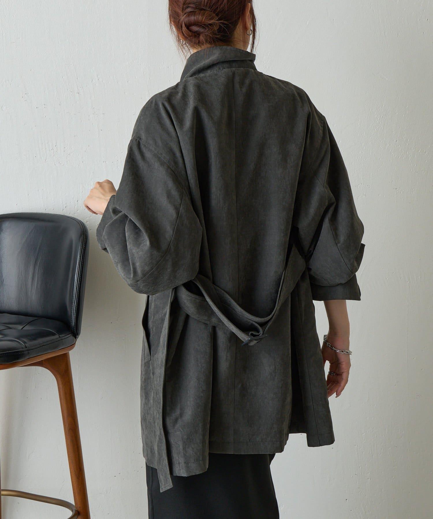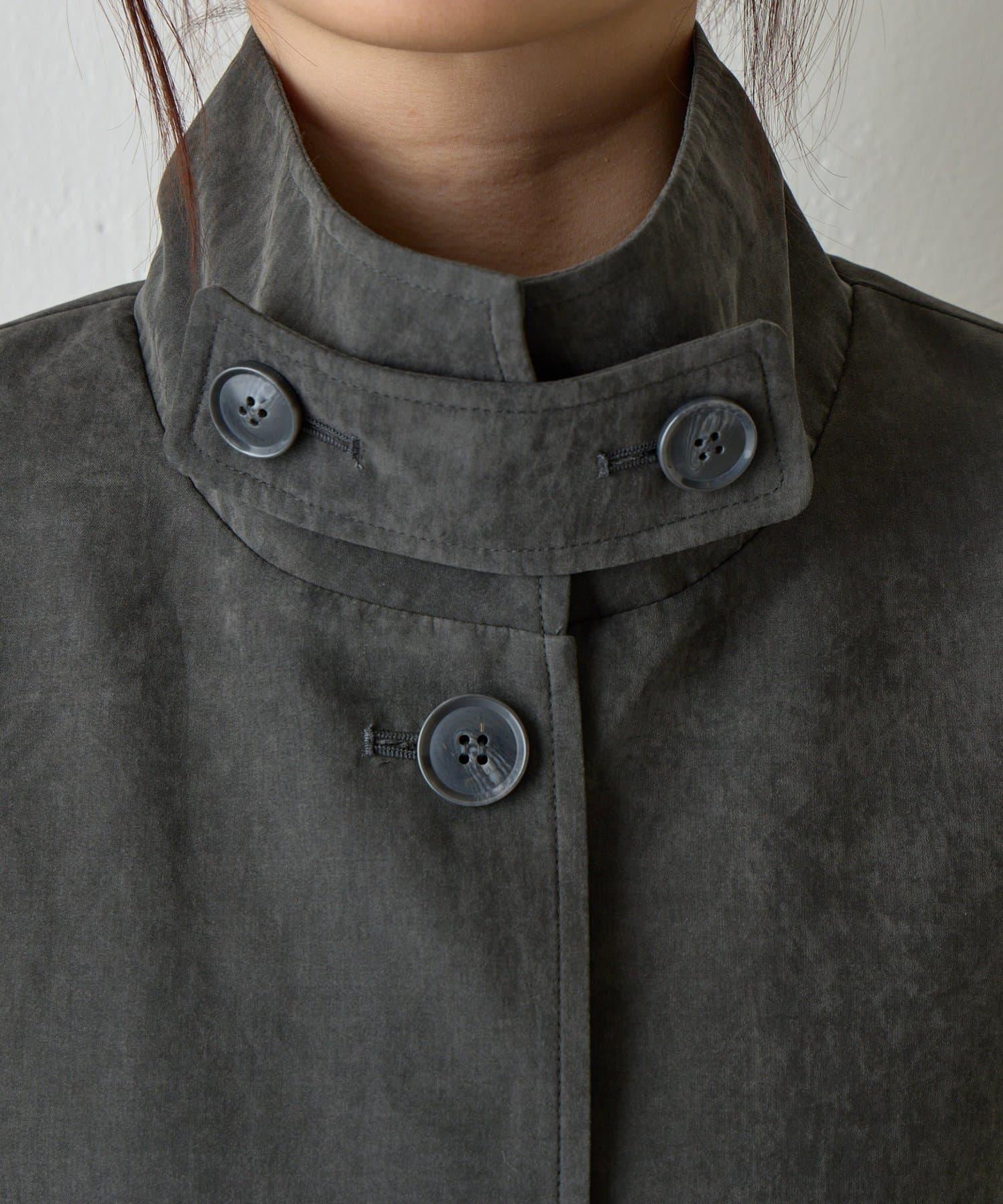 這款中款風衣採用略帶拉毛的桃皮材質製成,具有優雅的光澤和柔軟的觸感。