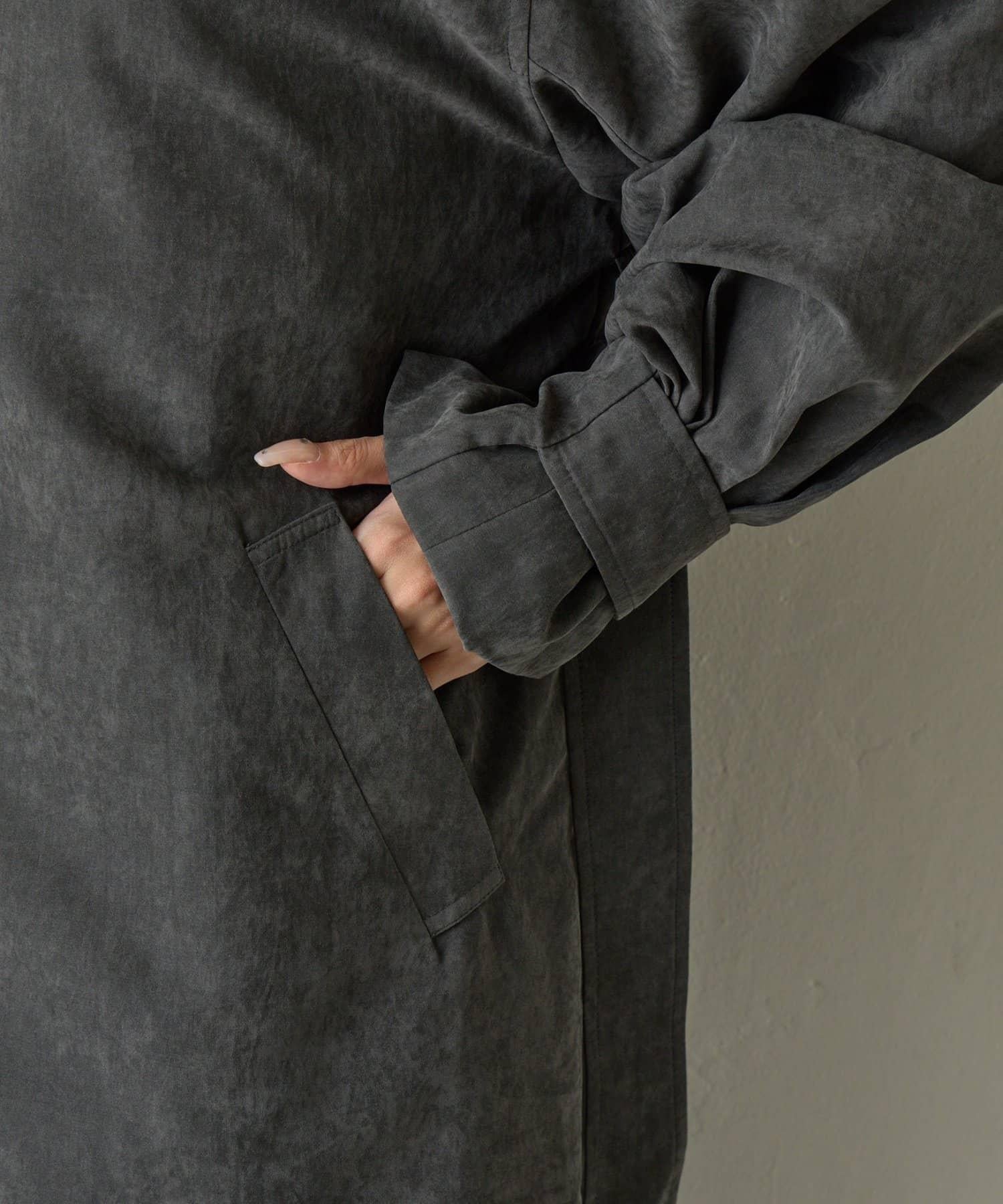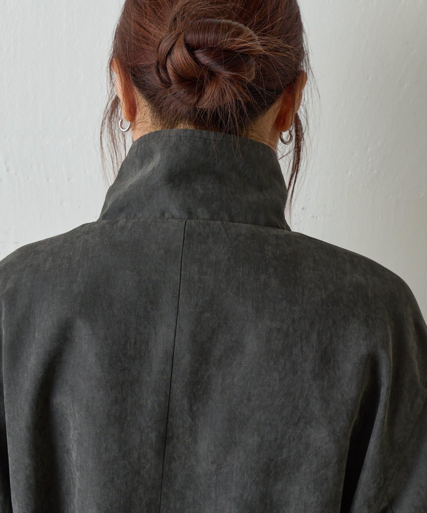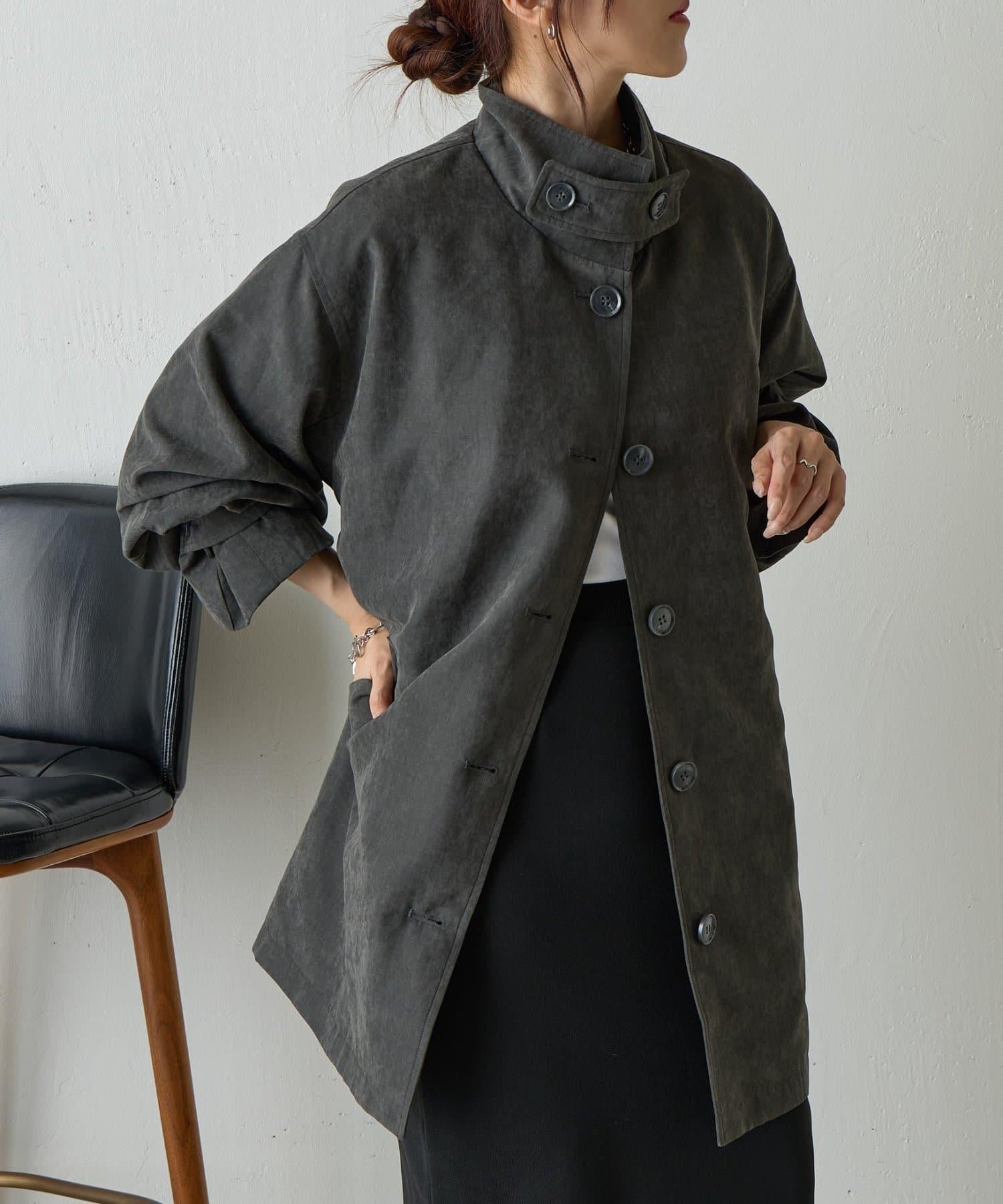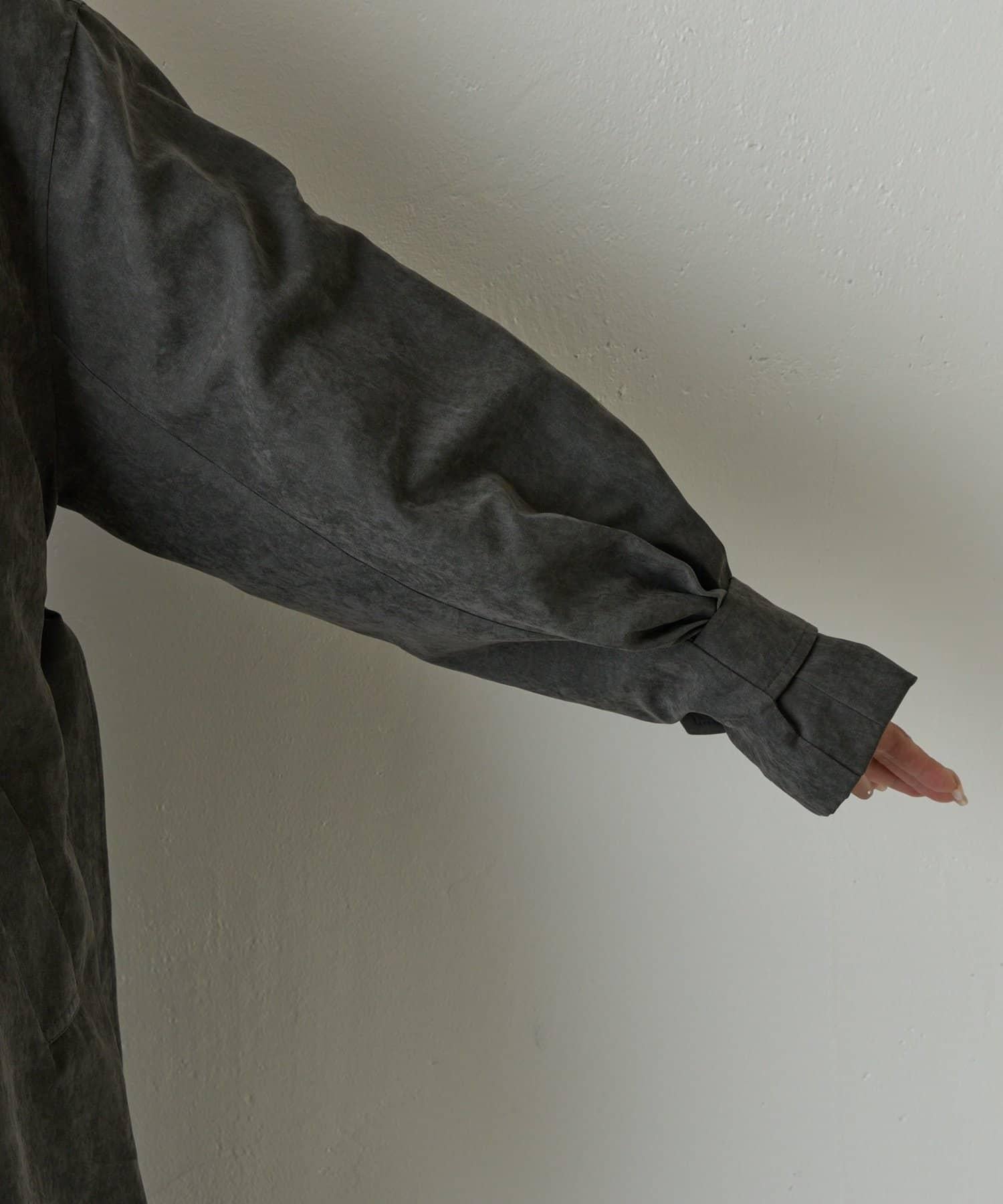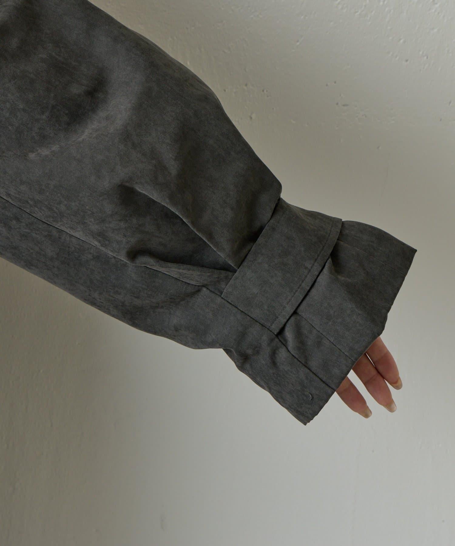 這款中款風衣採用略帶拉毛的桃皮材質製成,具有優雅的光澤和柔軟的觸感。