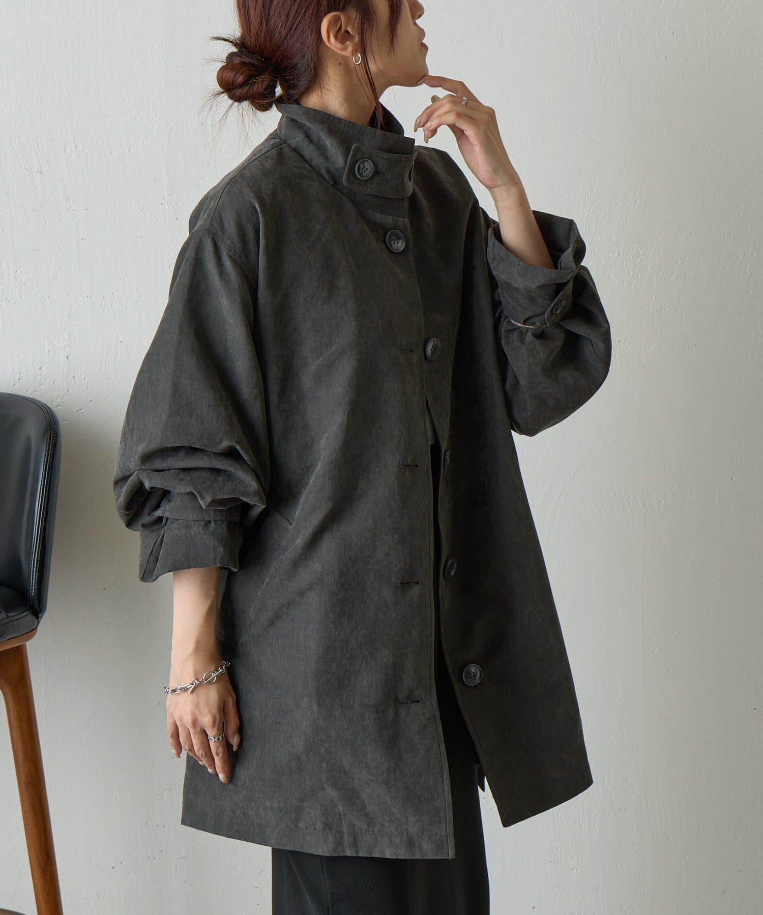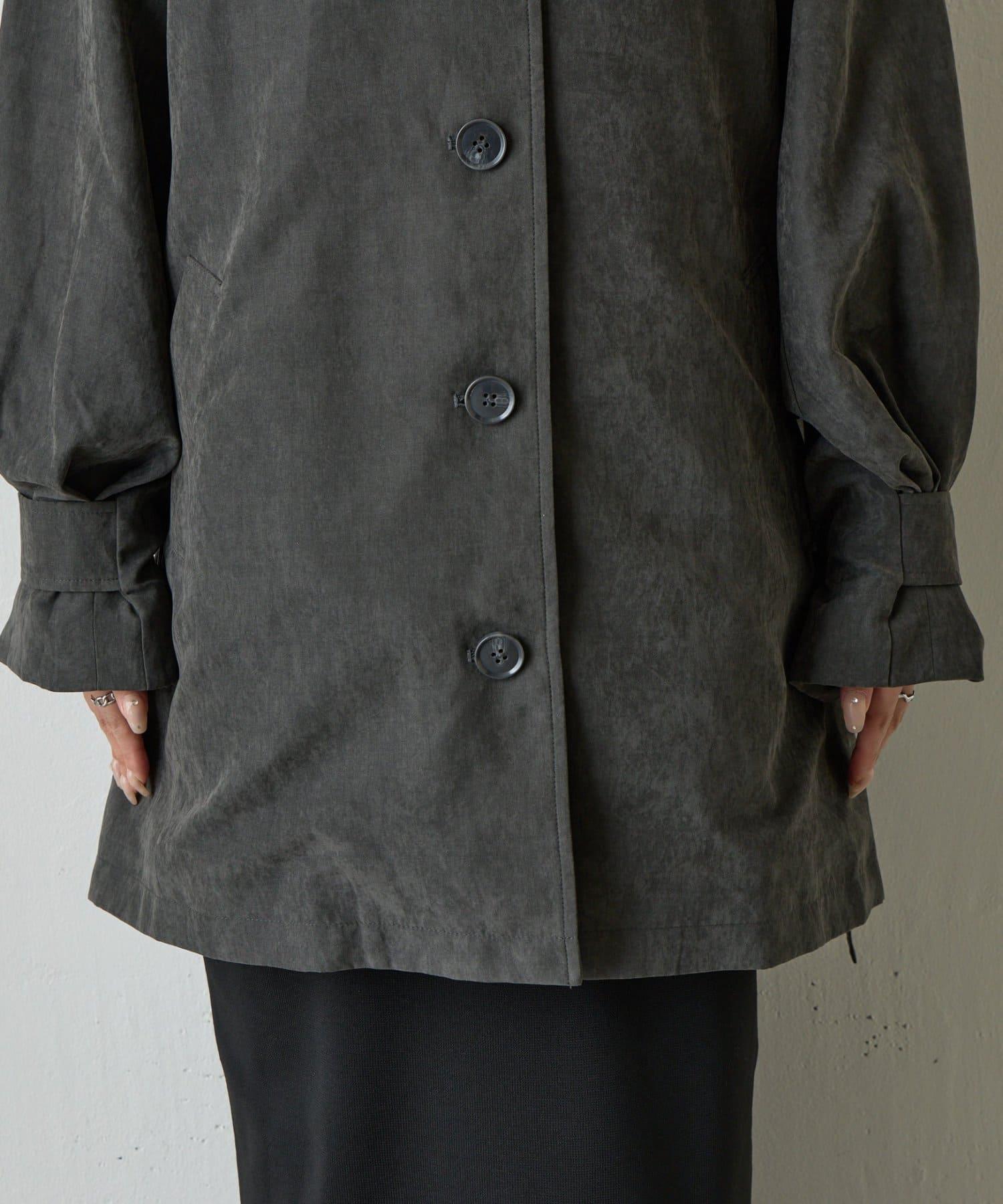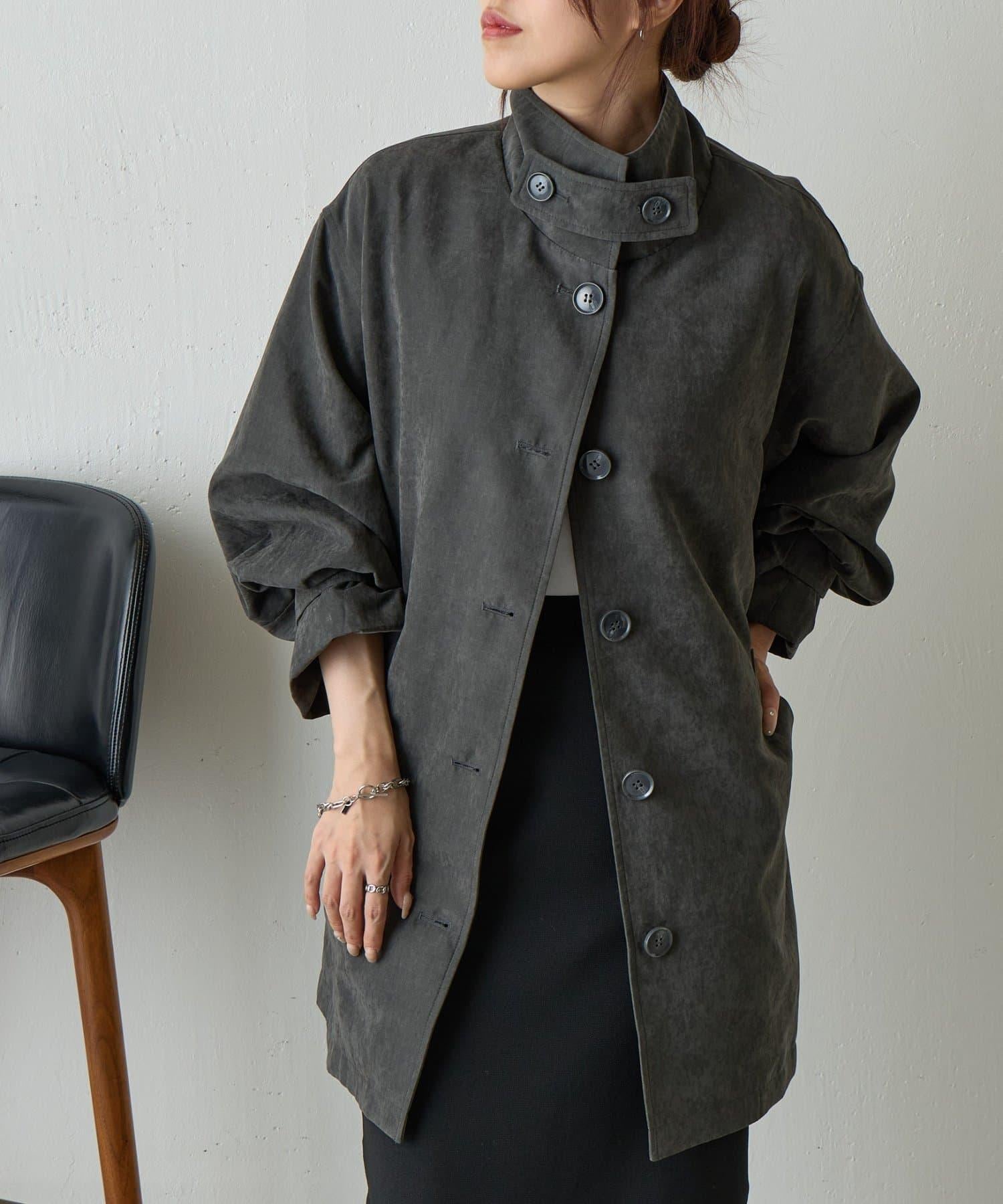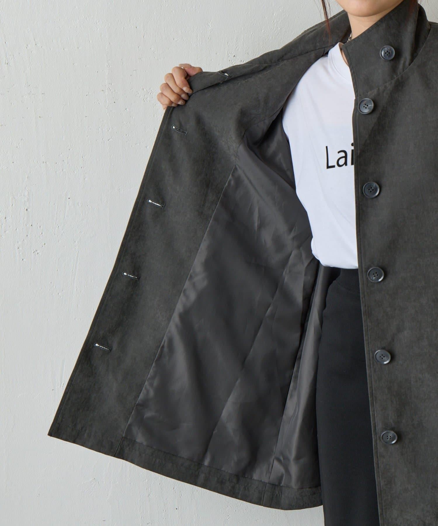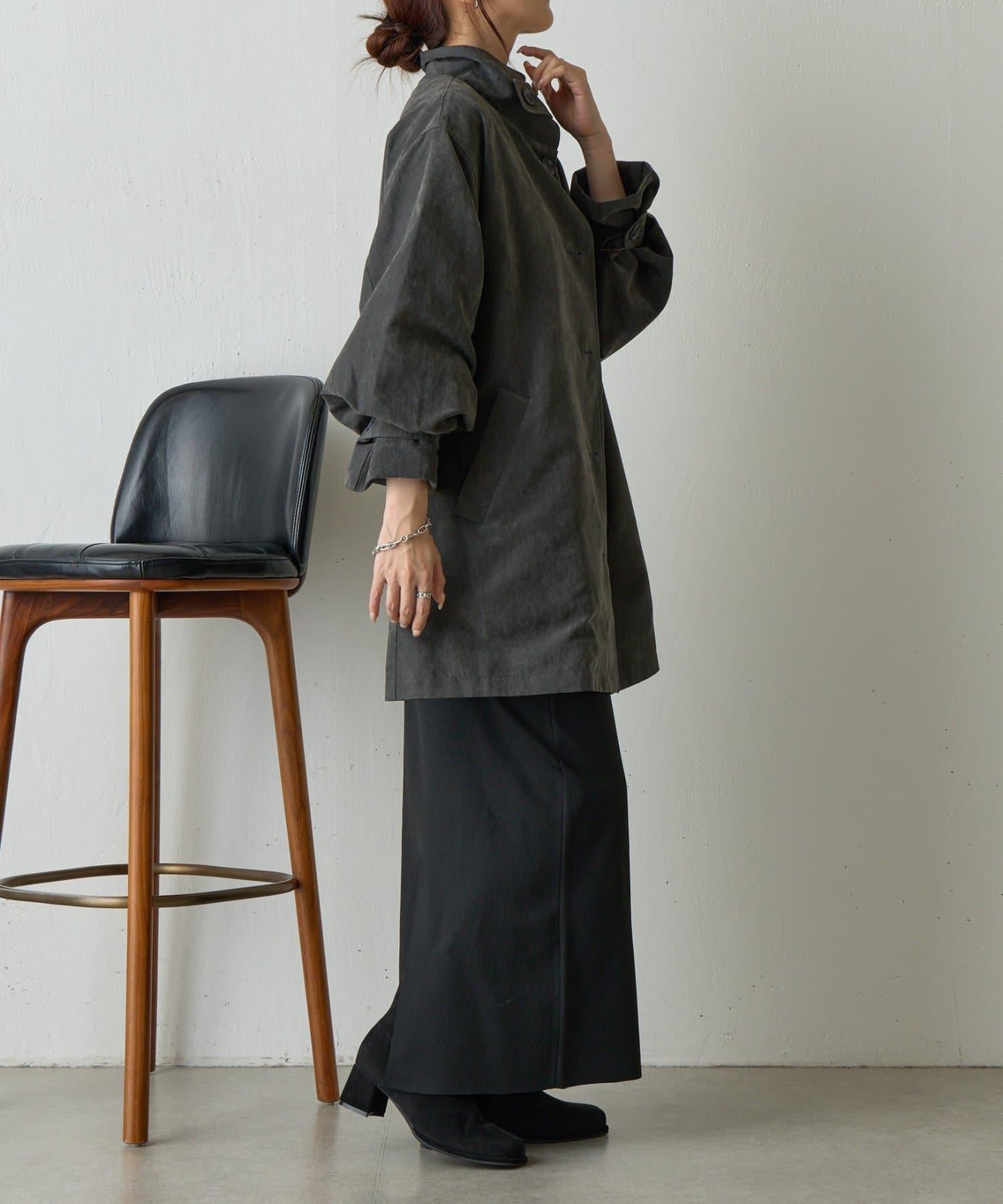 這款中款風衣採用略帶拉毛的桃皮材質製成,具有優雅的光澤和柔軟的觸感。