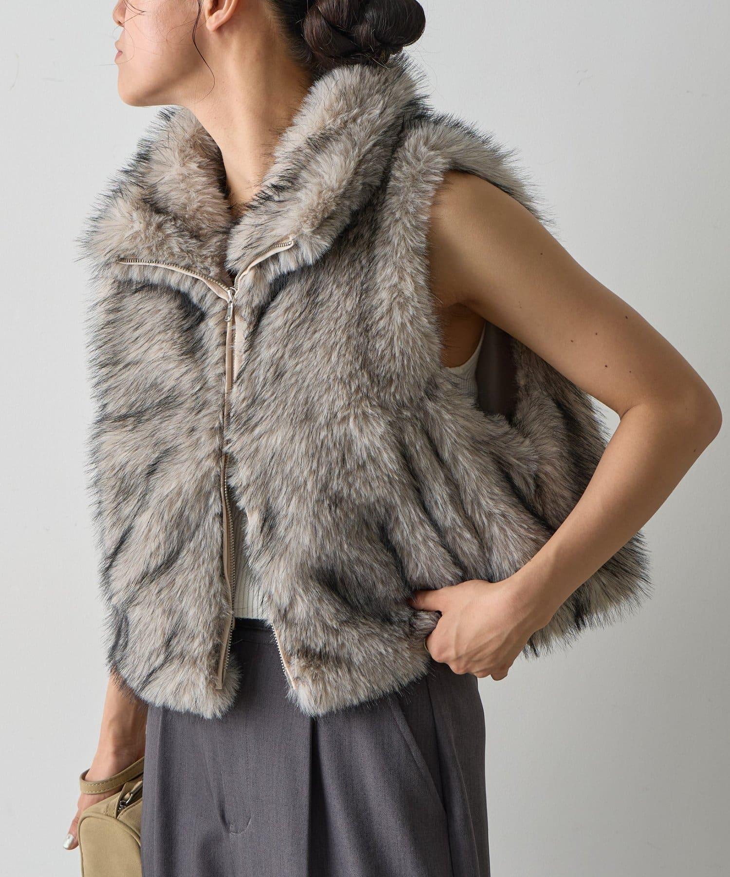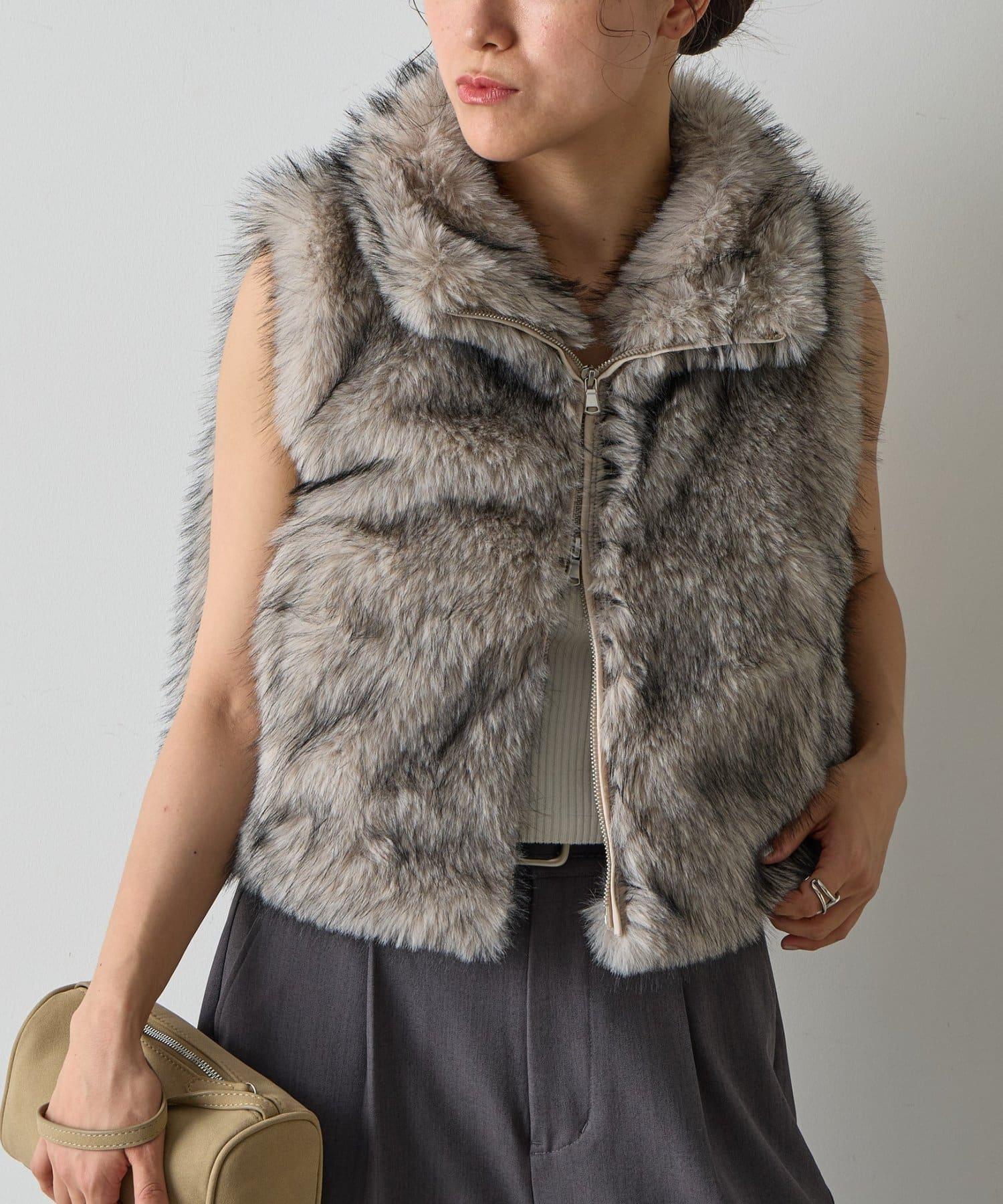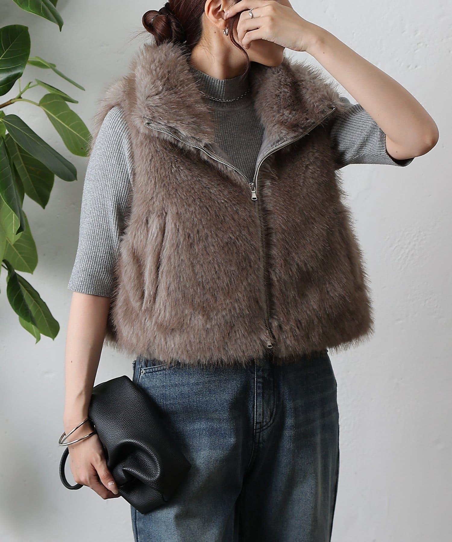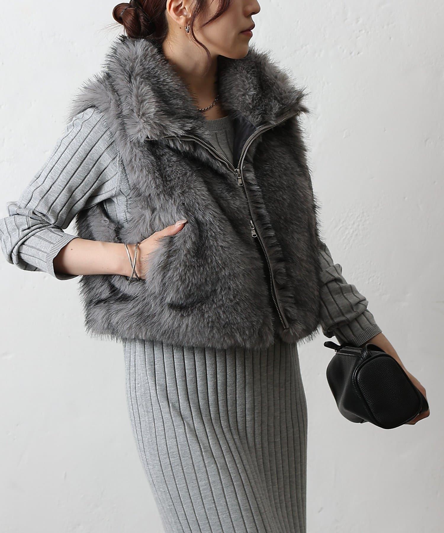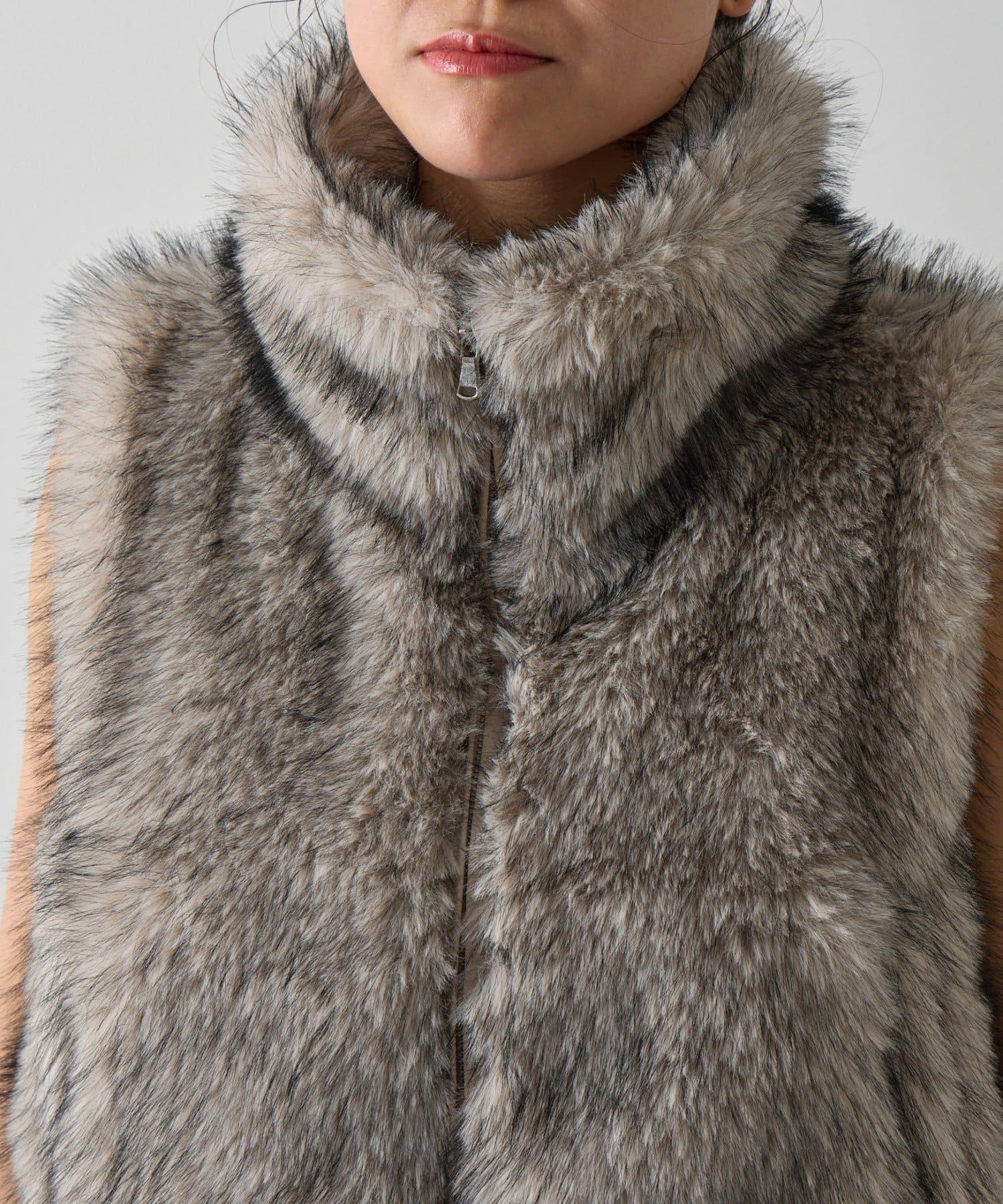 混合羊皮毛皮的拉鍊馬甲,給人豐富而精緻的混合毛皮印象,富有層次感。