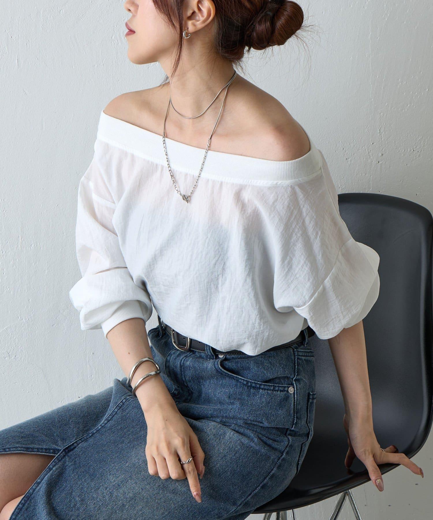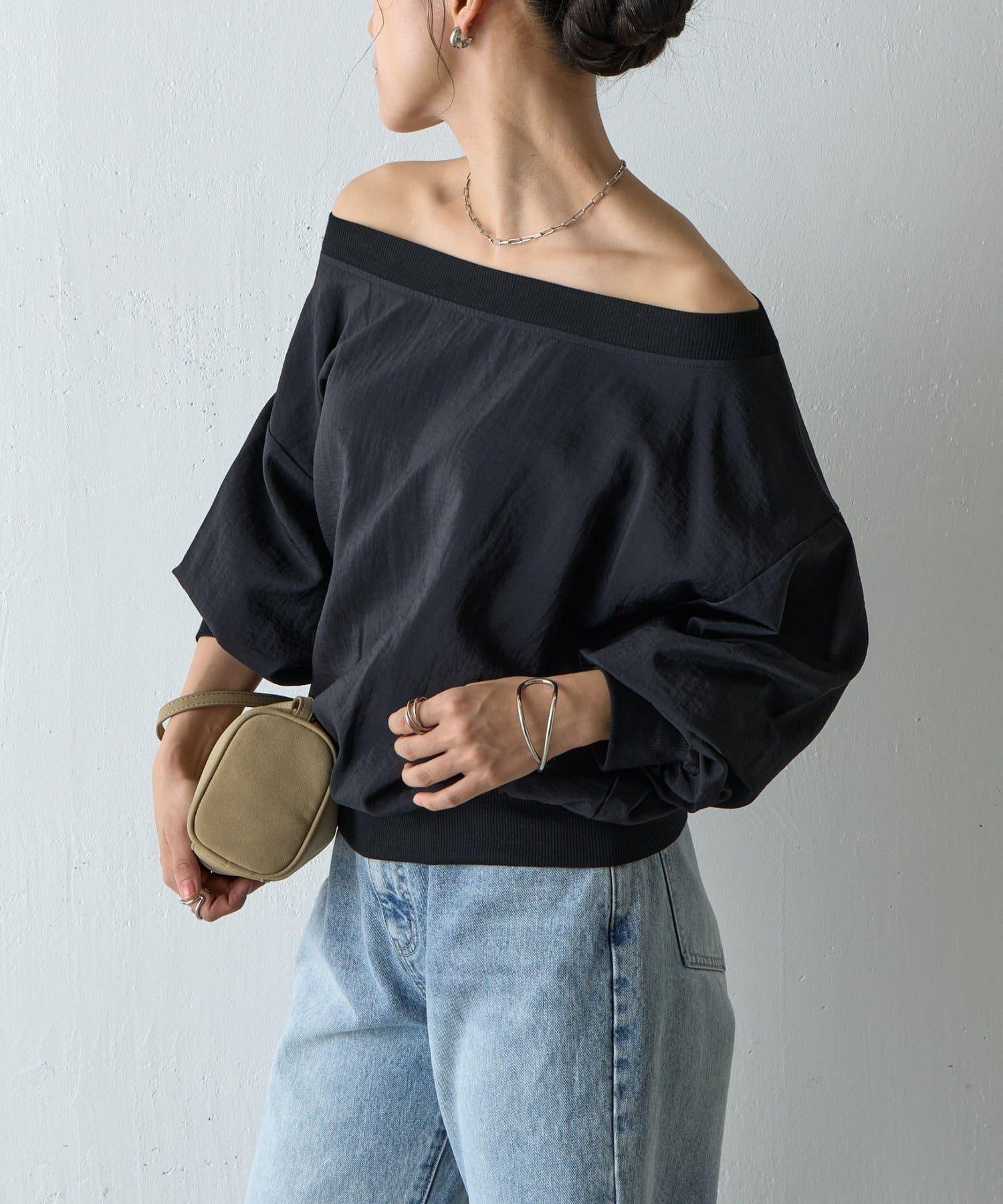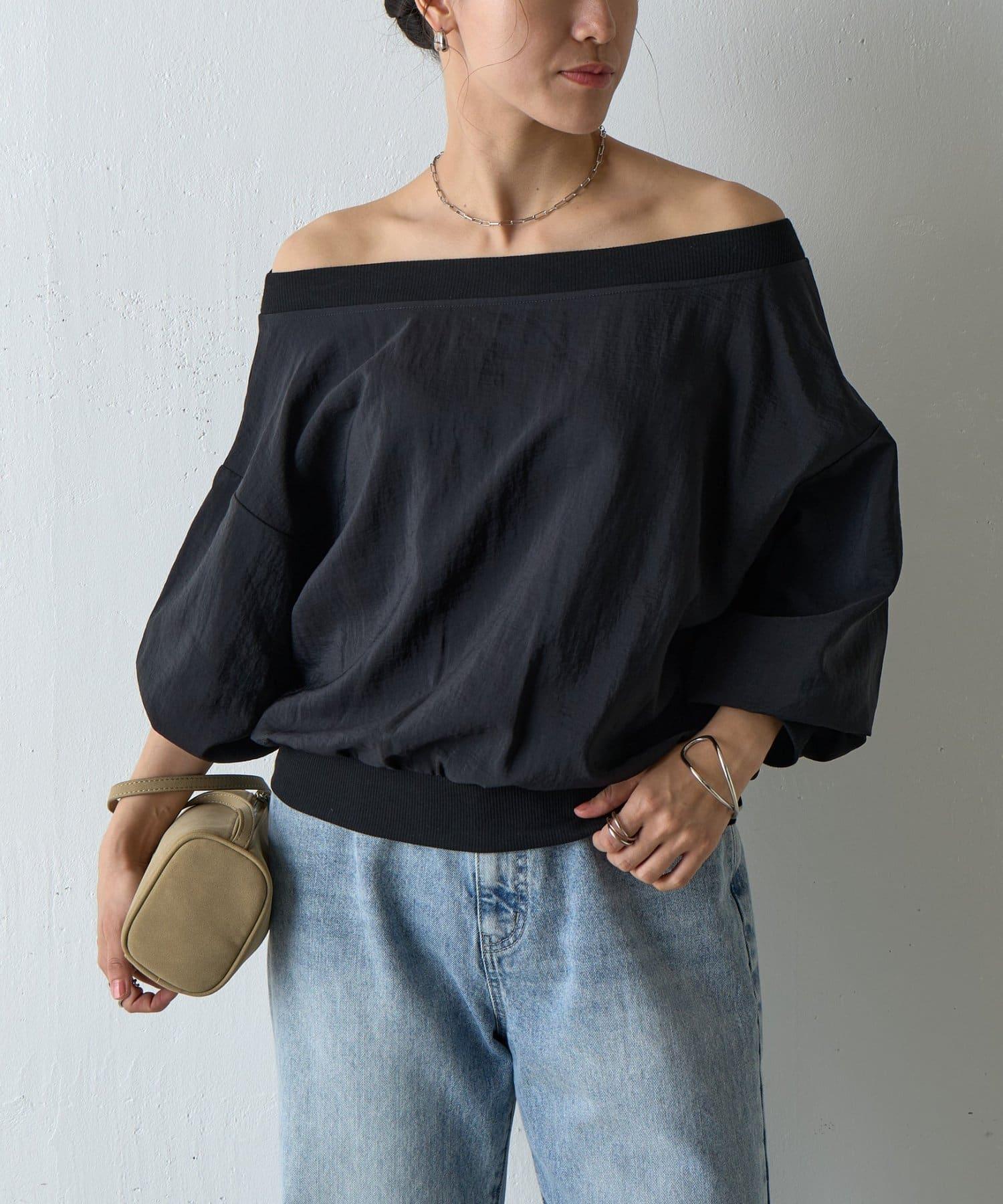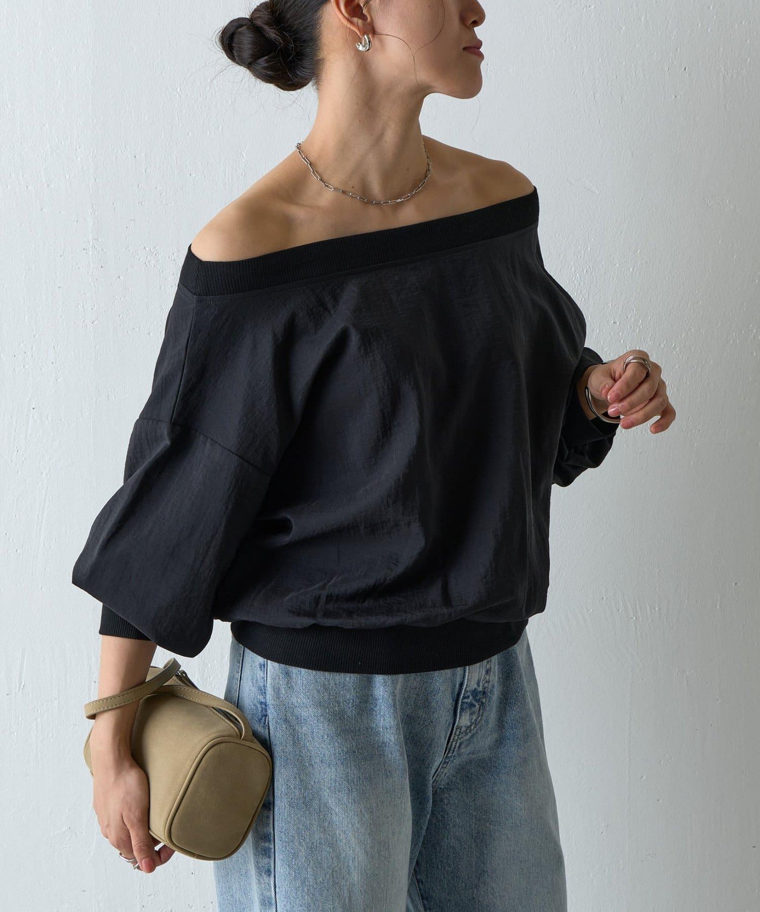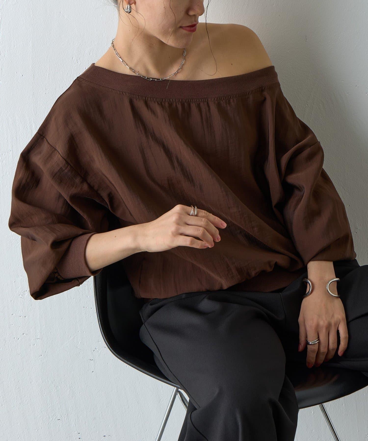 微微的光澤感非常時髦。露肩套頭衫,透薄輕盈。