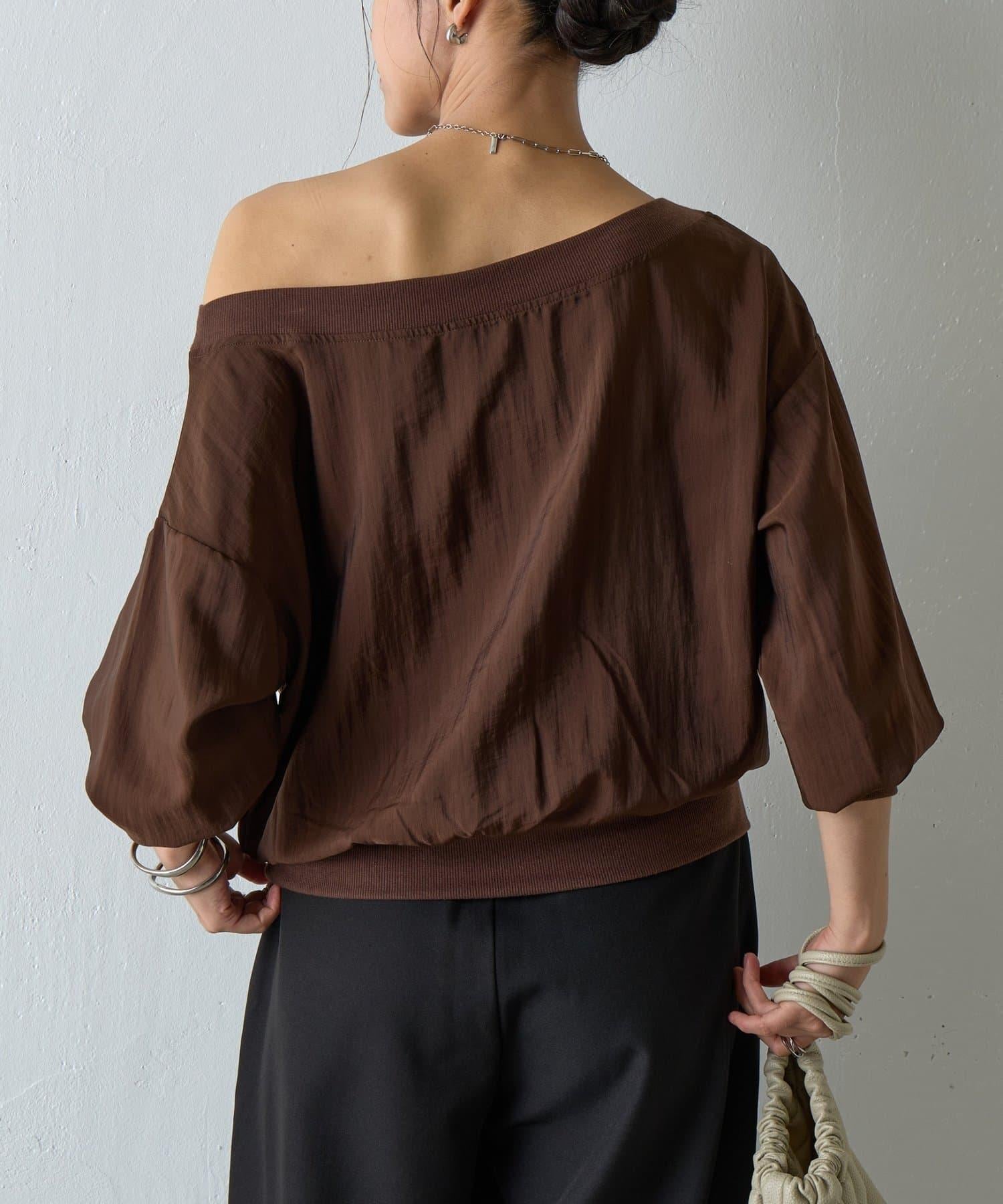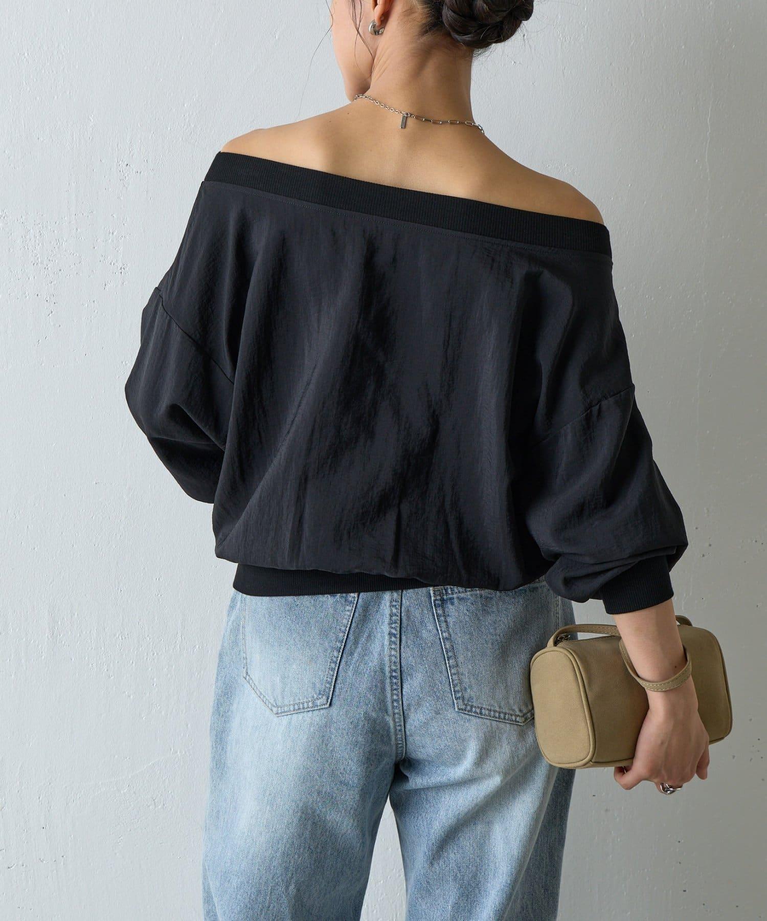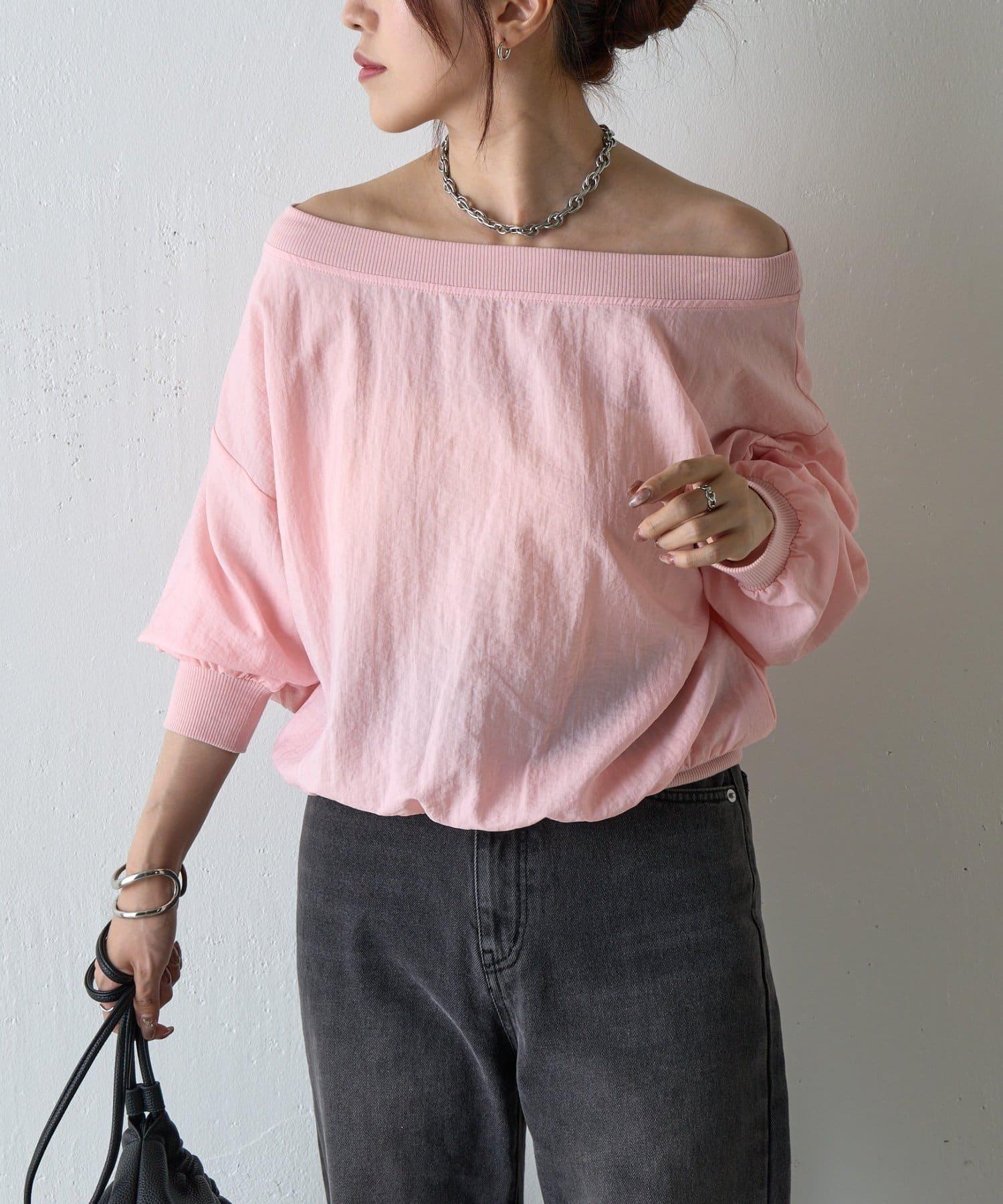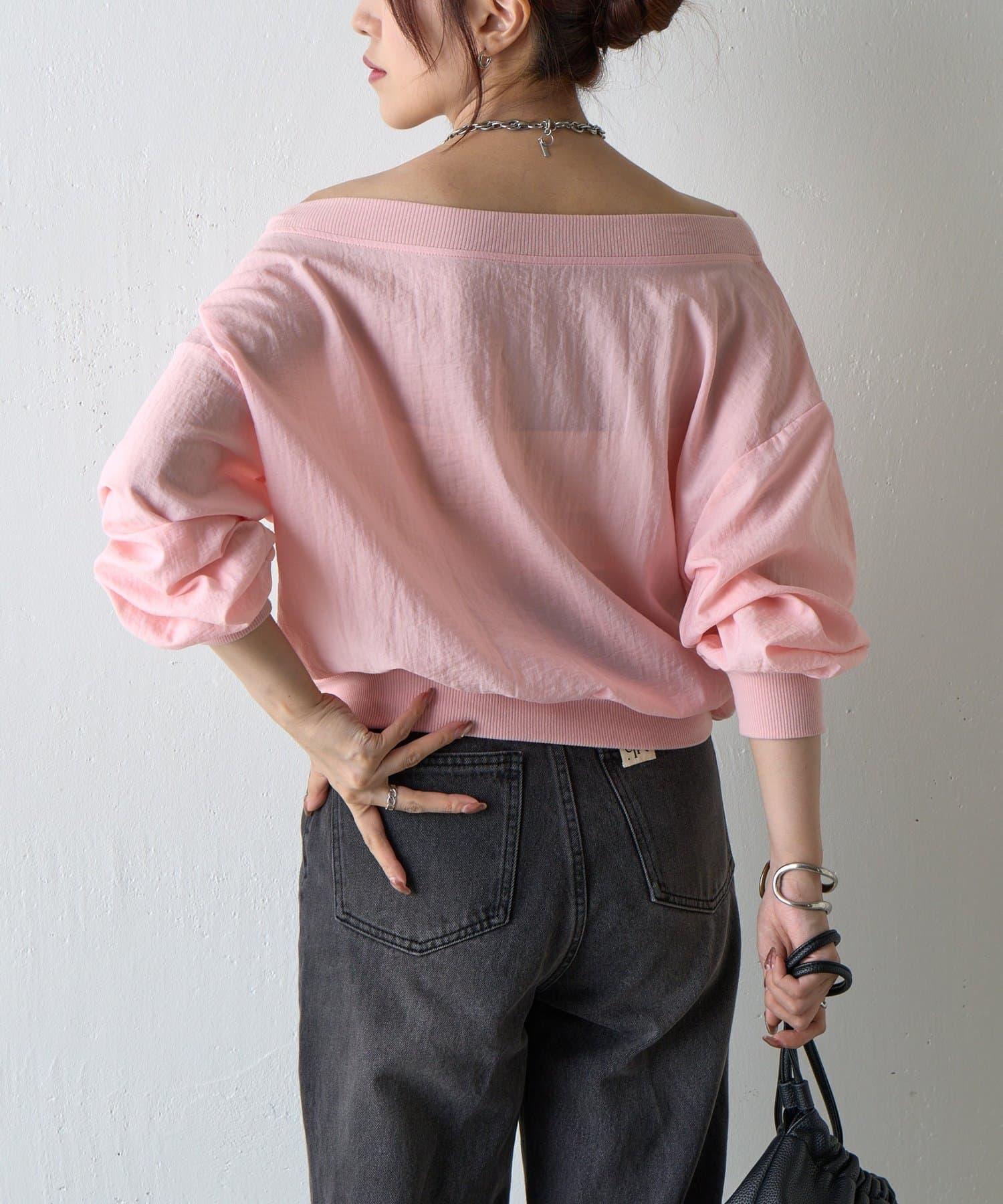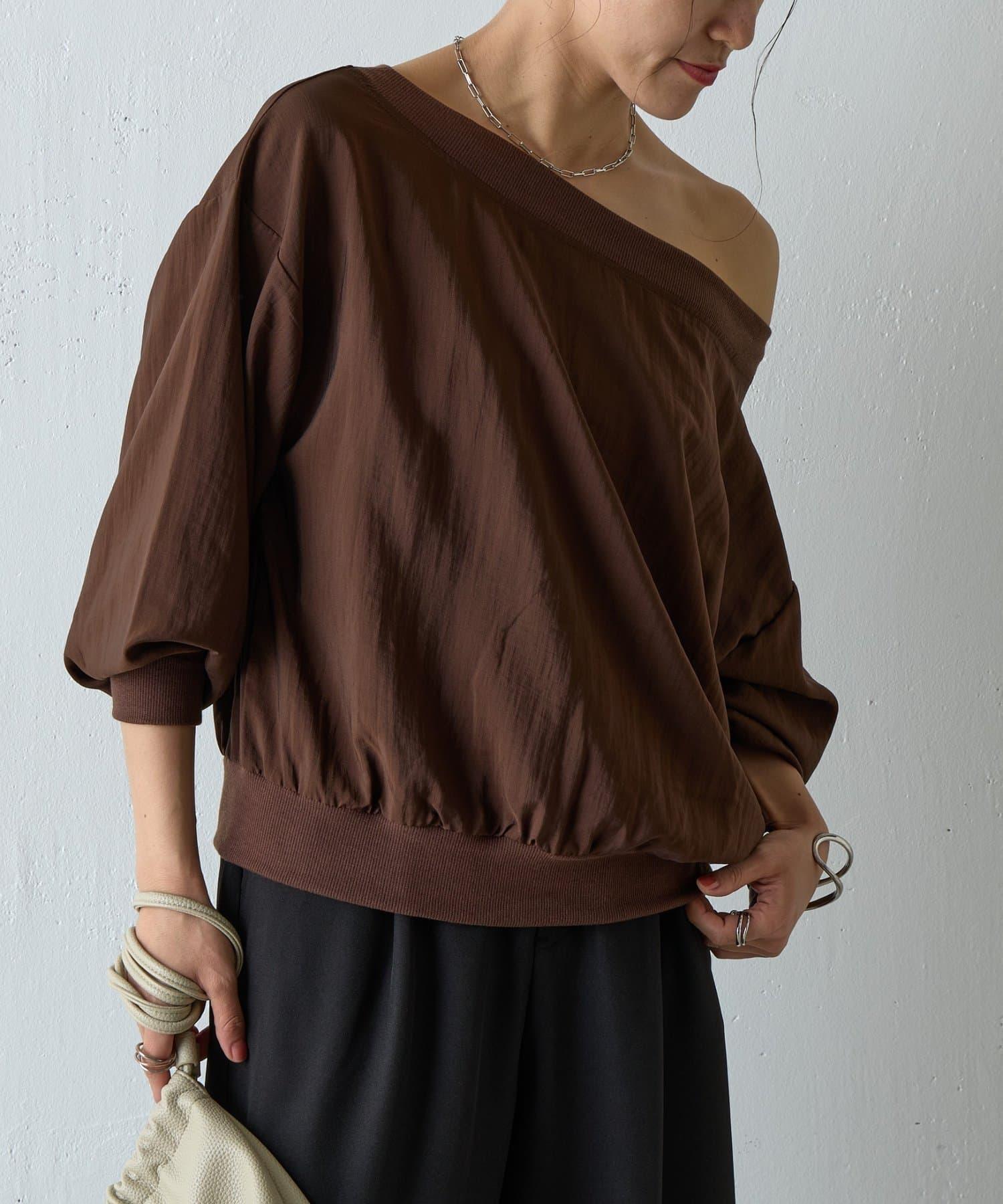 微微的光澤感非常時髦。露肩套頭衫,透薄輕盈。