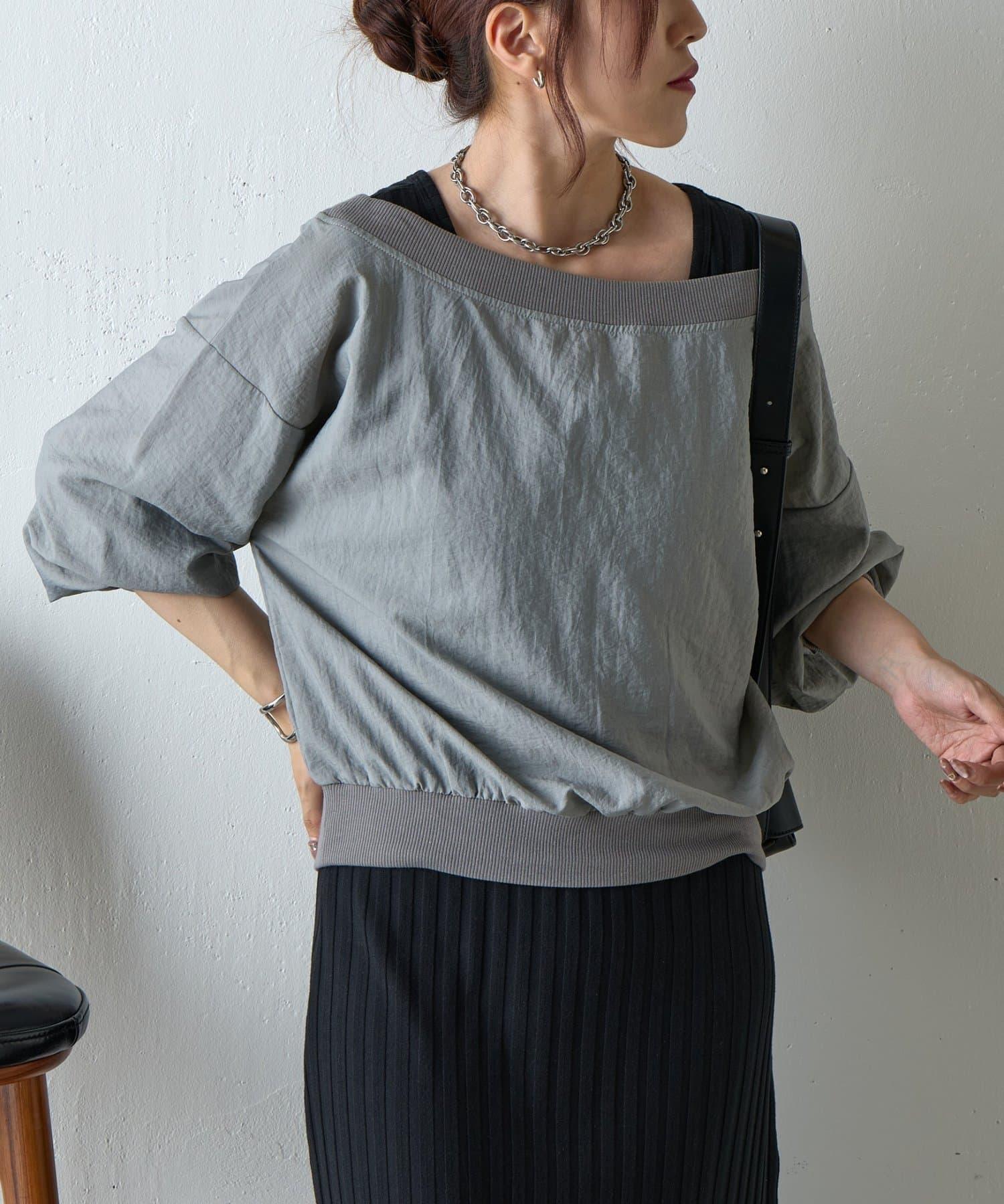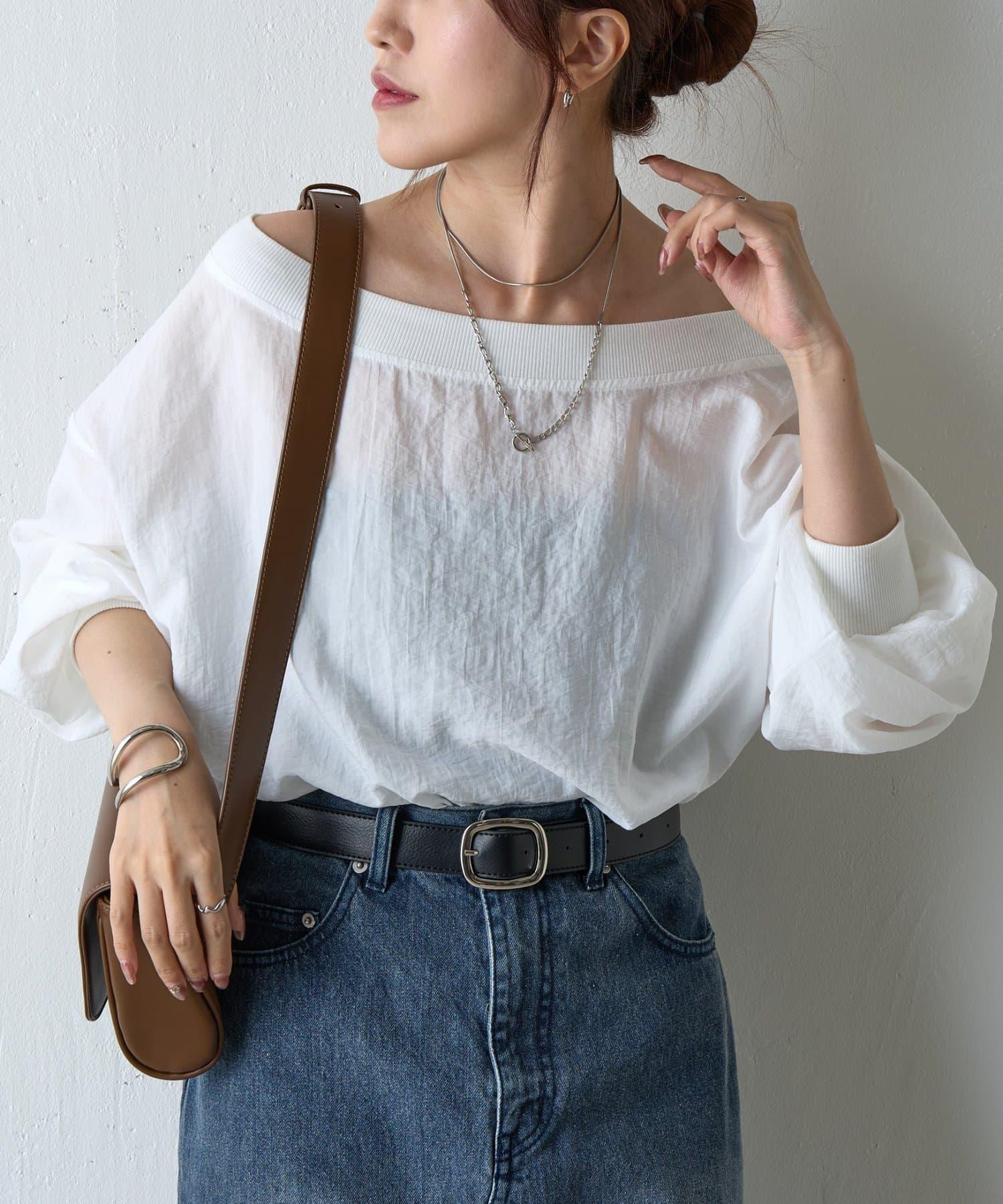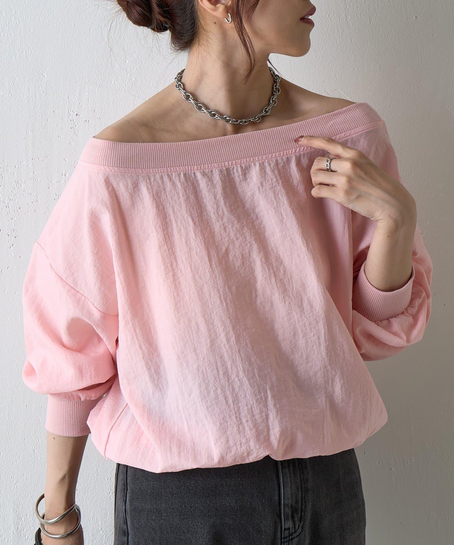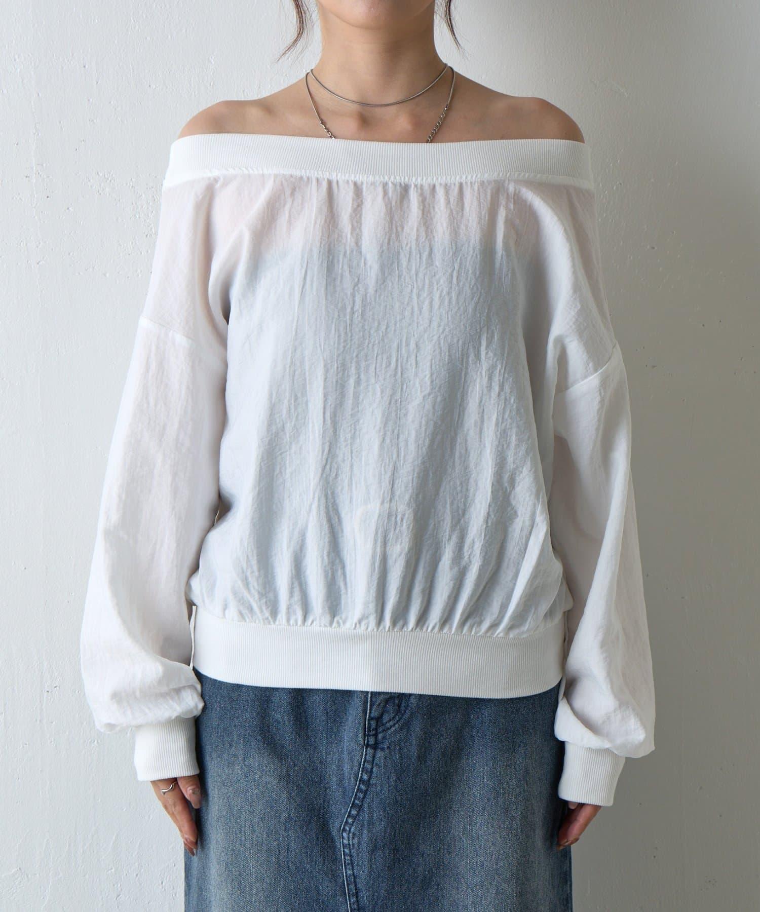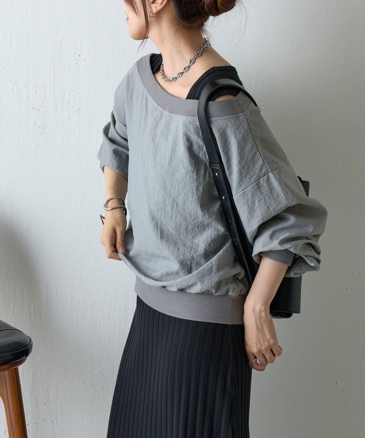 微微的光澤感非常時髦。露肩套頭衫,透薄輕盈。
