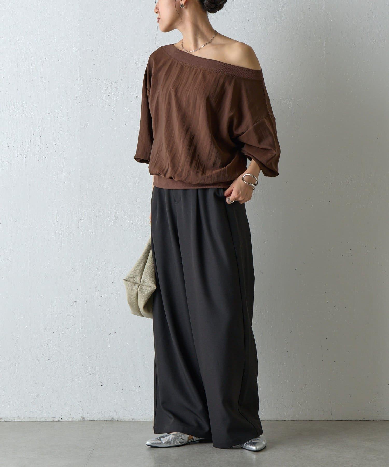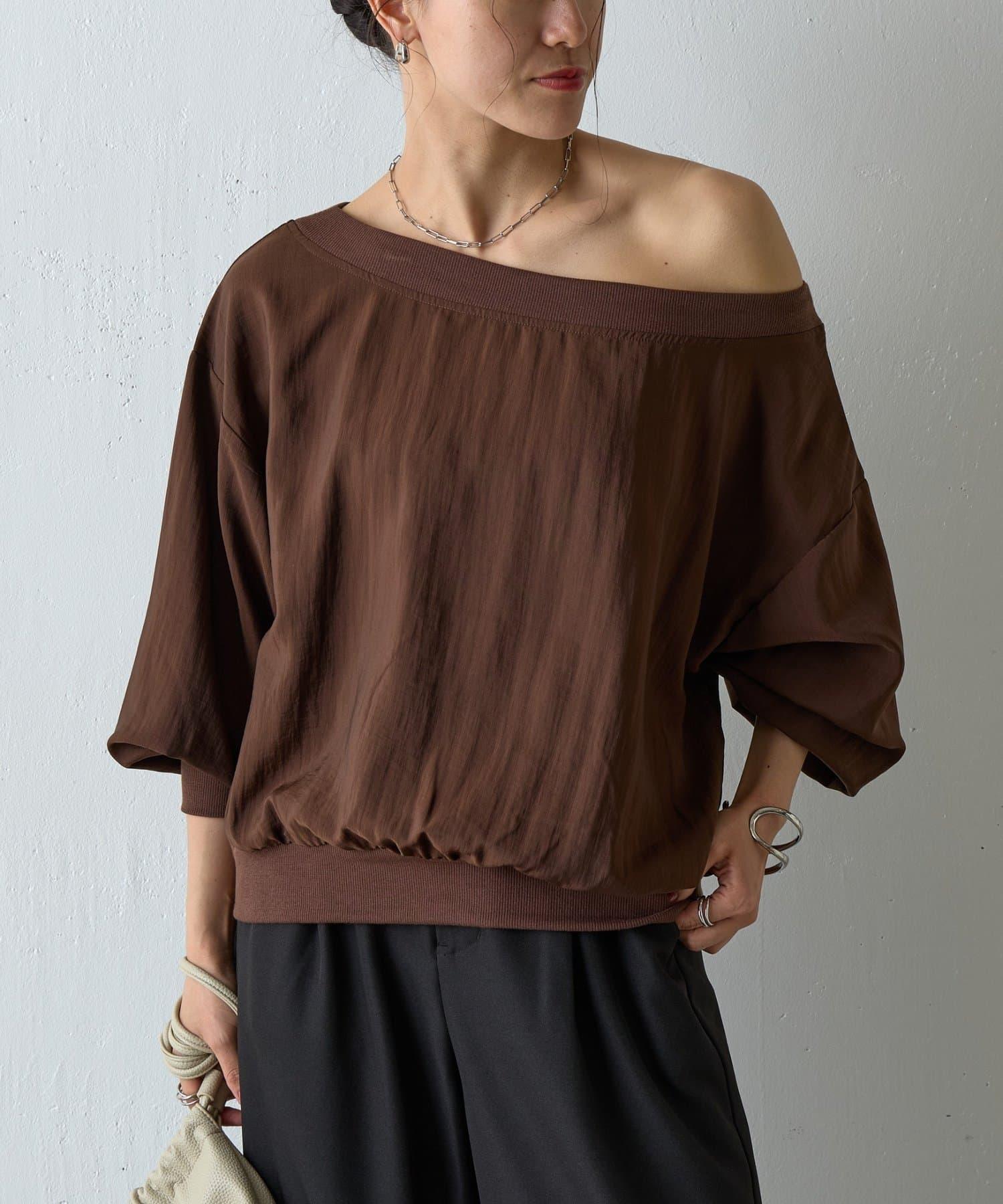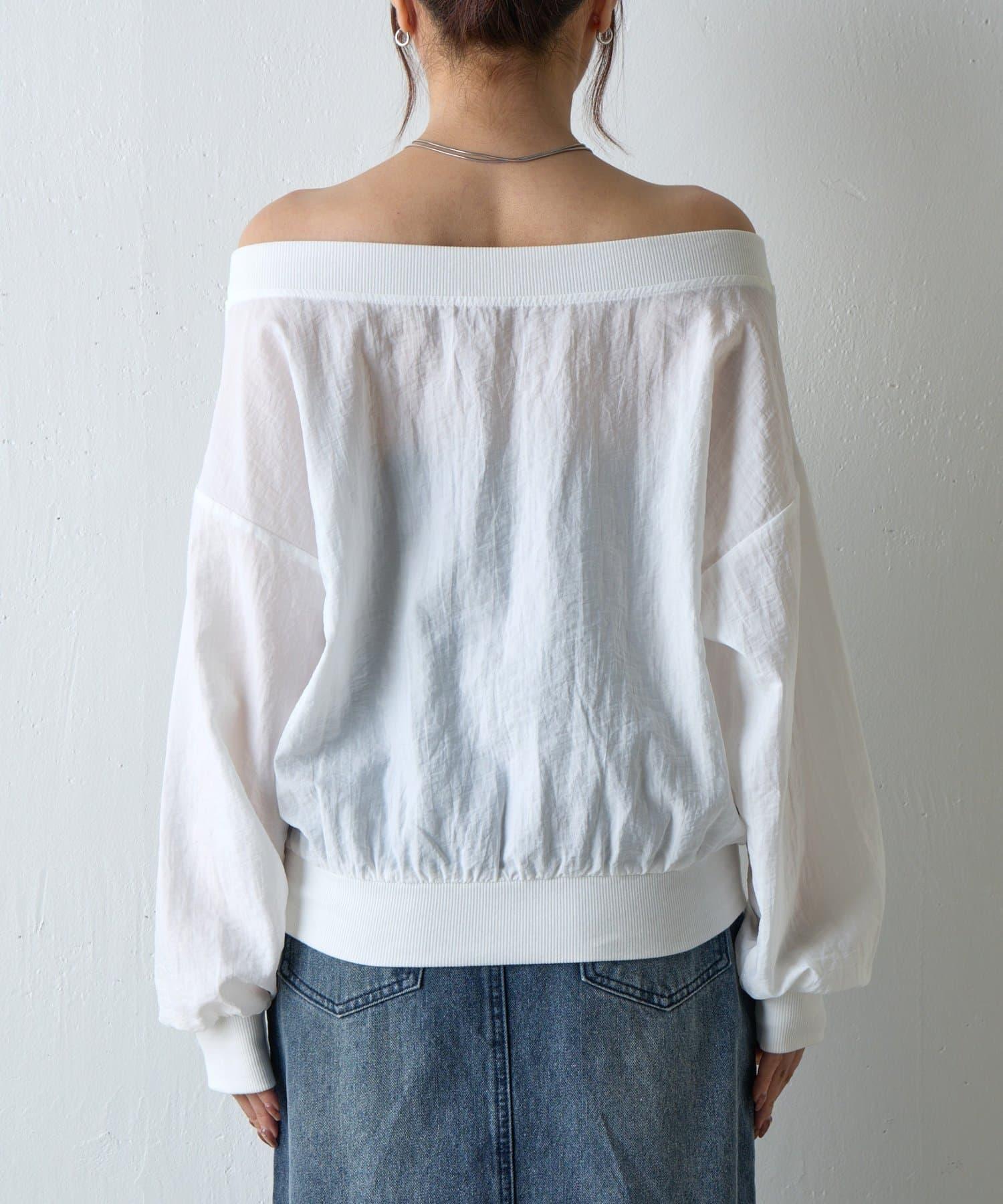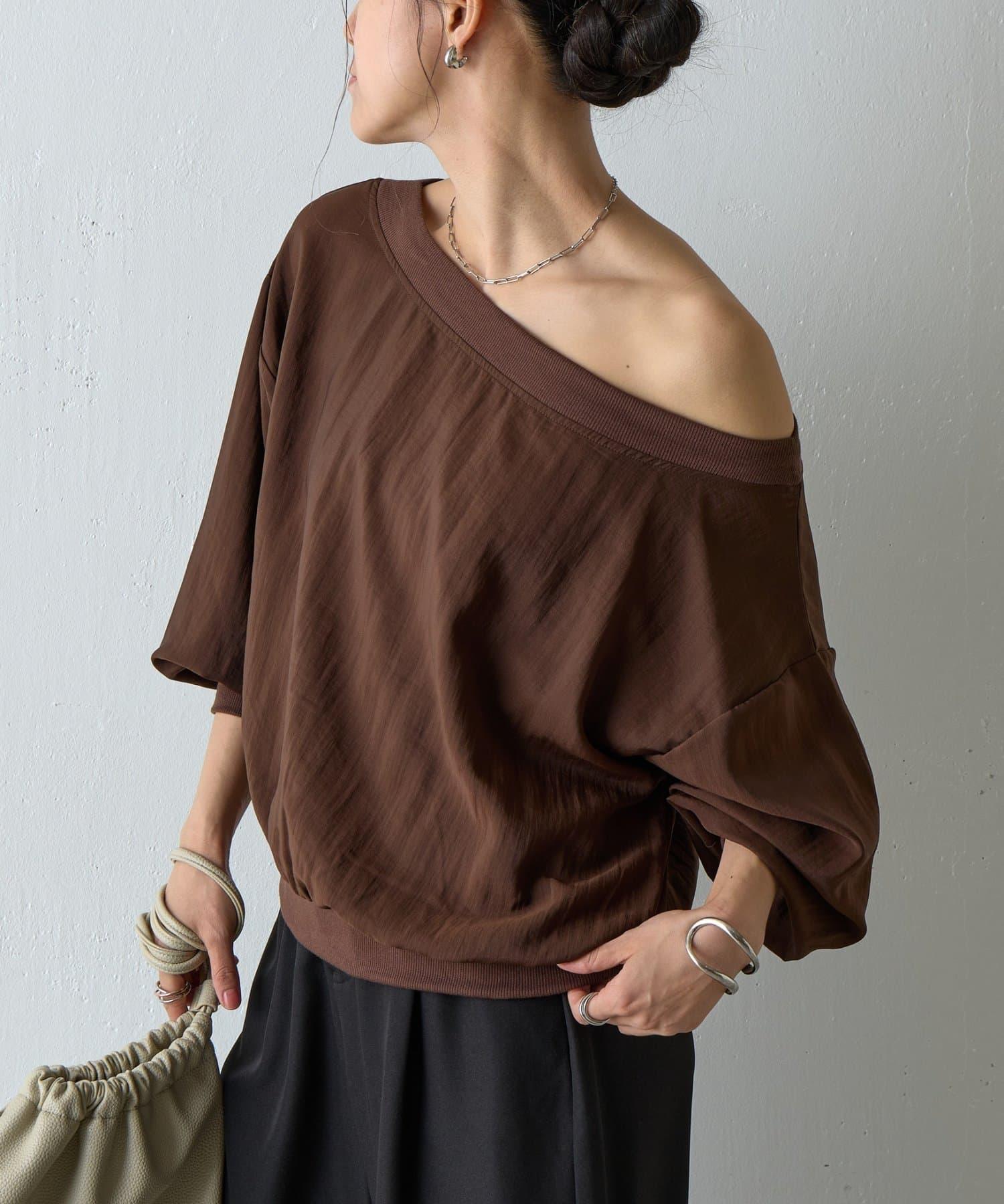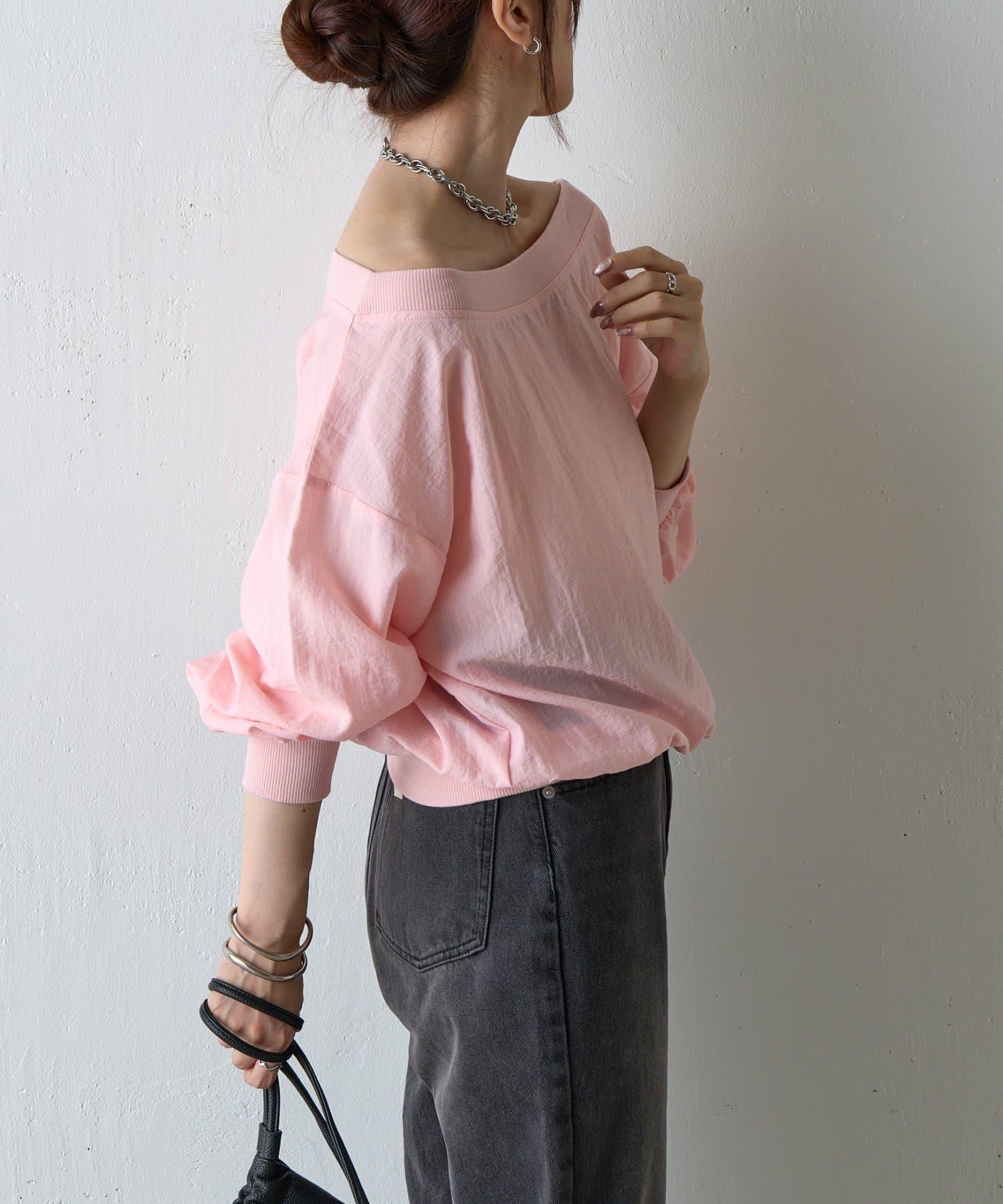 微微的光澤感非常時髦。露肩套頭衫,透薄輕盈。