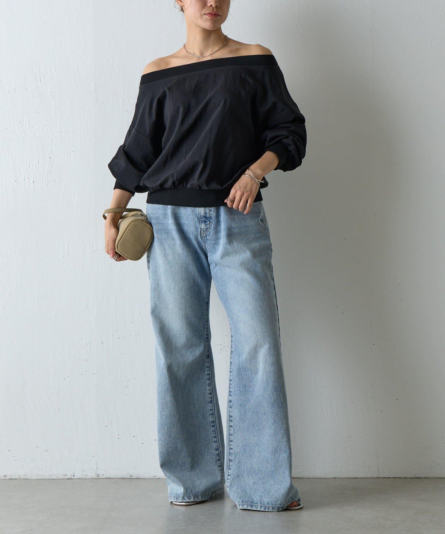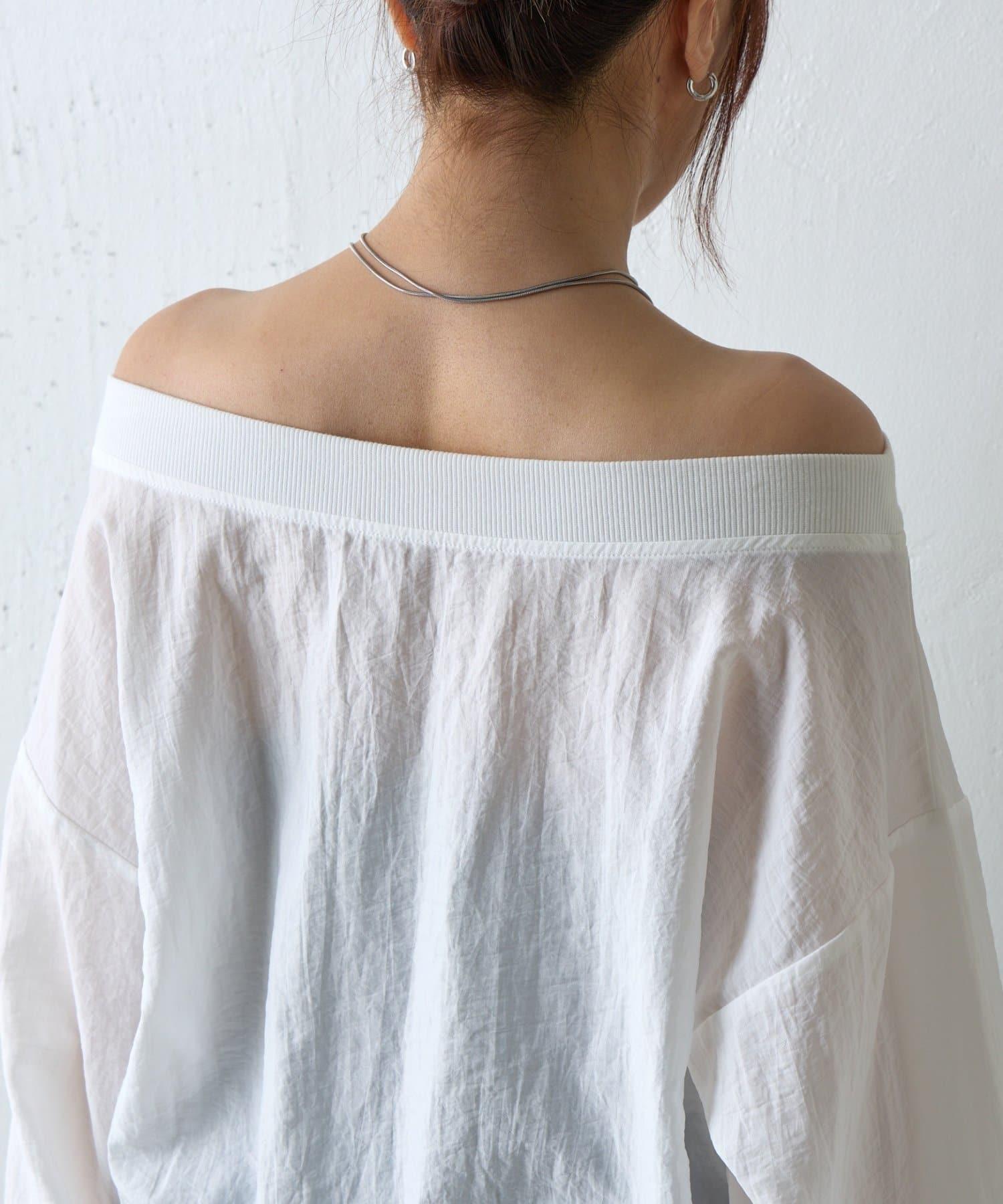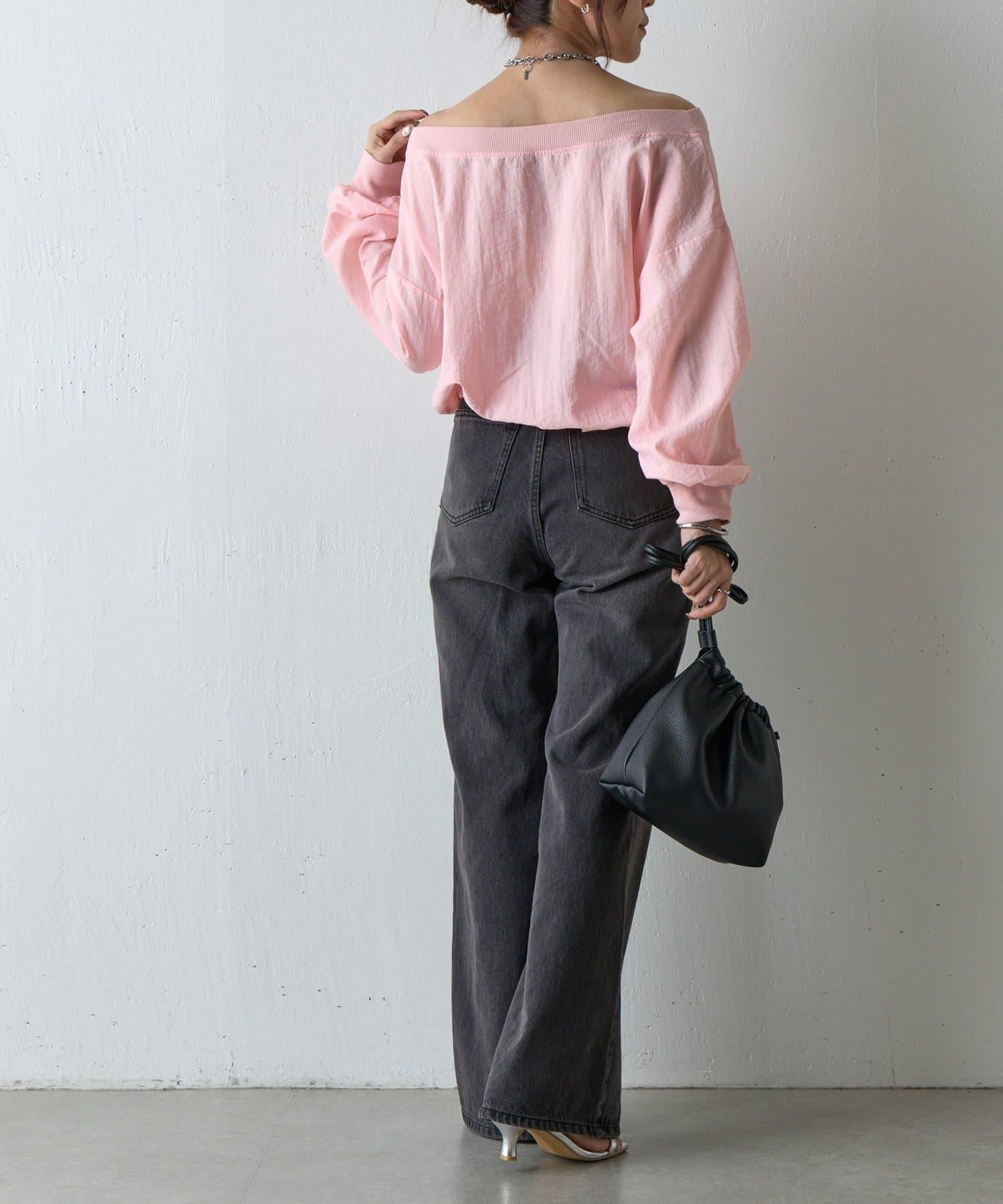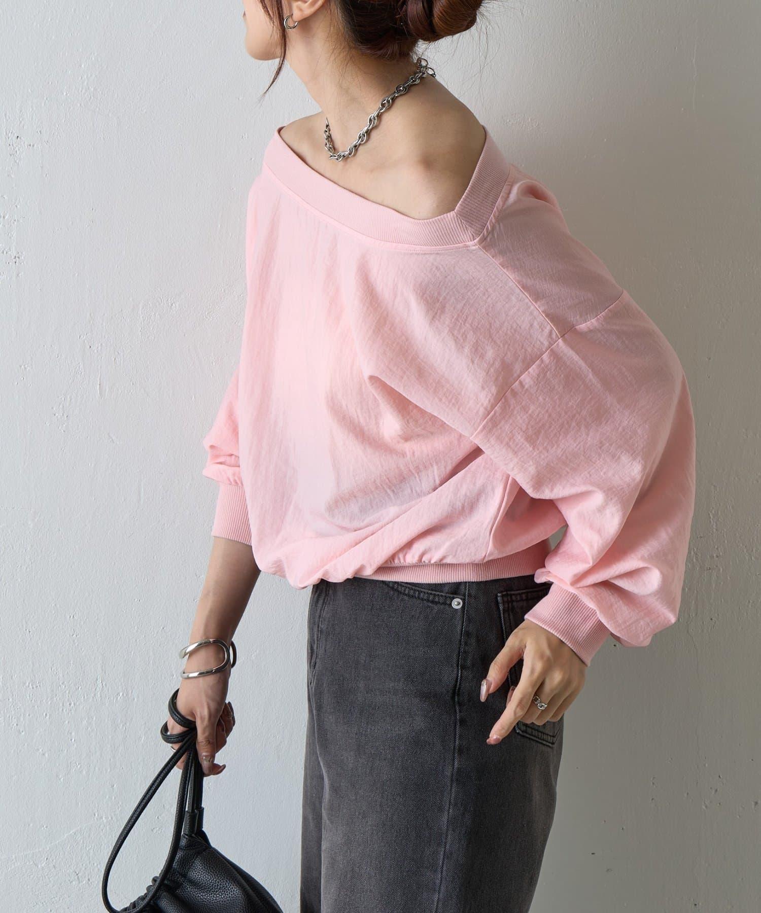 微微的光澤感非常時髦。露肩套頭衫,透薄輕盈。