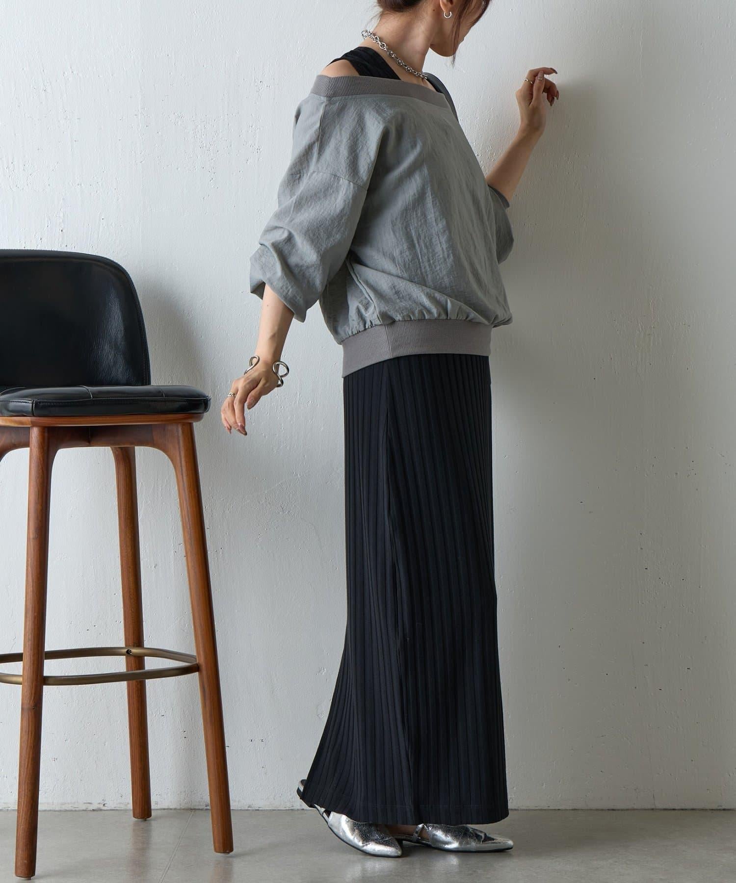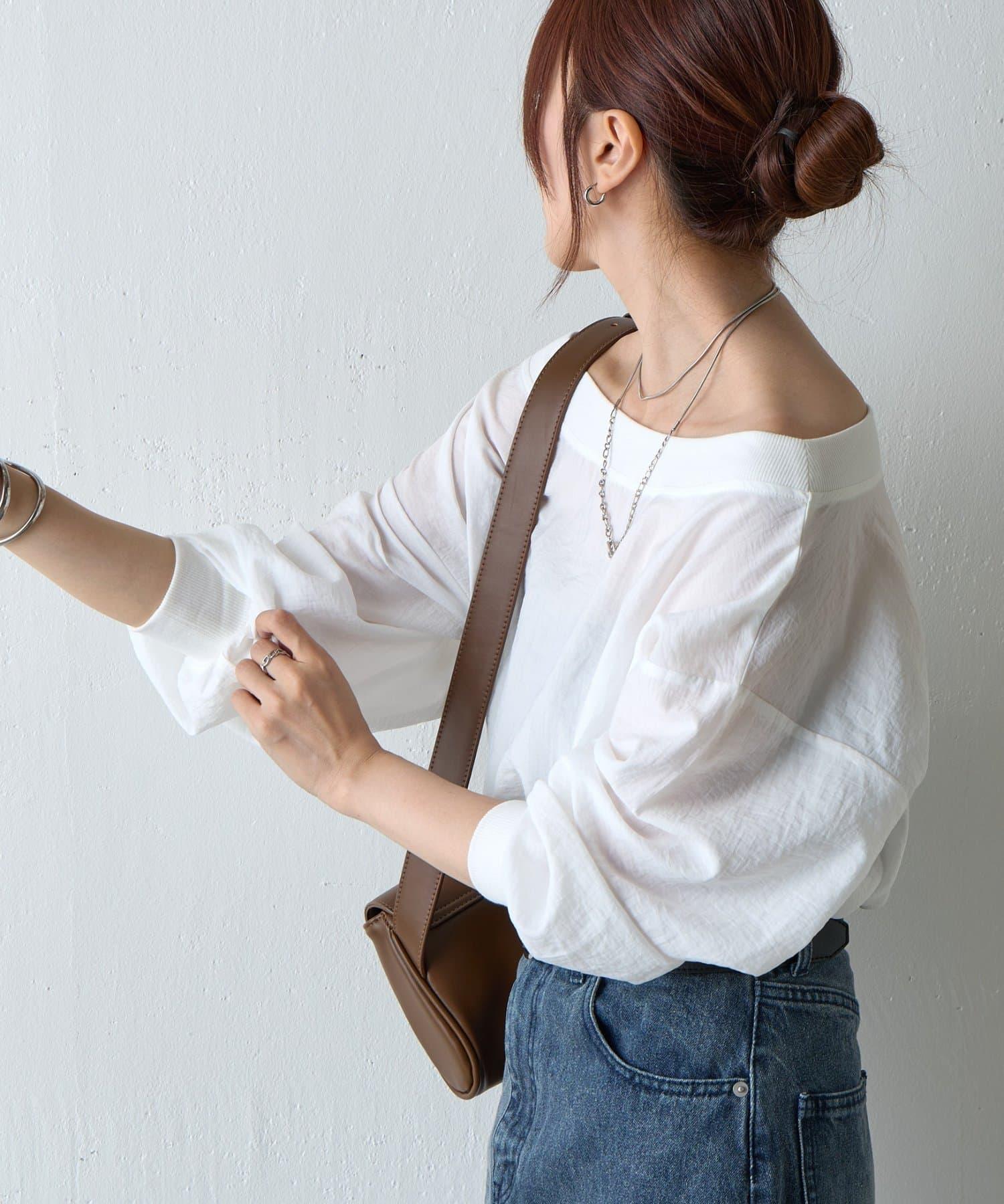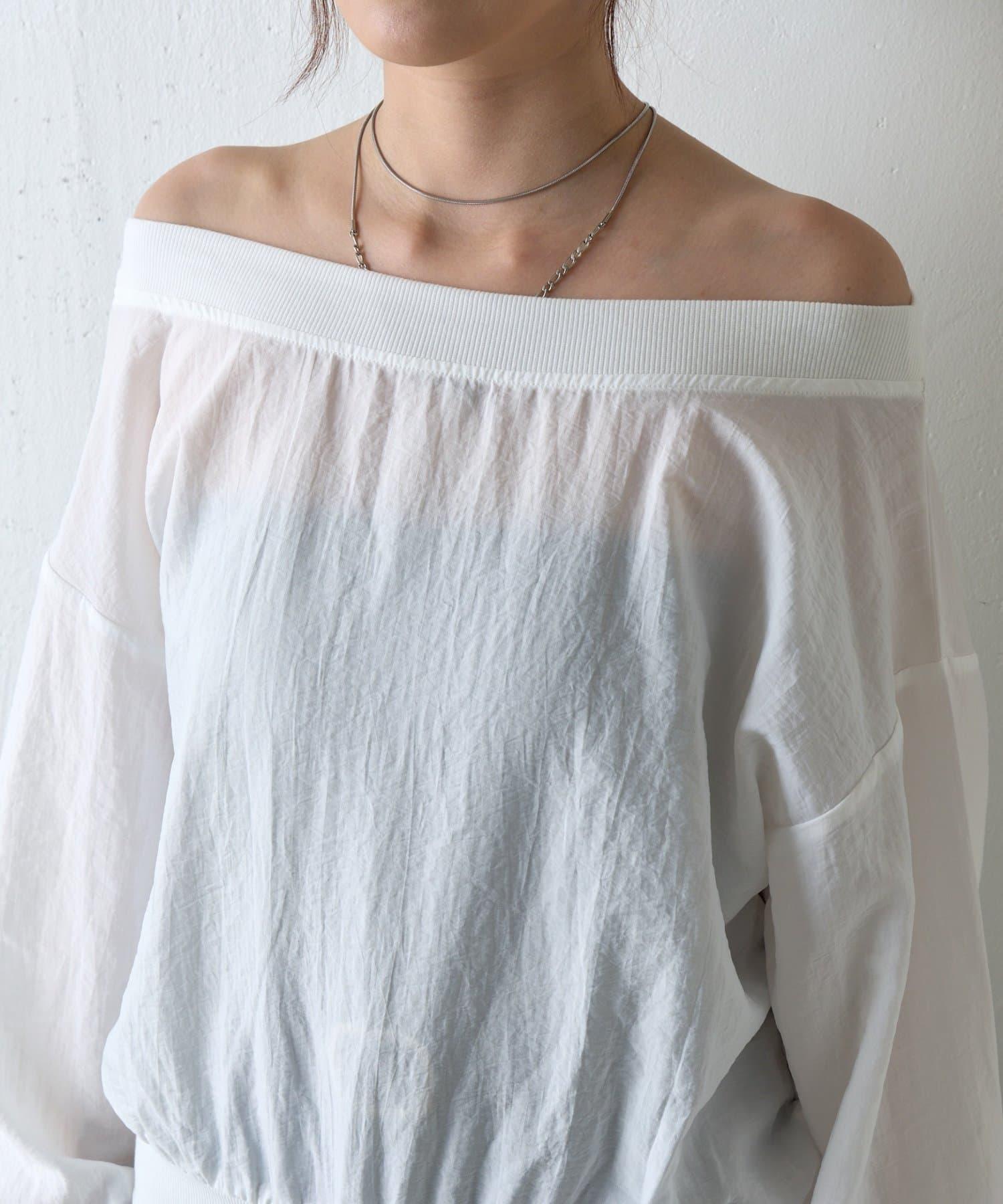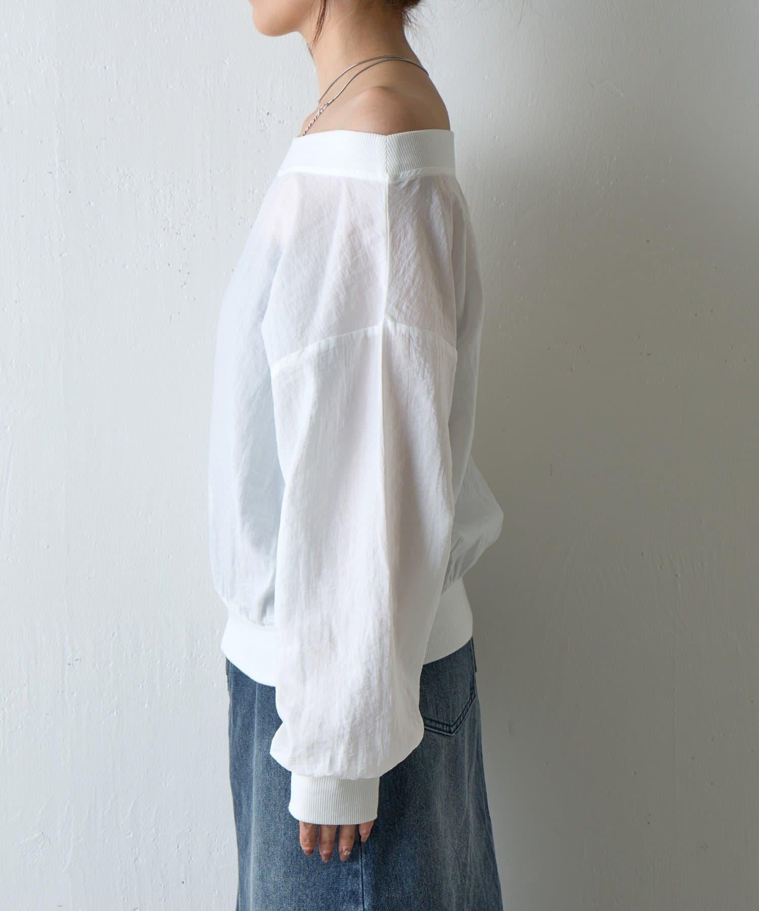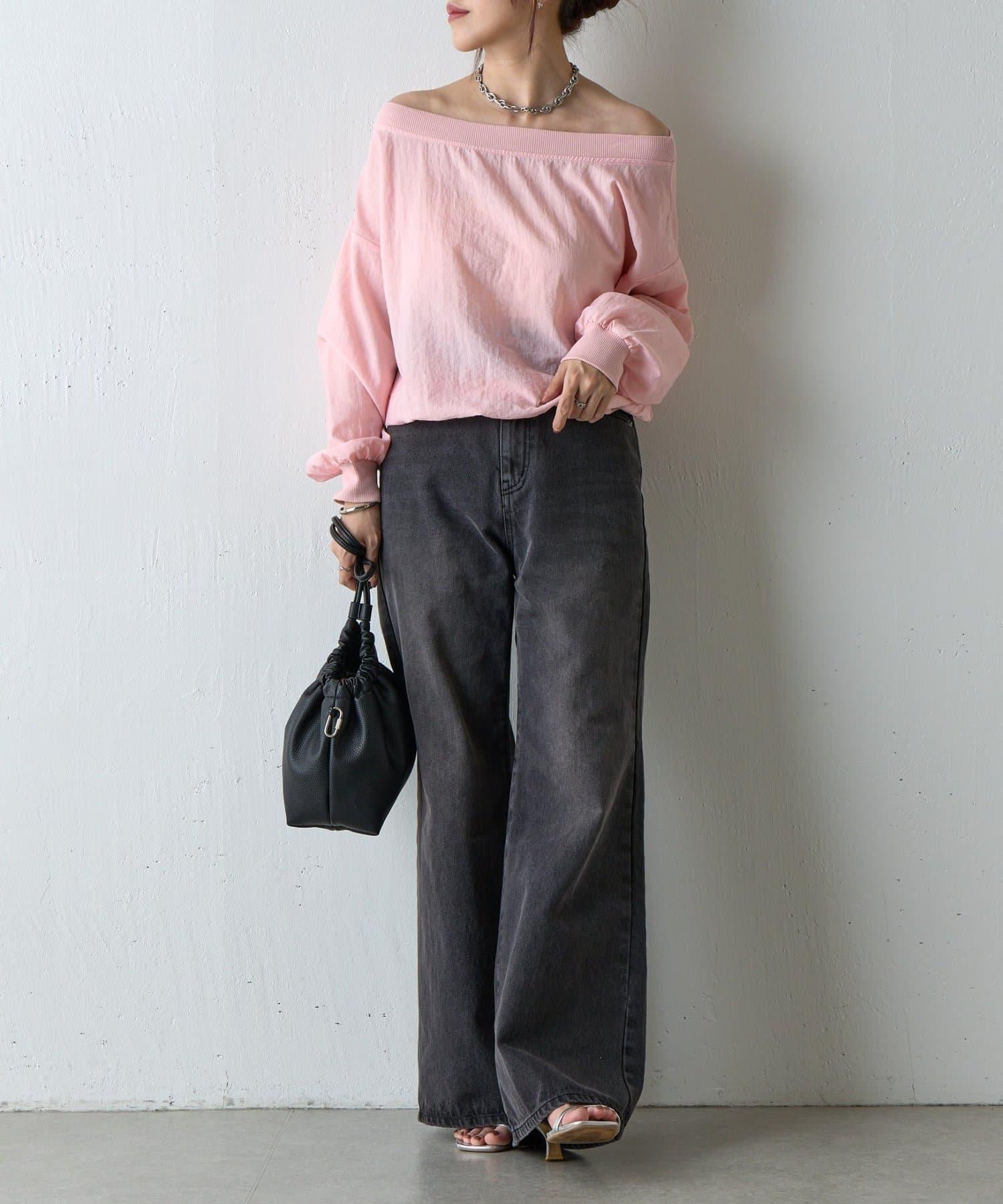 微微的光澤感非常時髦。露肩套頭衫,透薄輕盈。