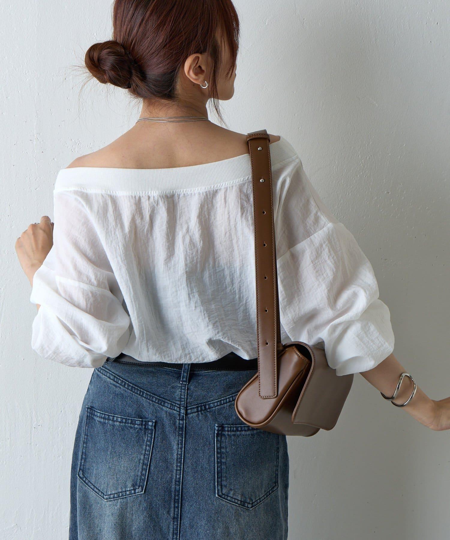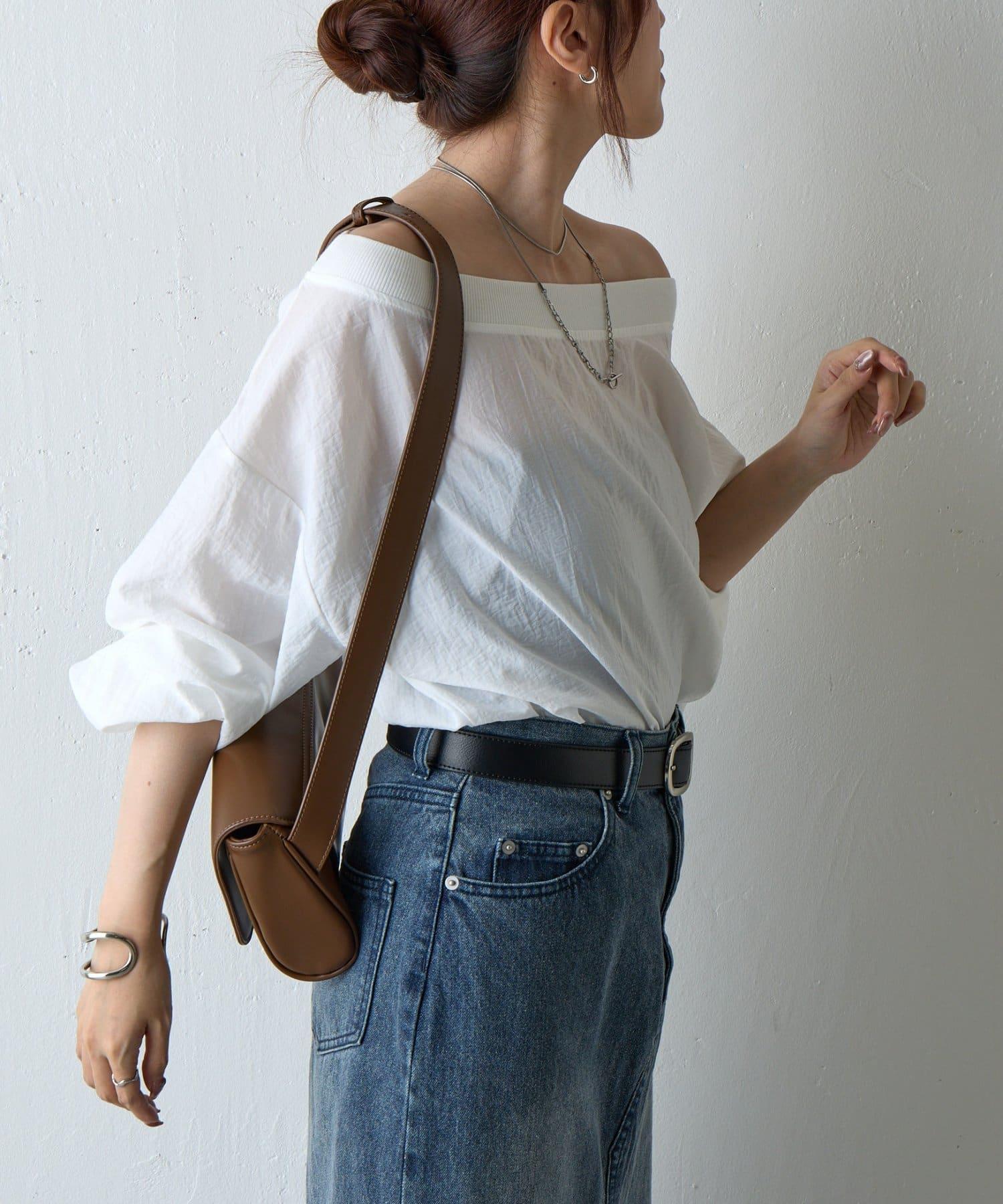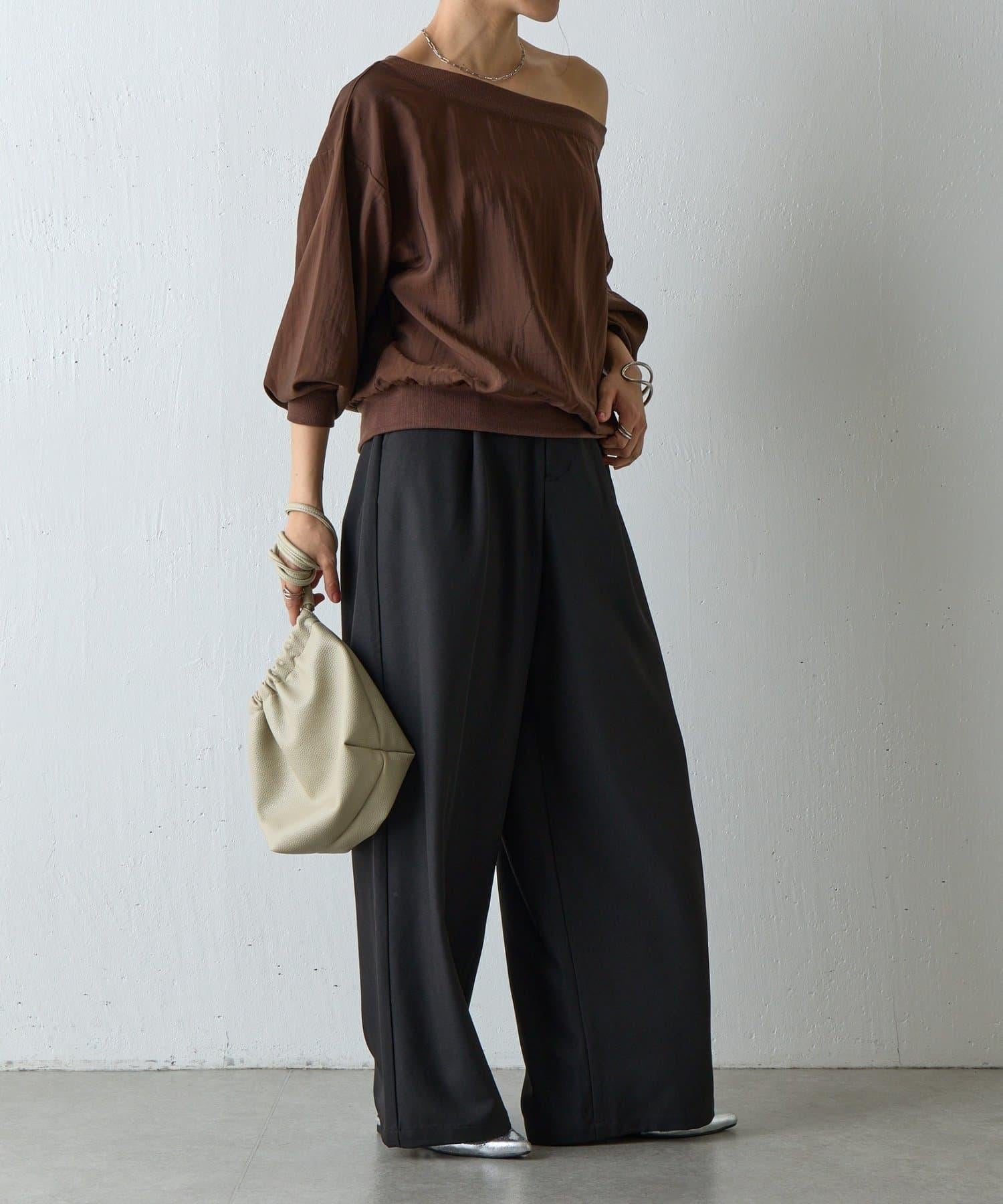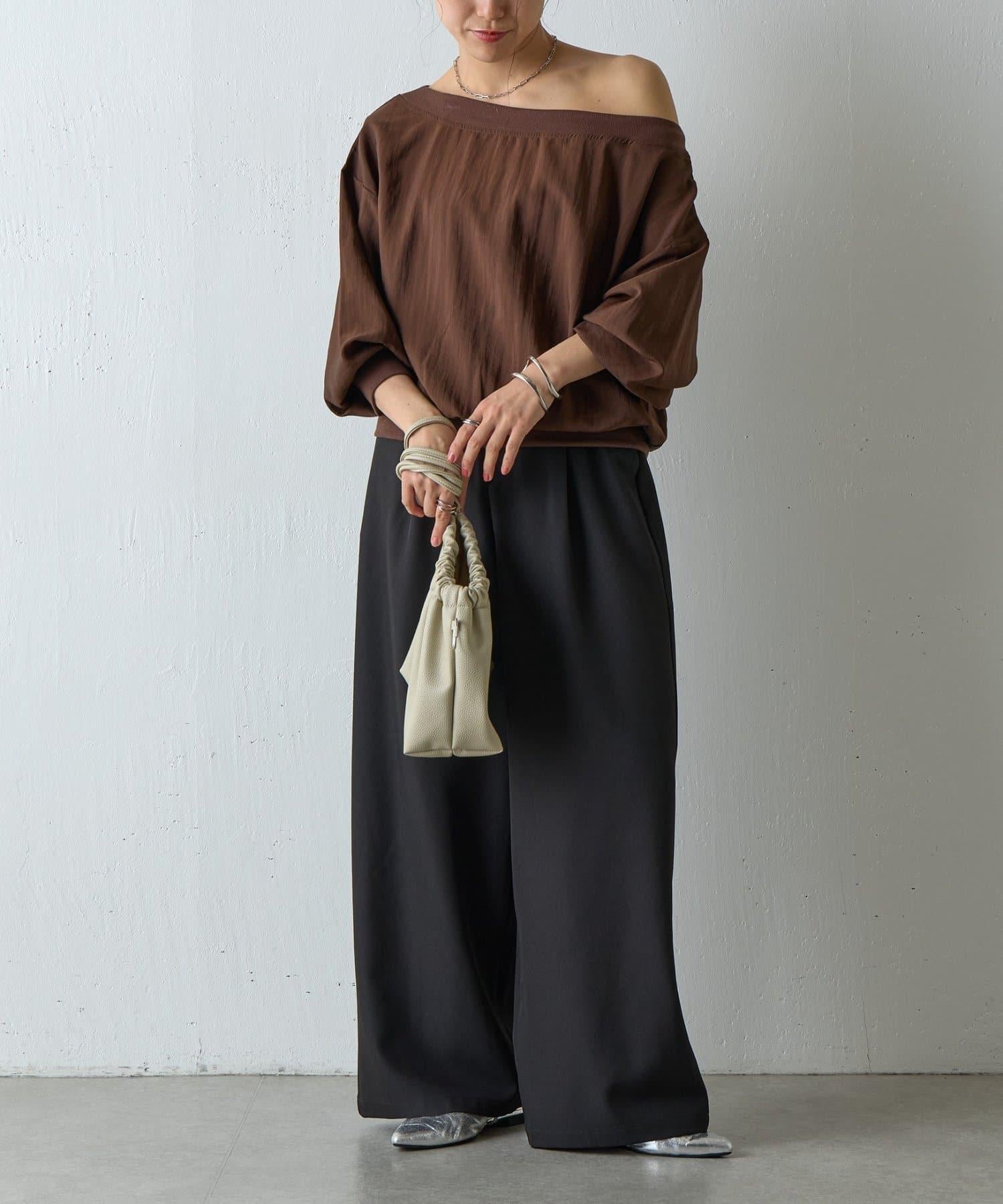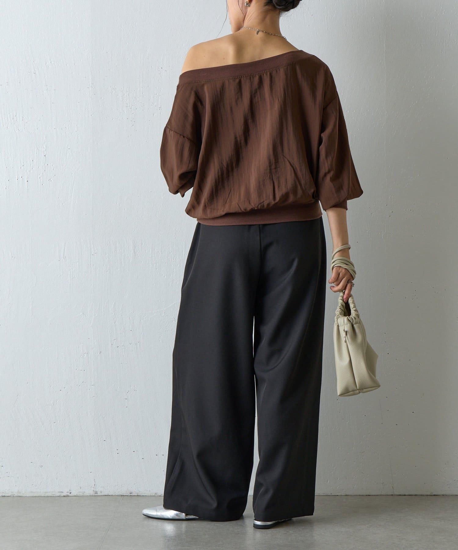 微微的光澤感非常時髦。露肩套頭衫,透薄輕盈。