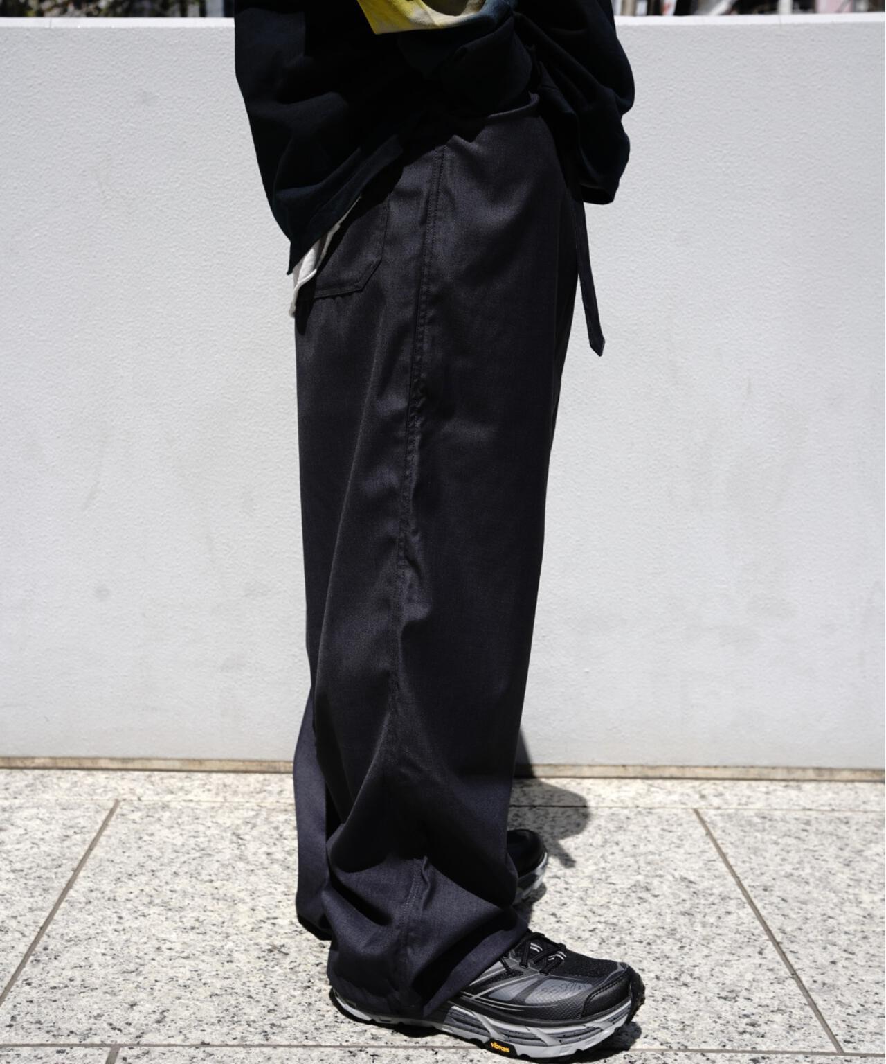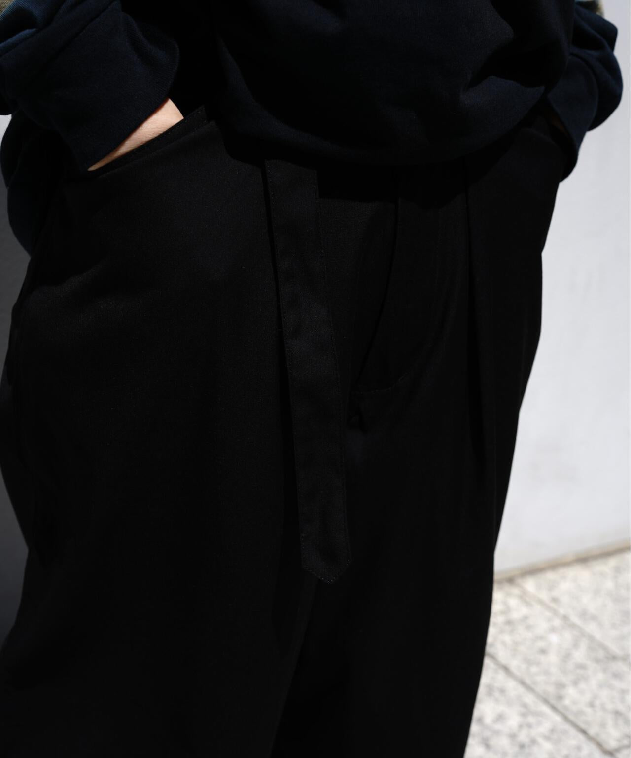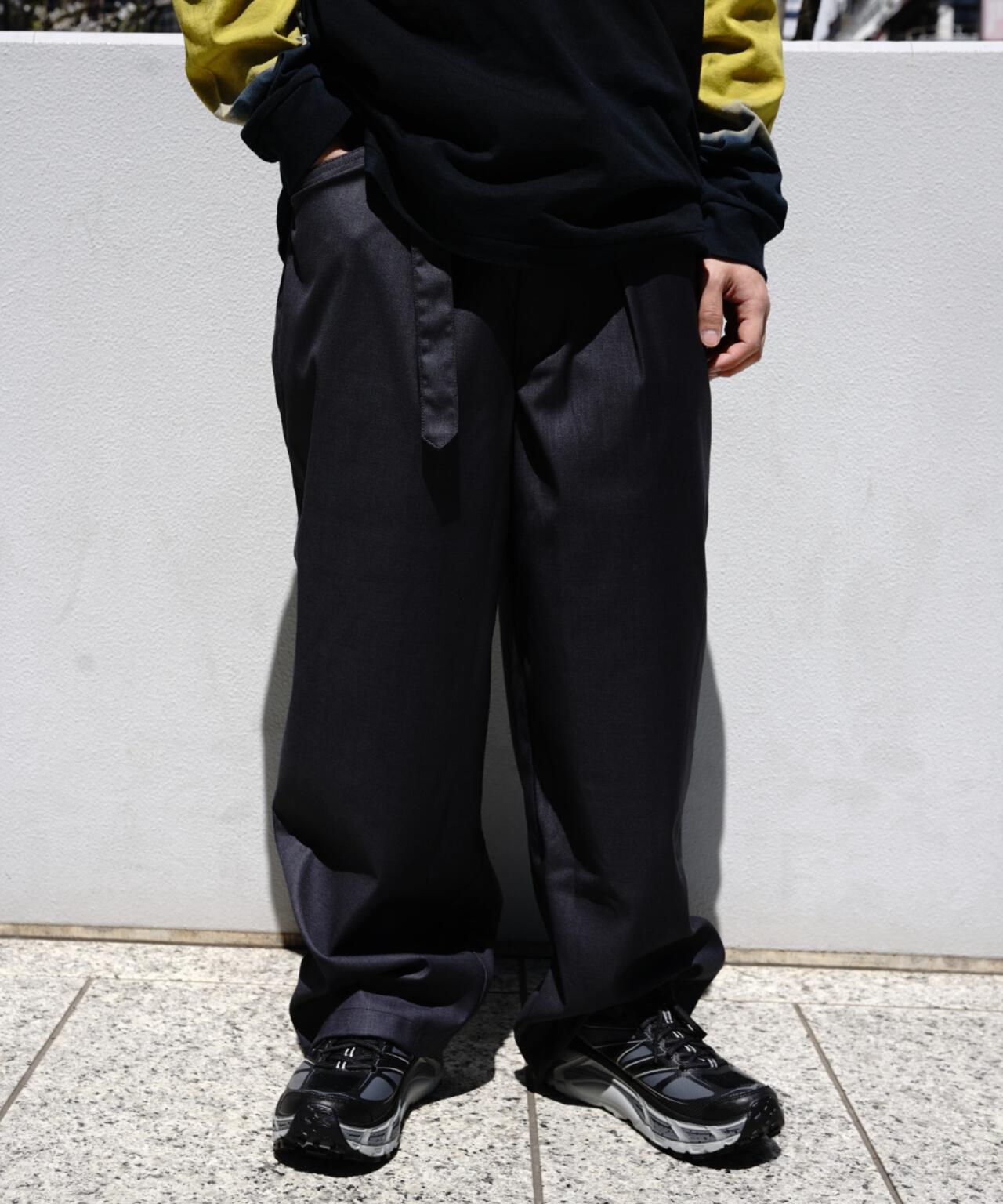 B omnivore TR BELT LOOSE PANTS 寬直筒款式,附有相同面料的腰帶。褲型優美,臀部適度整齊,大腿區域寬闊。下襬處還有一個用於調節的抽繩。TR 面料由聚酯纖維和人造絲組合而成,輕便、有彈性且抗皺。B omnivore / B omnivore] omnivore = 可與各種時尚風格混搭的服裝,不會陷入雜食的行列。