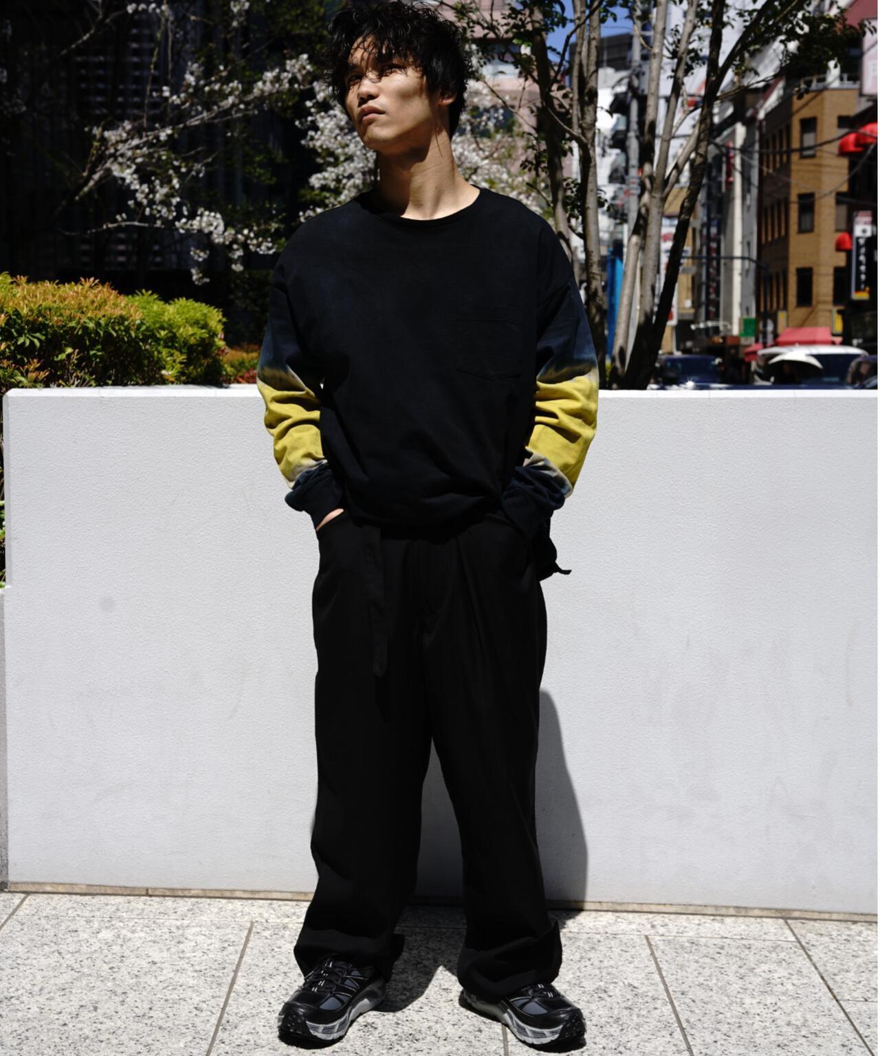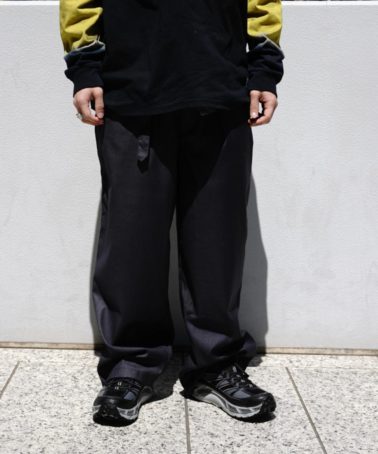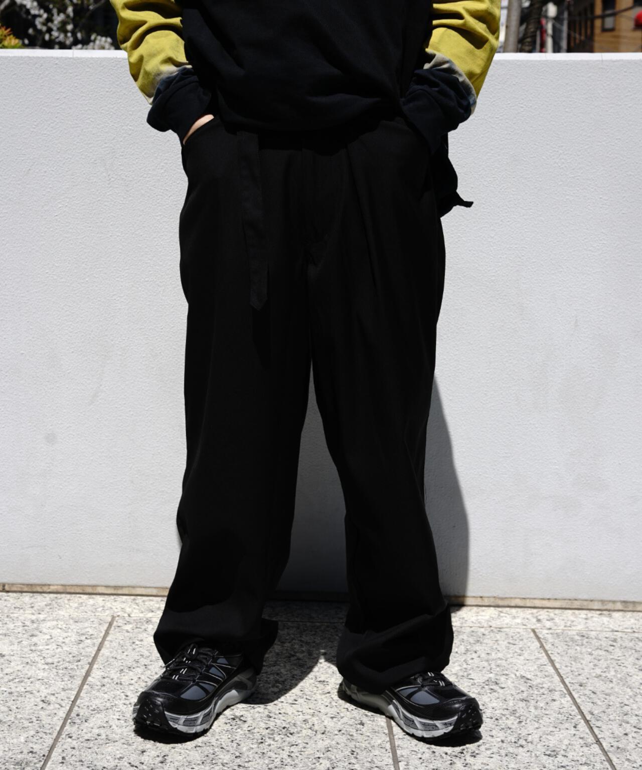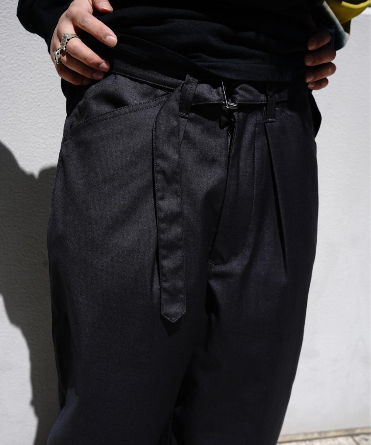 B omnivore TR BELT LOOSE PANTS 寬直筒款式,附有相同面料的腰帶。褲型優美,臀部適度整齊,大腿區域寬闊。下襬處還有一個用於調節的抽繩。TR 面料由聚酯纖維和人造絲組合而成,輕便、有彈性且抗皺。B omnivore / B omnivore] omnivore = 可與各種時尚風格混搭的服裝,不會陷入雜食的行列。