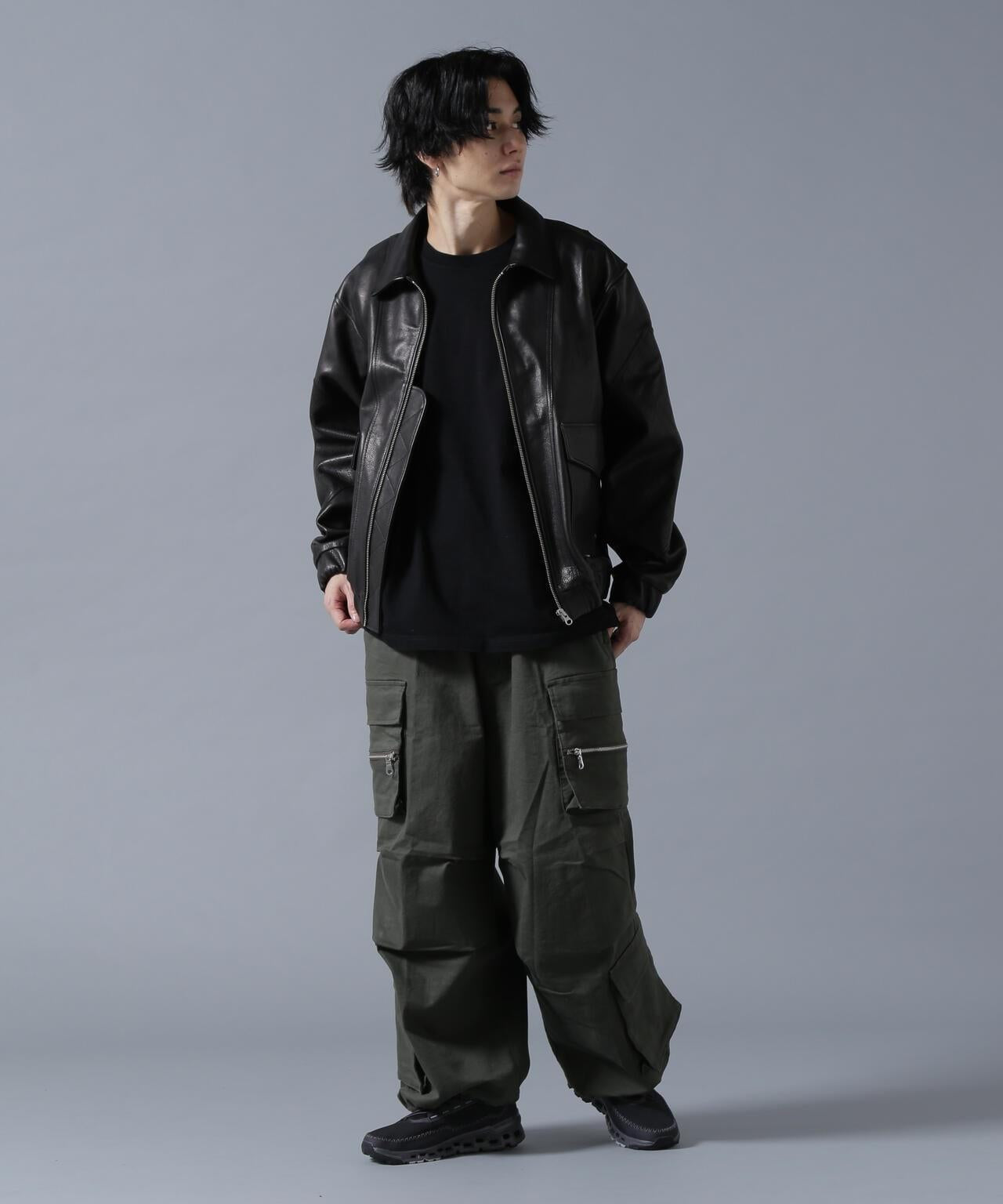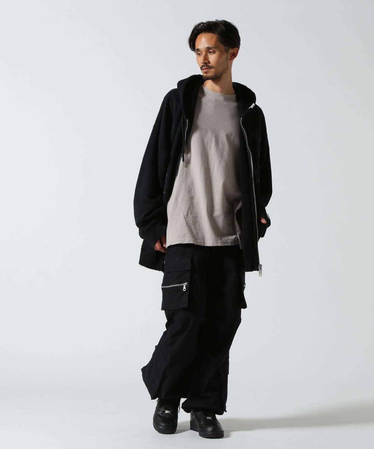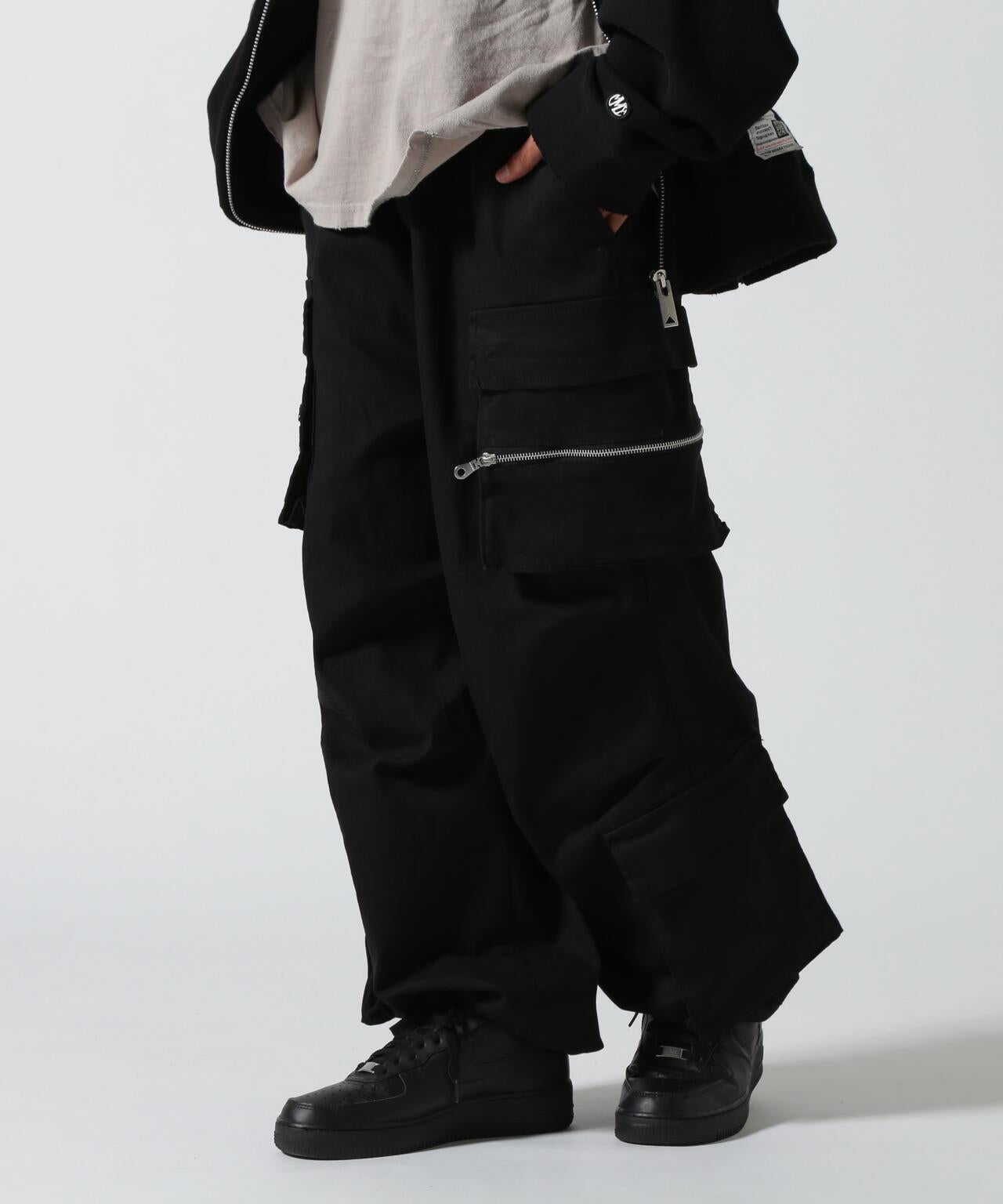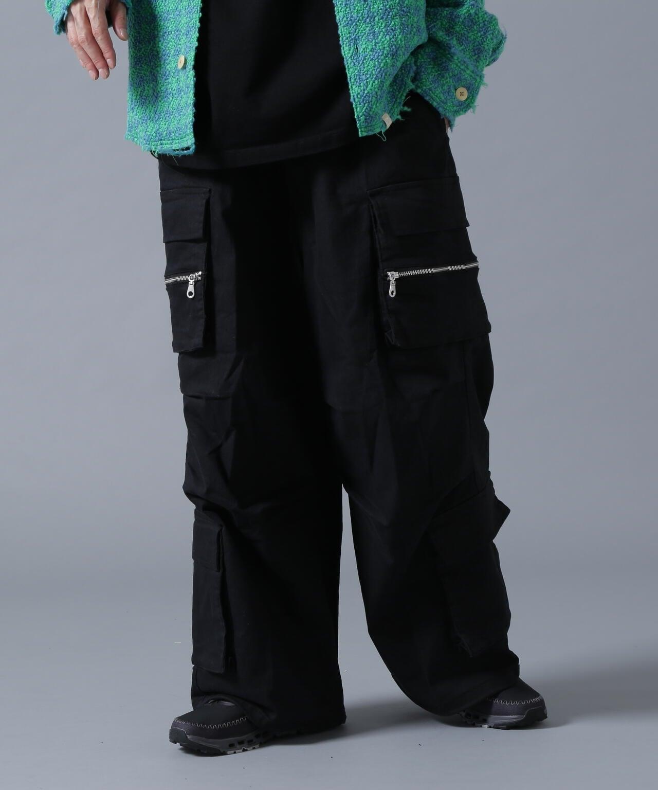 B omnivore/ B omnivore W POCKET CARGO PANTS 雙口袋長褲,帶拉鍊口袋,膝蓋處有立體感,下襬處有不同尋常的口袋設計。寬大的輪廓和飽滿的體積使這款長褲看起來非常時尚。鬆緊腰身和抽繩設計方便穿脫。抗縮面料和寬鬆的剪裁讓這款褲子給人一種輕鬆上癮的感覺。B omnivore / B omnivore] omnivore = 可與各種時尚風格混搭的服裝,不會陷入雜食主義的行列。