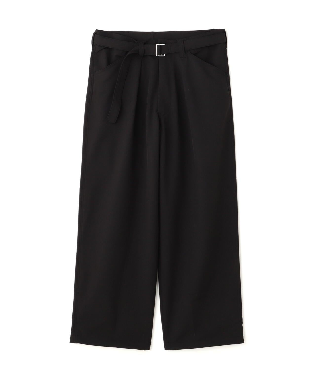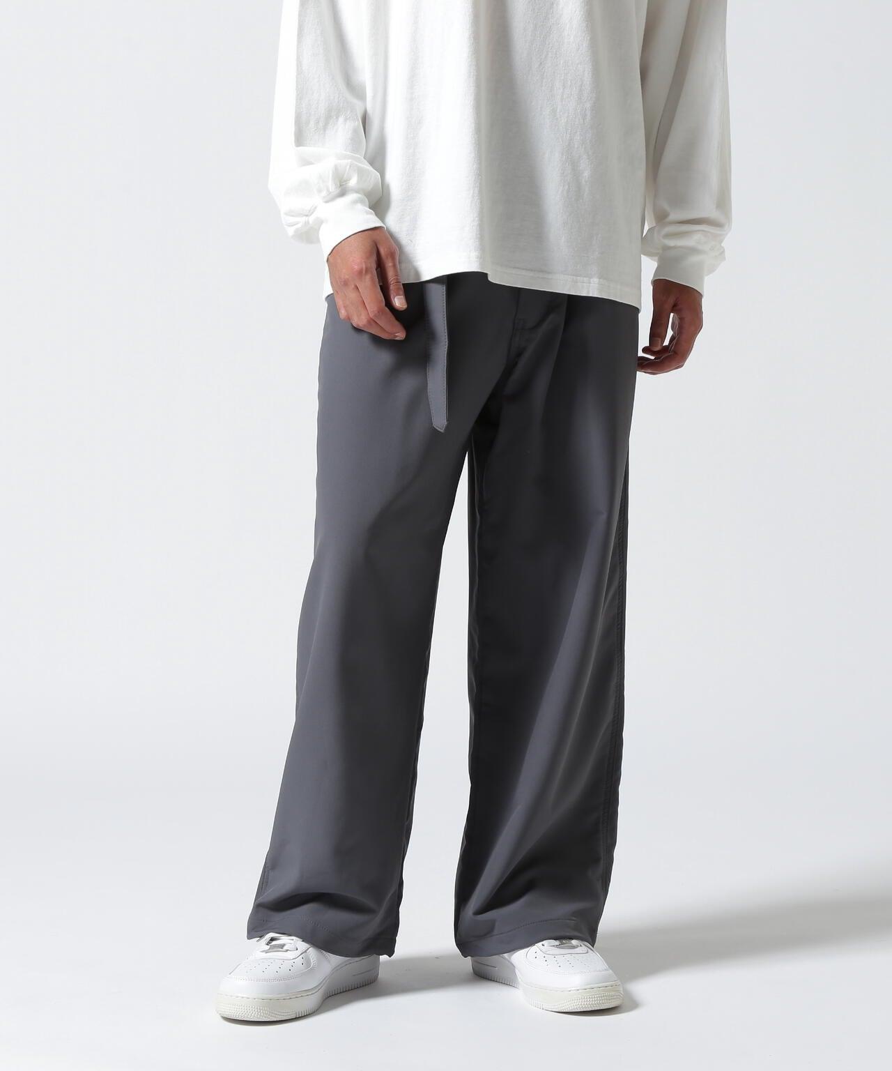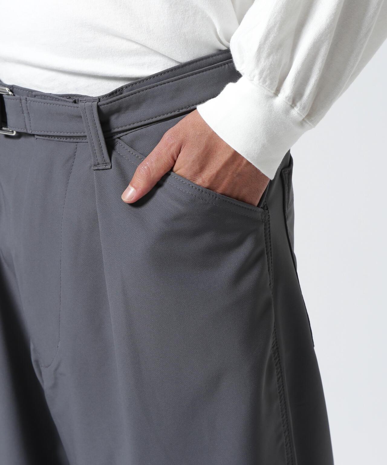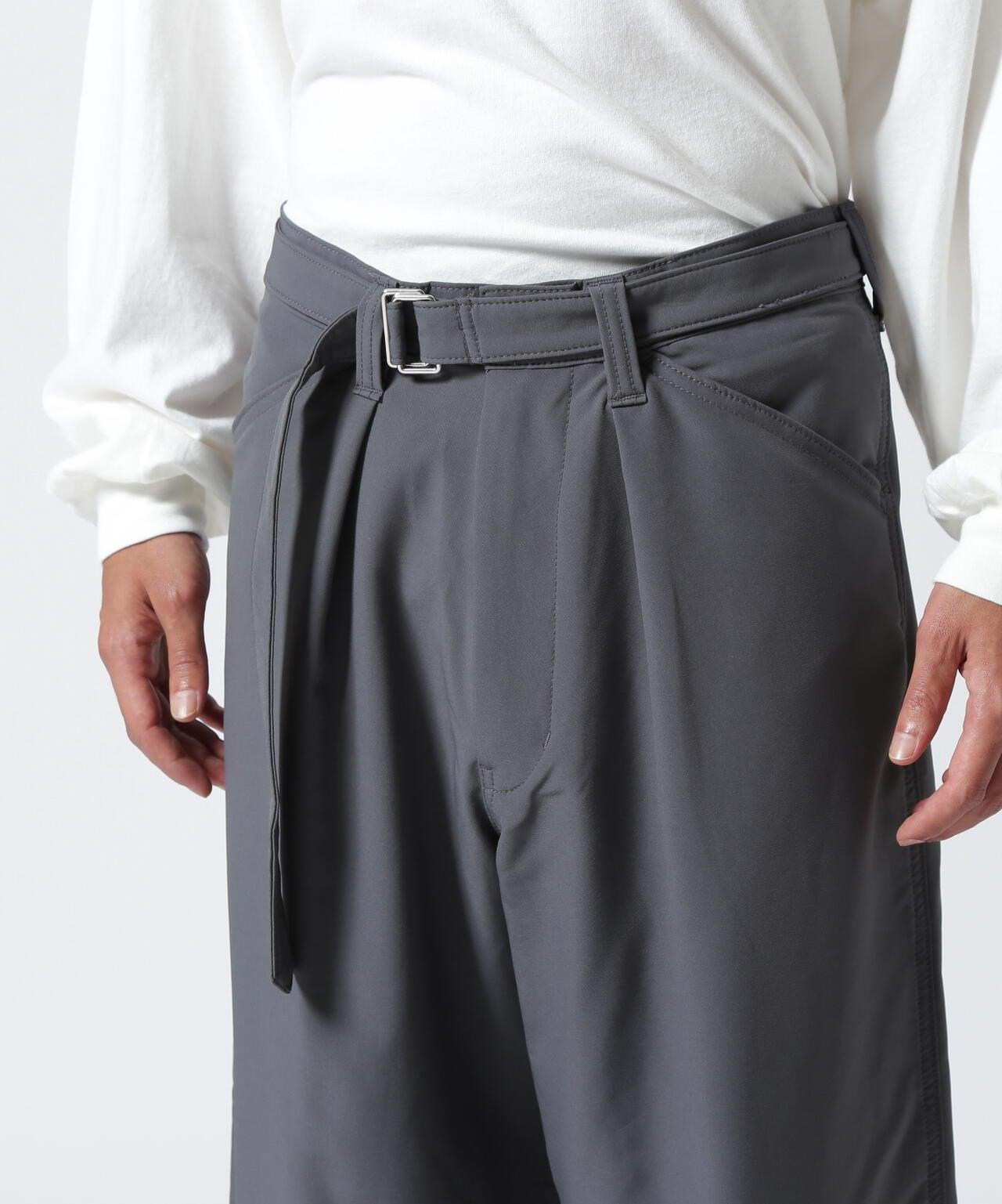 B omnivore STRETCH POLYESTER BELT LOOSE PANTS 彈力滌綸腰帶寬鬆長褲 寬直筒款式,附有相同面料的腰帶。褲型優美,臀部適度整齊,大腿區域寬闊。下襬處有抽繩。B omnivore] [B omnivore] omnivore = 可與各種時尚風格混搭而不囿於雜食系的服裝。