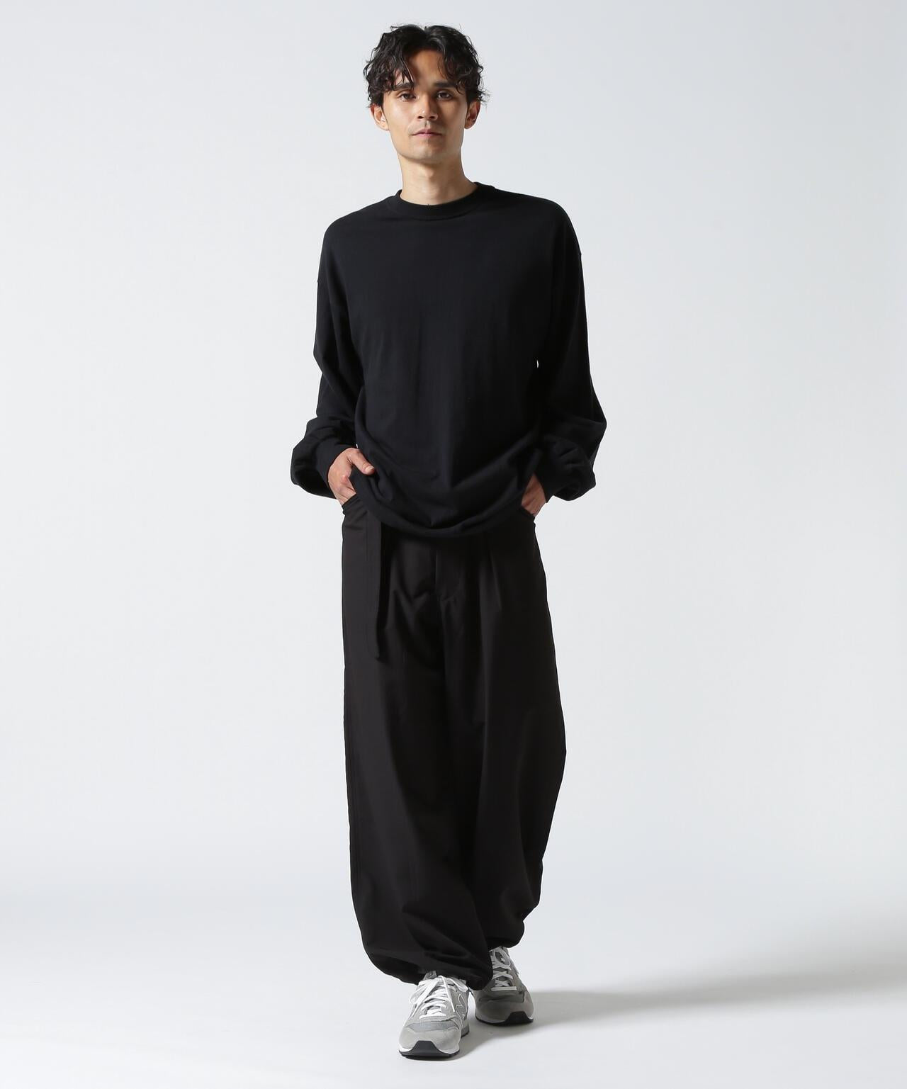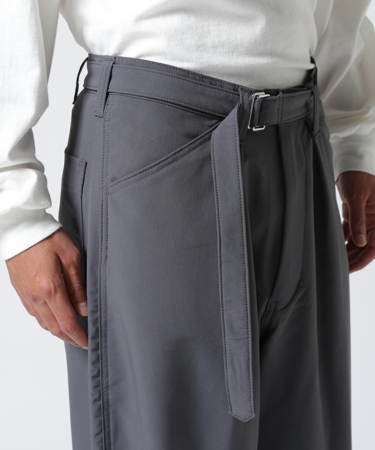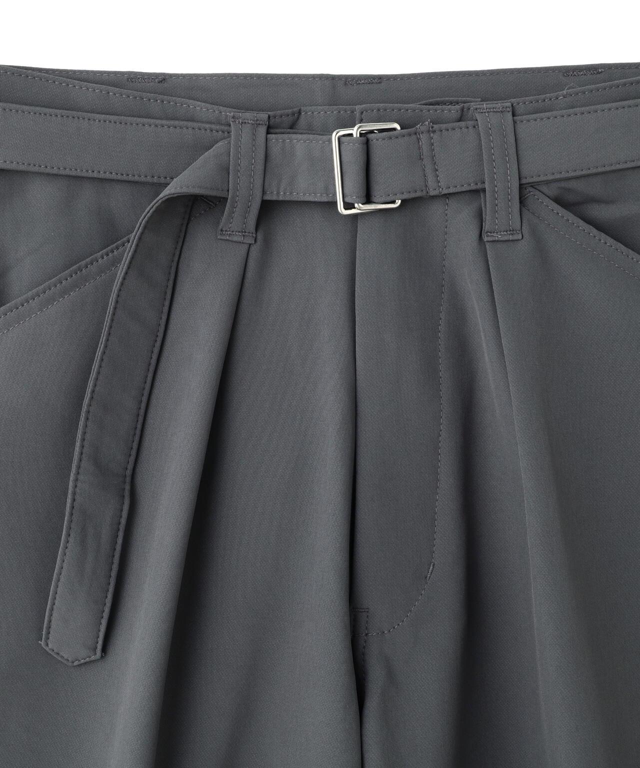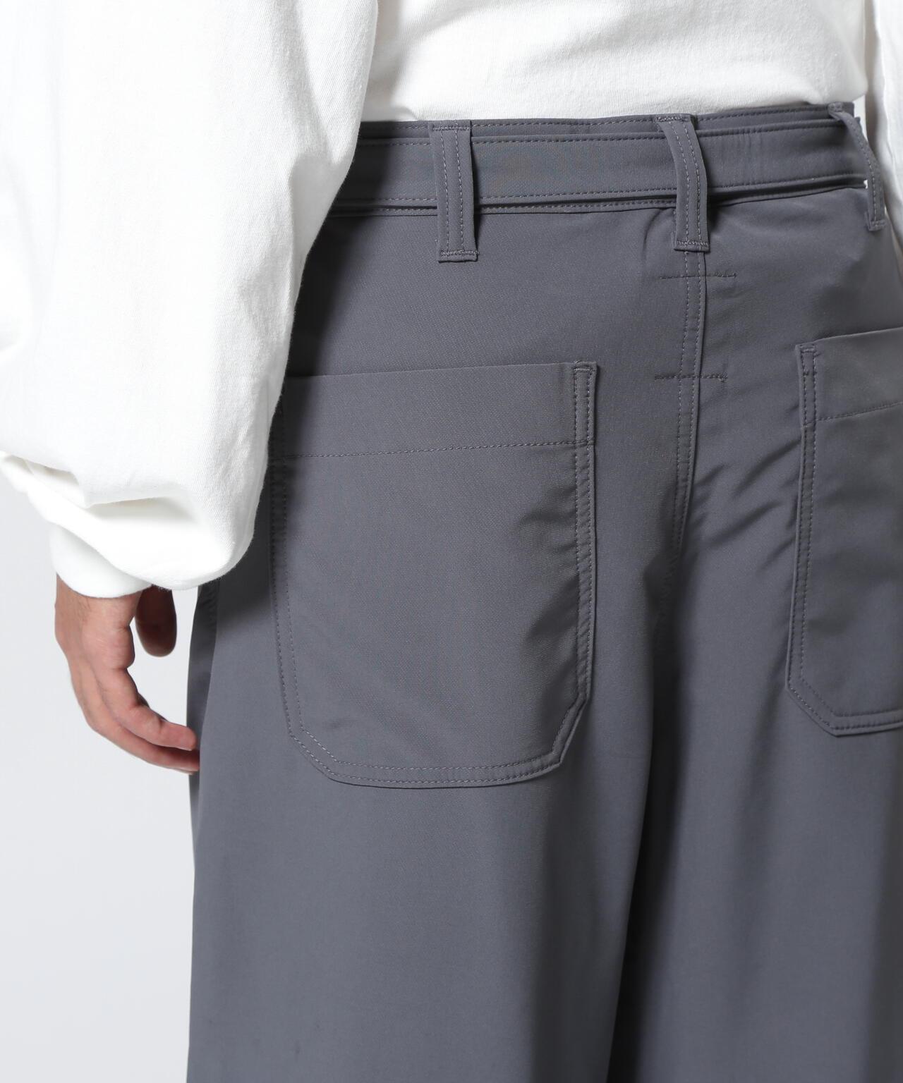 B omnivore STRETCH POLYESTER BELT LOOSE PANTS 彈力滌綸腰帶寬鬆長褲 寬直筒款式,附有相同面料的腰帶。褲型優美,臀部適度整齊,大腿區域寬闊。下襬處有抽繩。B omnivore] [B omnivore] omnivore = 可與各種時尚風格混搭而不囿於雜食系的服裝。