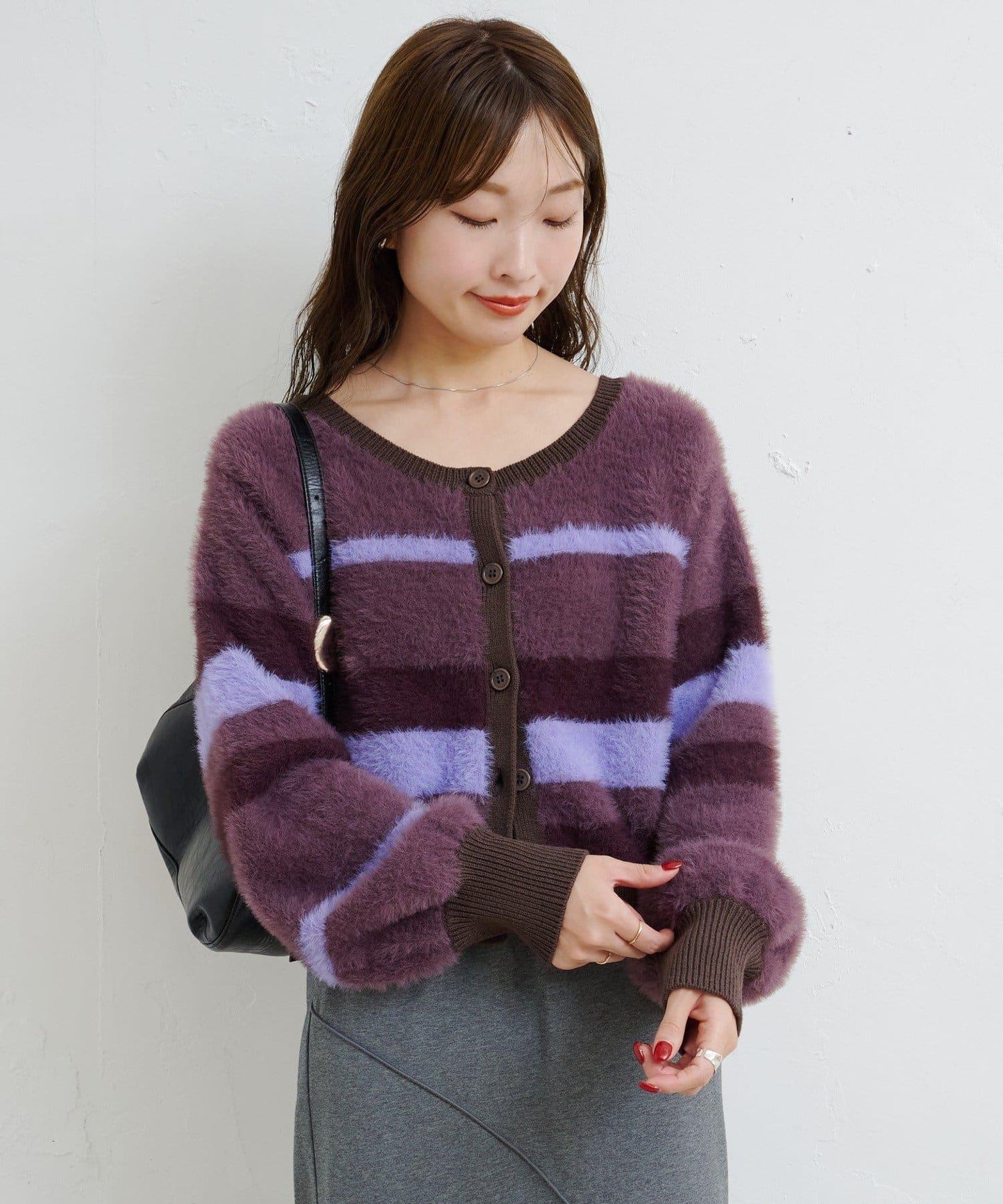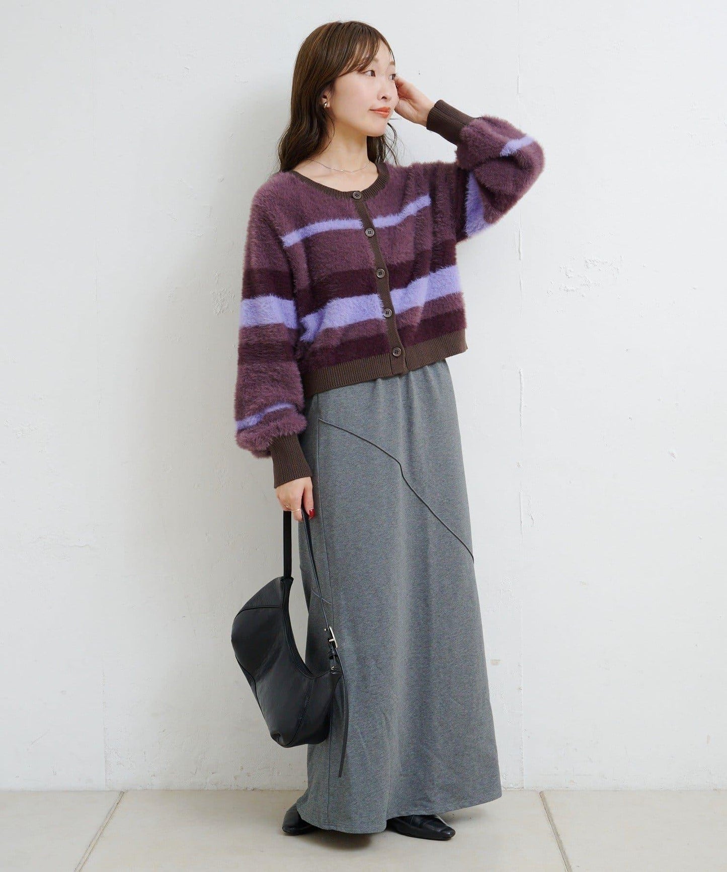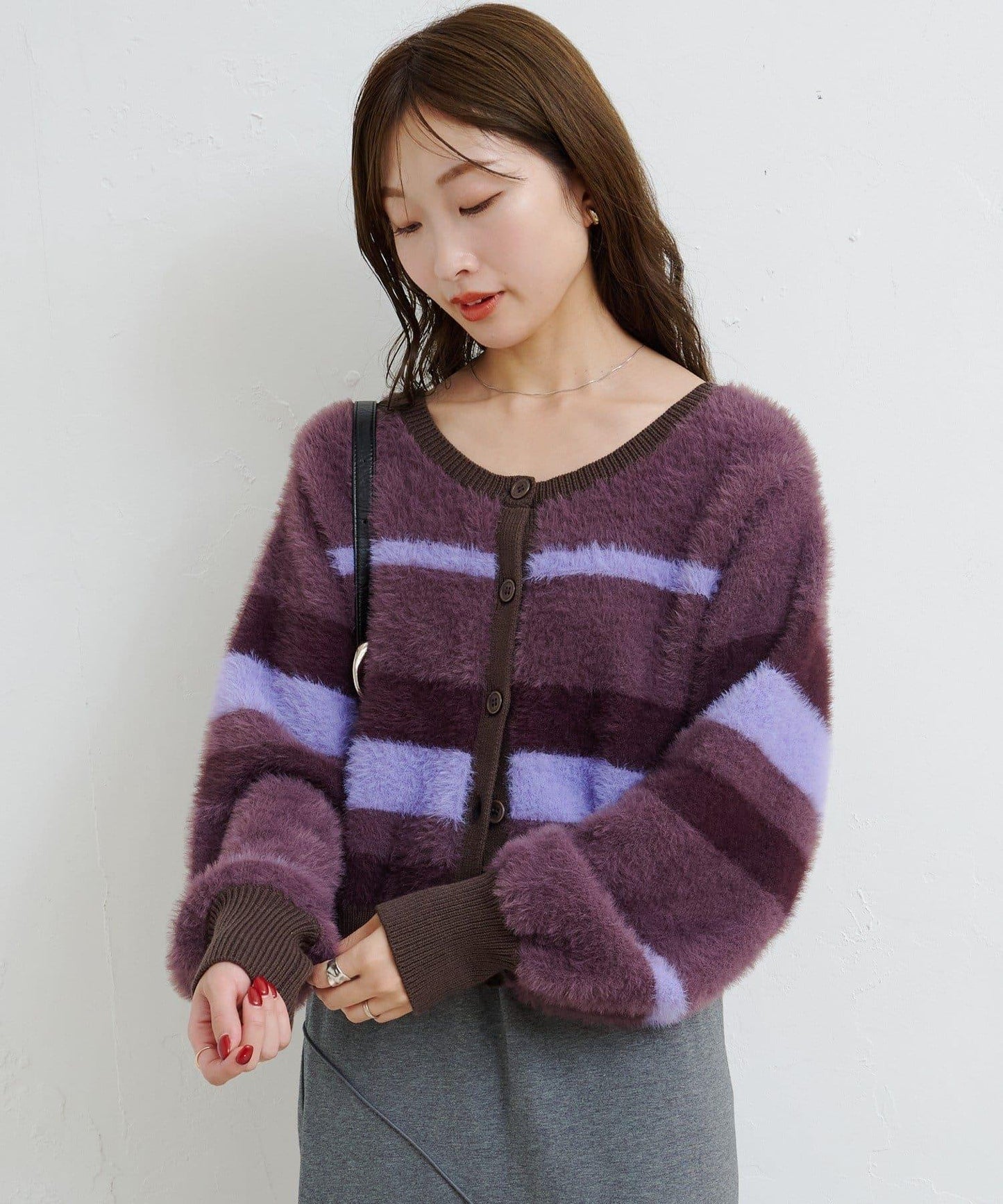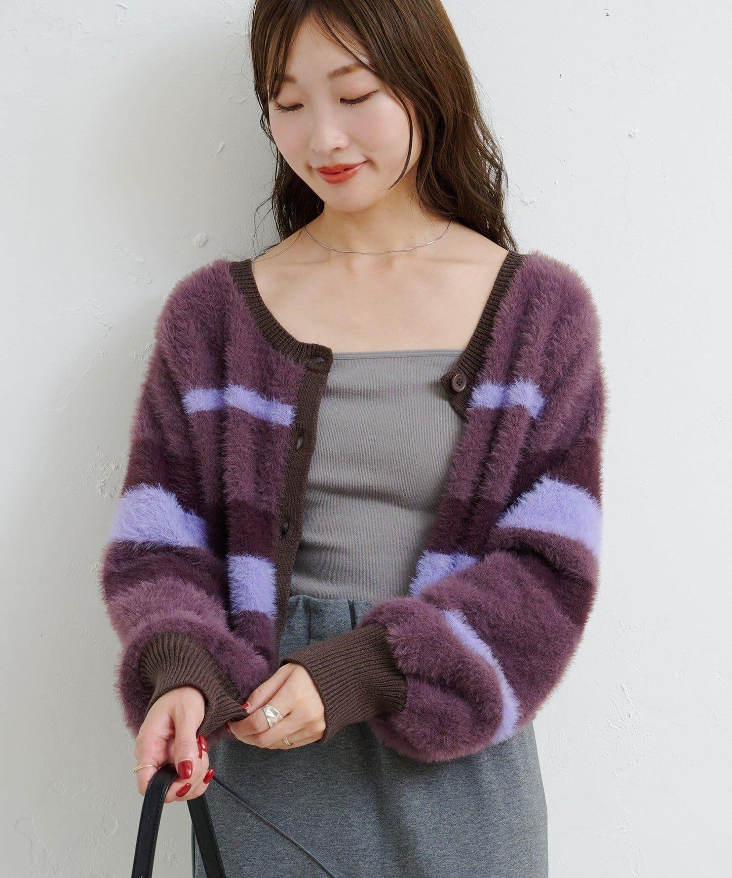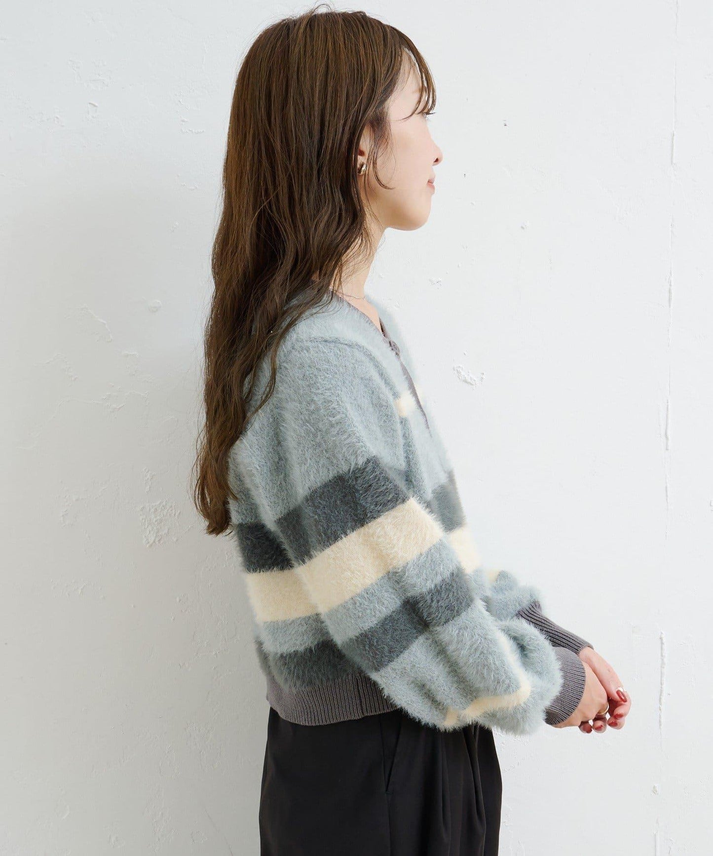採用蓬鬆絨毛面料的雙向邊開衫。
