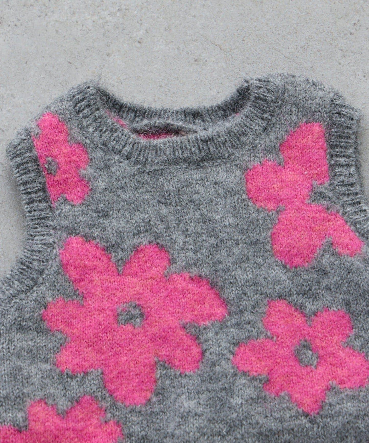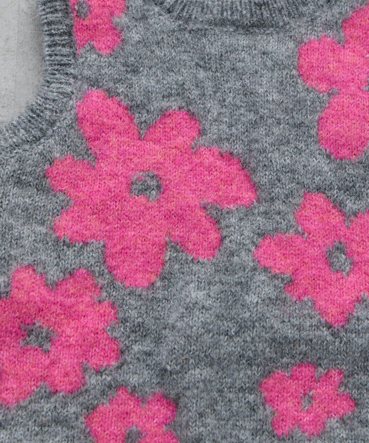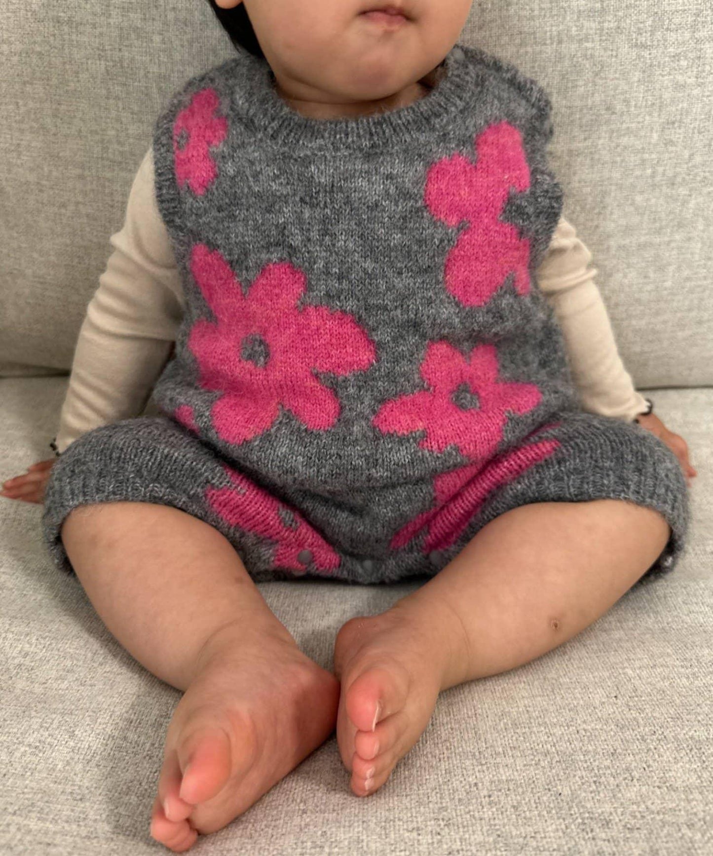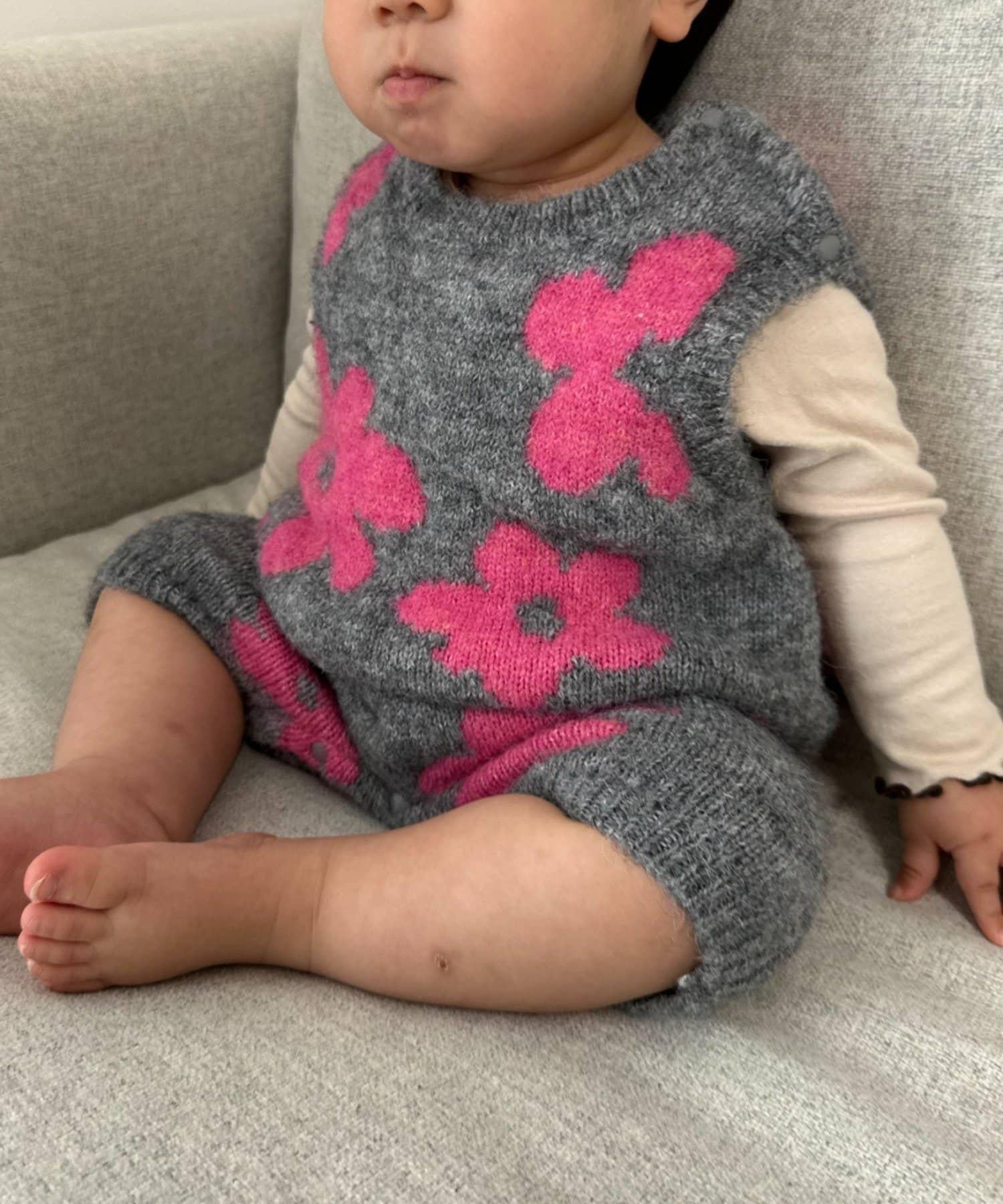 可愛的針織連衣裙上有醒目的花朵圖案。