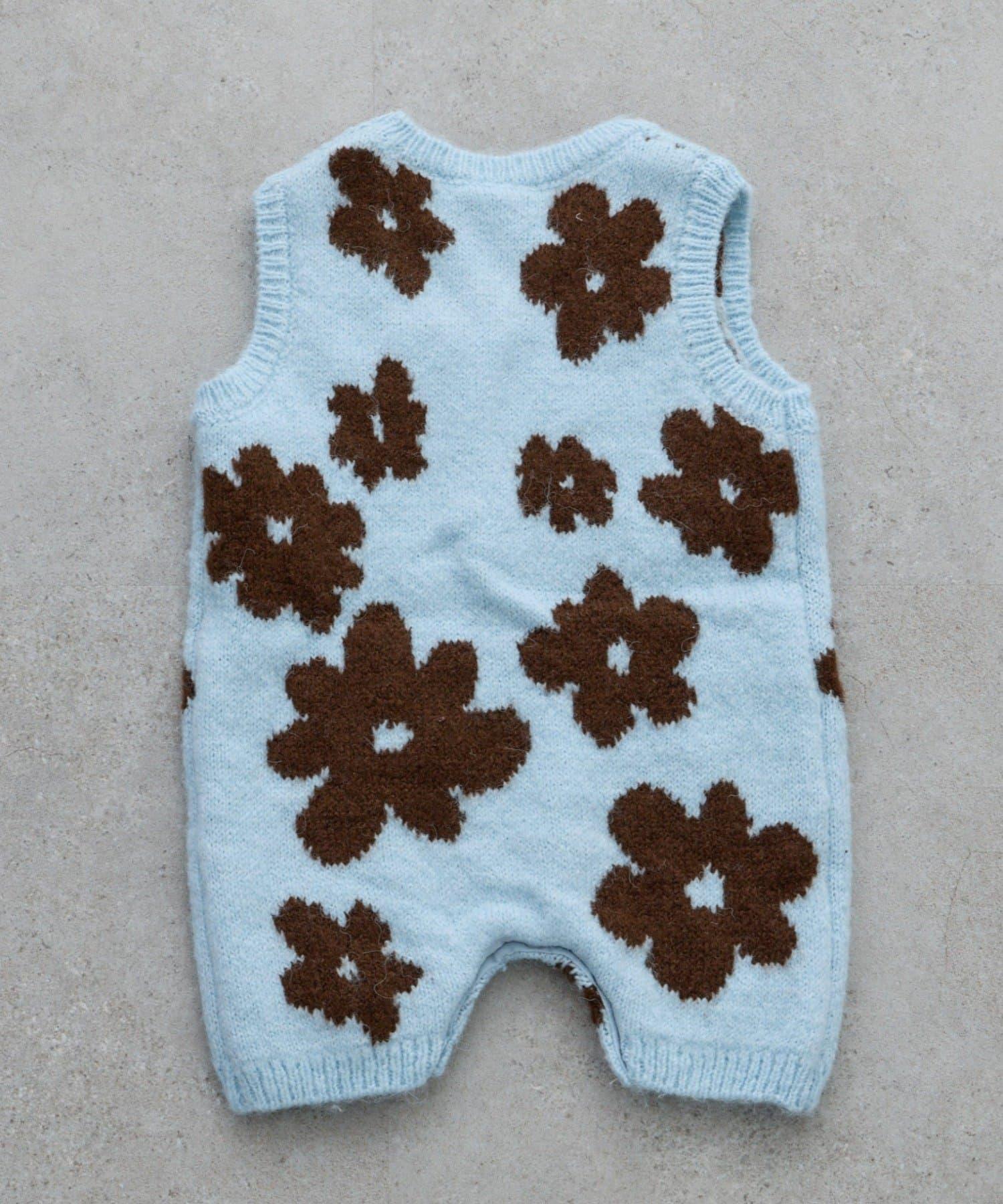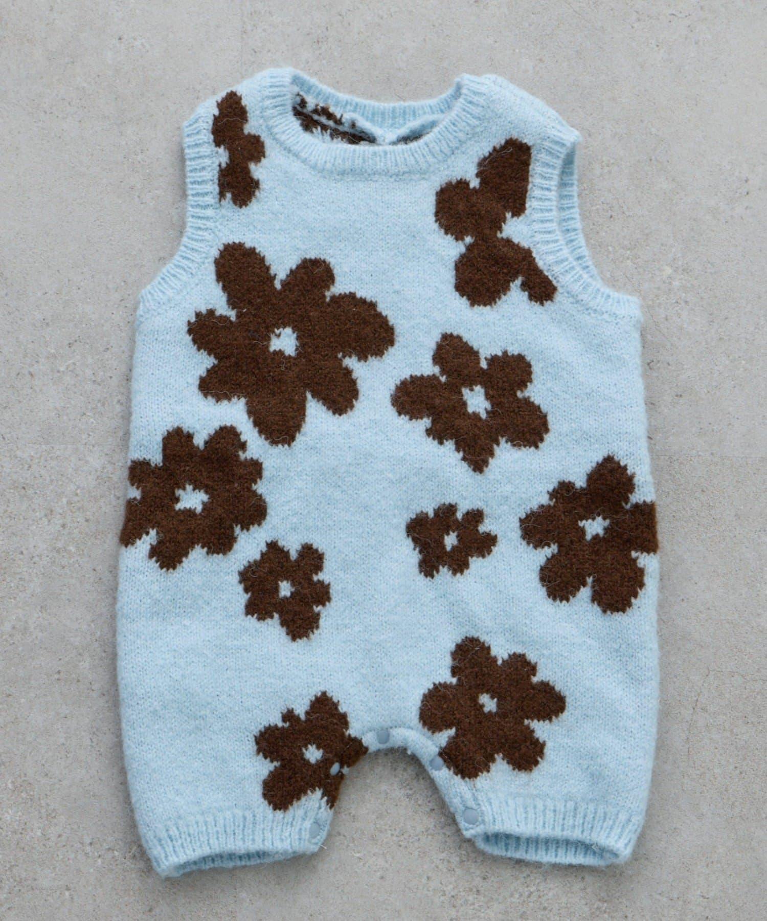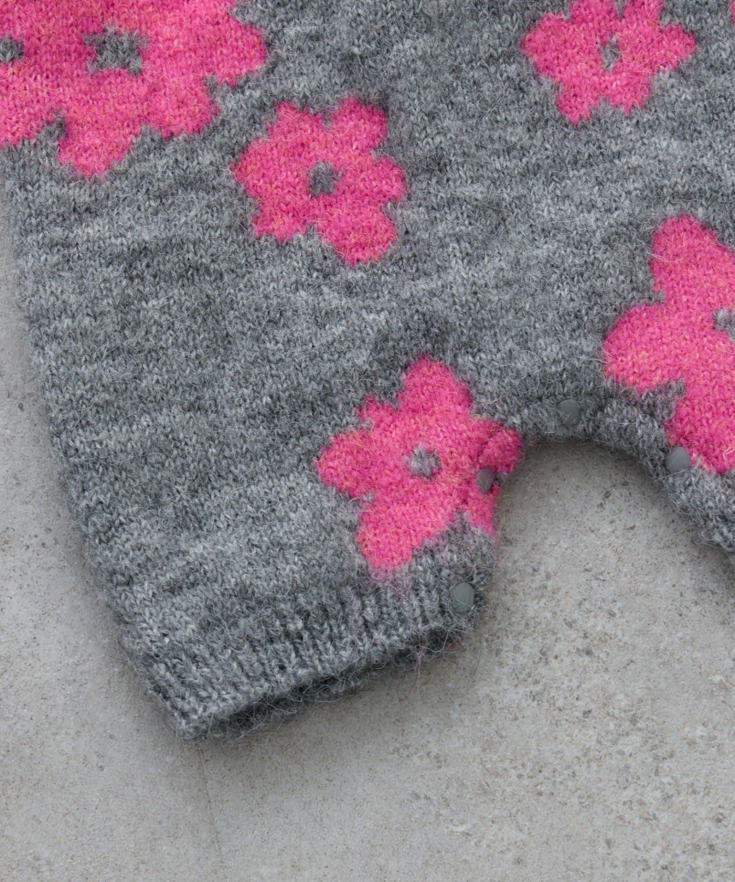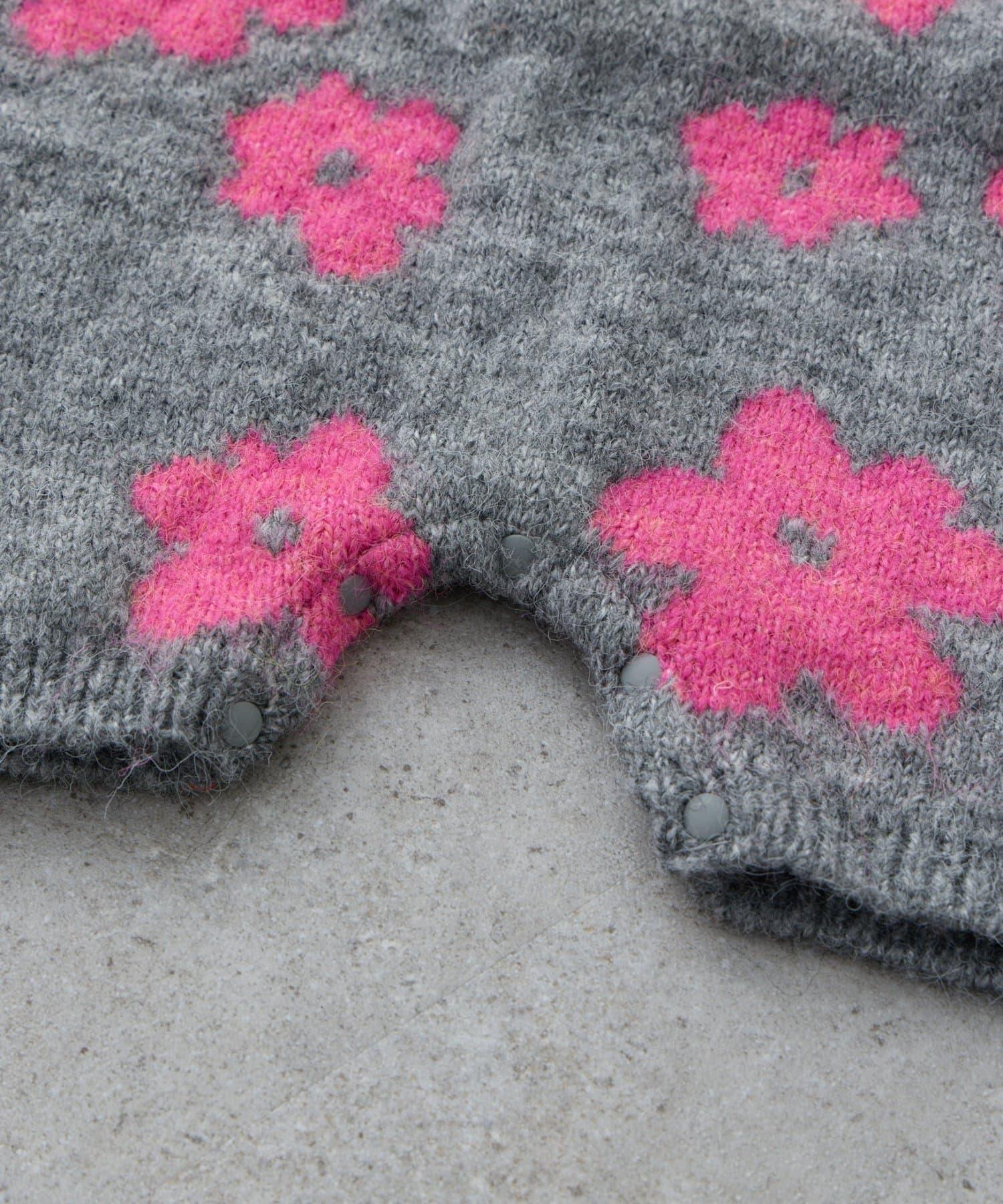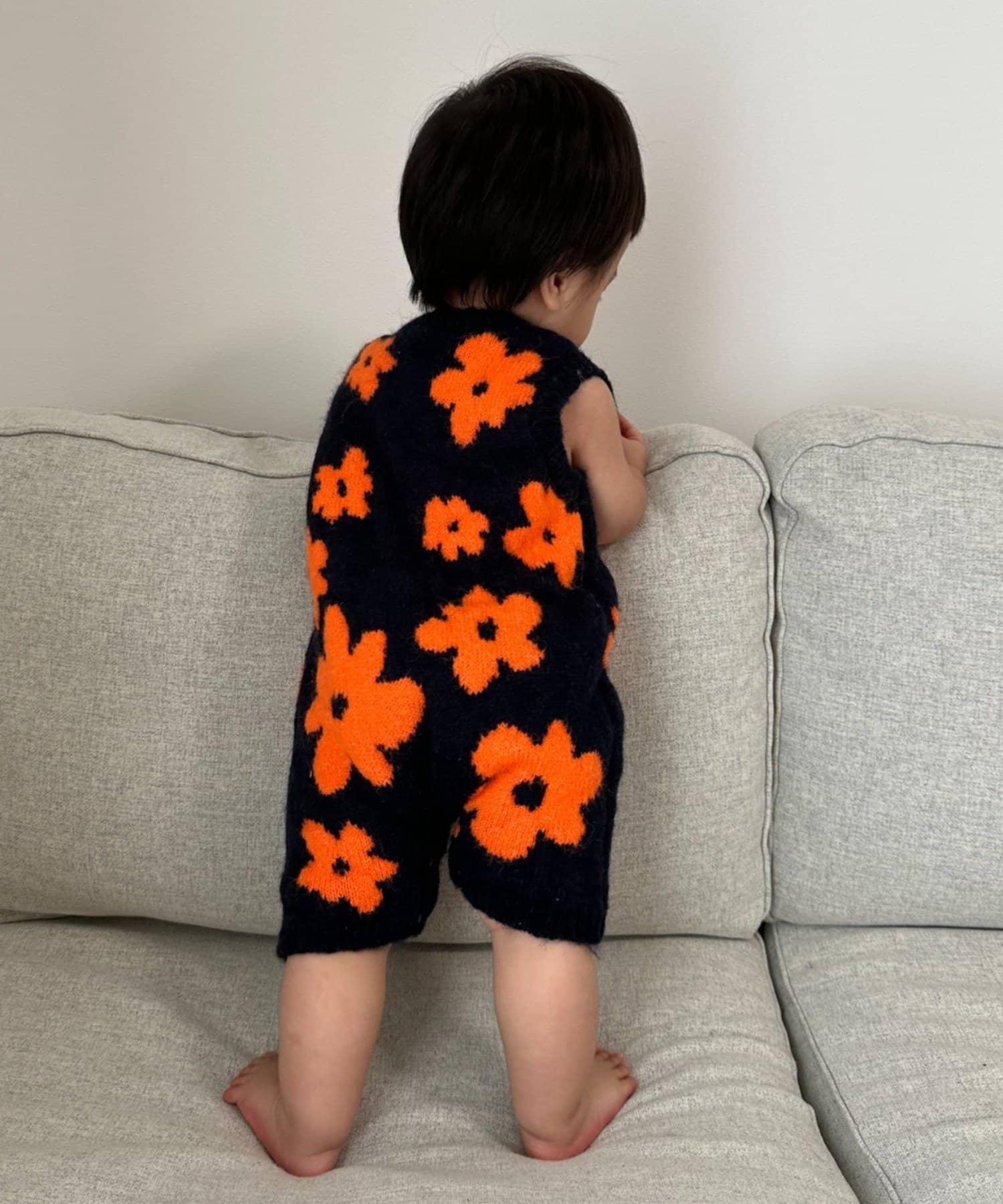 可愛的針織連衣裙上有醒目的花朵圖案。