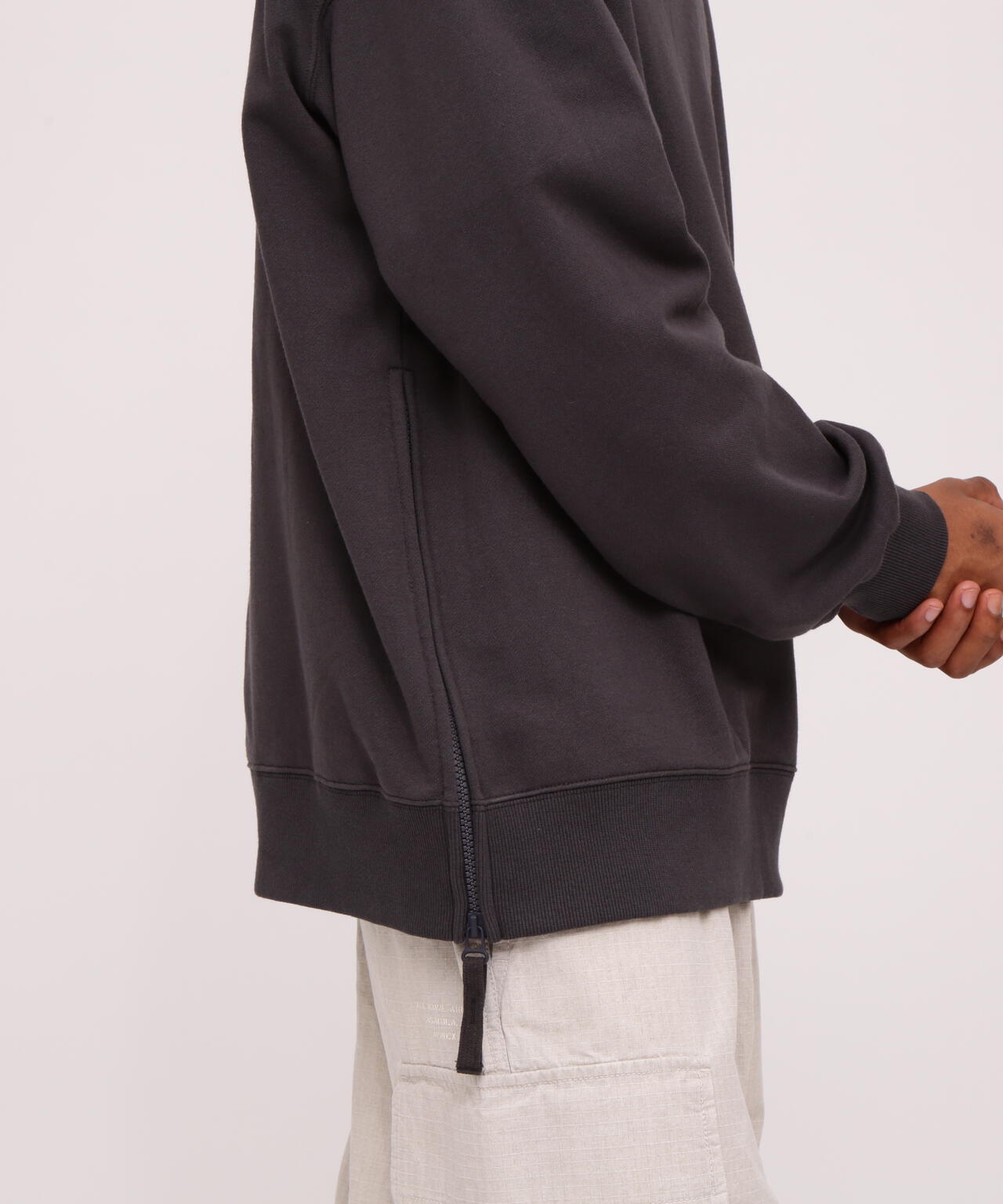 運動衫採用寬鬆的剪裁,兩側有拉鍊開合。