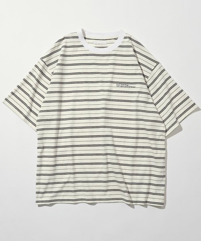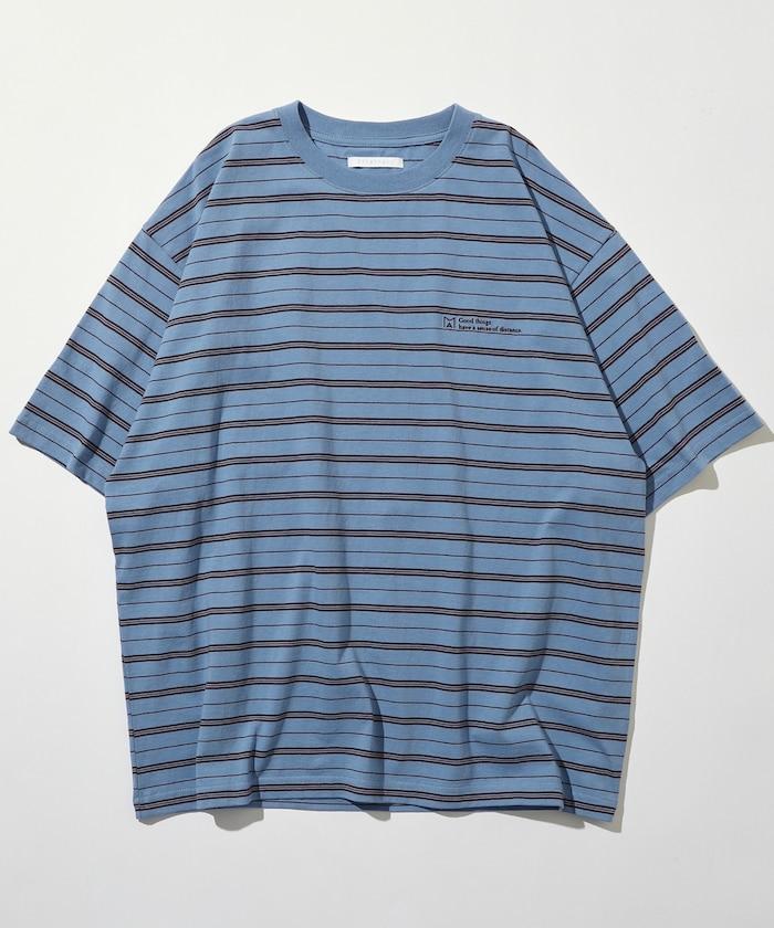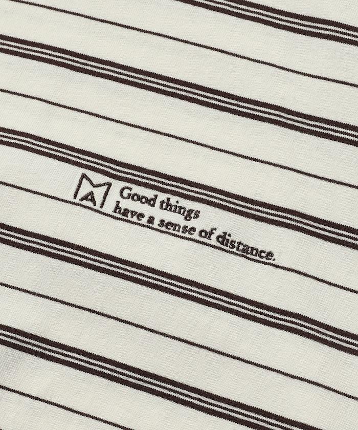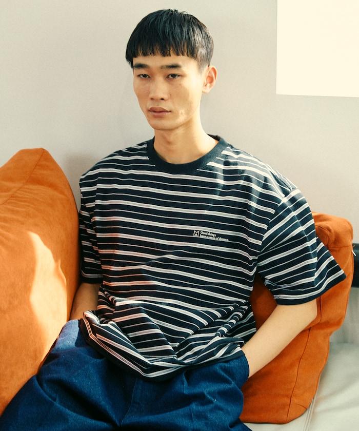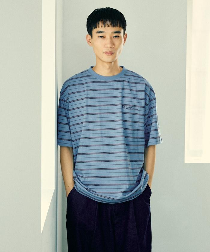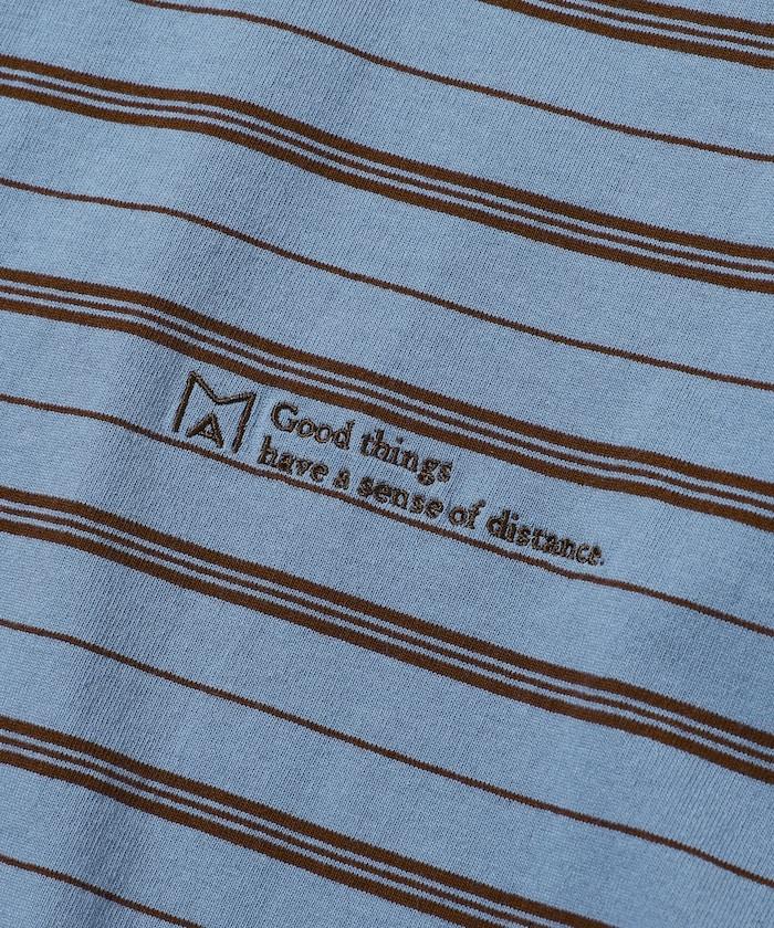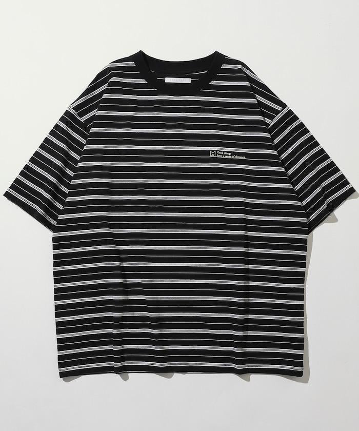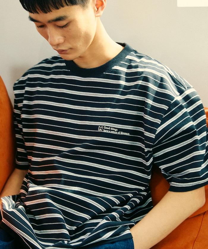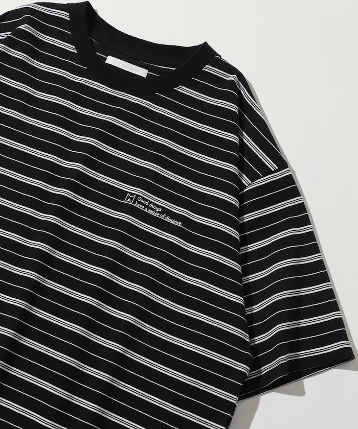 BASIC標誌刺繡T恤條紋/一點刺繡條紋T恤/短袖