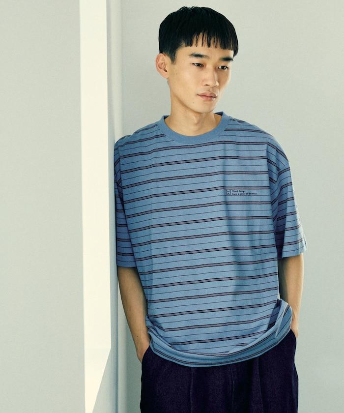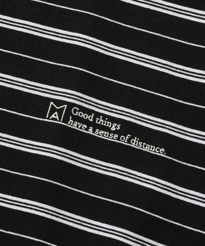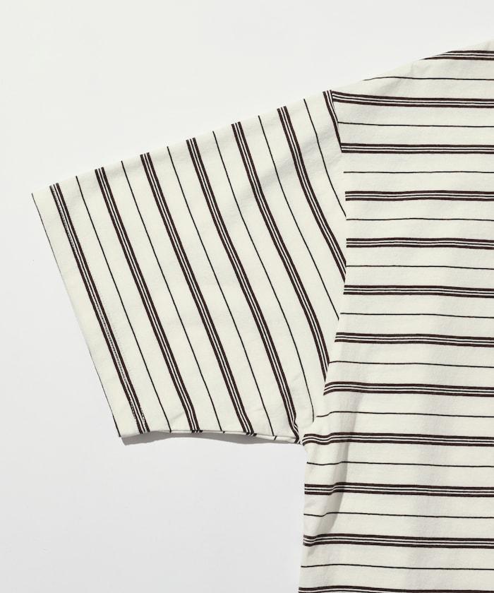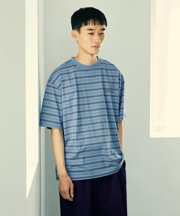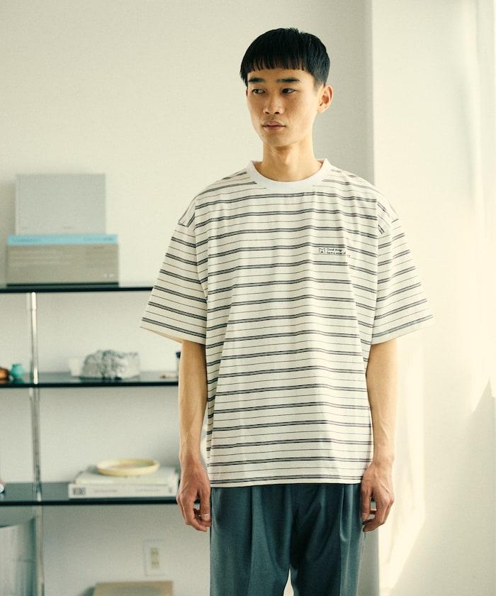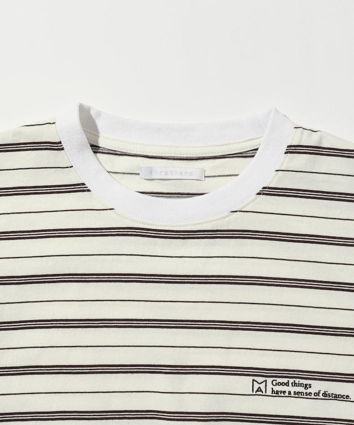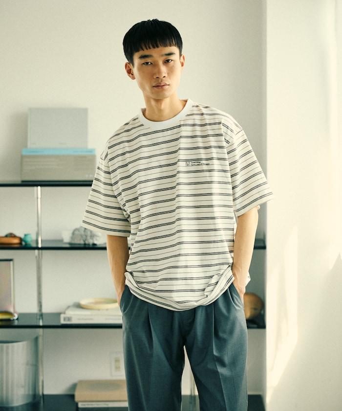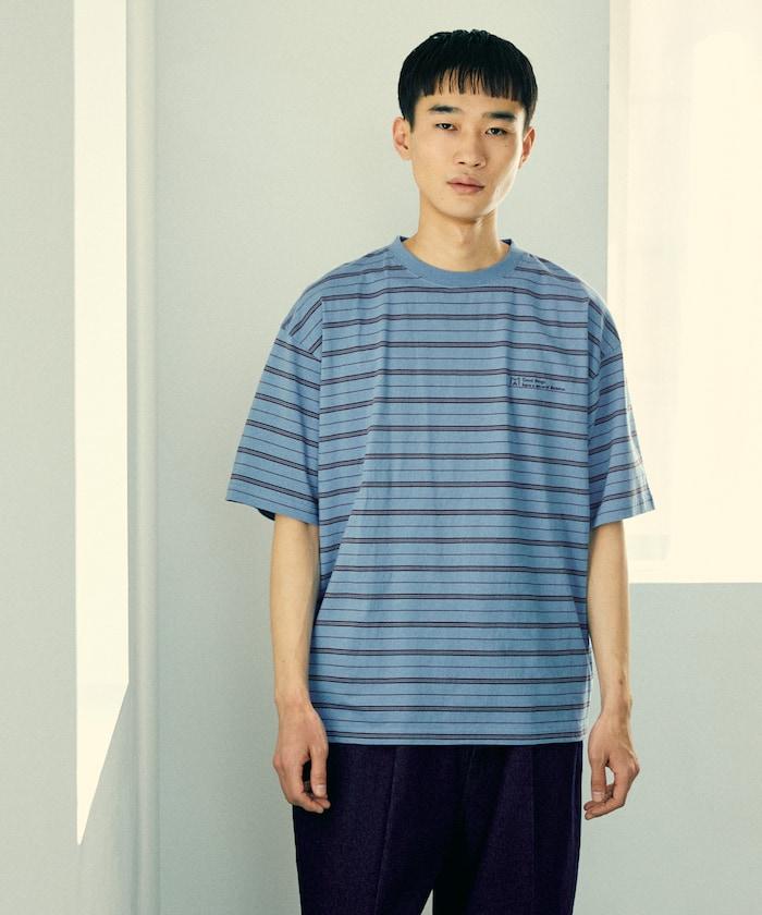 BASIC標誌刺繡T恤條紋/一點刺繡條紋T恤/短袖