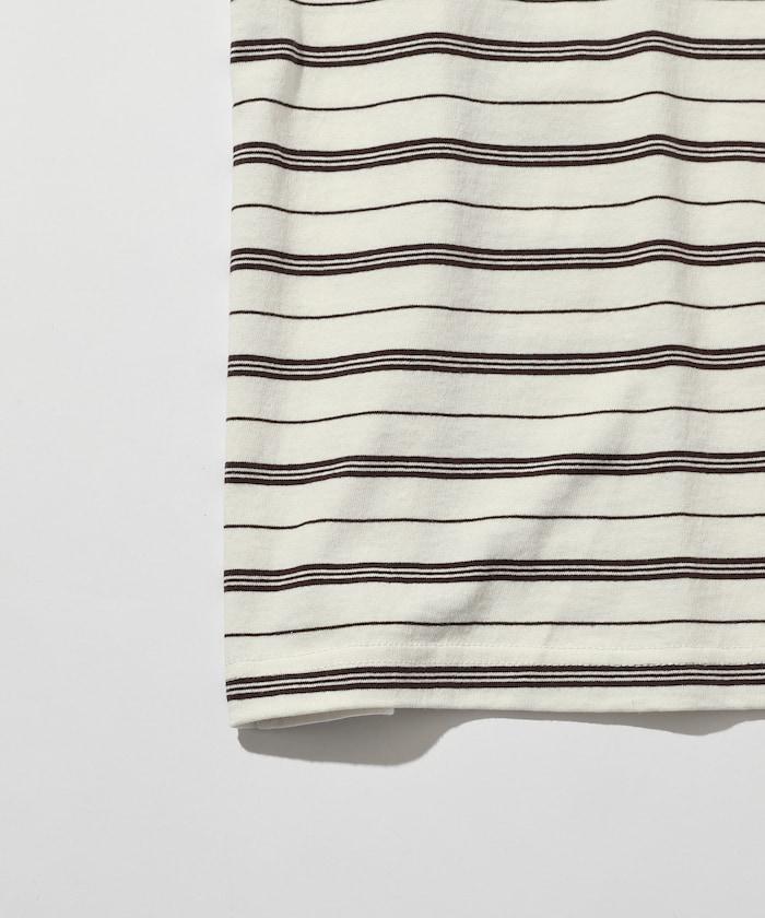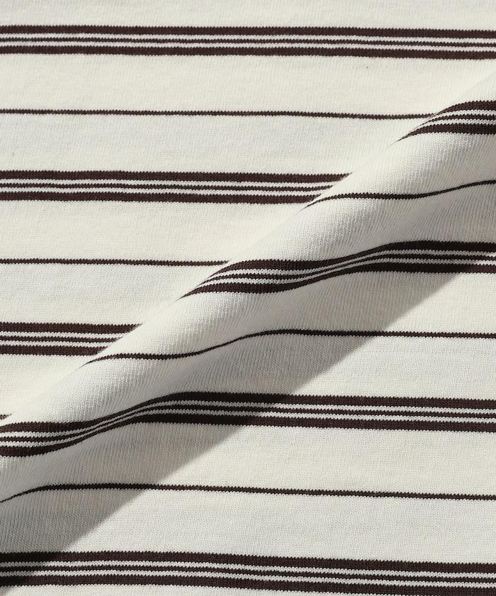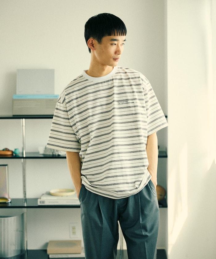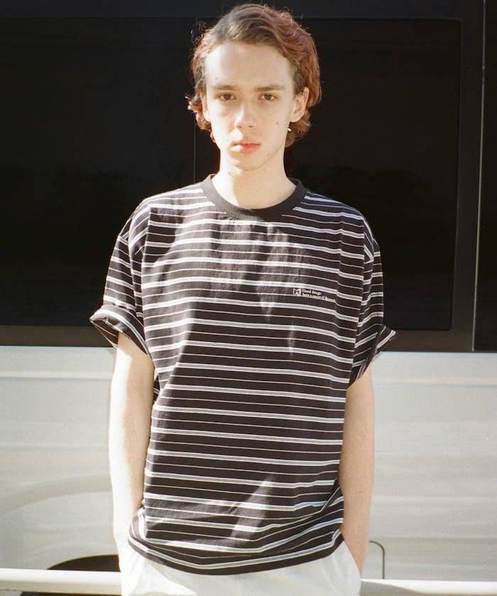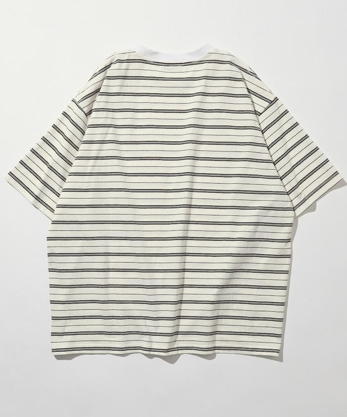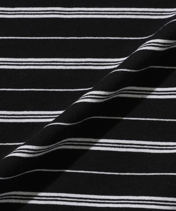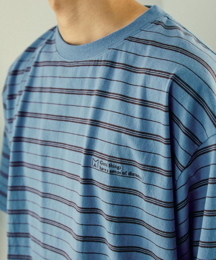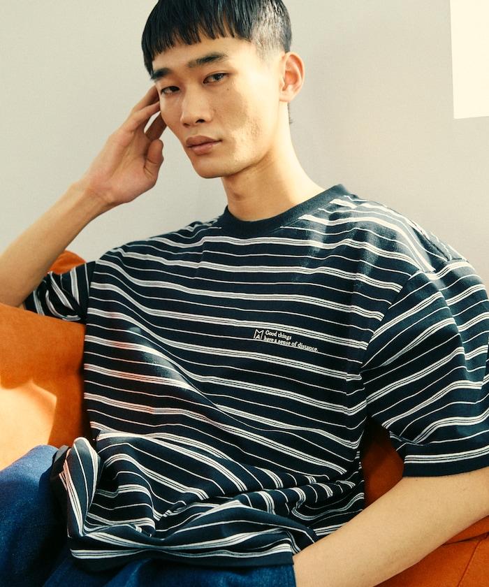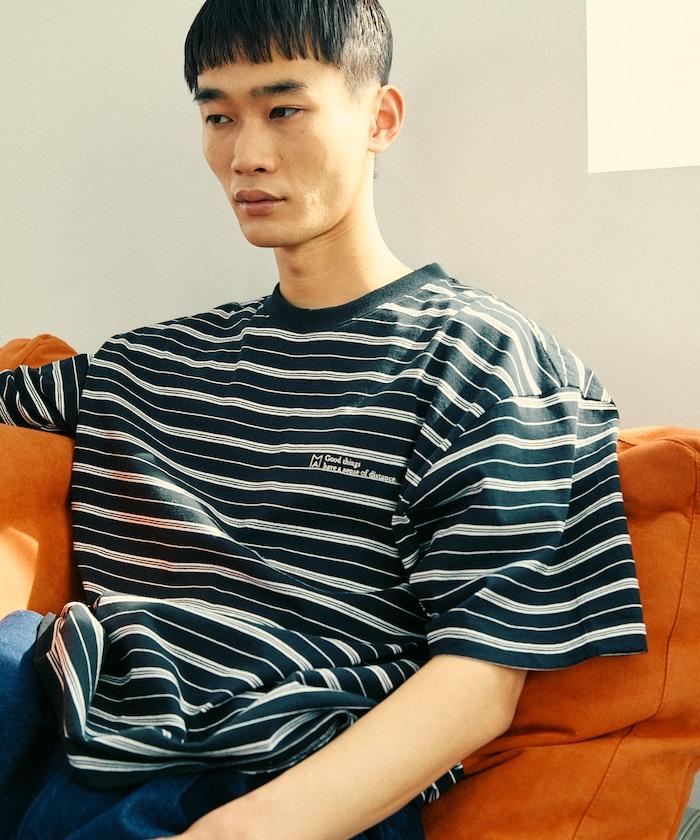 BASIC標誌刺繡T恤條紋/一點刺繡條紋T恤/短袖
