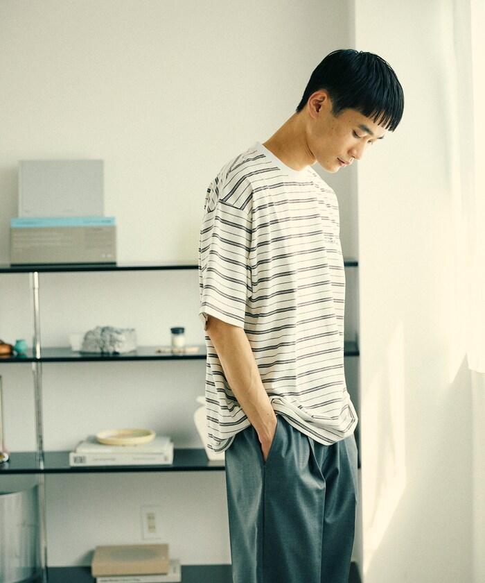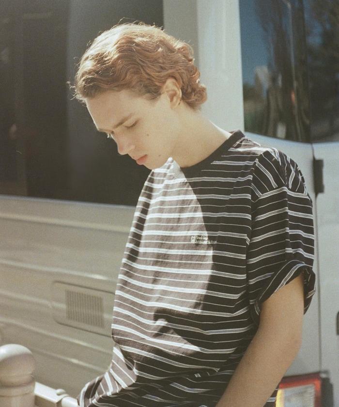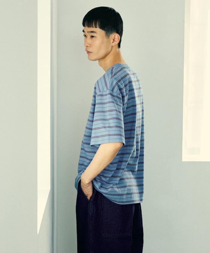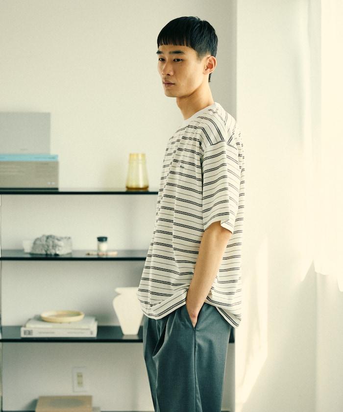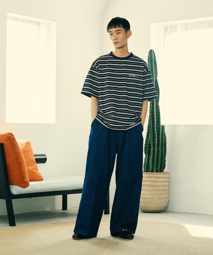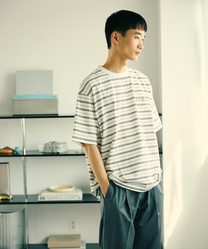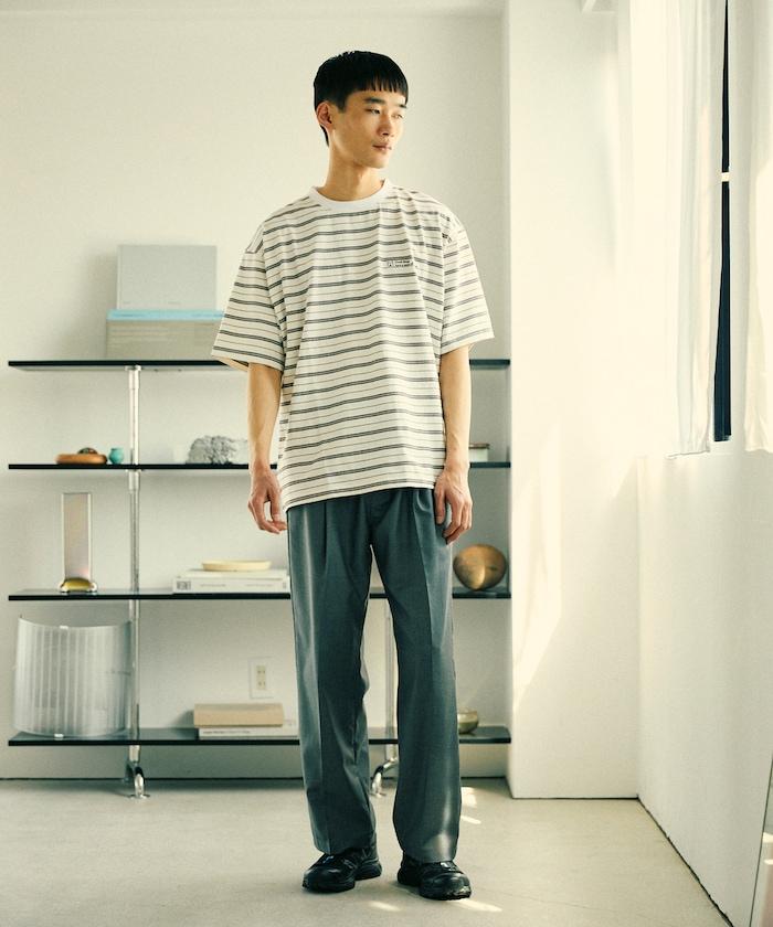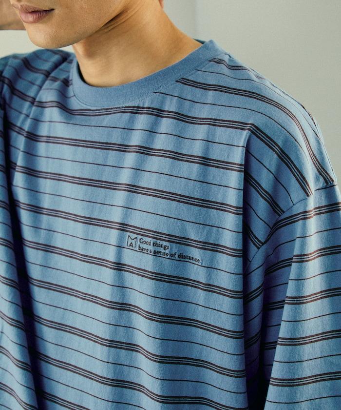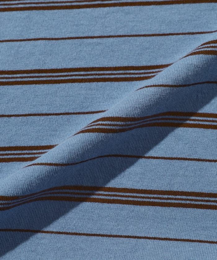 BASIC標誌刺繡T恤條紋/一點刺繡條紋T恤/短袖