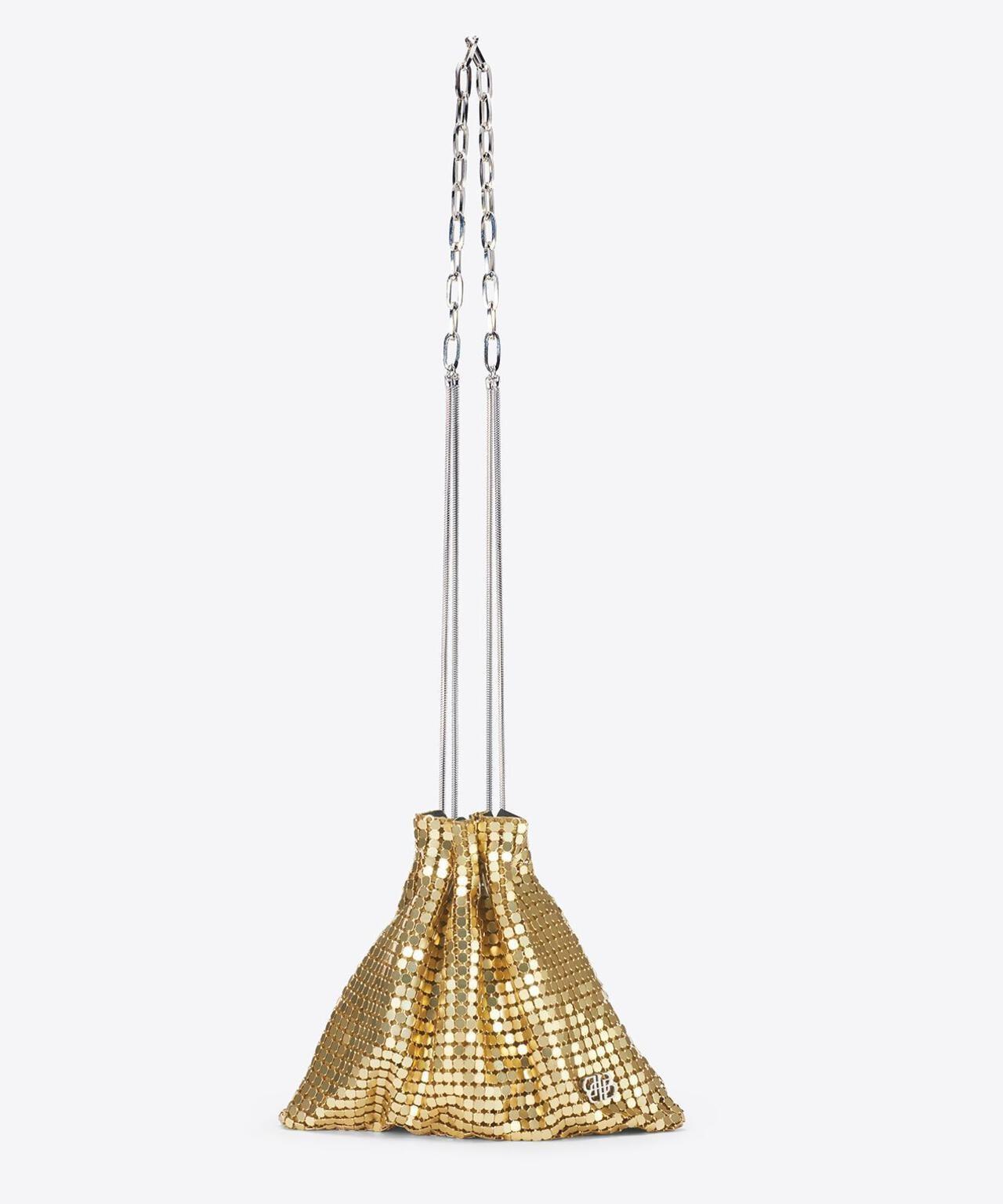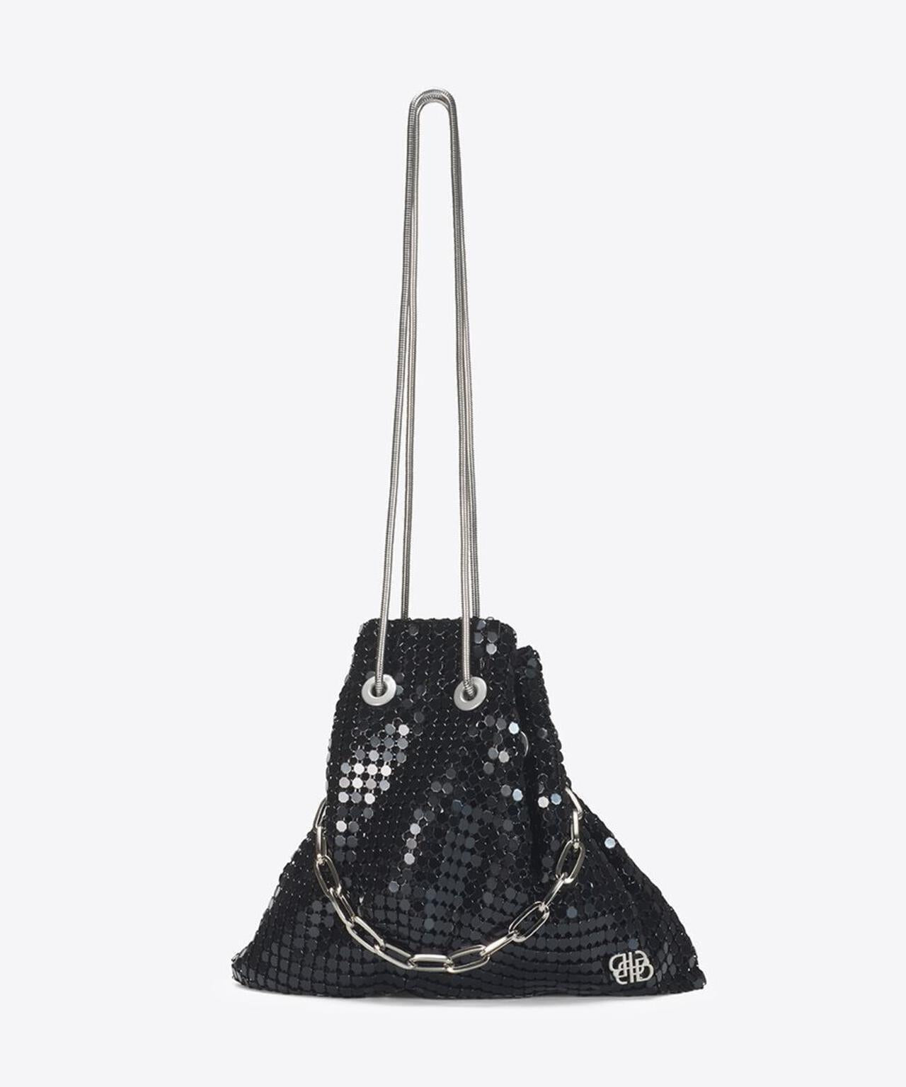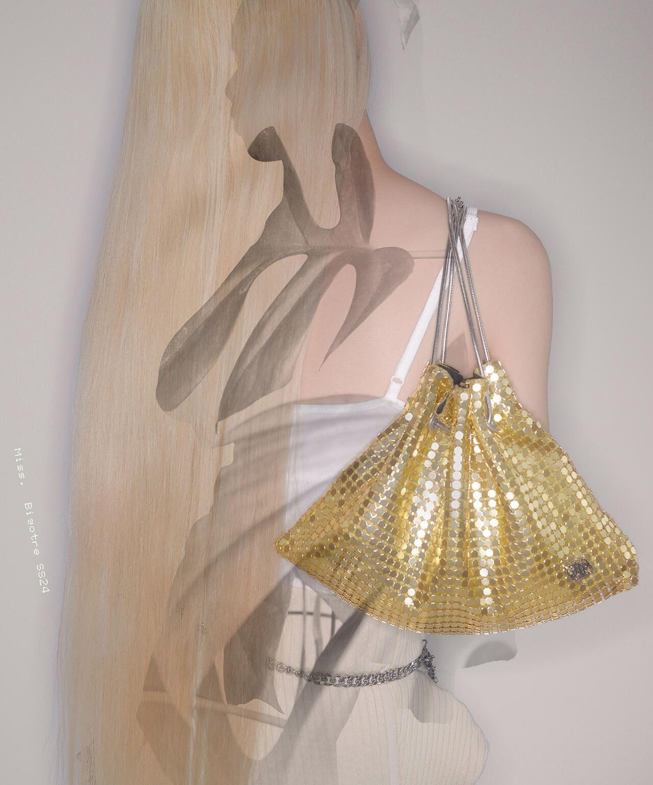 BIGOTRE Bigoter 的標誌性 PURSE METAL MINI 手袋採用亮片裝飾,極具存在感。它可搭配類似扁平包袋的抽繩和收口鏈條使用。肩鏈可長可短。正面下方有品牌標誌。內部設有一個拉鍊口袋,可存放小件物品。小巧的尺寸非常適合極簡主義者,可以攜帶智能手機、迷你錢包、鑰匙包和其他外出必備物品。由於材料的特性,本產品的顏色可能會因摩擦或汗水、雨水等溼氣而偏移。此外,本產品所使用的材料和裝飾配件都非常精緻。有可能因撞擊等原因造成損壞,因此請勿摘下。