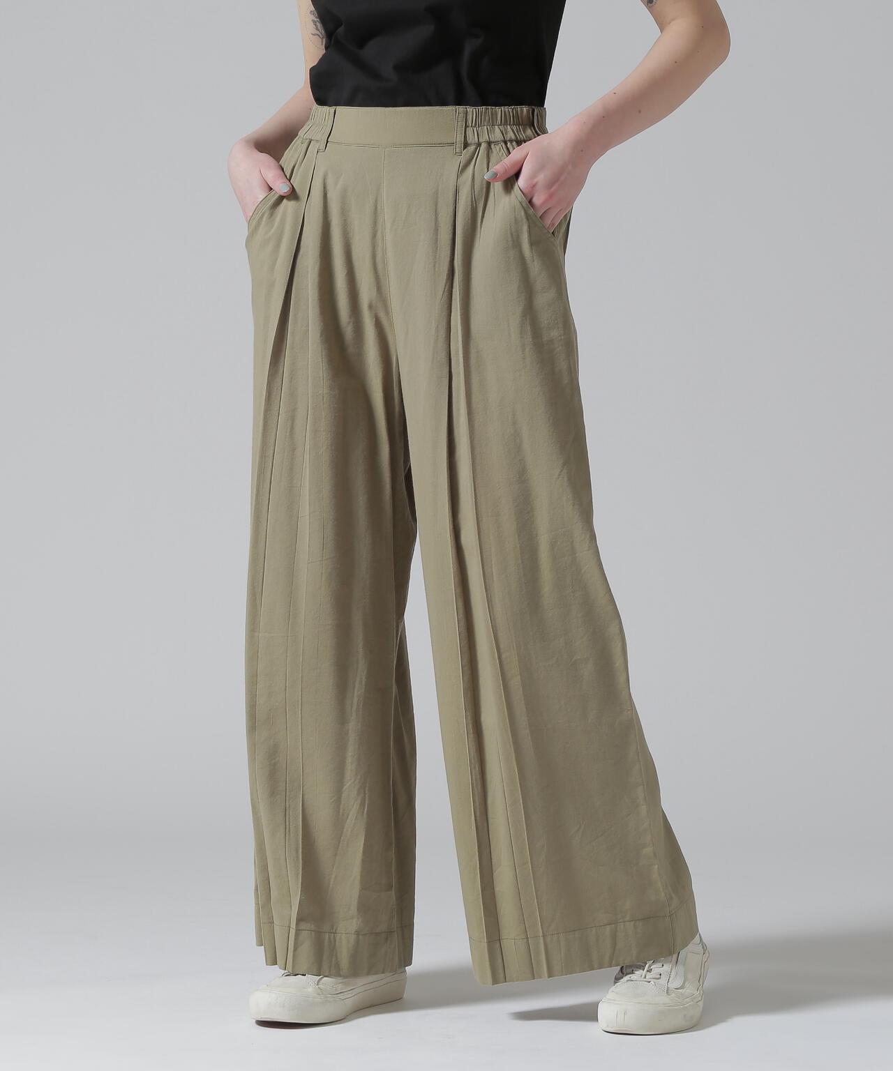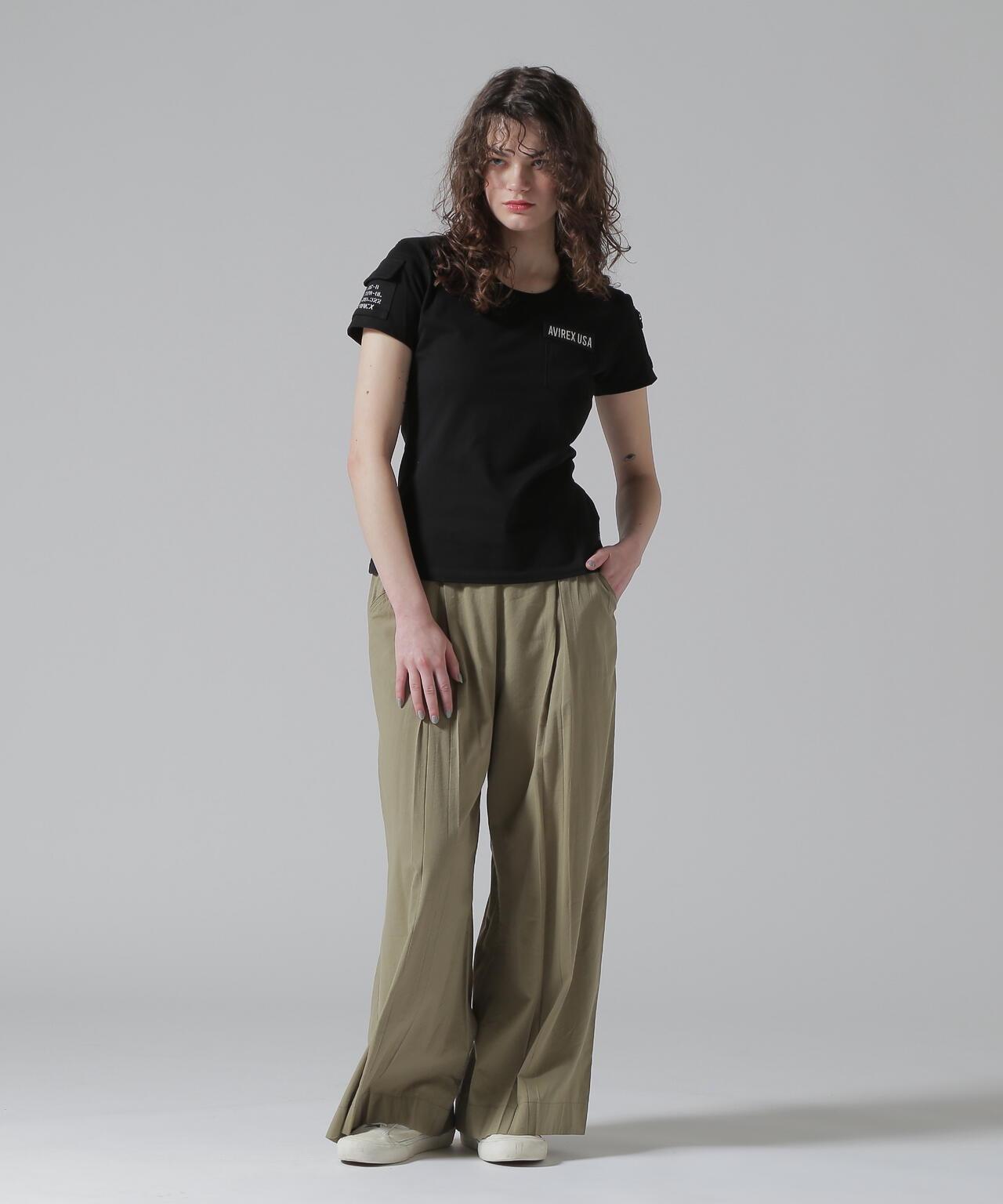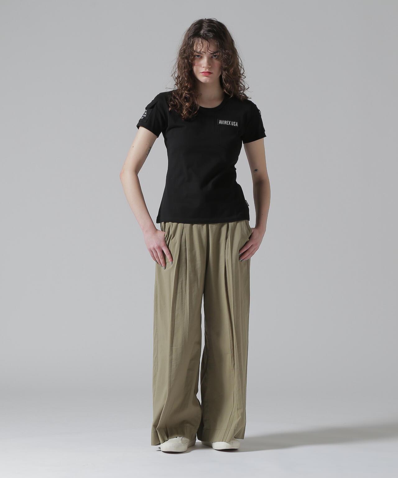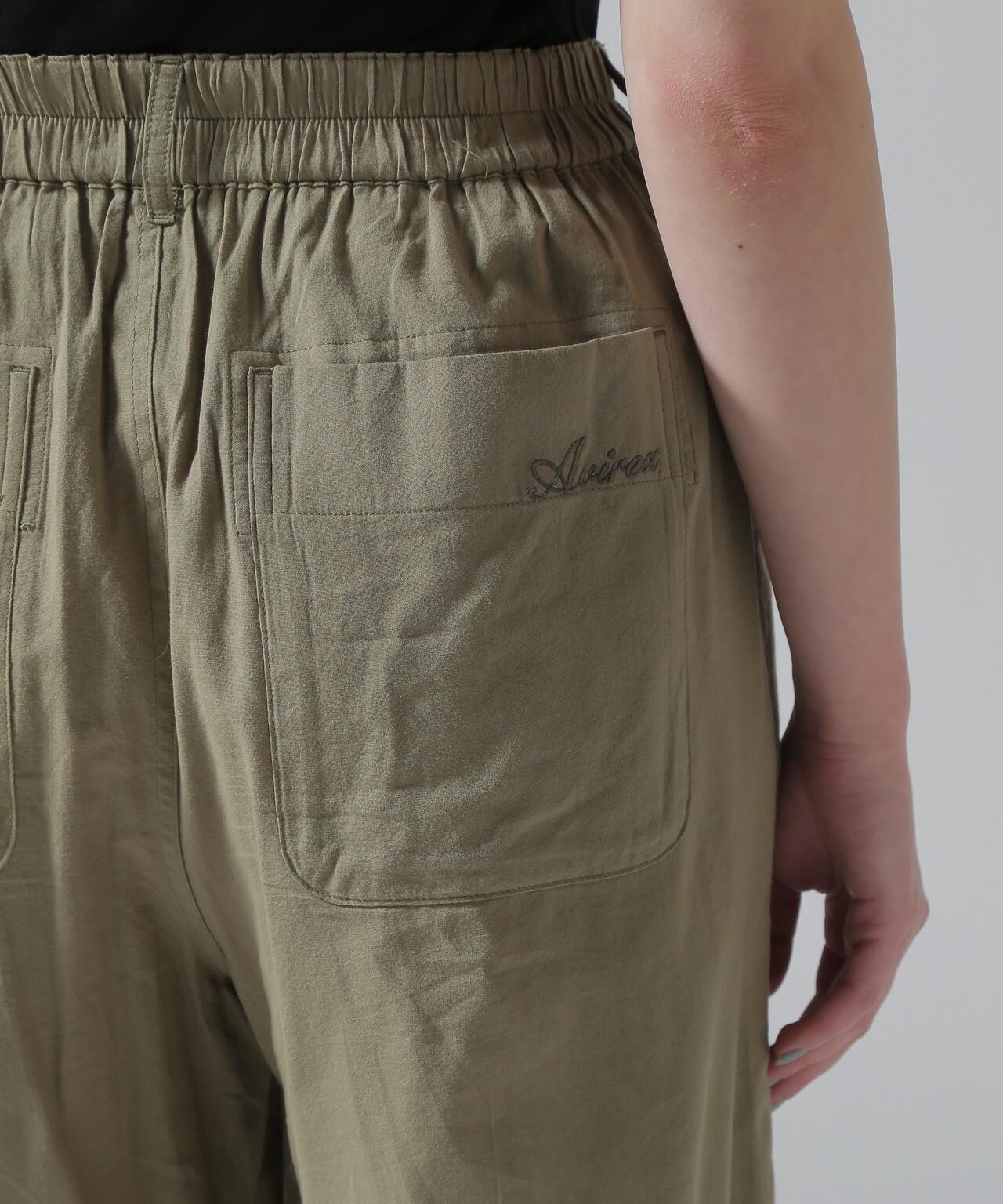 2025 春夏季單品盒褶休閒褲 - 前幅深盒褶設計,打造立體輪廓。廓形輕薄,易於活動,春夏季節穿著舒適。推薦造型寬鬆、寬大的廓形。今年推薦的造型是搭配短款上衣或廓形適中的上衣。AVIREX WOMAN] 該系列將純正軍裝的功能性和設計感投射到女性休閒裝上。該系列面向聰明、自由、好奇、端莊、活潑的成年職業女性,是一個具有個性和時代感的女裝品牌。