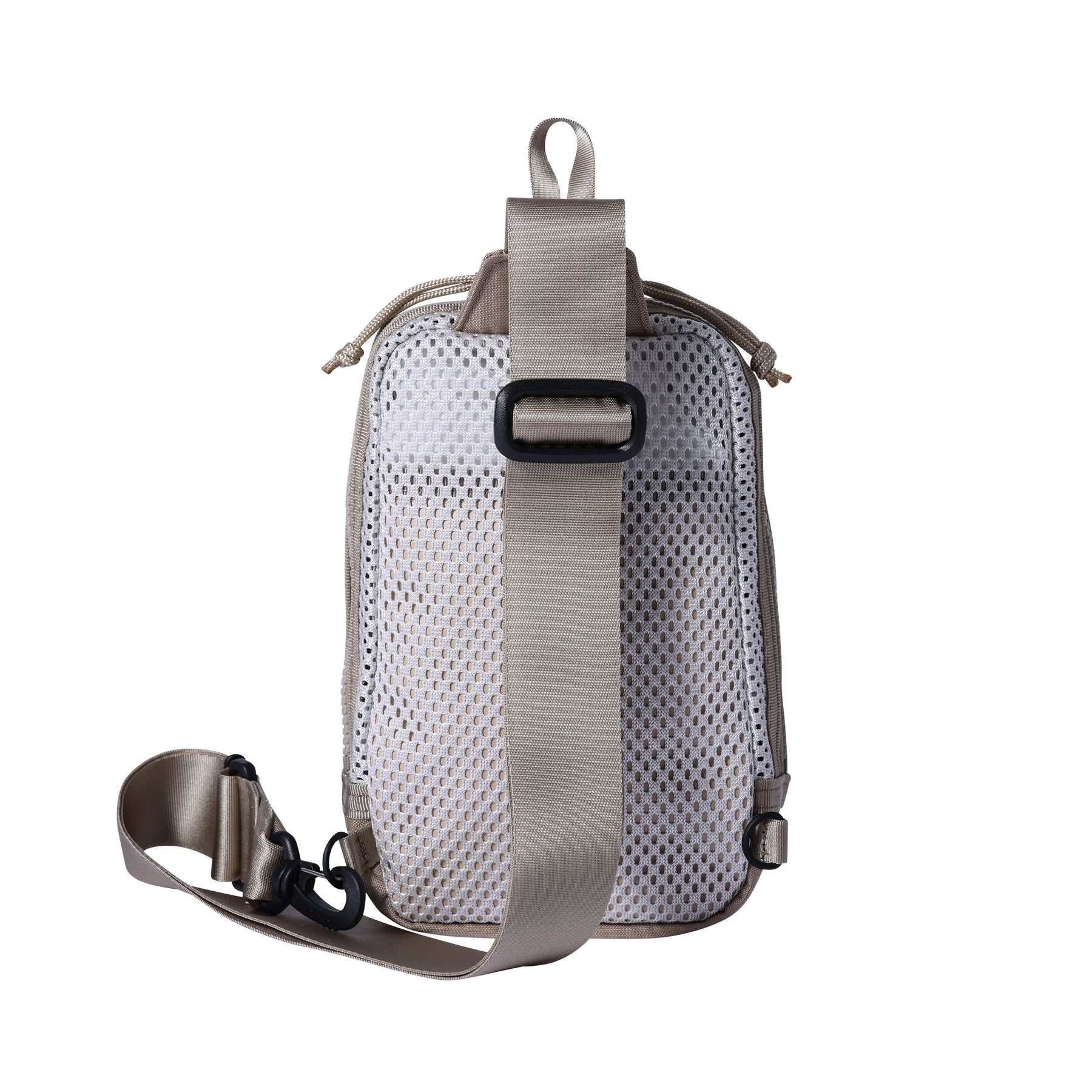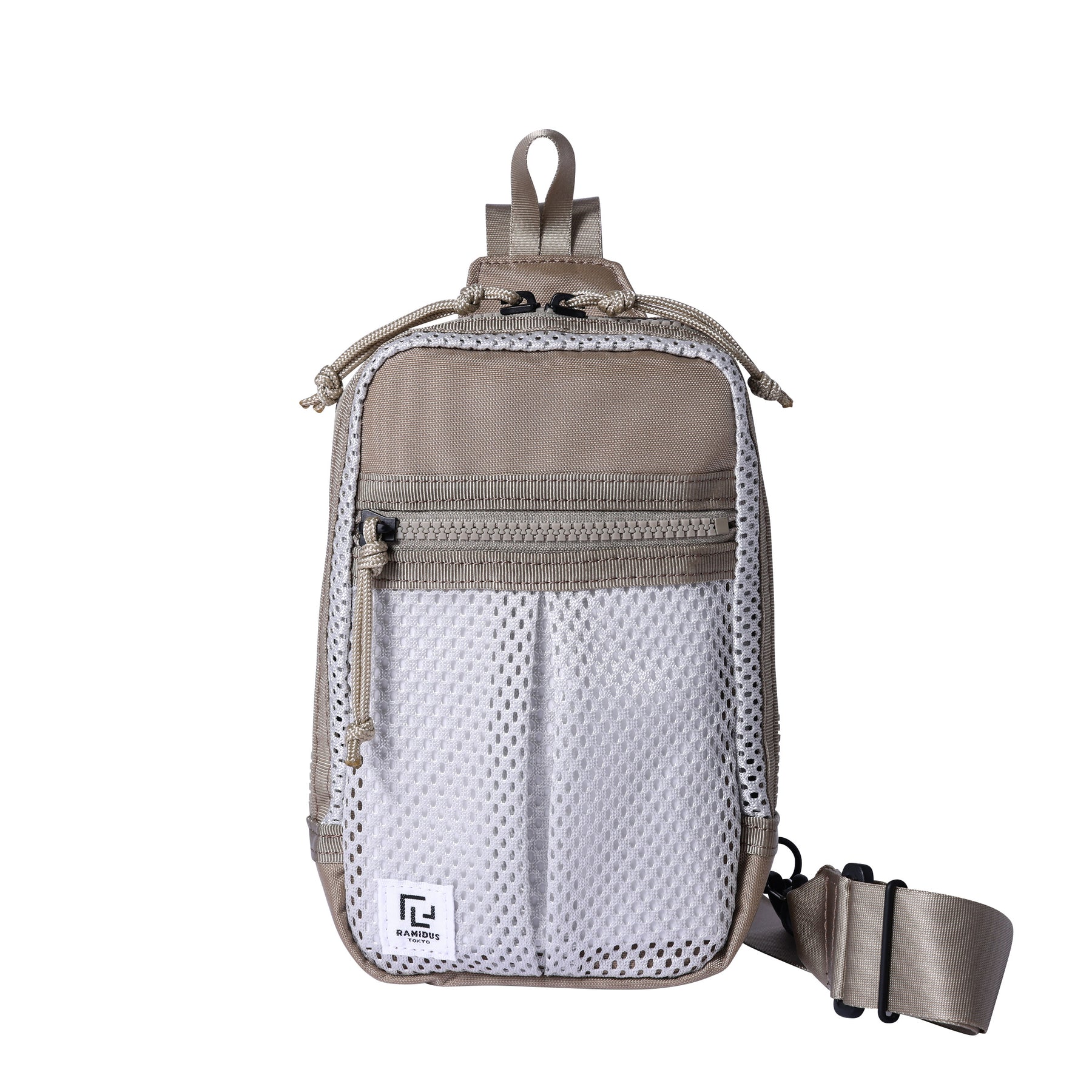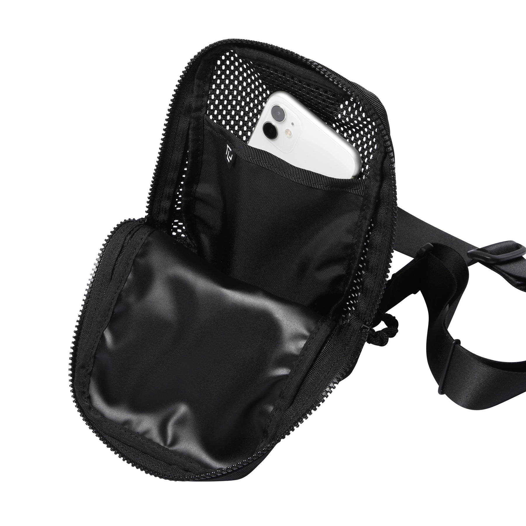 迷你吊袋,可用於攜帶手機、迷你錢包等。肩帶可固定在包的左側或右側,左右肩均可使用。與身體貼合的部分採用厚重的網狀聚酯材料,即使直接接觸皮膚也很舒適,即使在盛夏也能穿著舒適。柔軟的網眼材料貫穿始終,內襯則由 420d 尼龍氧化物製成,表面經過 PVC 處理,使包包具有良好的張力和質感。