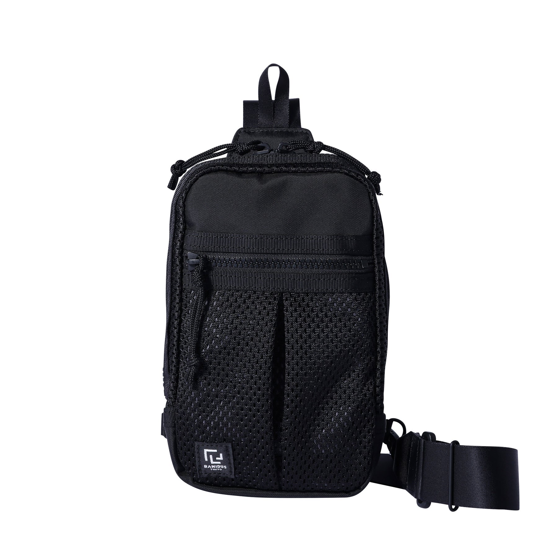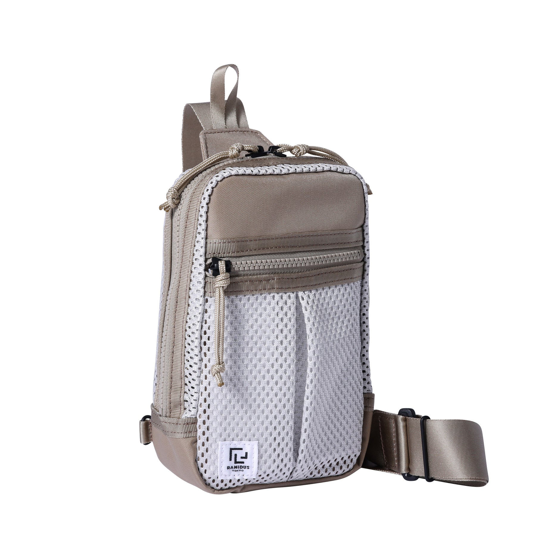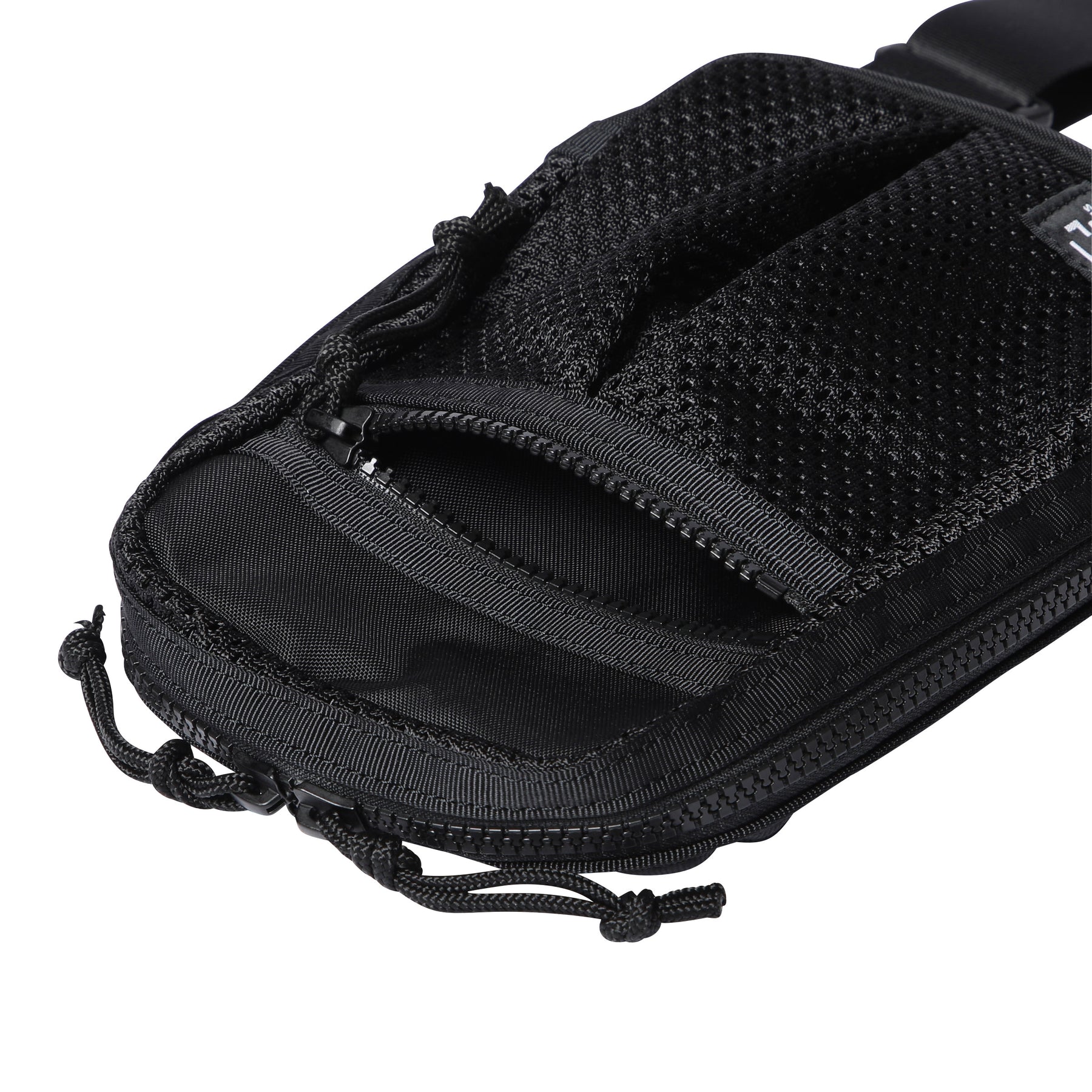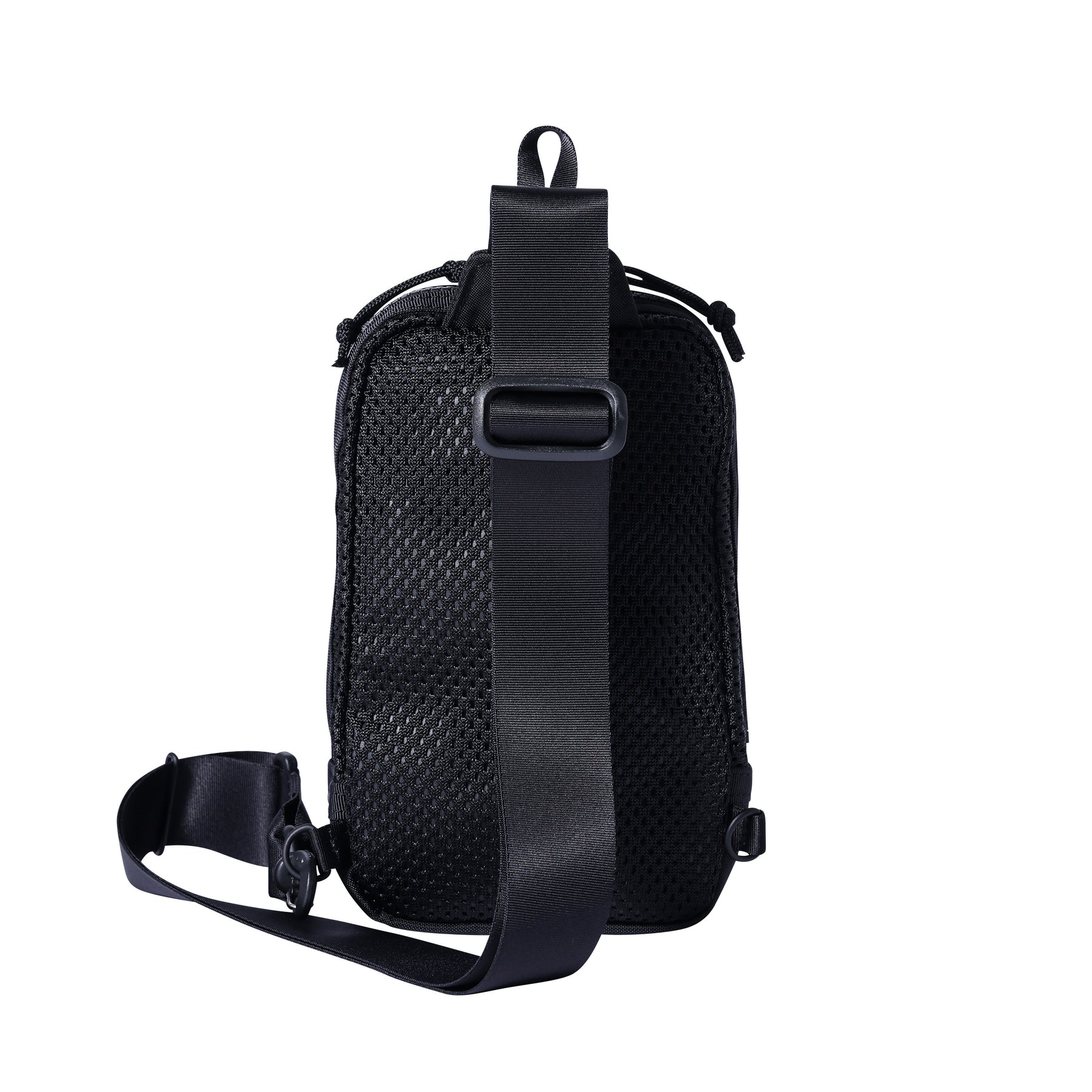 迷你吊袋,可用於攜帶手機、迷你錢包等。肩帶可固定在包的左側或右側,左右肩均可使用。與身體貼合的部分採用厚重的網狀聚酯材料,即使直接接觸皮膚也很舒適,即使在盛夏也能穿著舒適。柔軟的網眼材料貫穿始終,內襯則由 420d 尼龍氧化物製成,表面經過 PVC 處理,使包包具有良好的張力和質感。