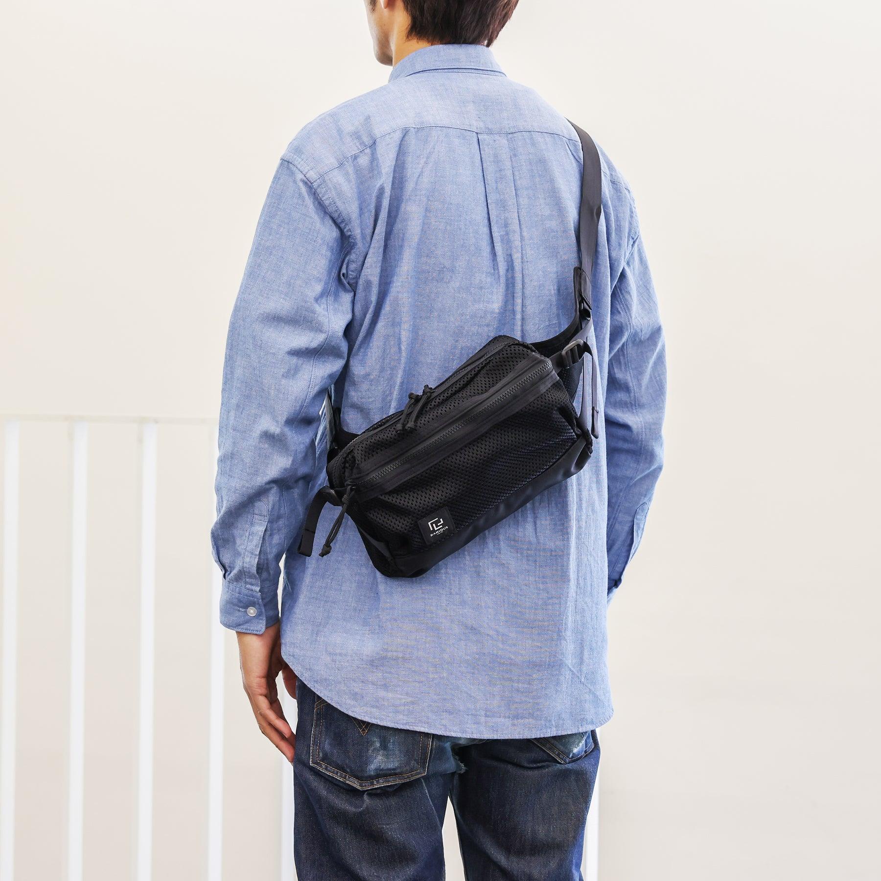 這款雙向腰包採用貼身設計,可圍在腰間或斜挎,大小可容納 500 毫升 PET 瓶,兩側襯墊採用單層羅素網布,以減輕重量。與身體貼合的部分採用重型網眼材料,這種聚酯材料即使直接接觸皮膚也很舒適,即使在盛夏也能帶來舒適的穿著體驗。柔軟的網眼材料應用於整個包身,而內襯則由 420d 尼龍氧化物製成,表面經過 PVC 處理,使包身具有良好的張力和質感。