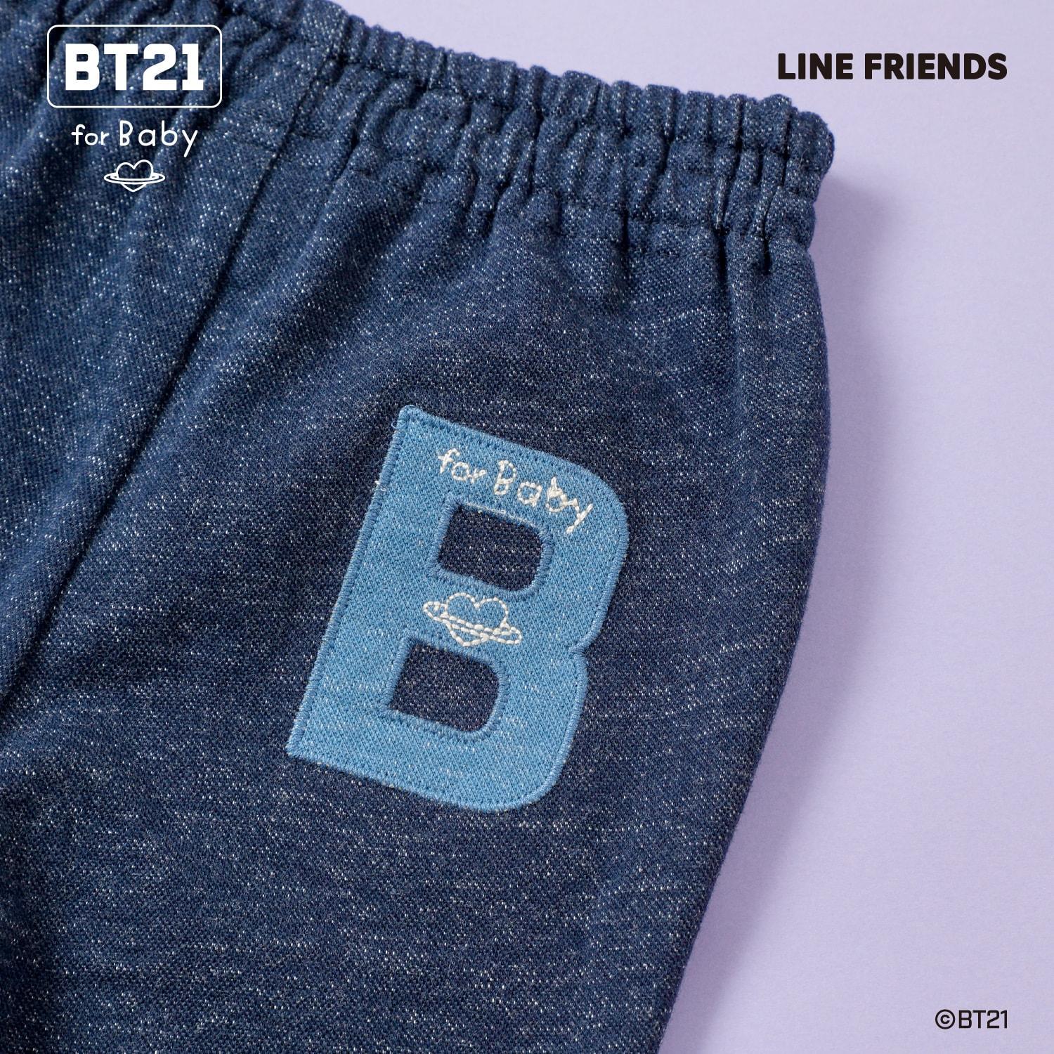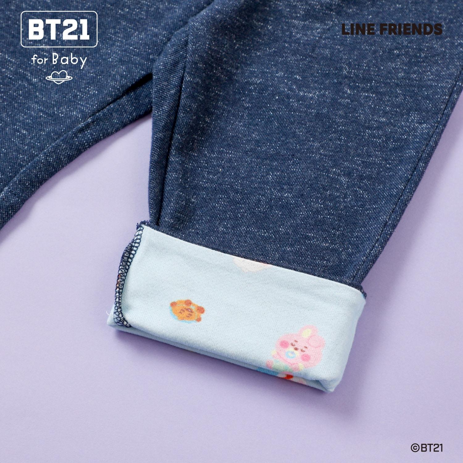 柔軟而有彈性的長褲由類似牛仔布的針織材料製成。下襬向後摺疊時,可以瞥見 BT21 宇宙之星的原創印花,這也是重點所在。