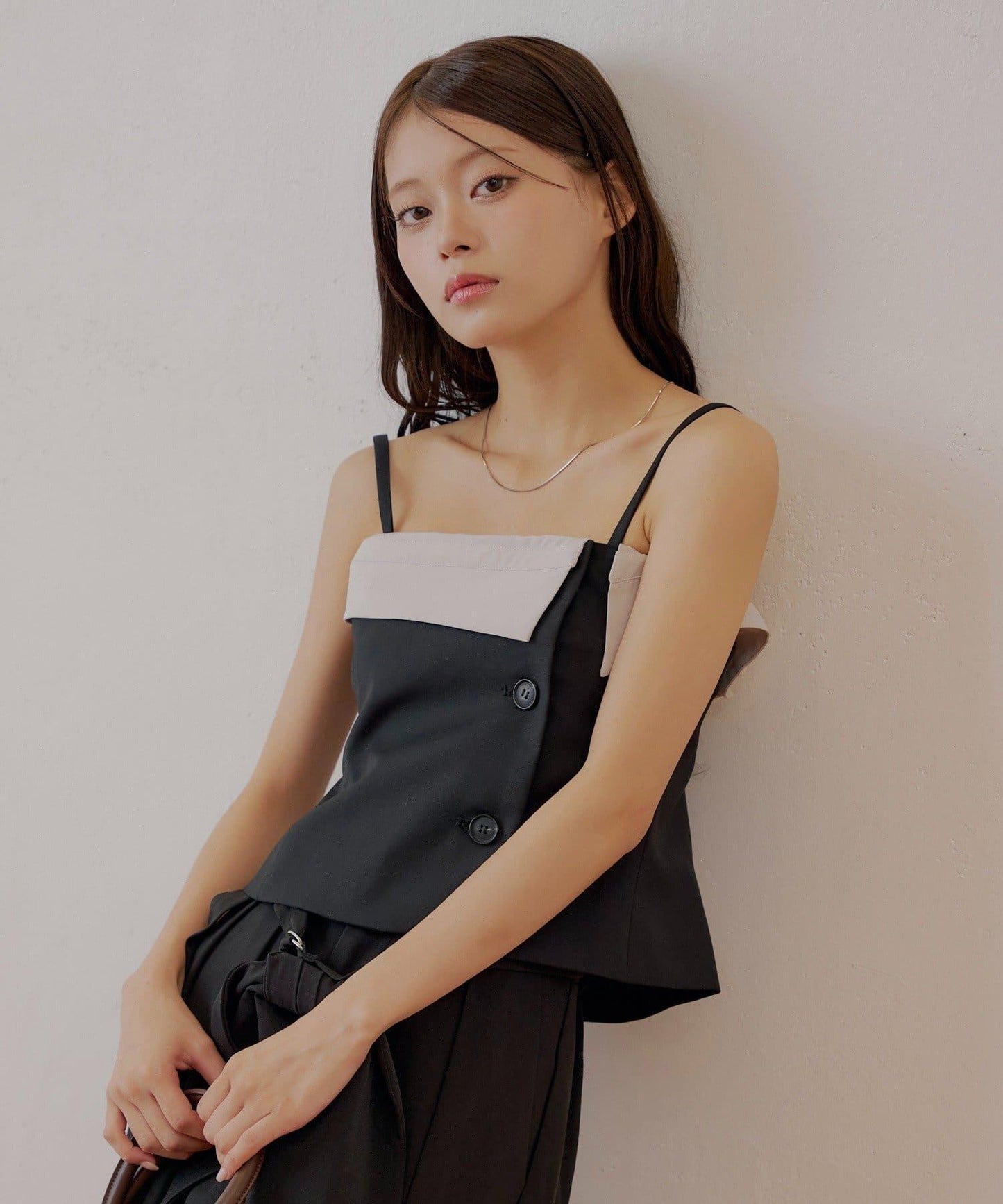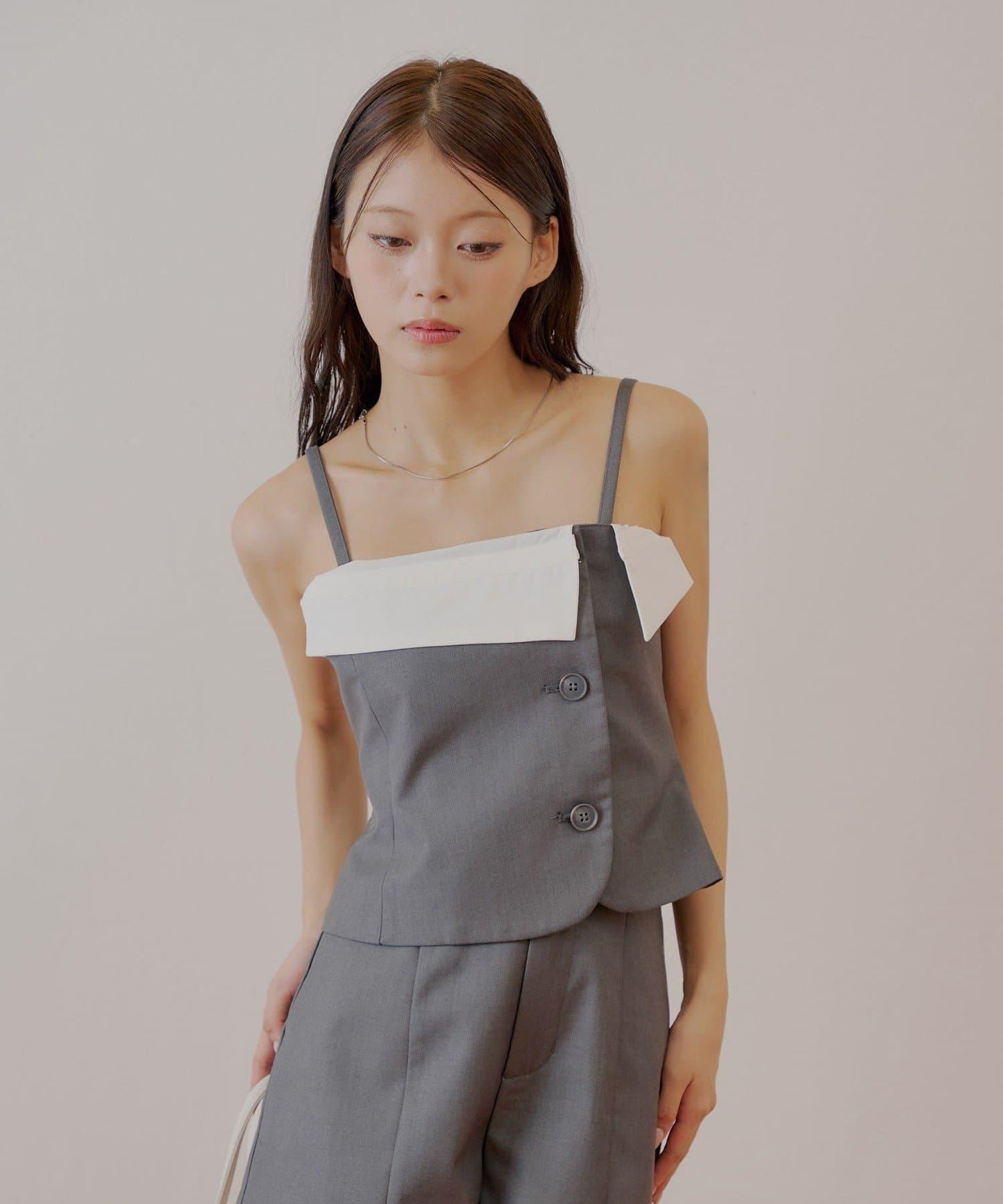 西服裸上衣採用了不對稱的襯衫對接設計,非常吸引人。