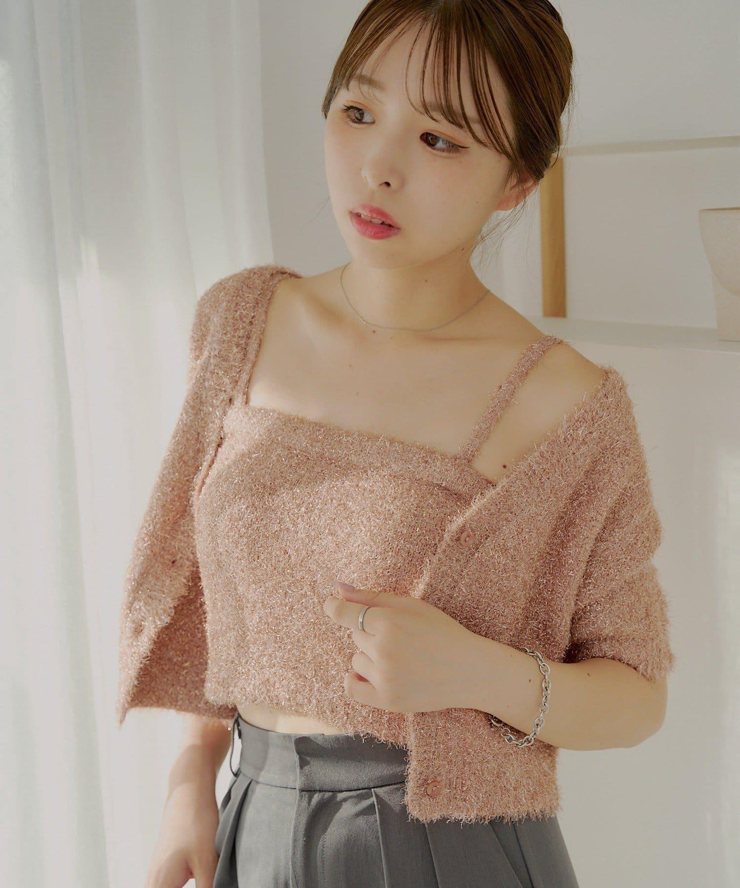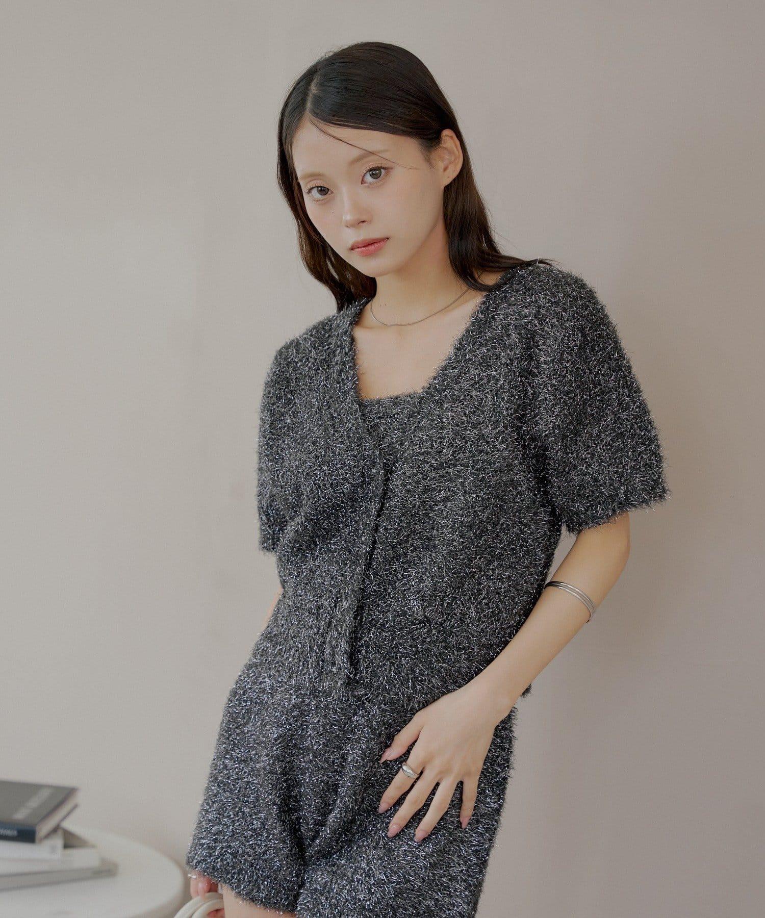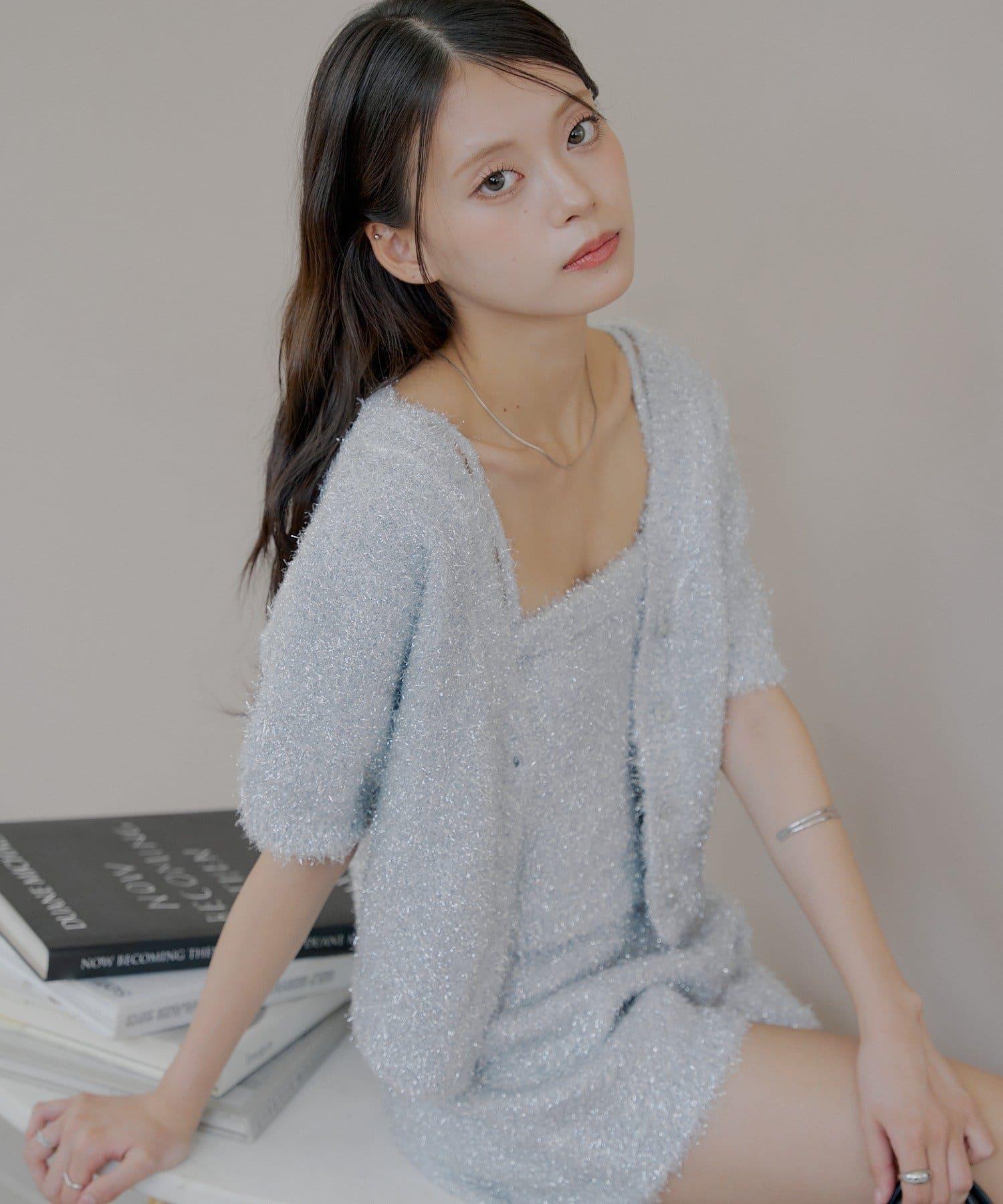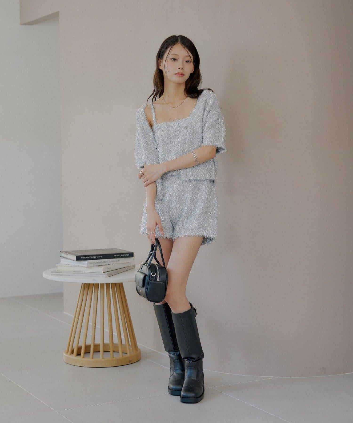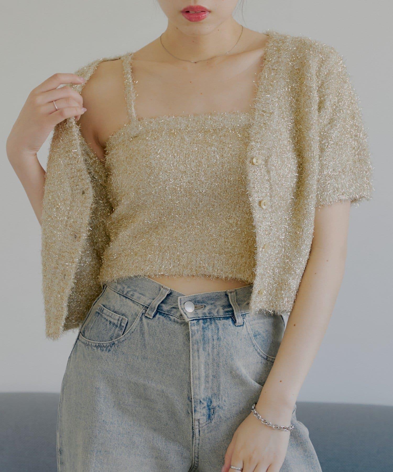【Chico】亮片長毛針織開衫+抹胸吊帶套裝