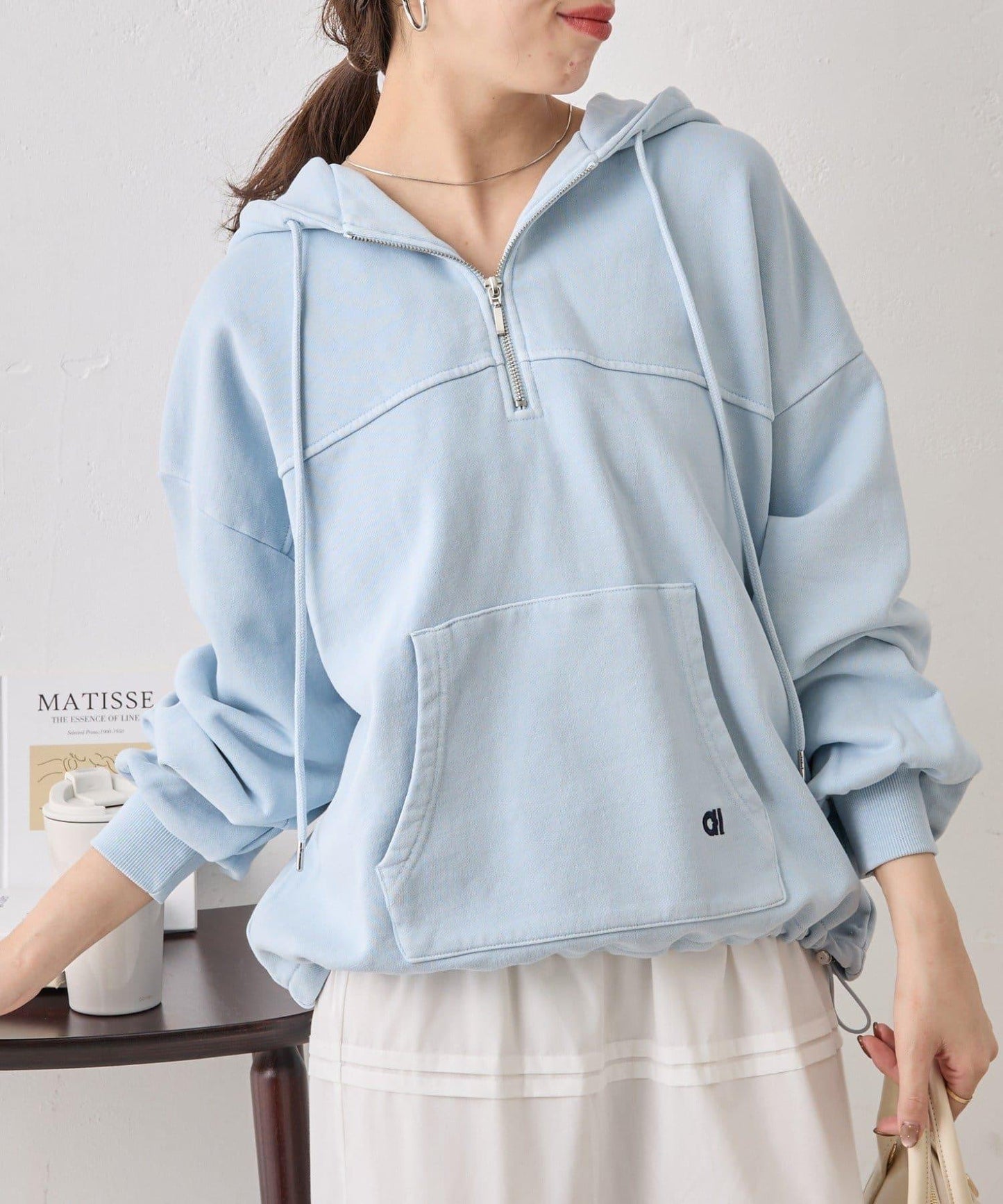 寬鬆版型的半拉鍊連帽衫,造型可愛。
