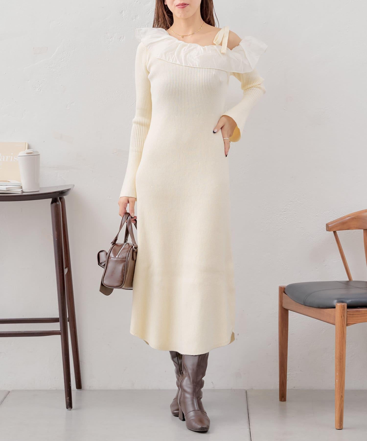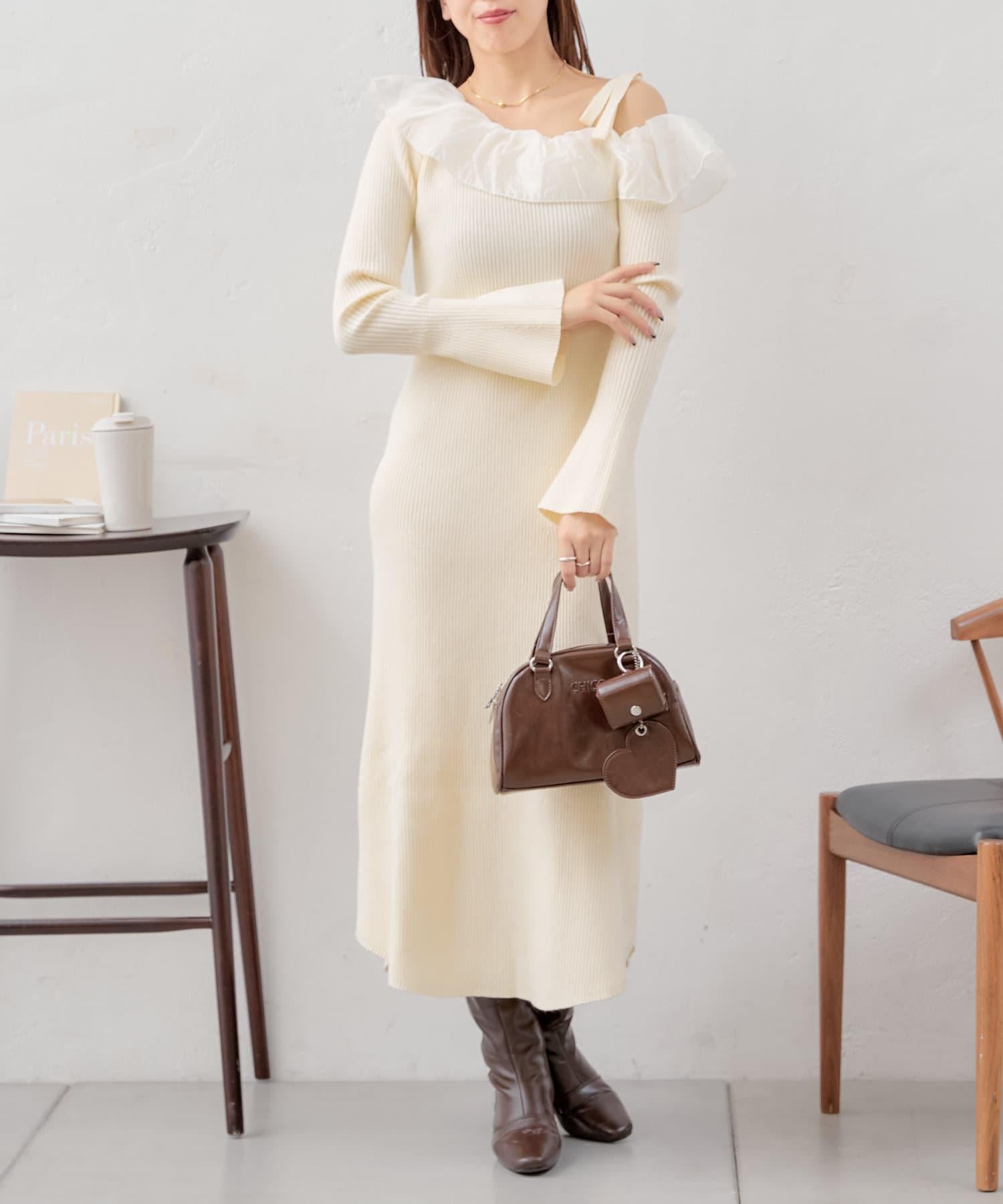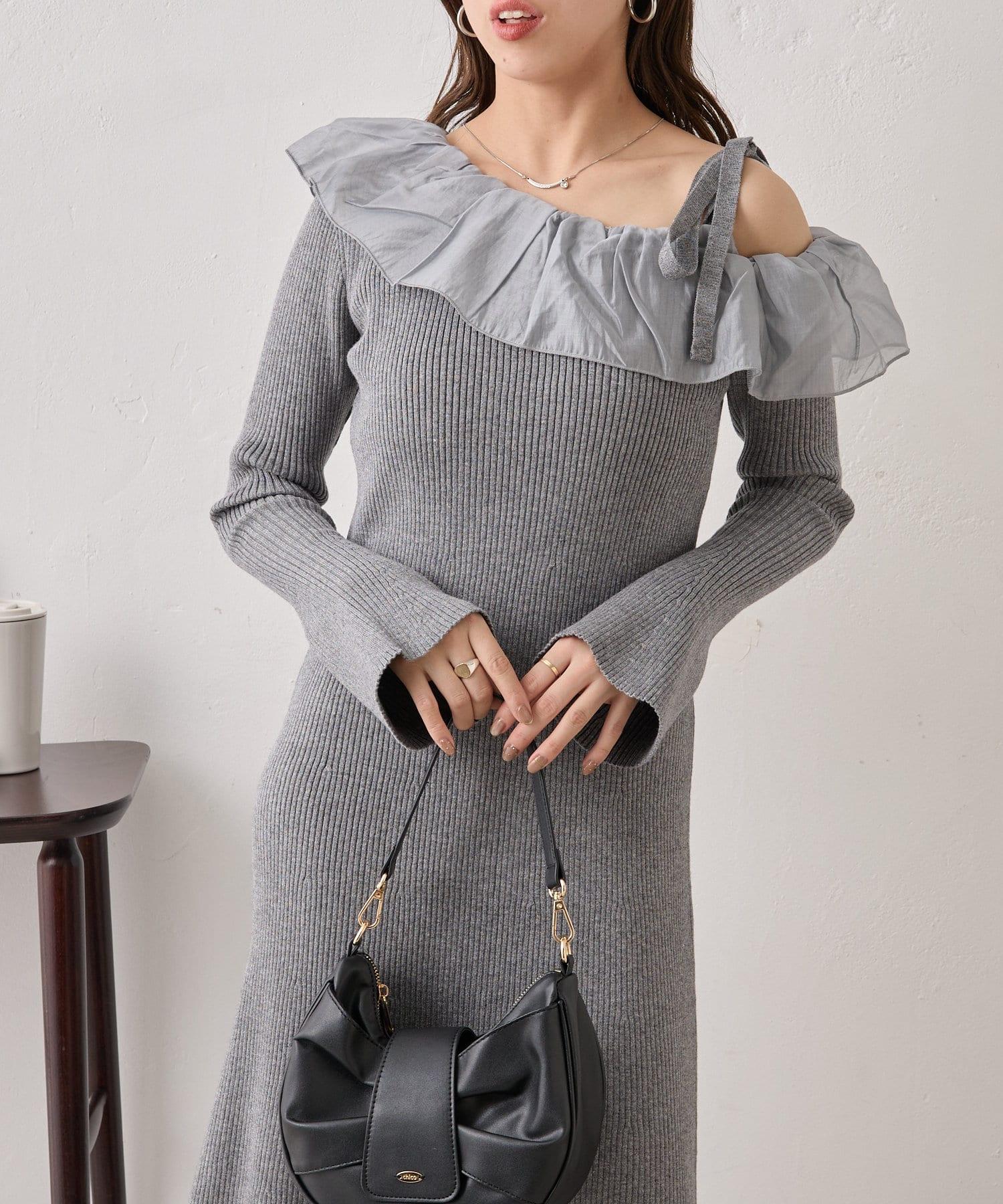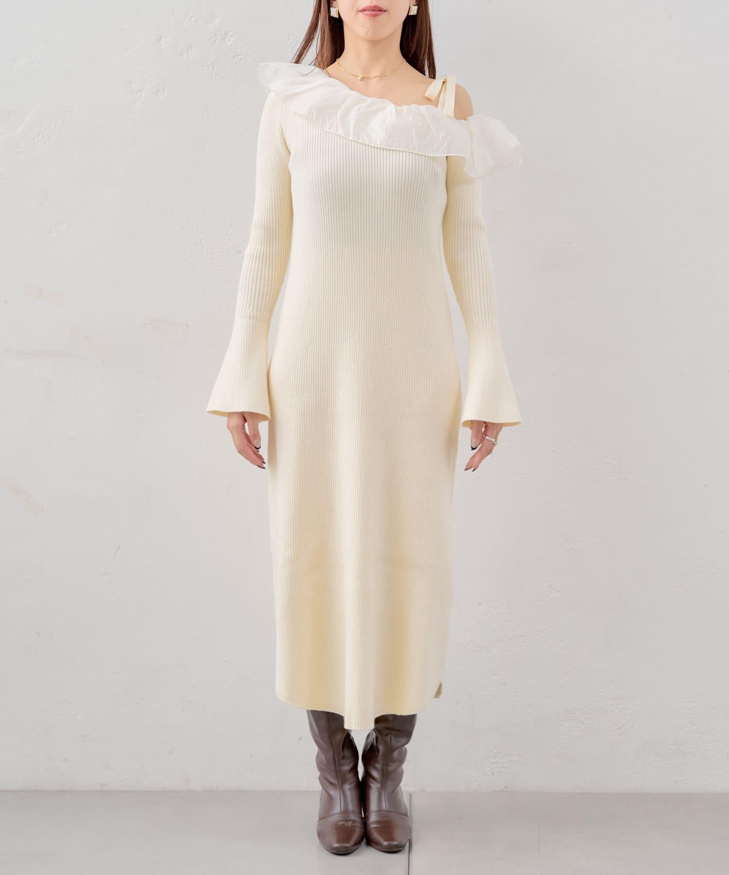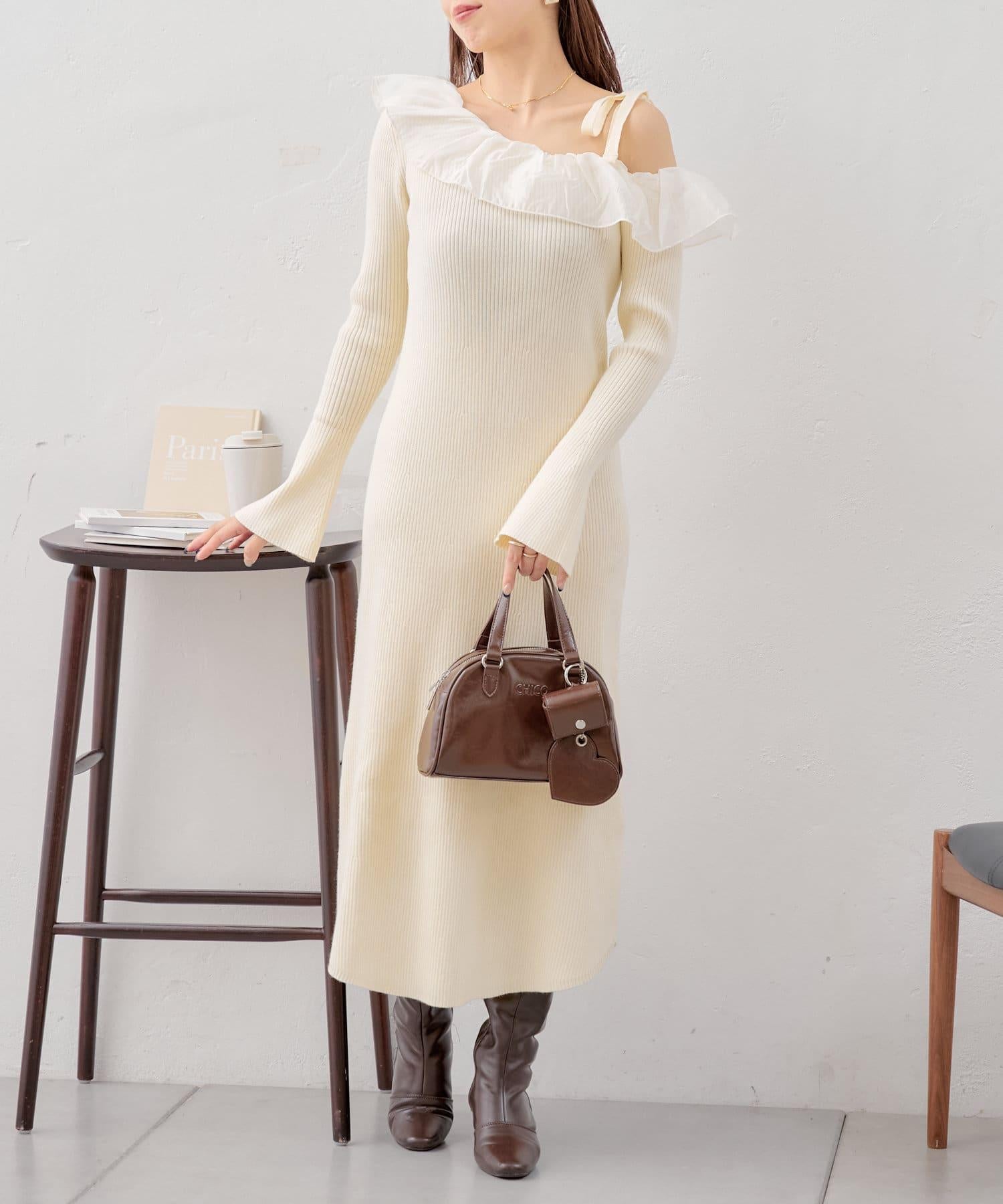 【Chico】單肩荷葉邊肩帶蝴蝶結長款連衣裙