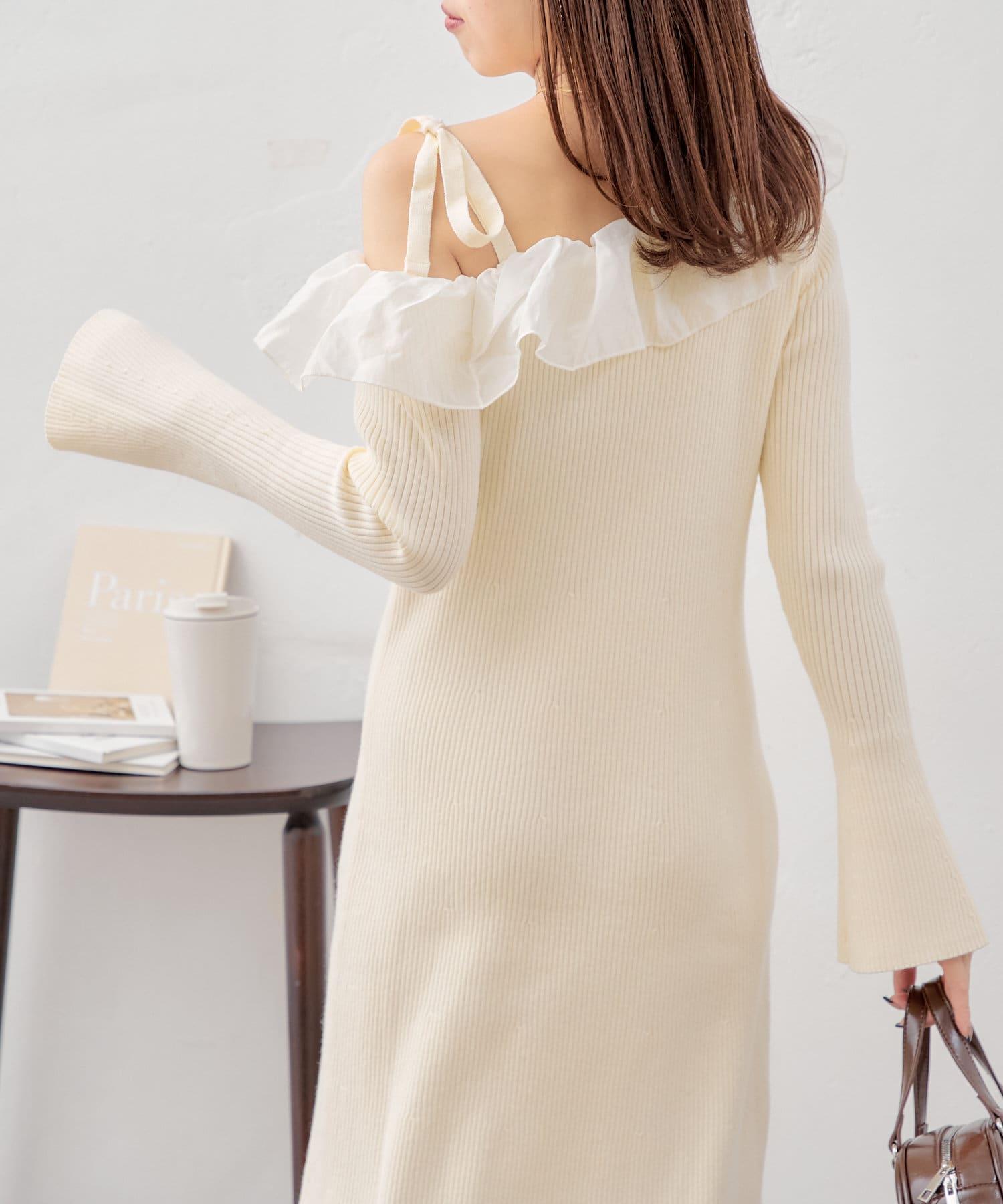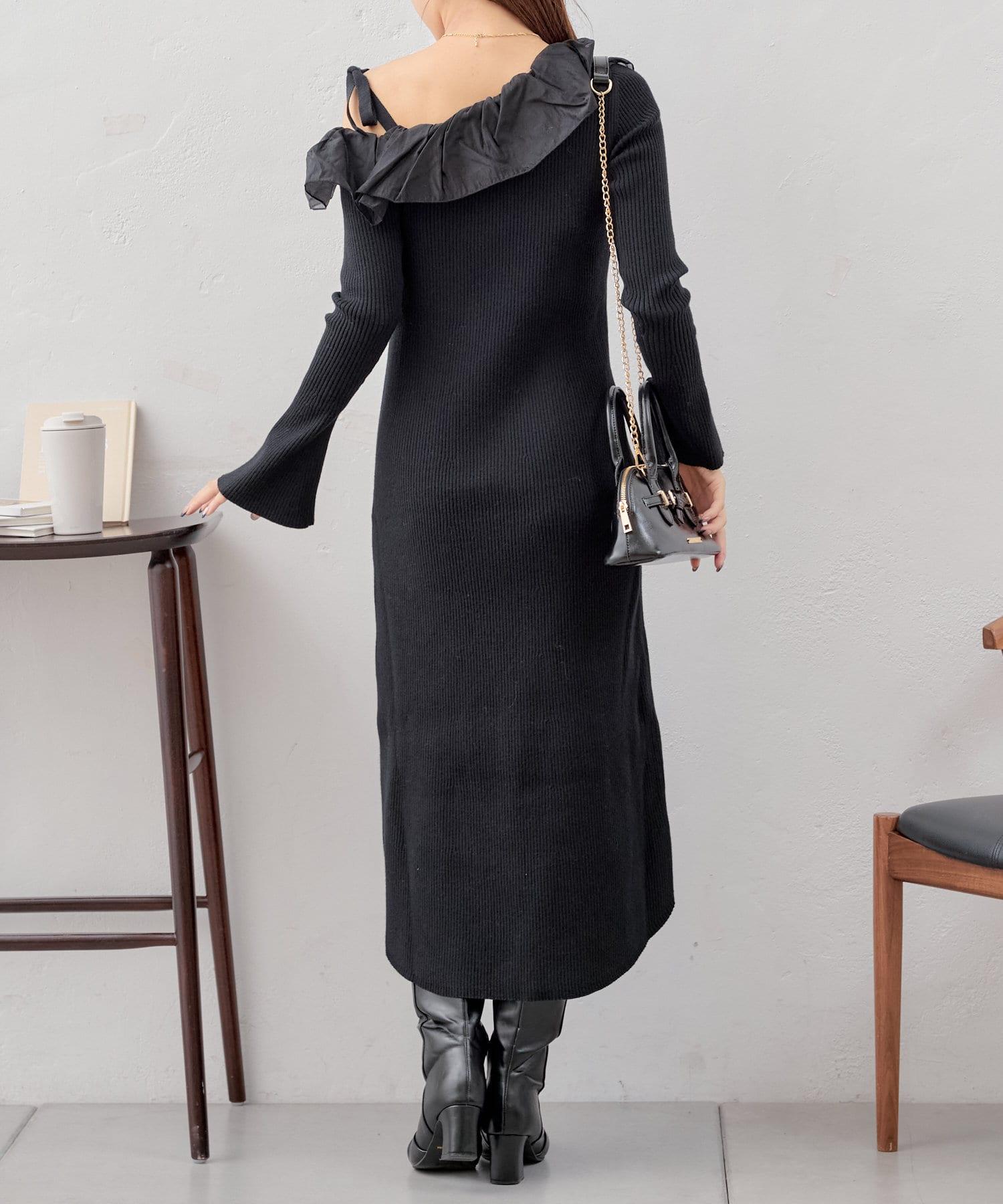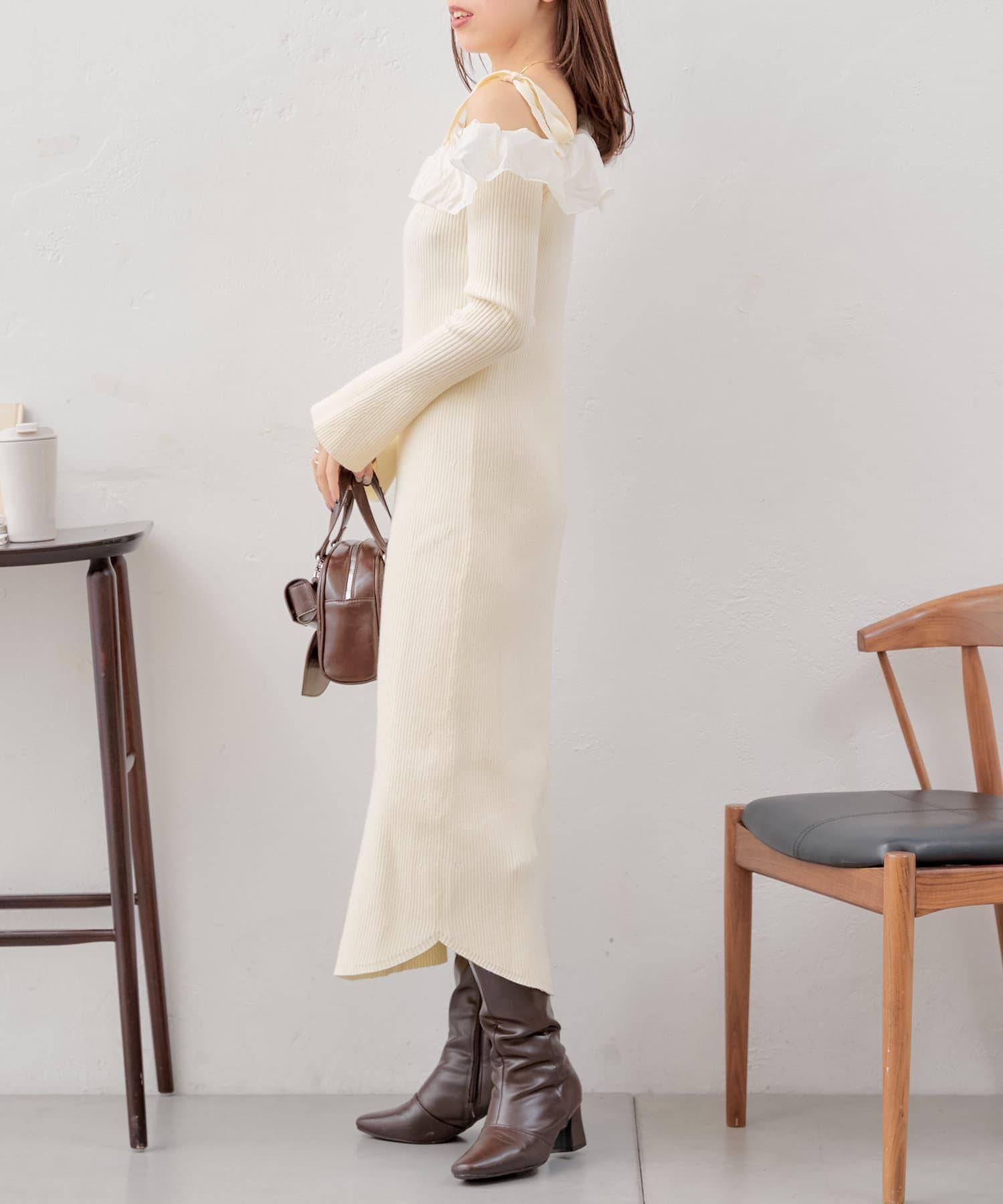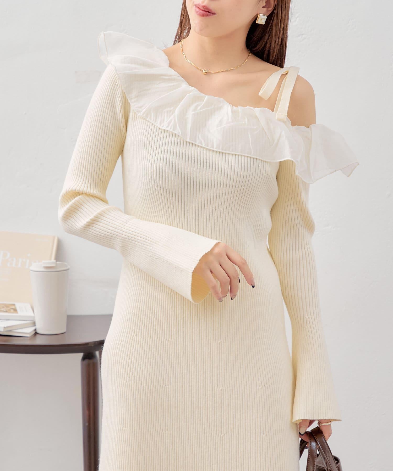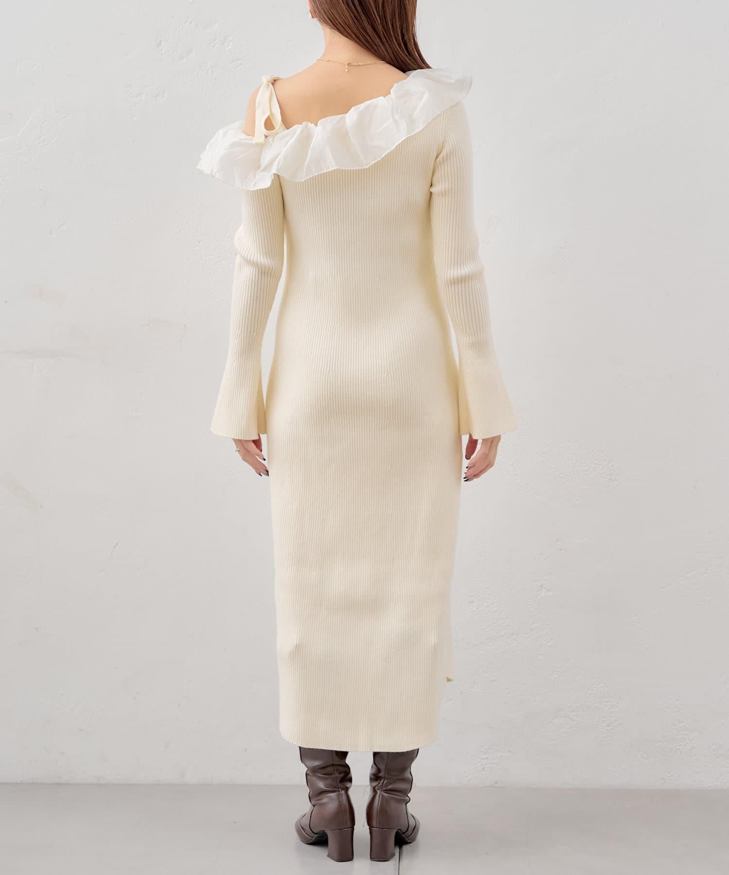 【Chico】單肩荷葉邊肩帶蝴蝶結長款連衣裙