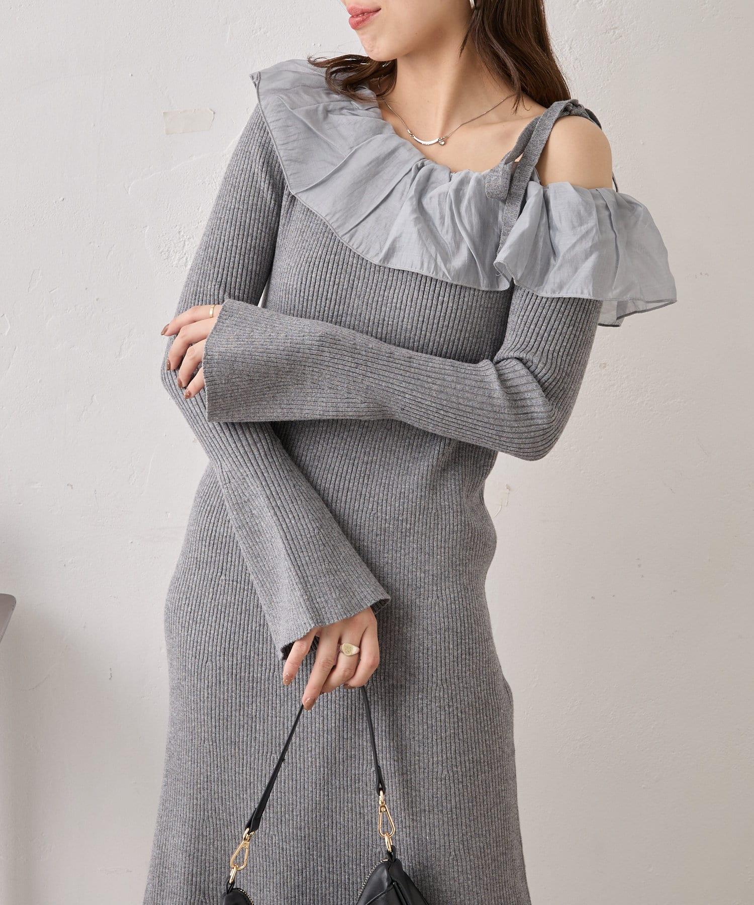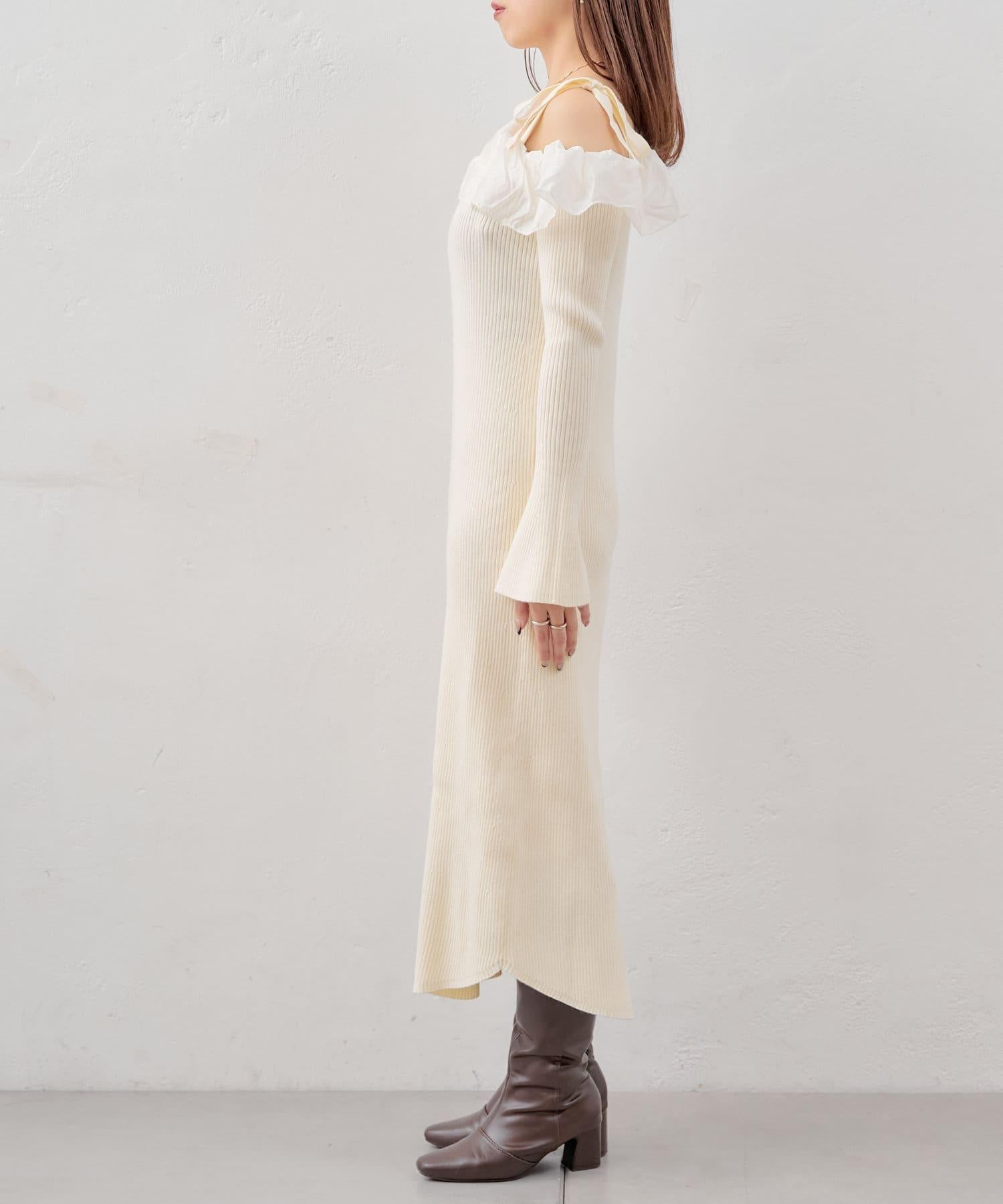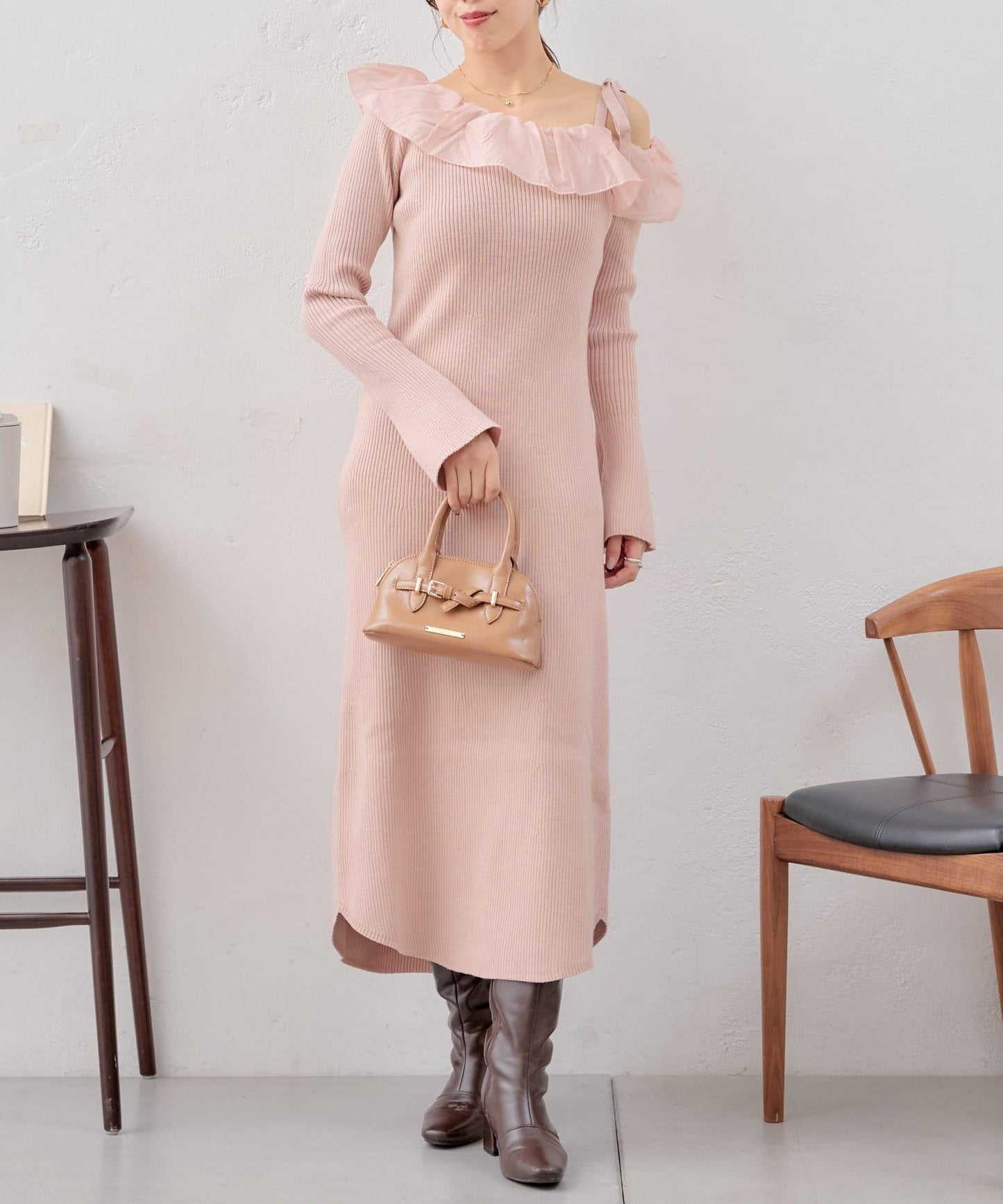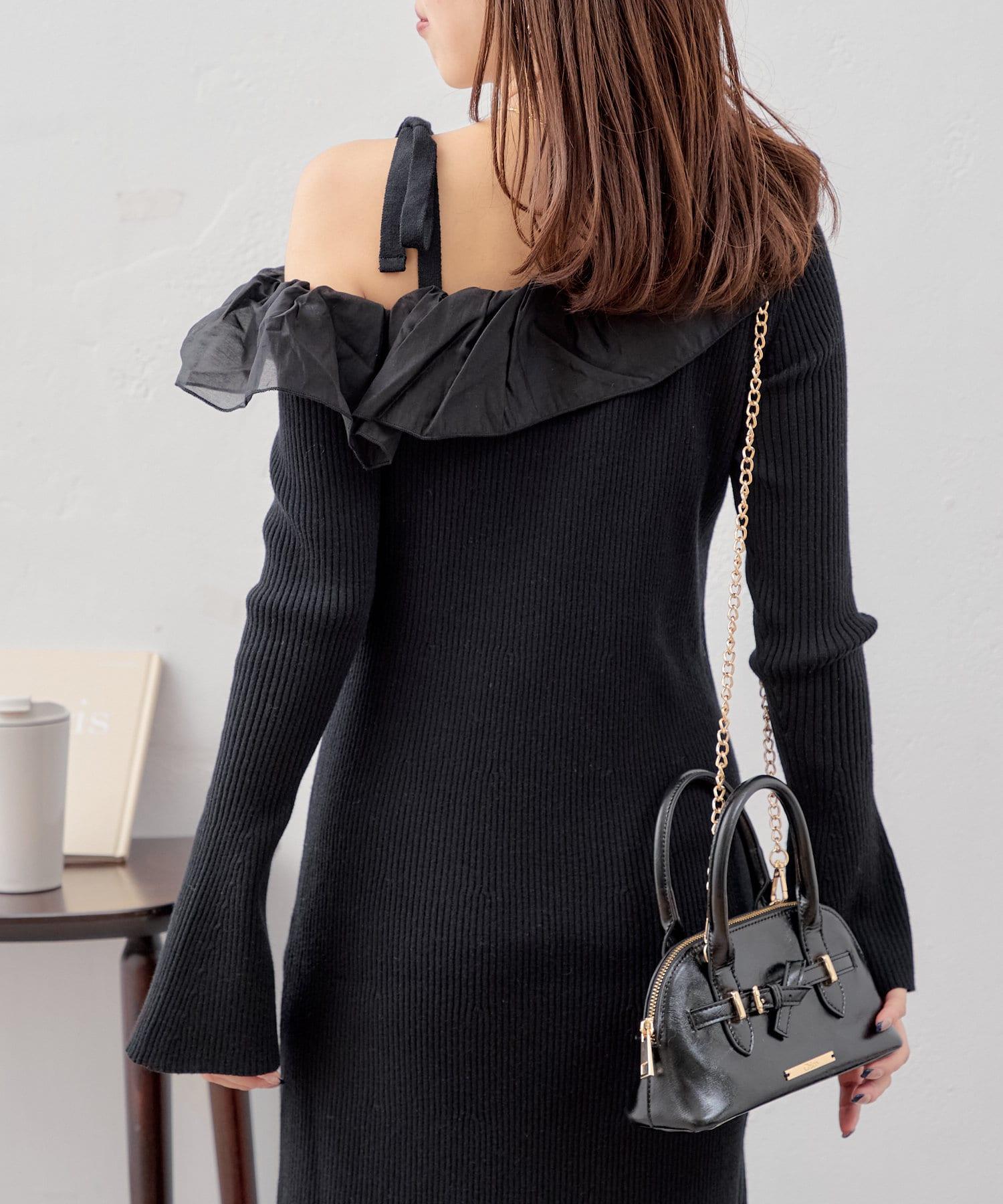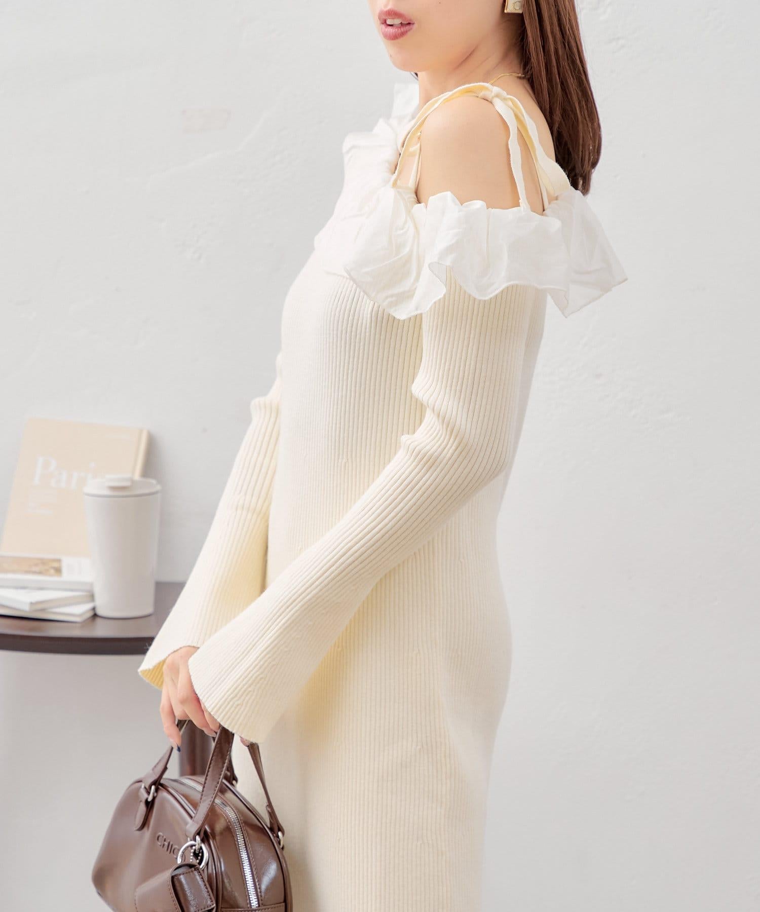 【Chico】單肩荷葉邊肩帶蝴蝶結長款連衣裙