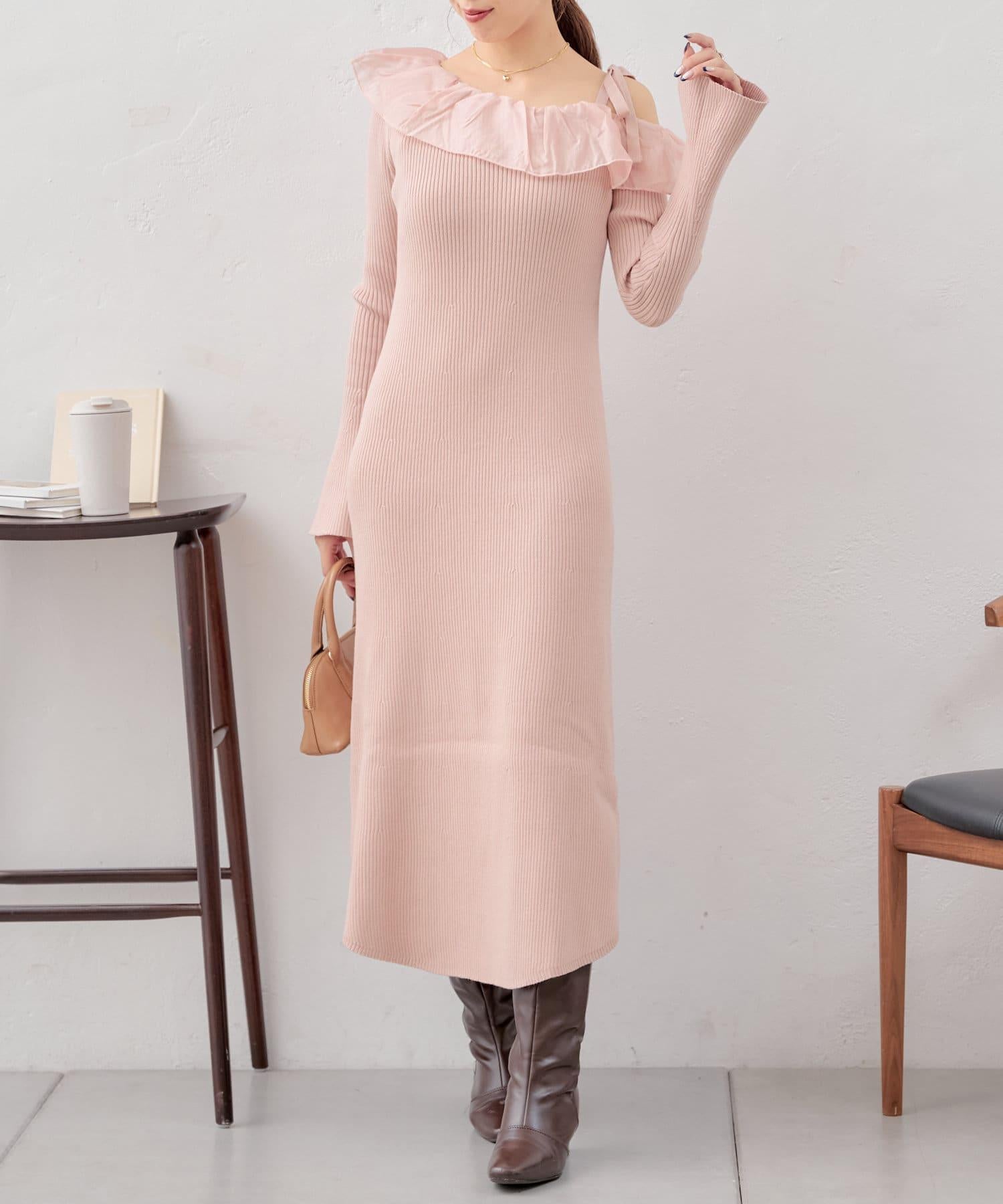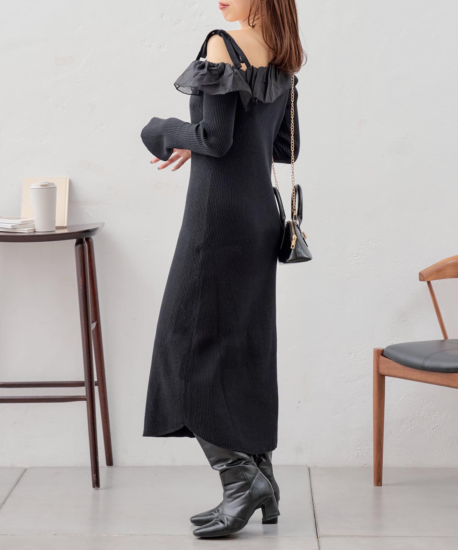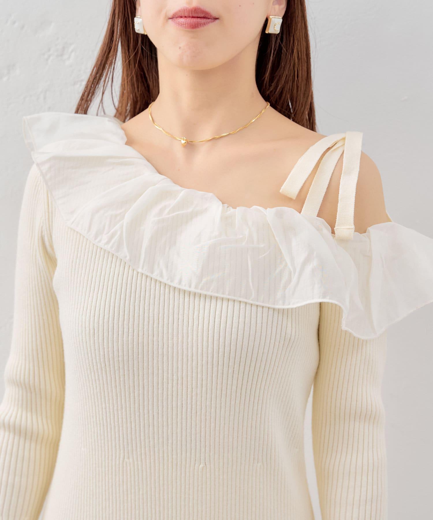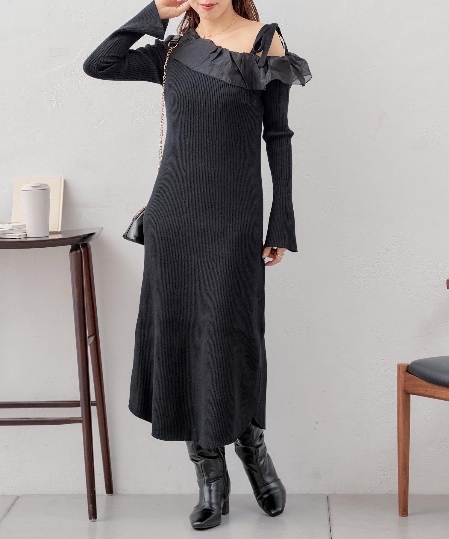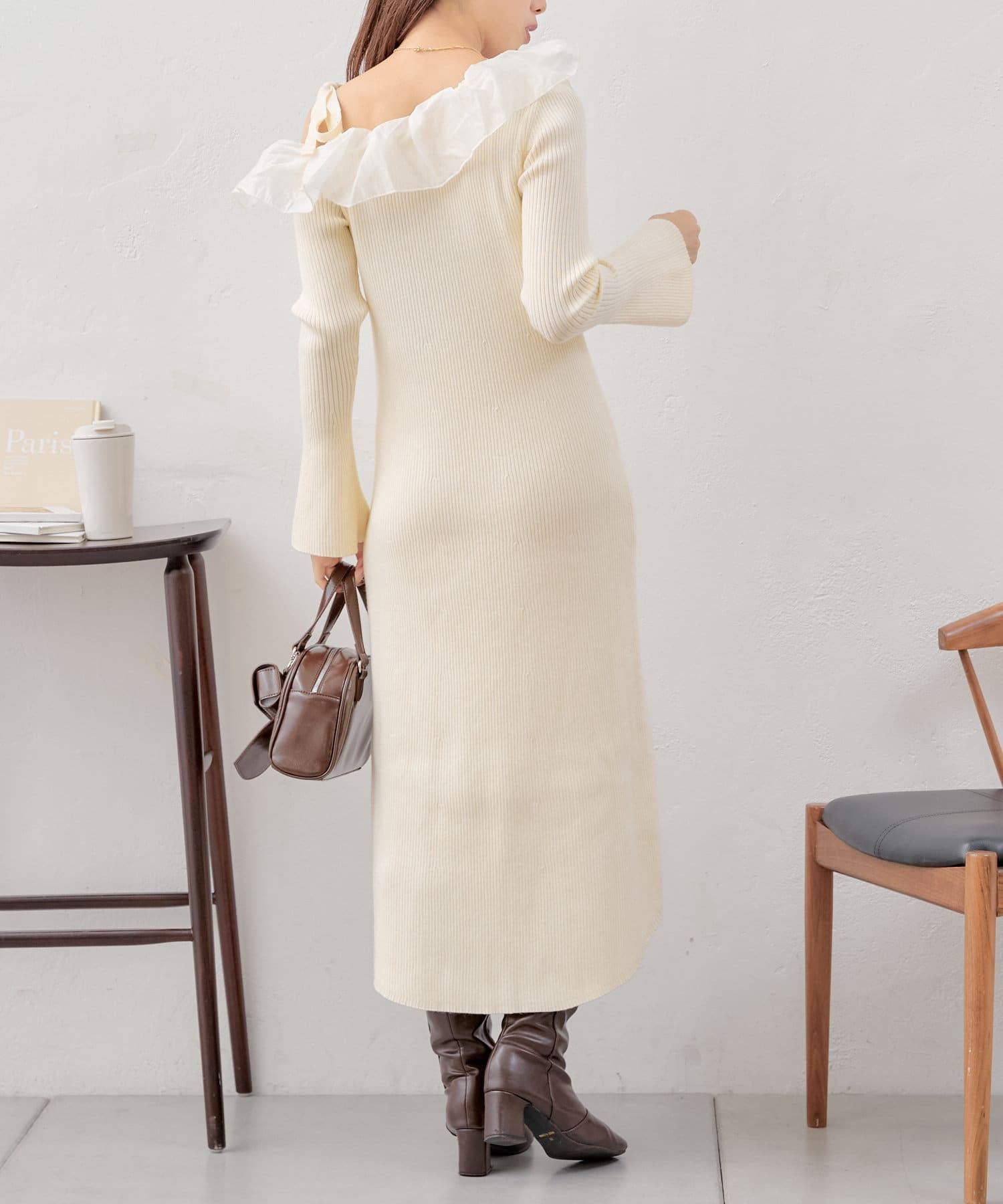 【Chico】單肩荷葉邊肩帶蝴蝶結長款連衣裙