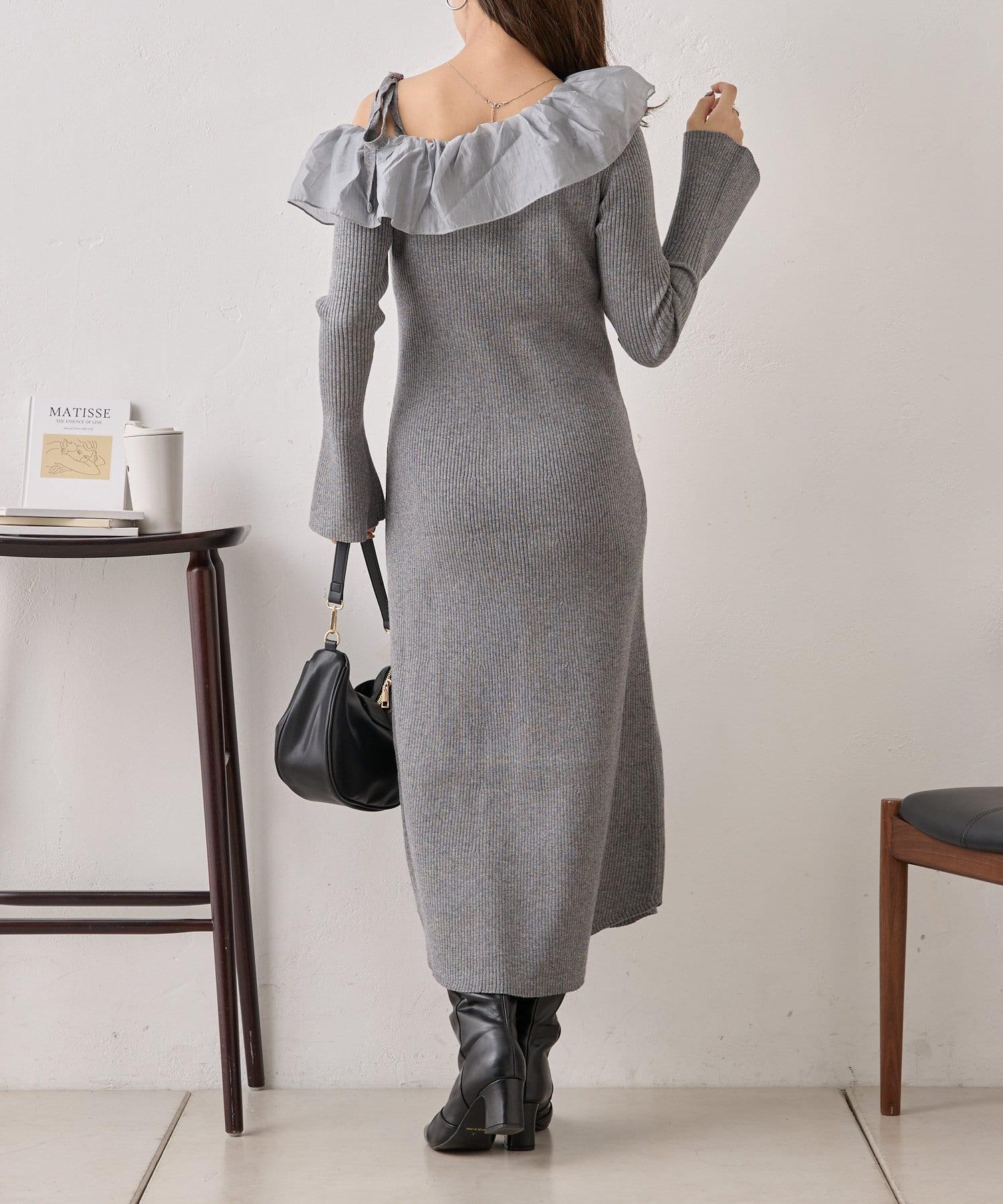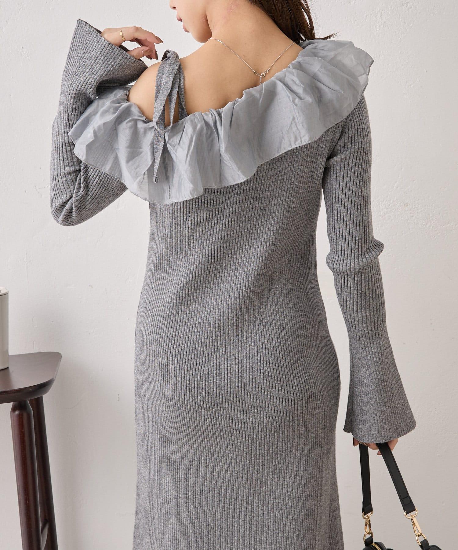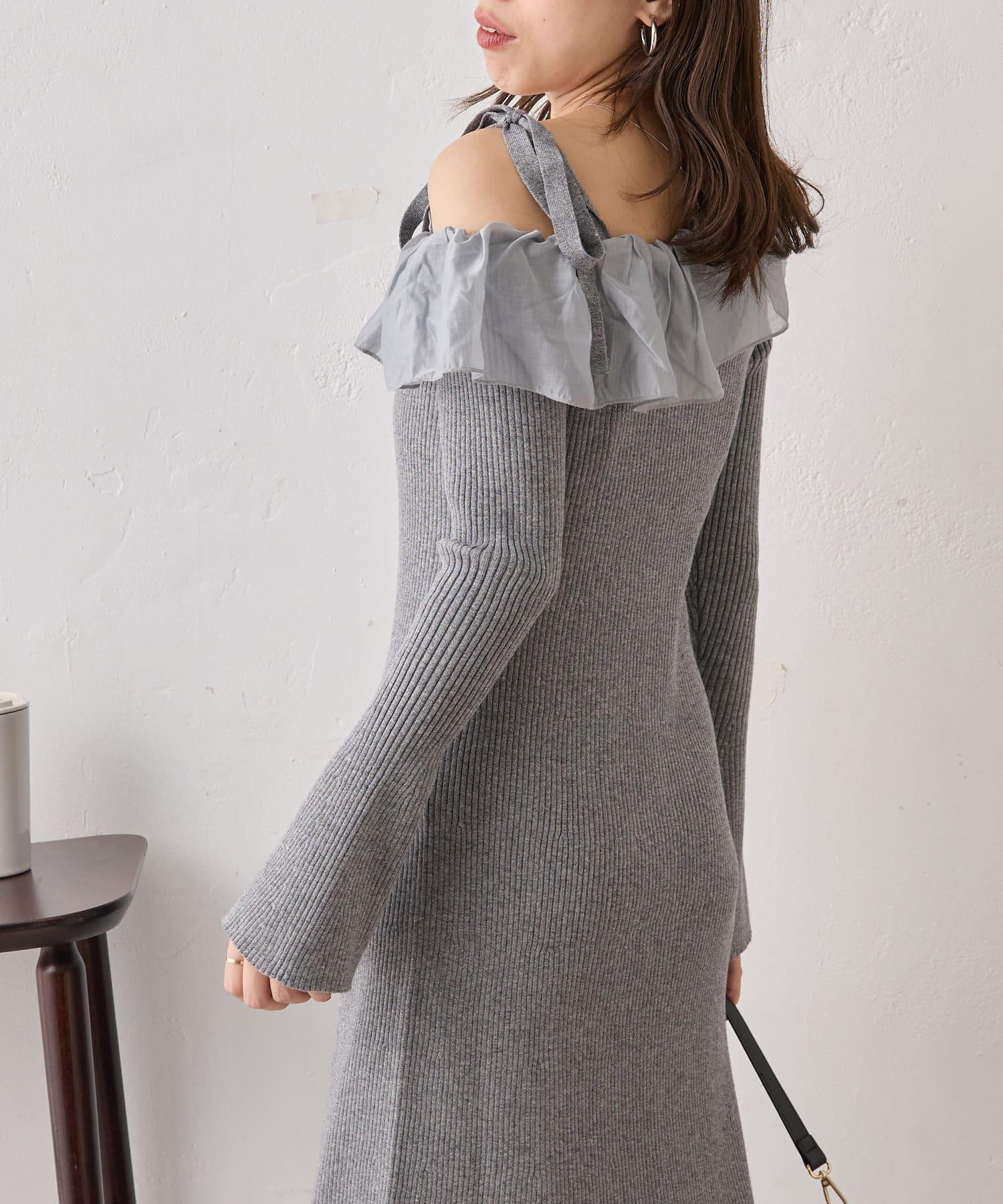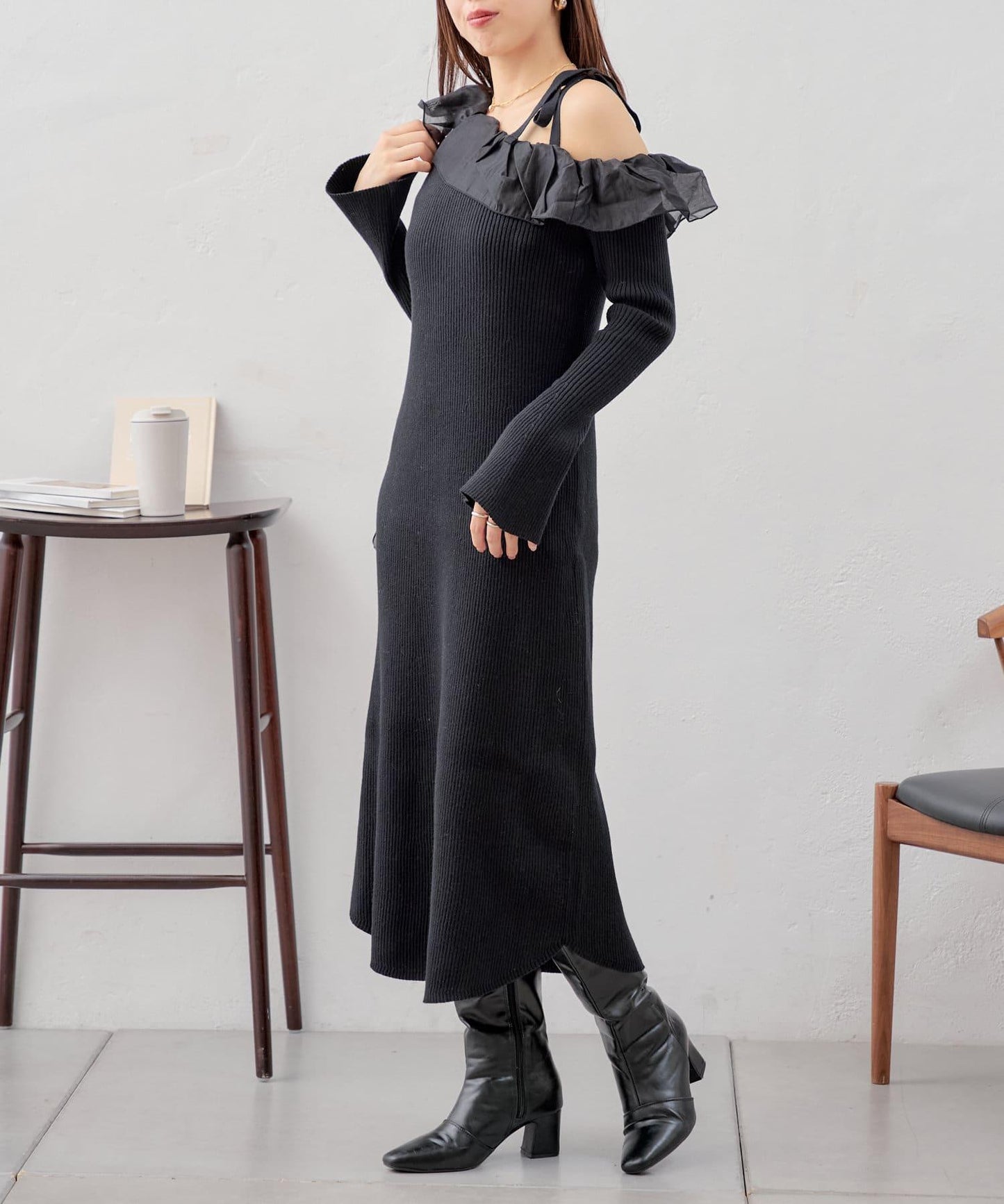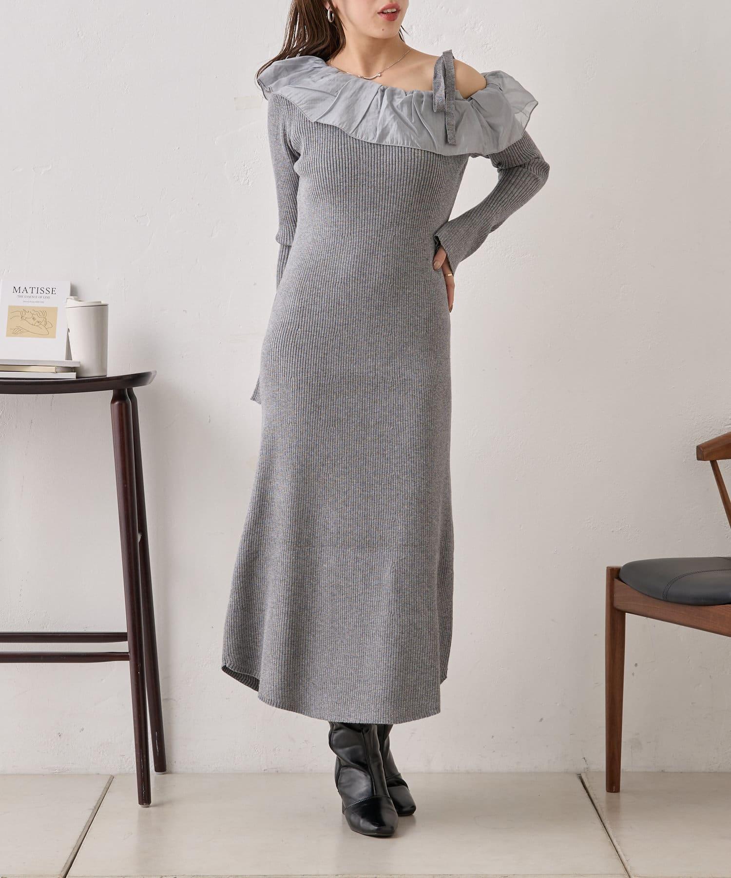 【Chico】單肩荷葉邊肩帶蝴蝶結長款連衣裙