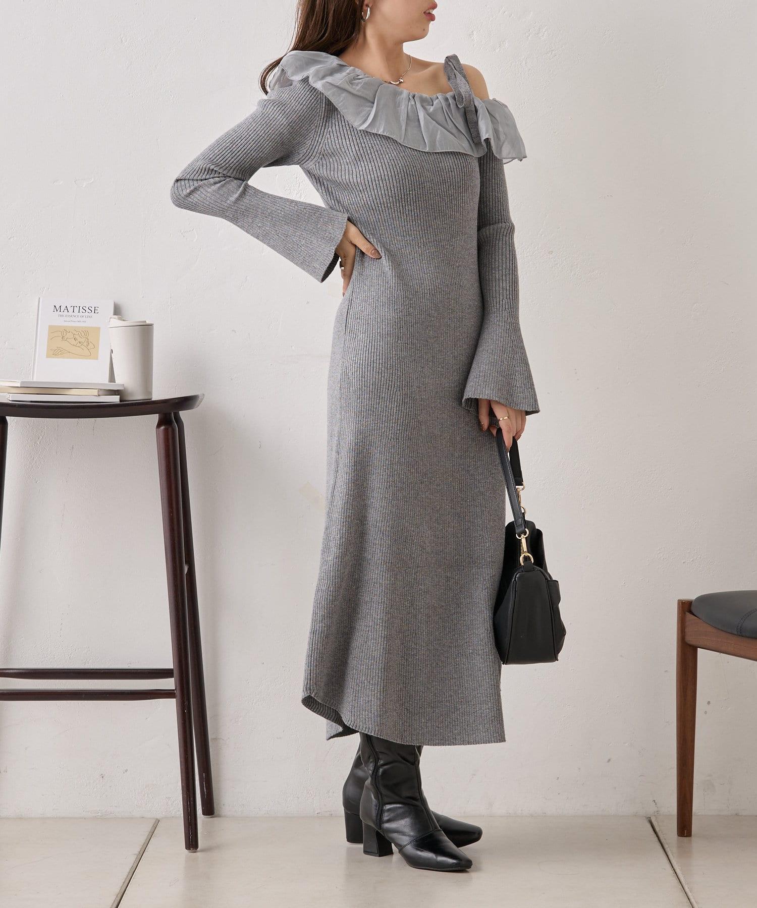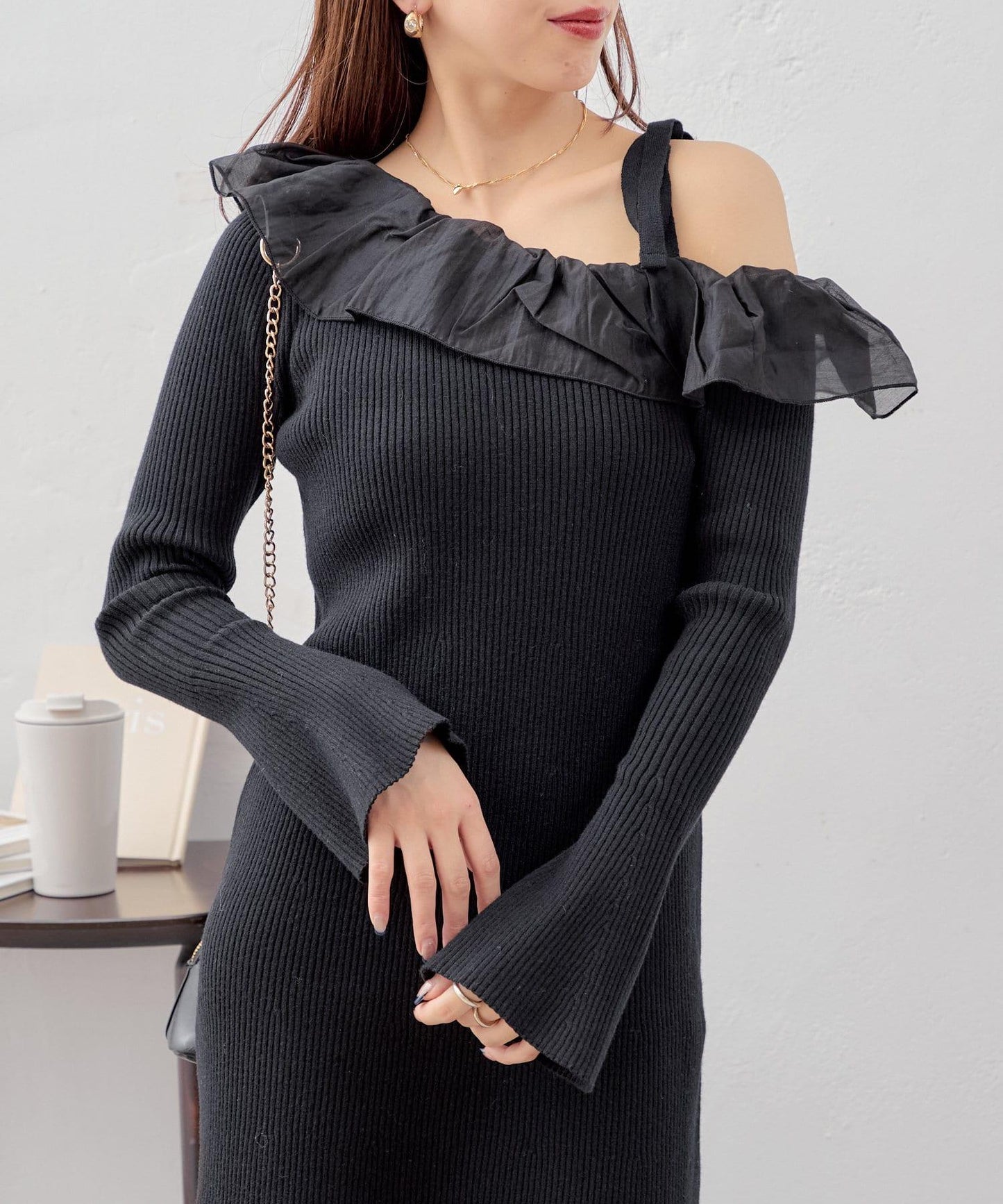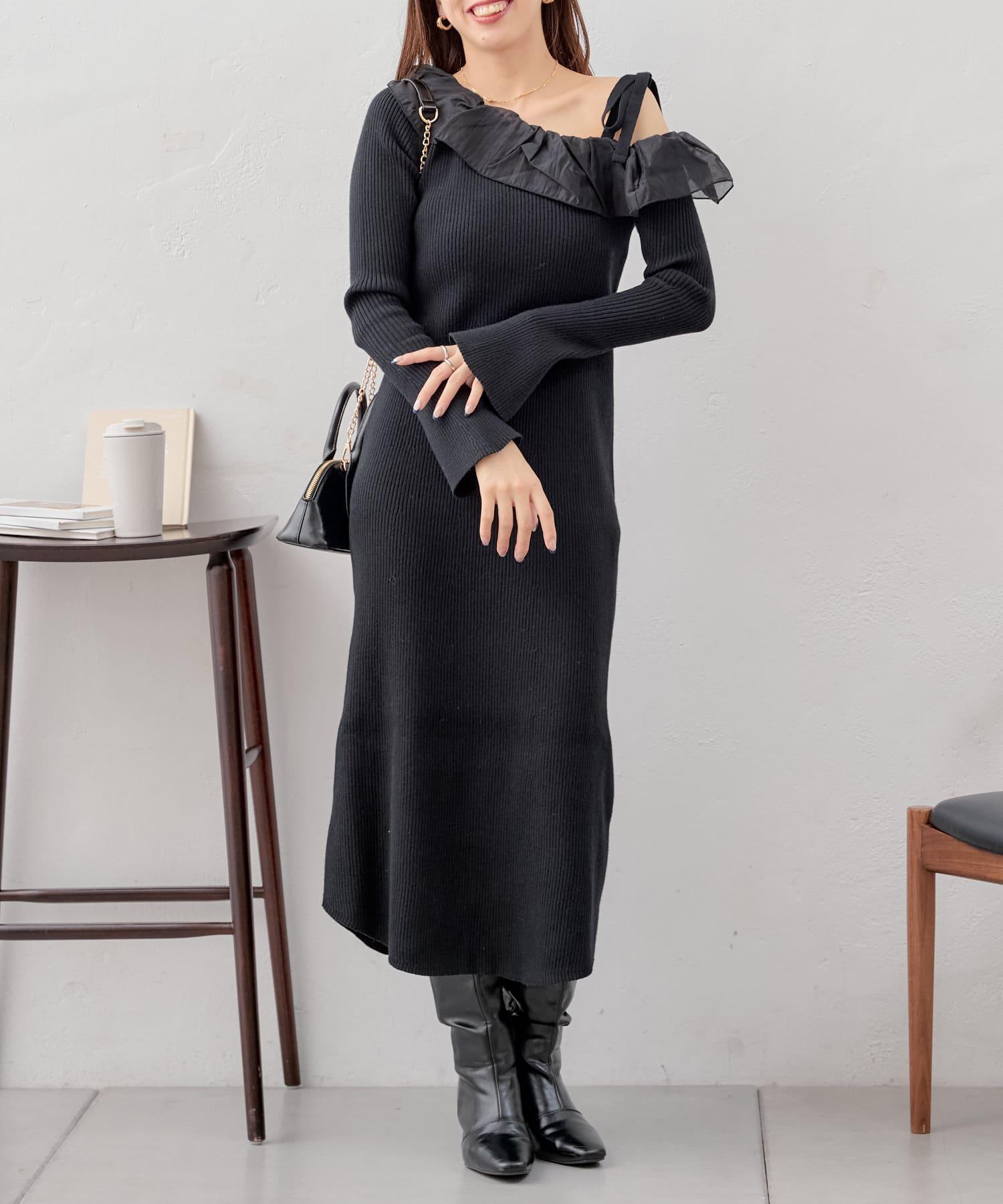 單肩不對稱設計荷葉邊優雅羅紋連衣裙