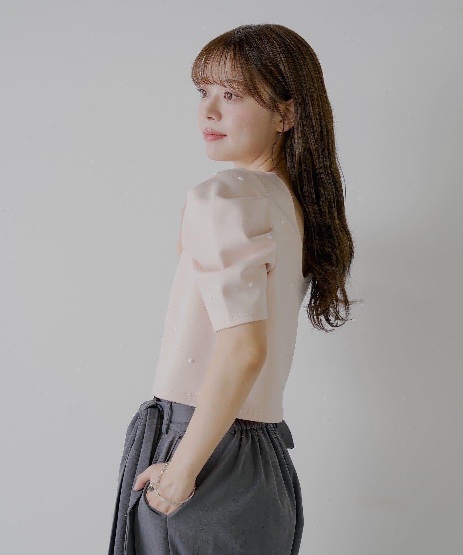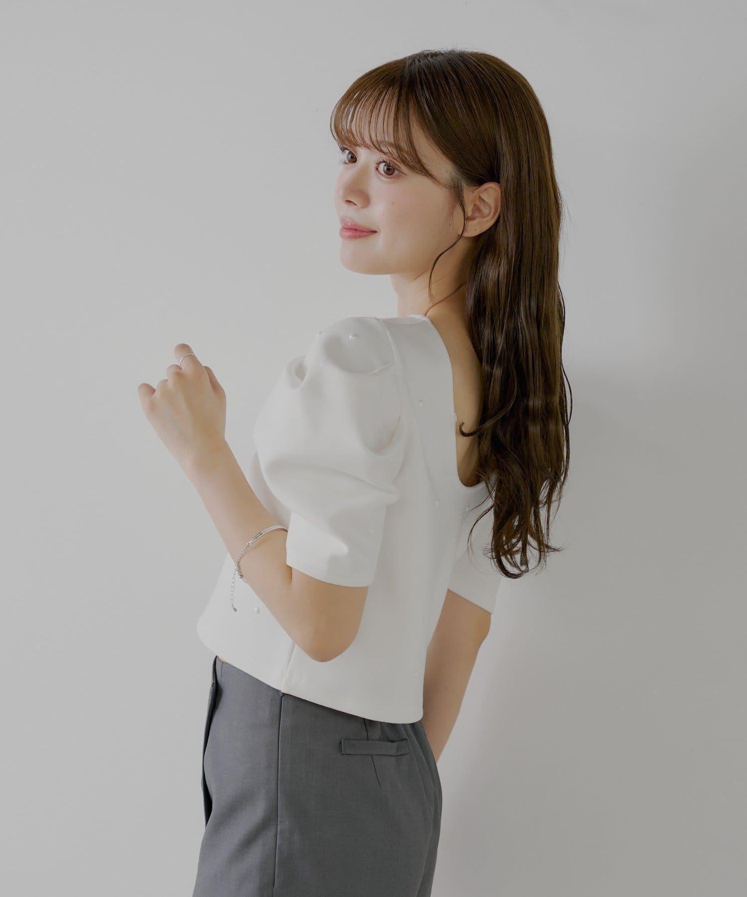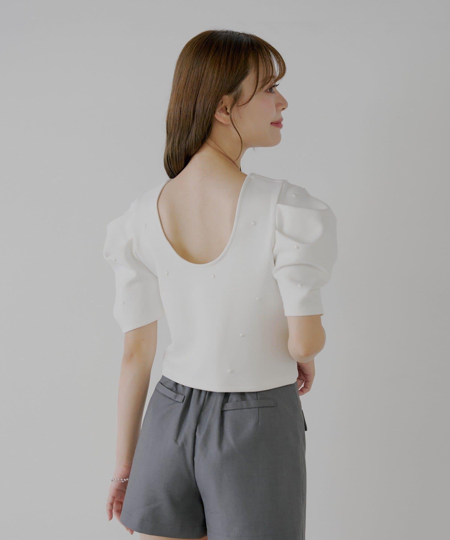 【Chico】後背開口珍珠裝飾墊肩T恤