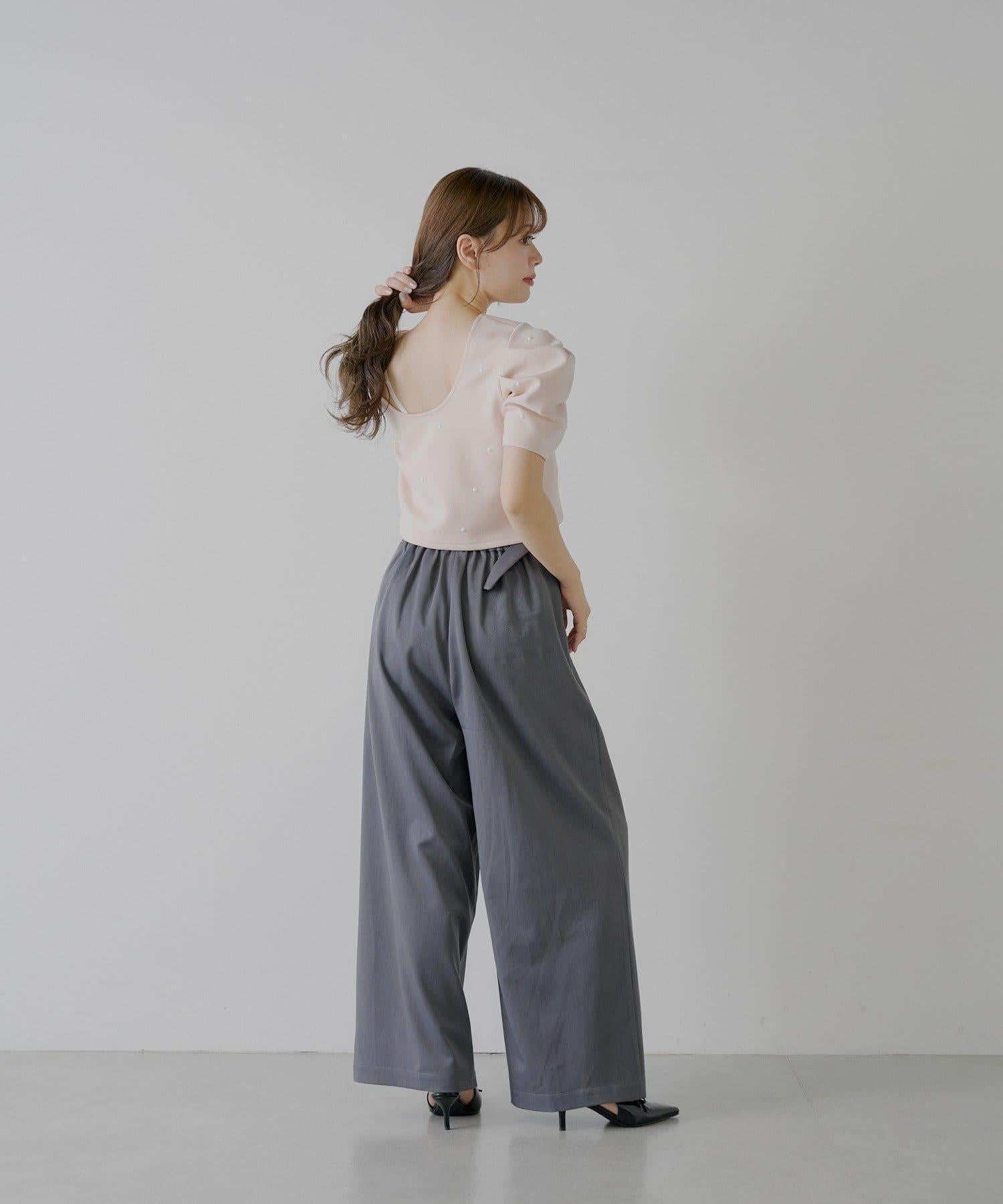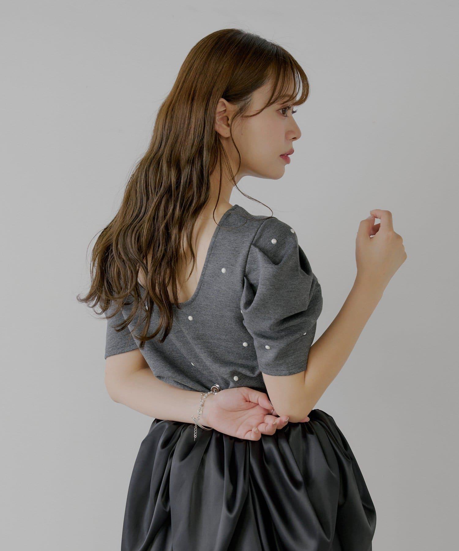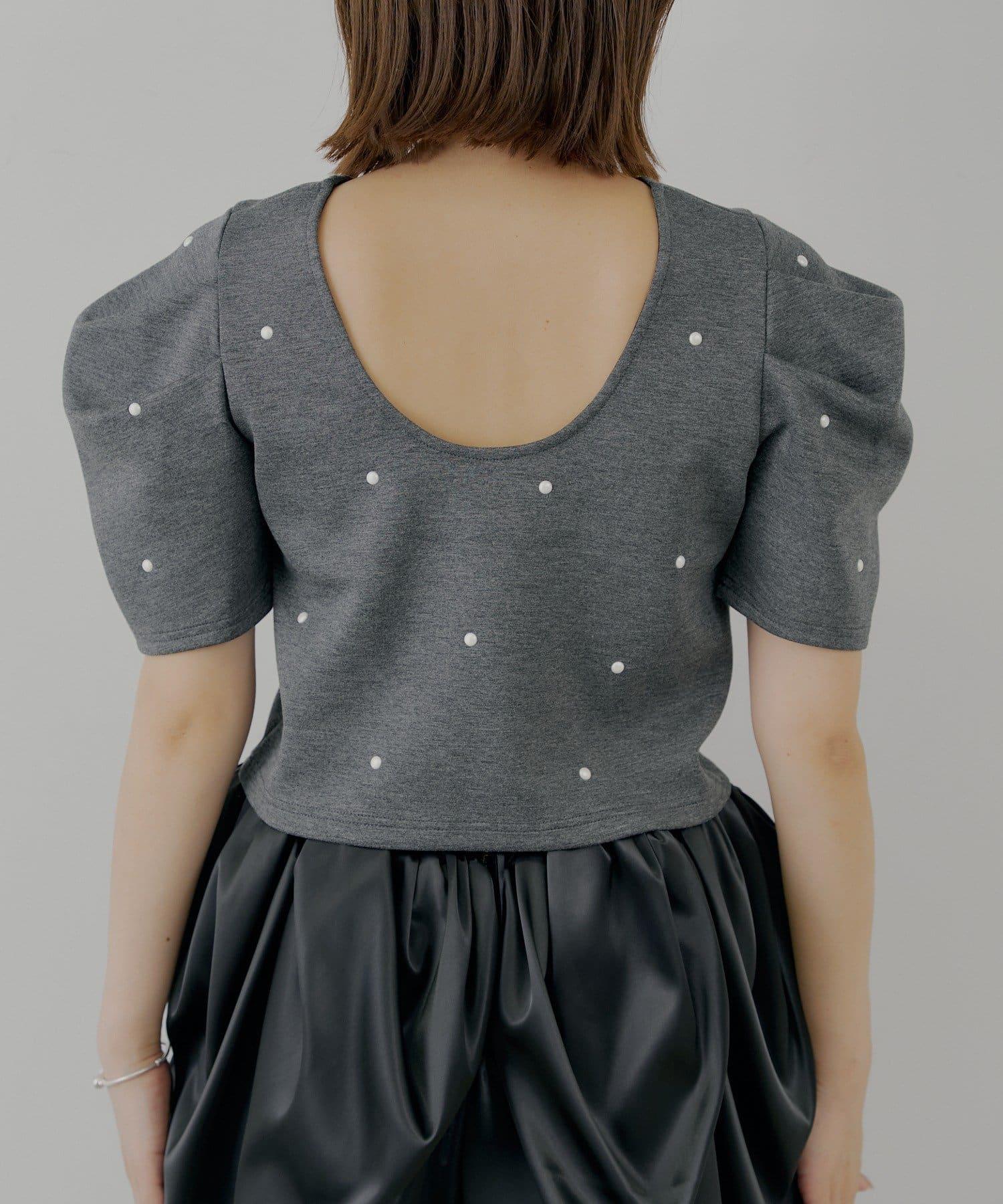 【Chico】後背開口珍珠裝飾墊肩T恤