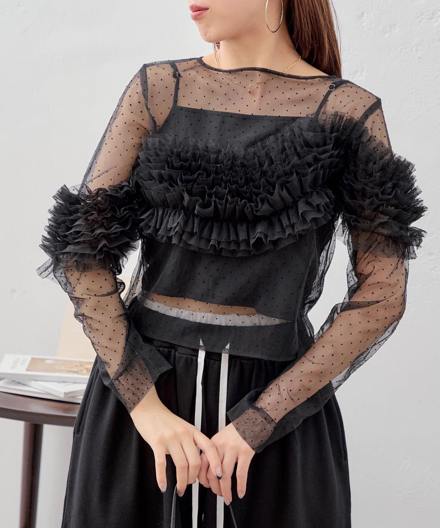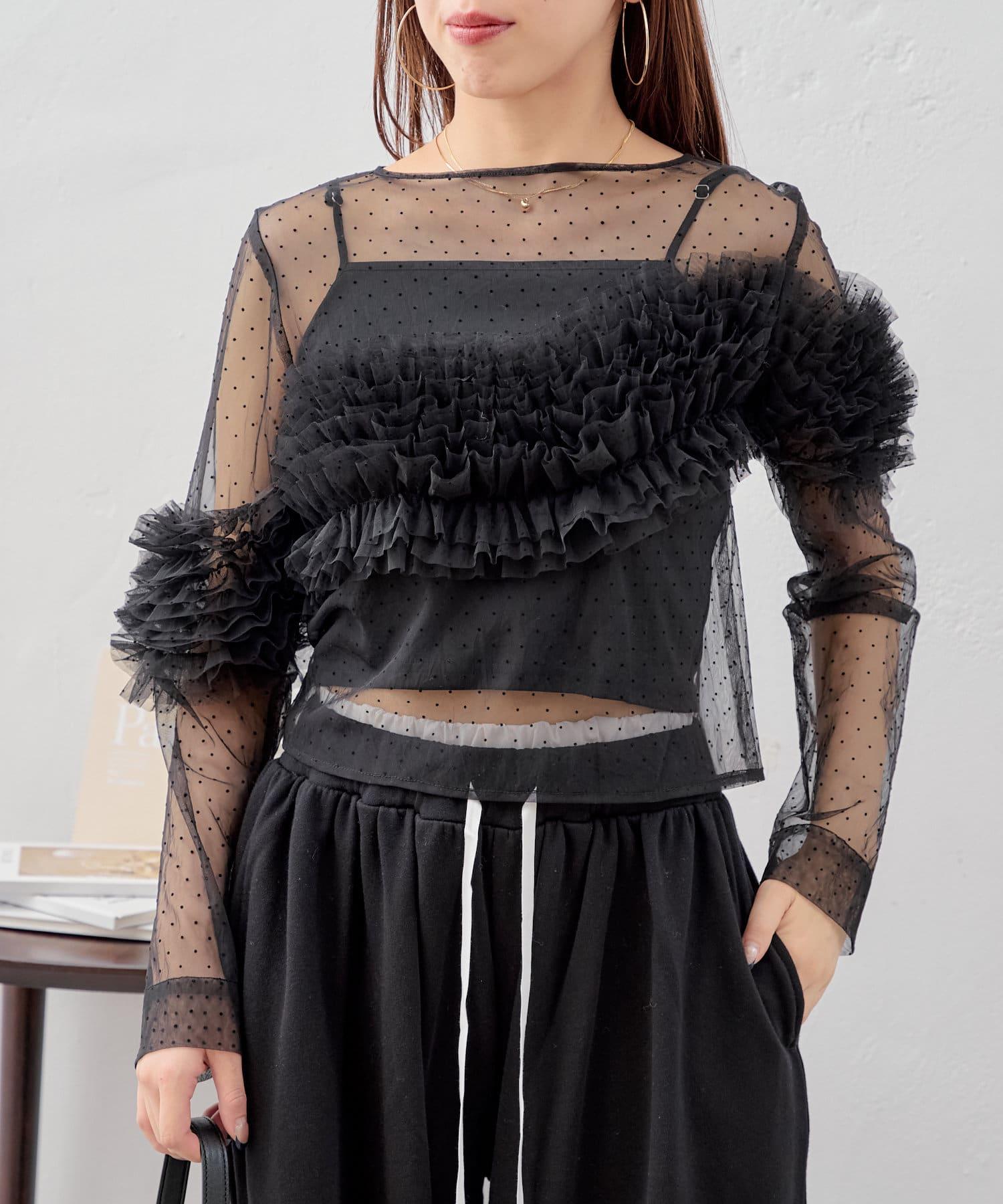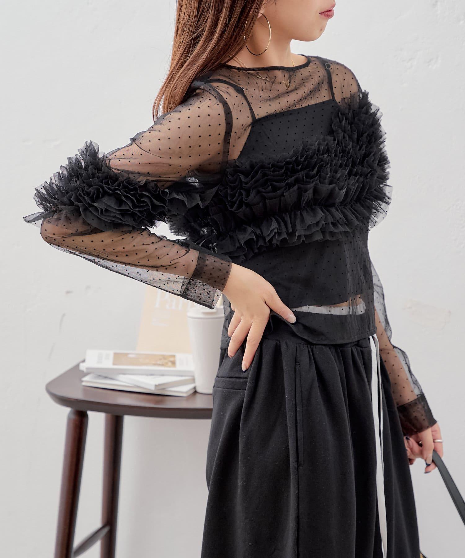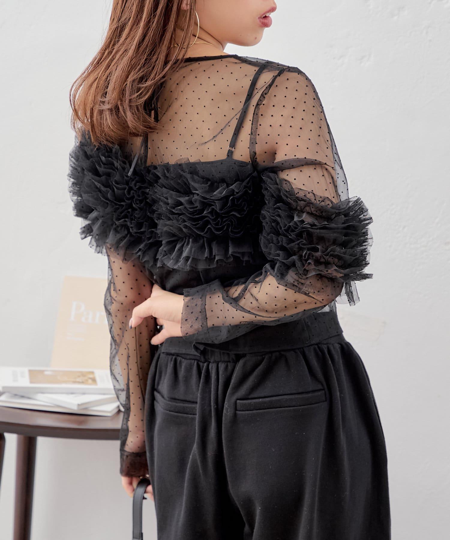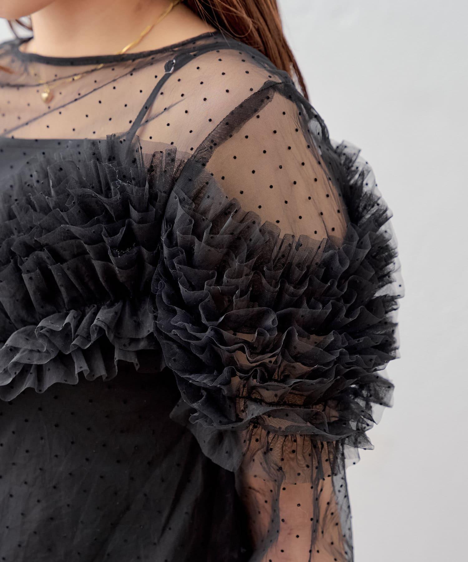上衣採用透視面料,但袖子上的荷葉邊也可以用來遮擋手臂。