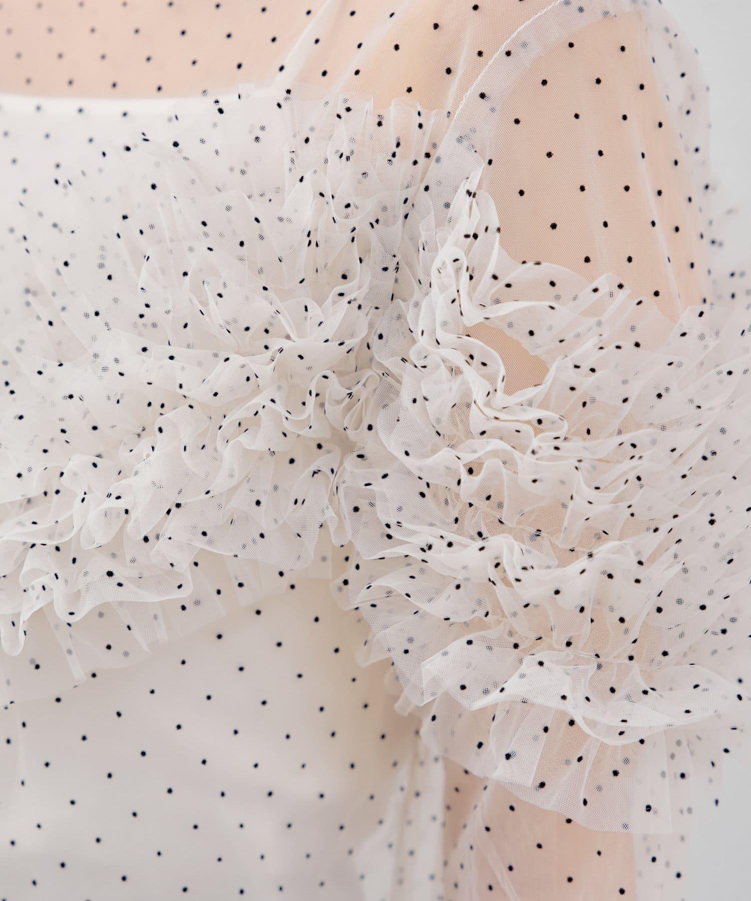 這款上衣採用不對稱的蓬鬆薄紗荷葉邊,非常搶眼。