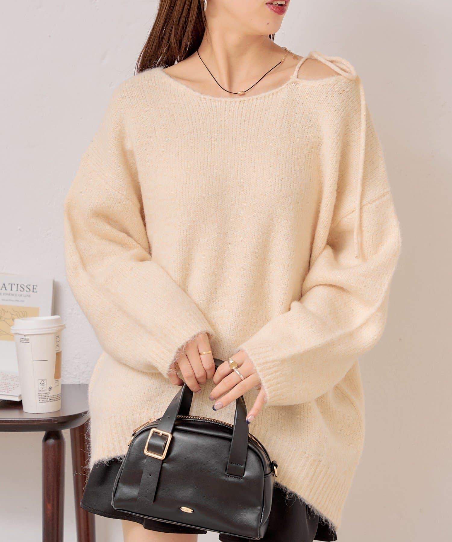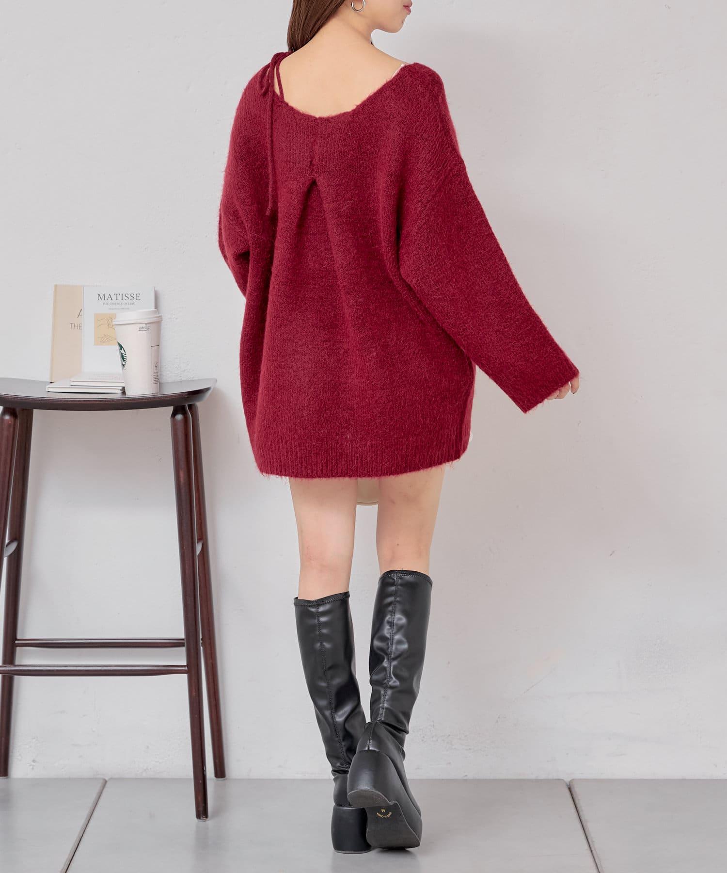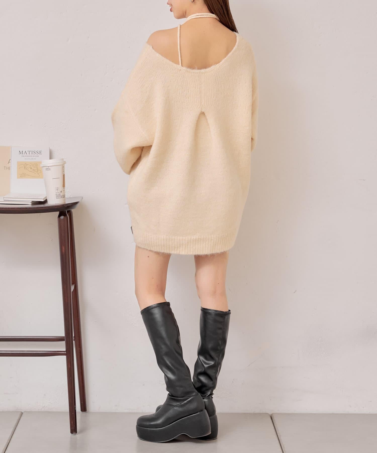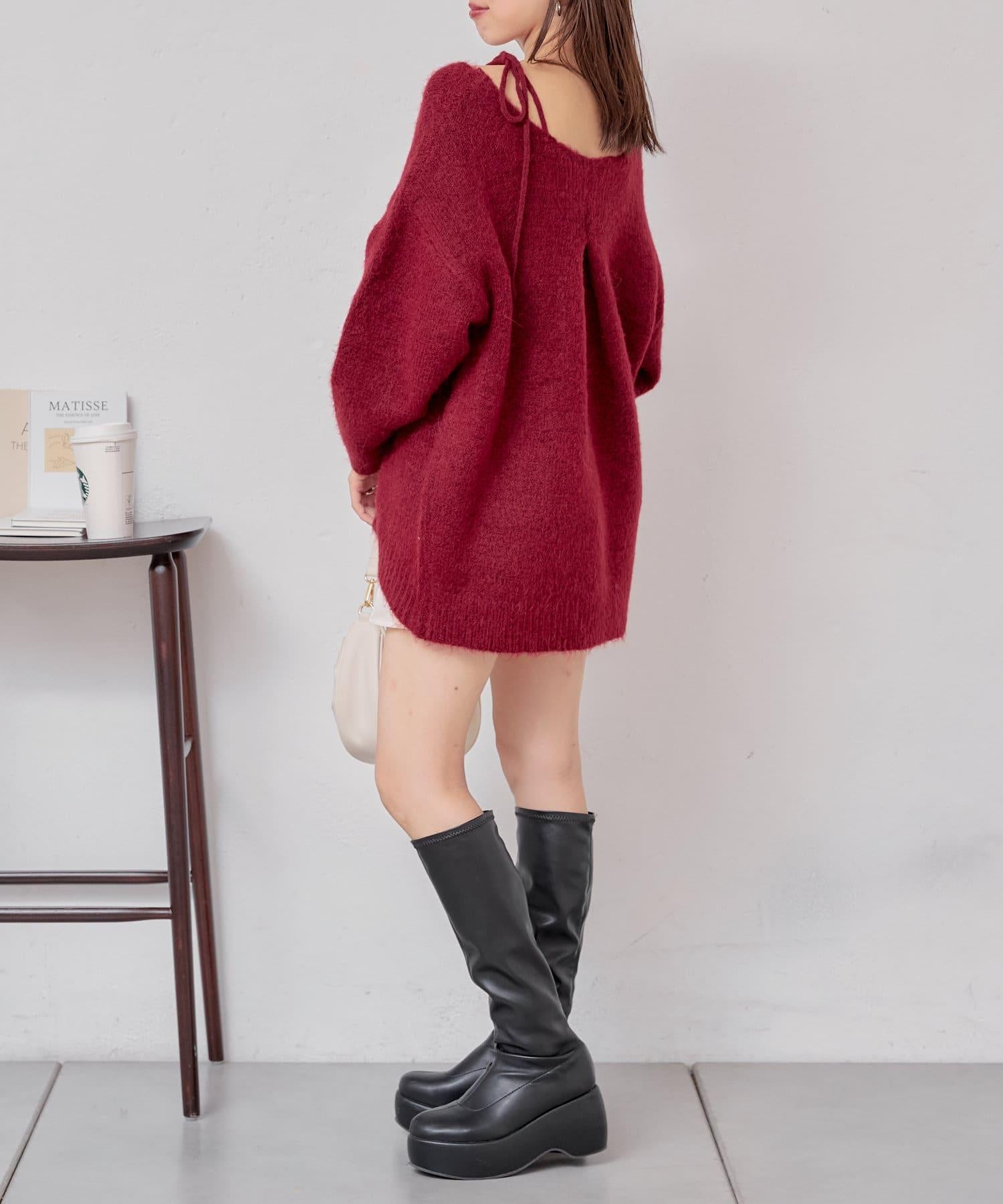 【Chico】肩帶蝴蝶結寬鬆長毛針織連衣裙