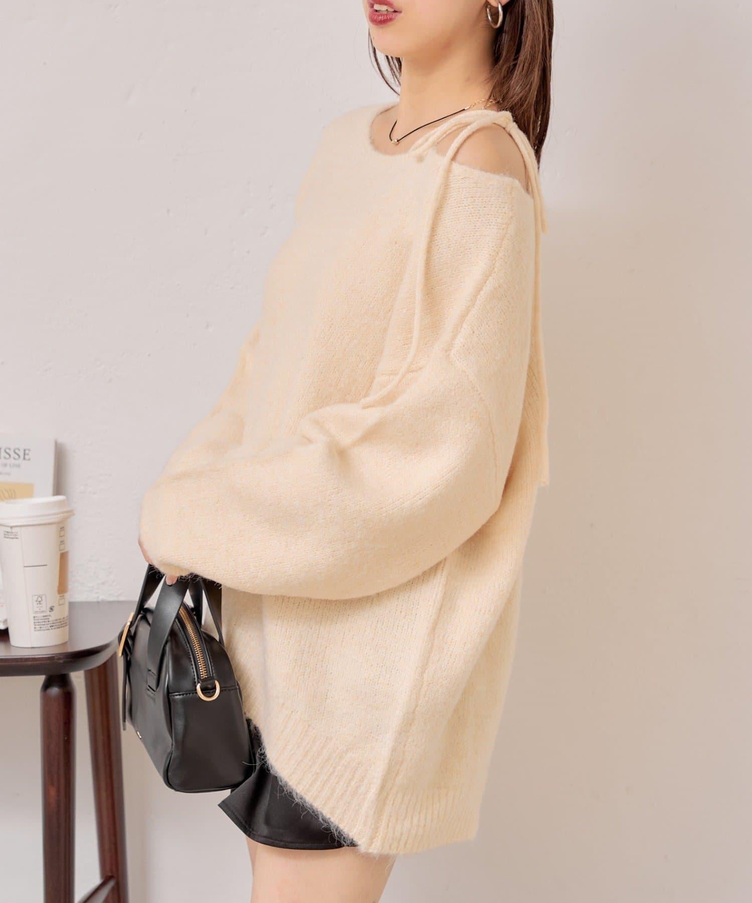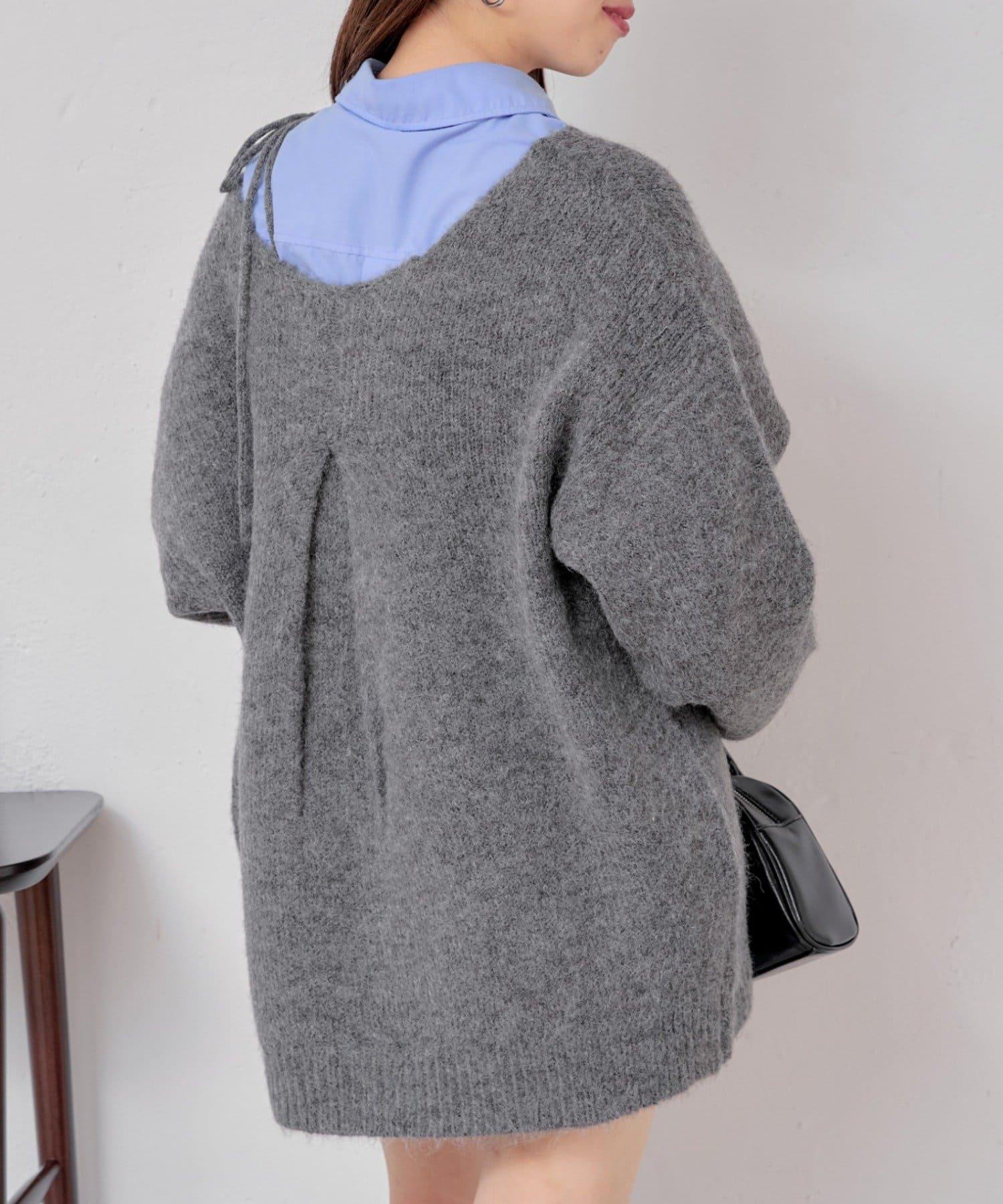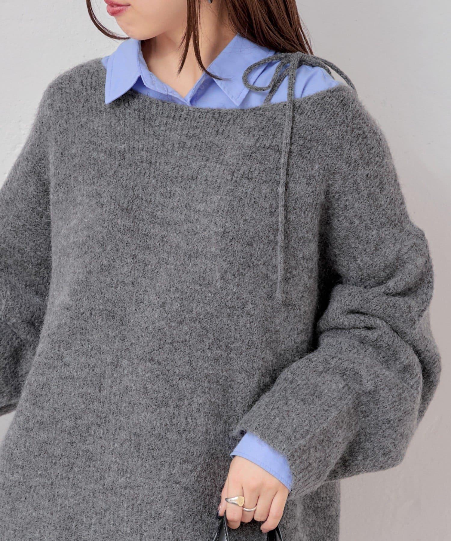 【Chico】肩帶蝴蝶結寬鬆長毛針織連衣裙