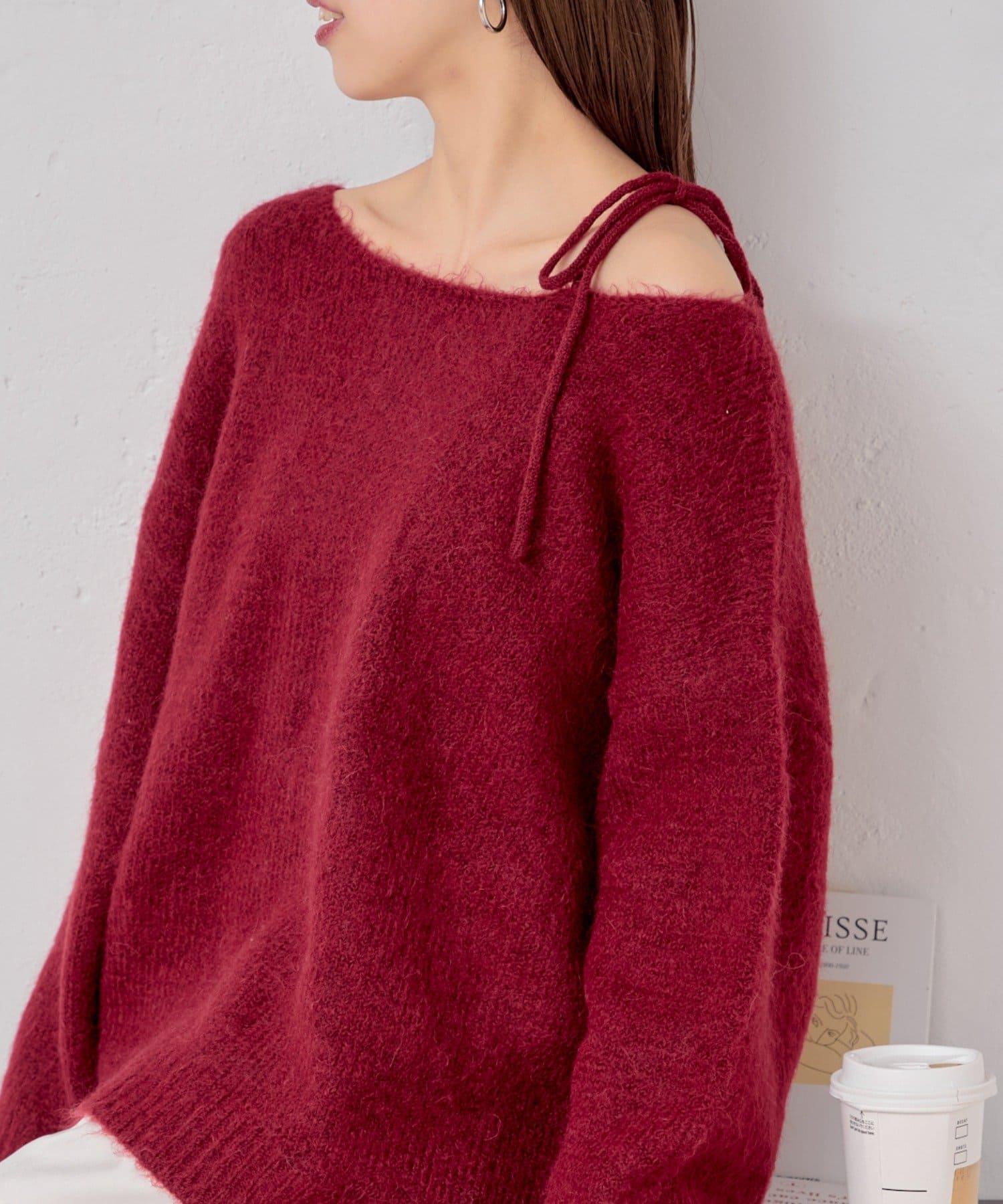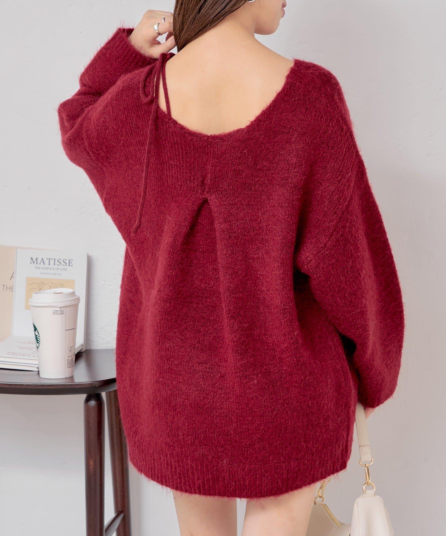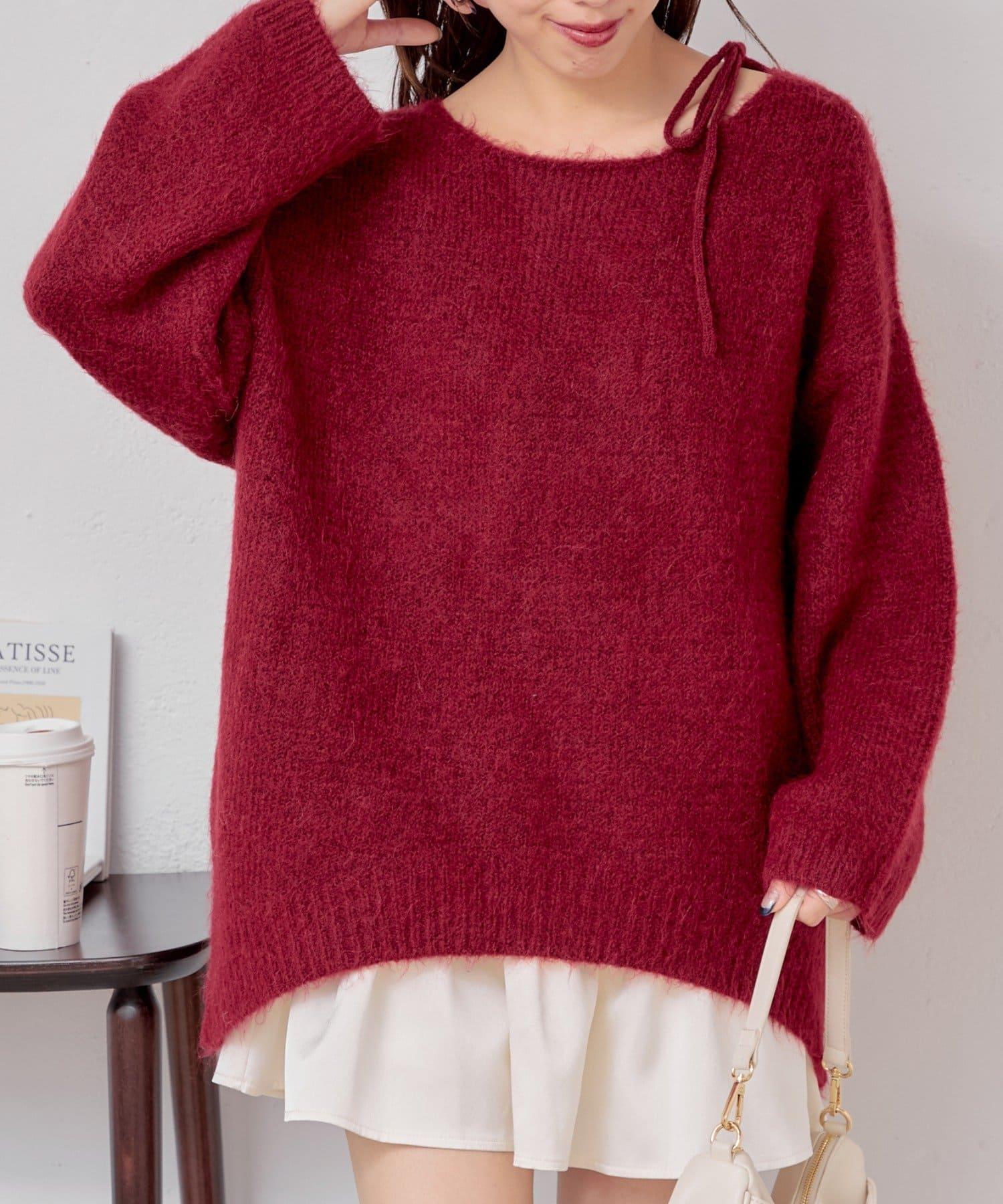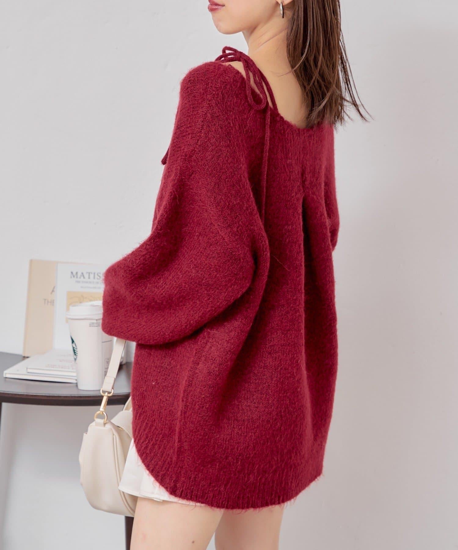 【Chico】肩帶蝴蝶結寬鬆長毛針織連衣裙