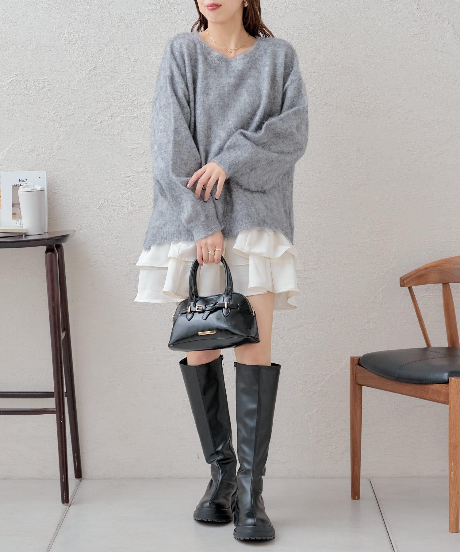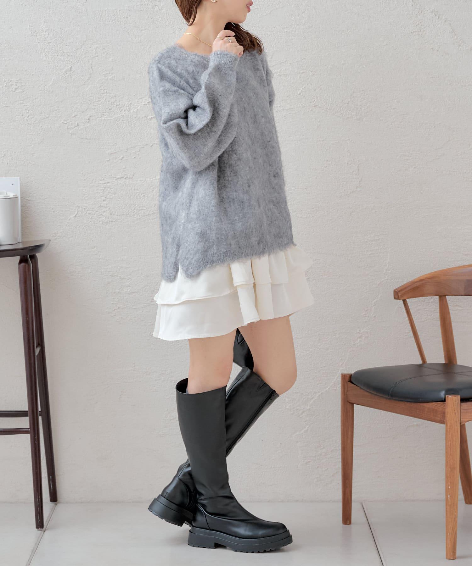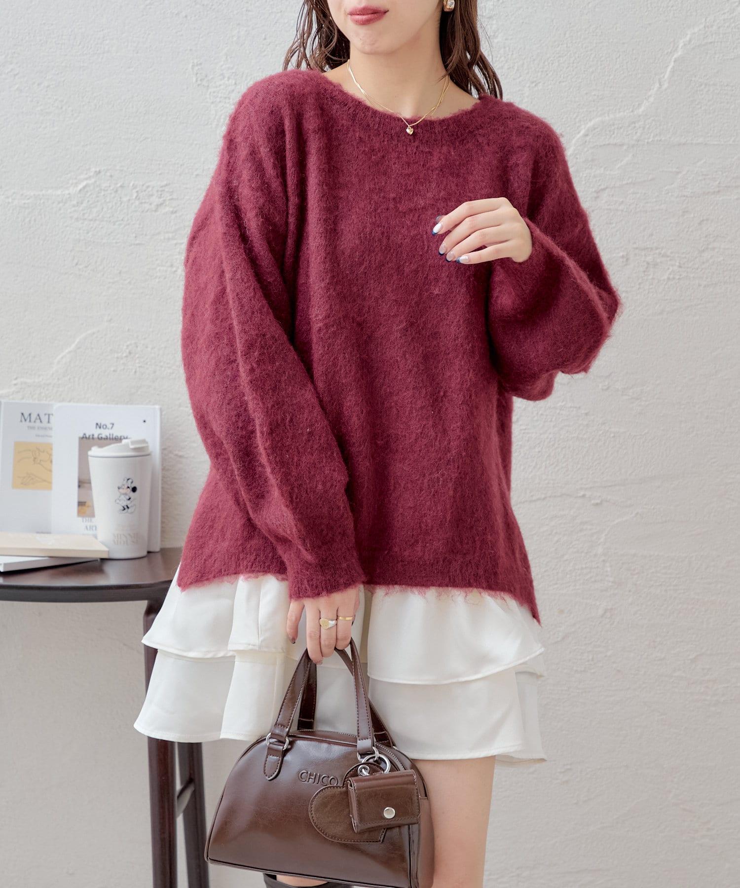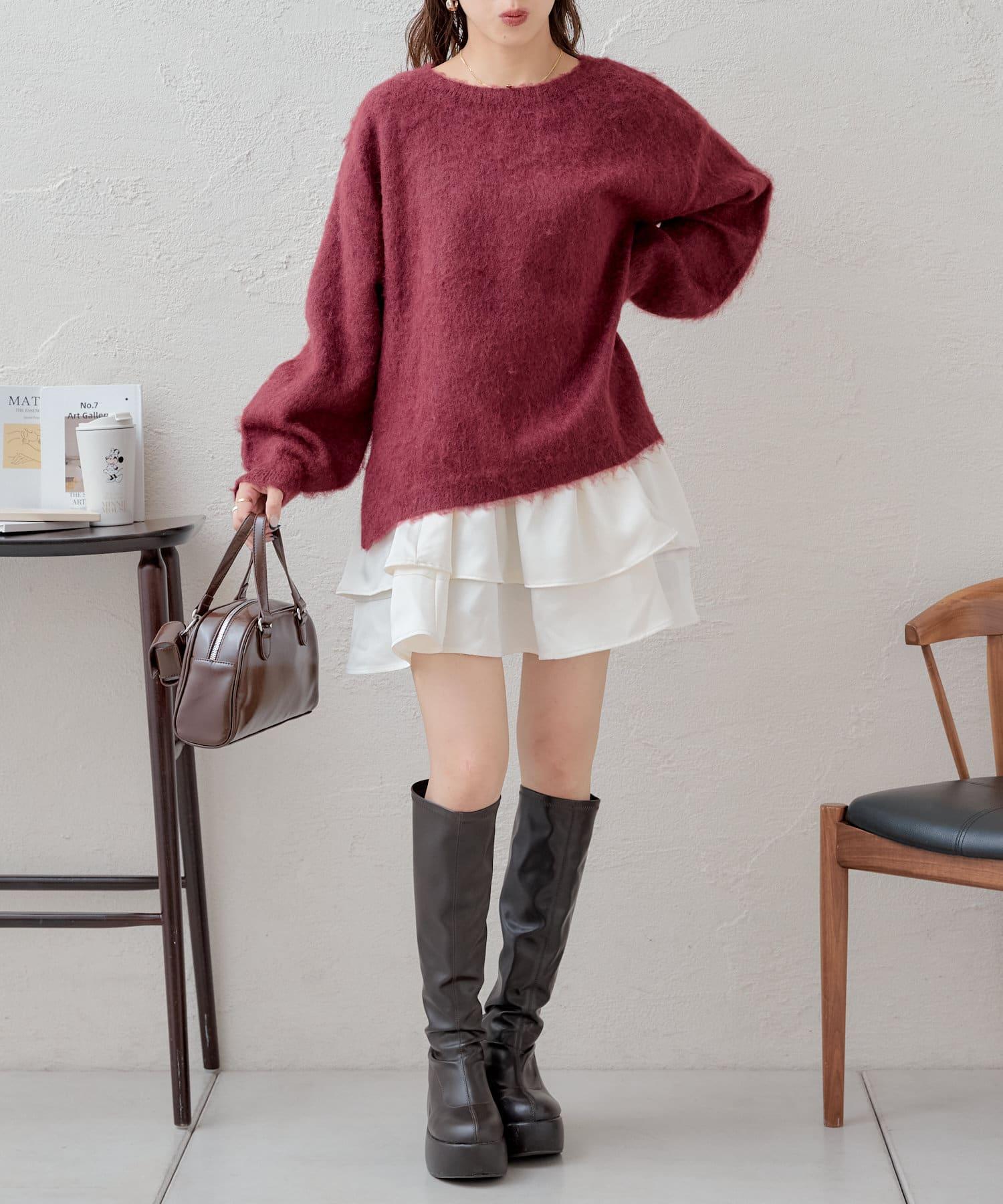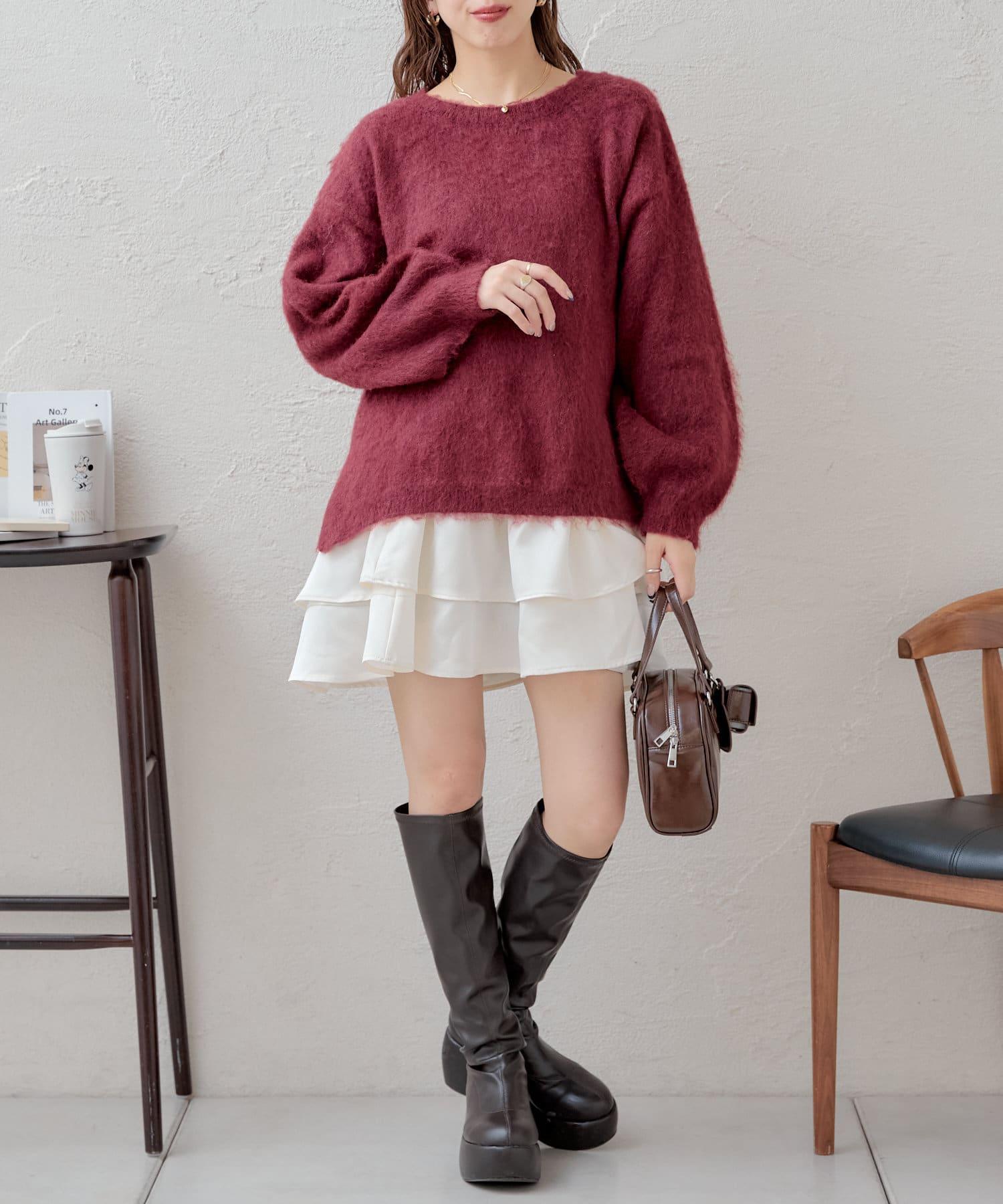 【Chico】長毛寬鬆針織衫×荷葉邊迷你連衣裙套裝