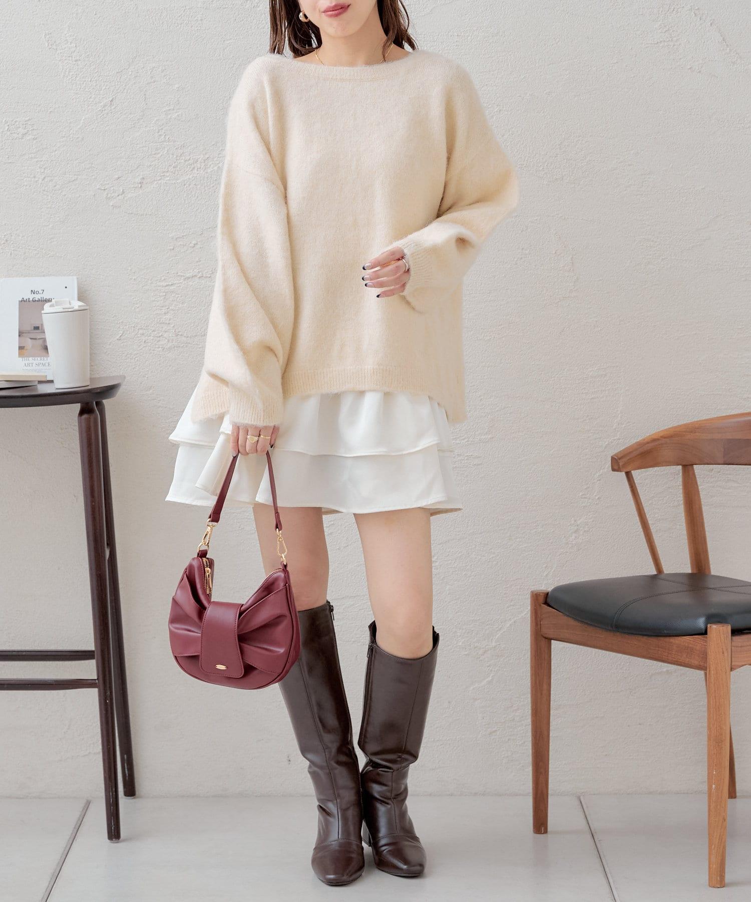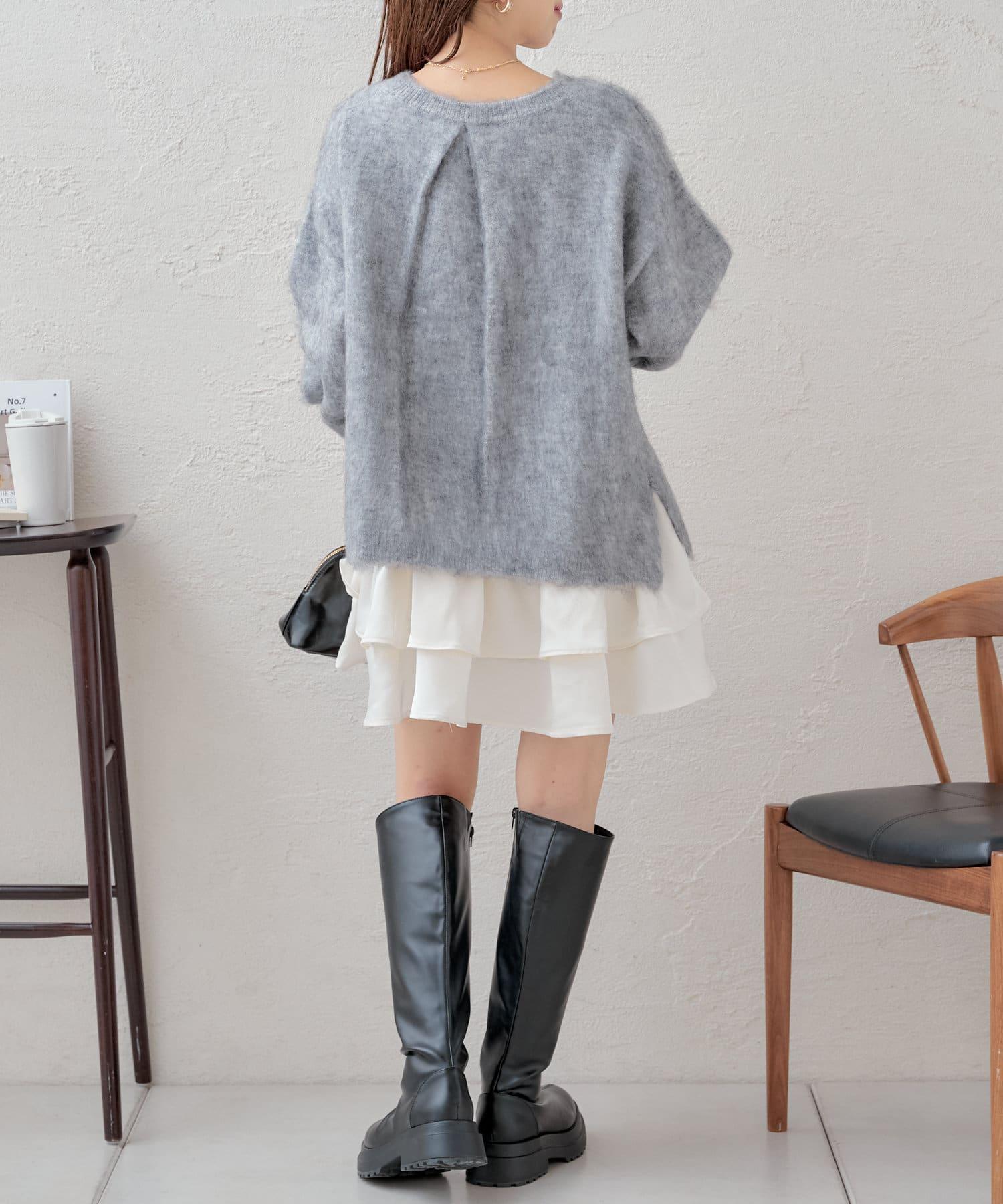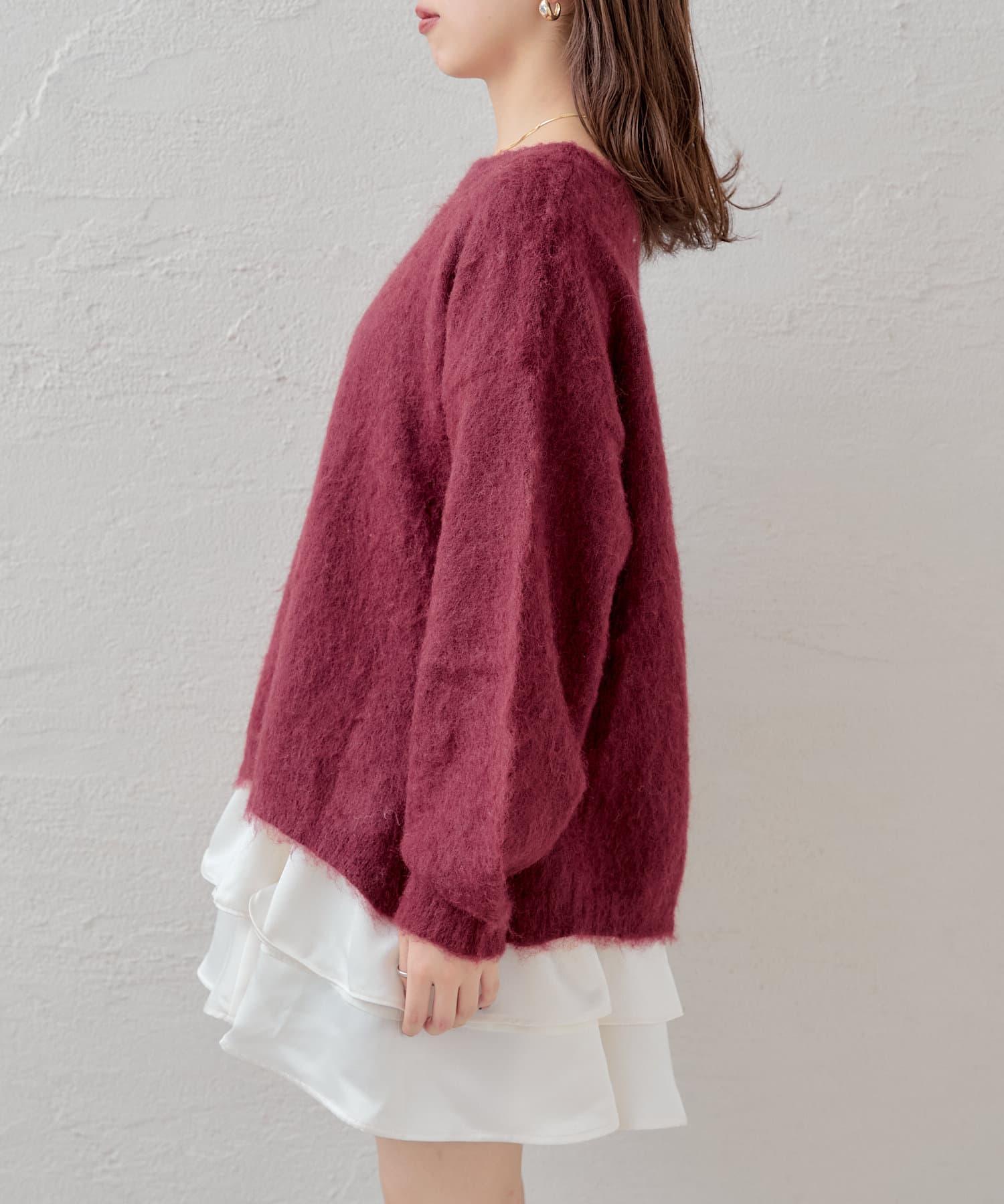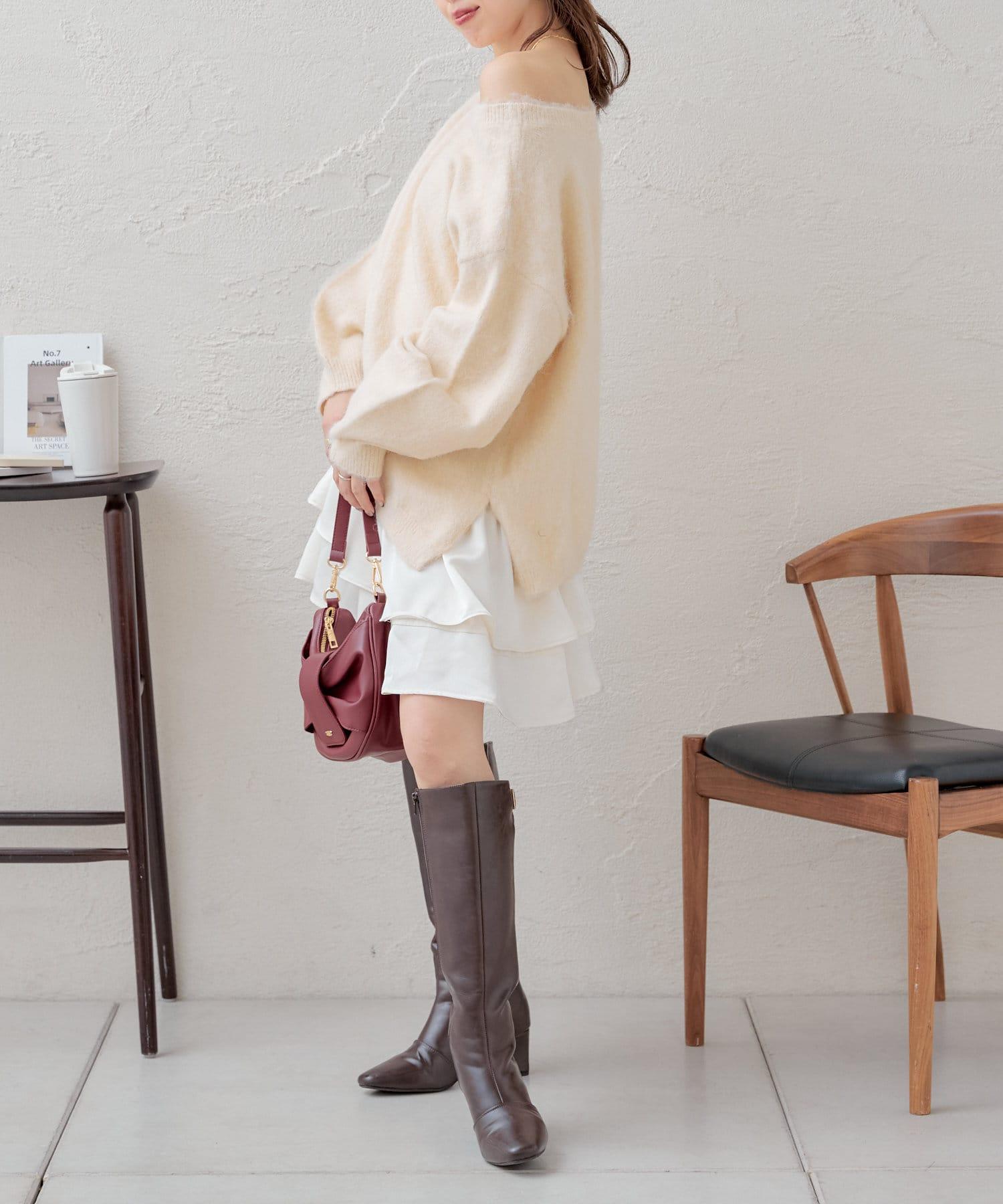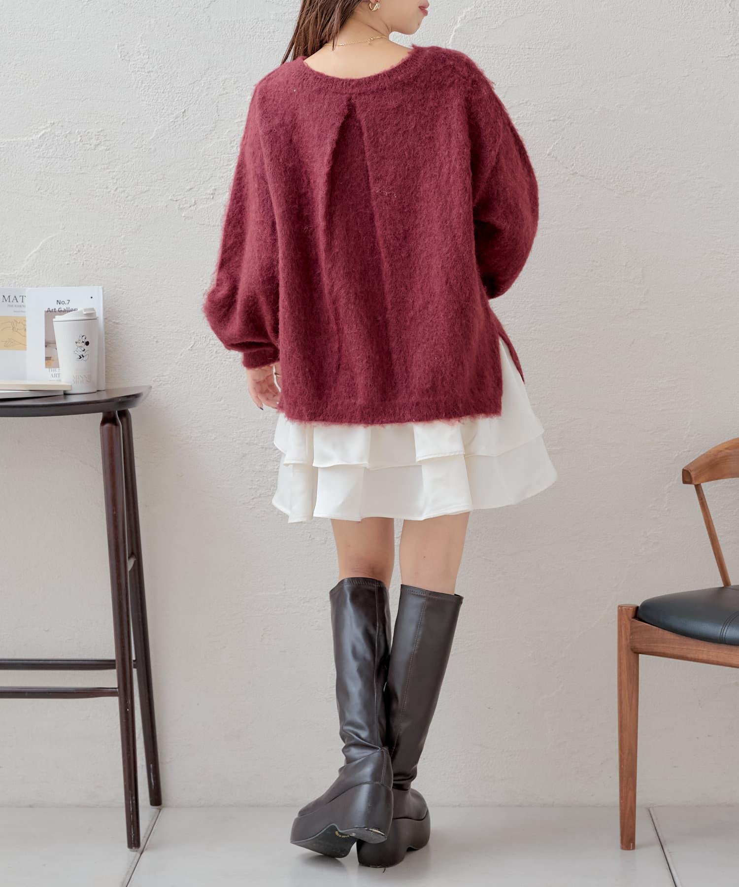 【Chico】長毛寬鬆針織衫×荷葉邊迷你連衣裙套裝
