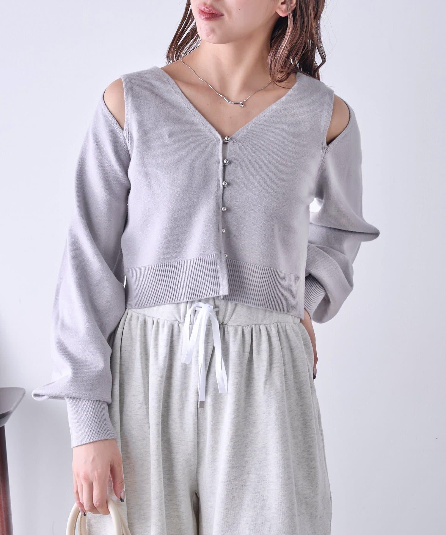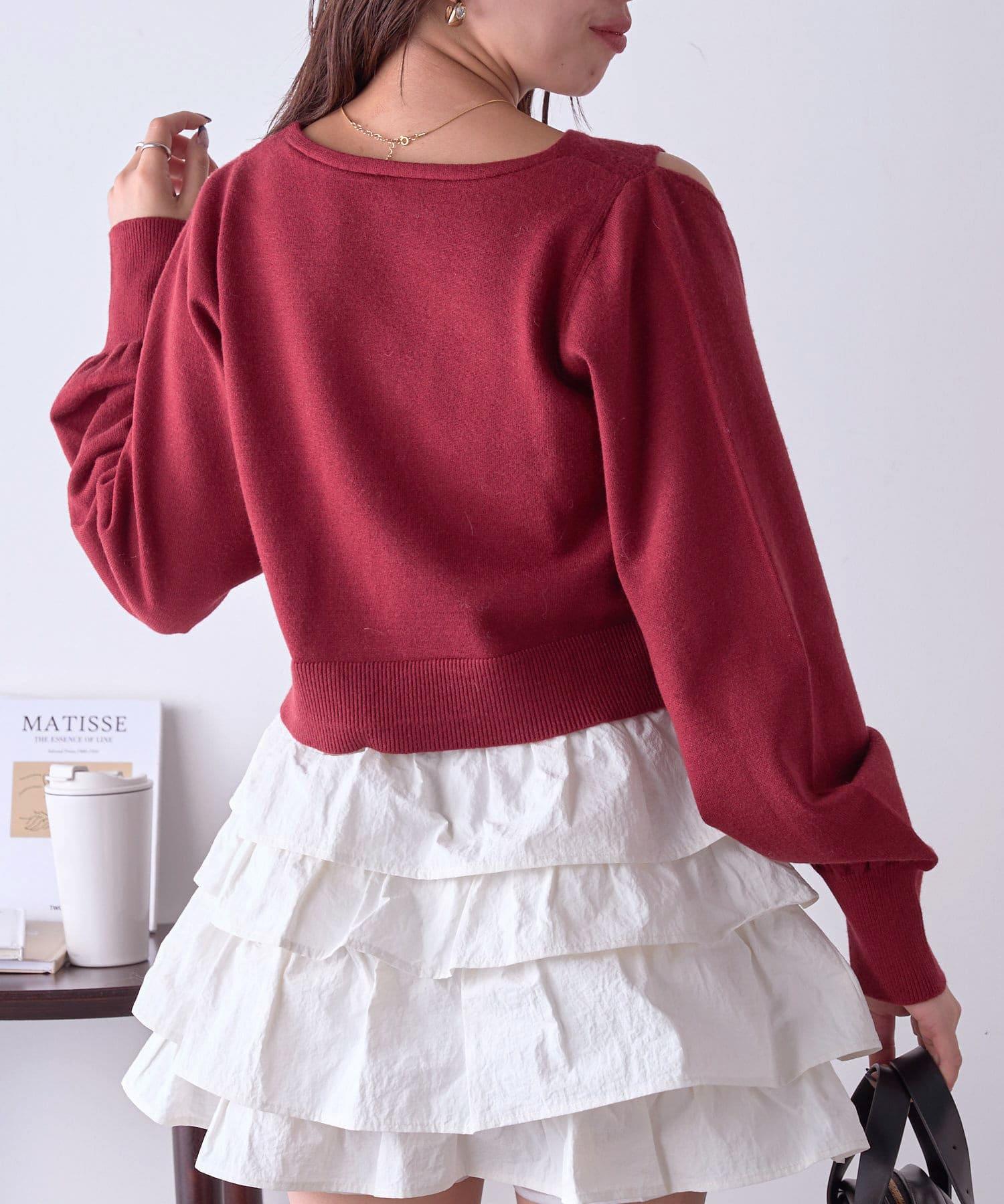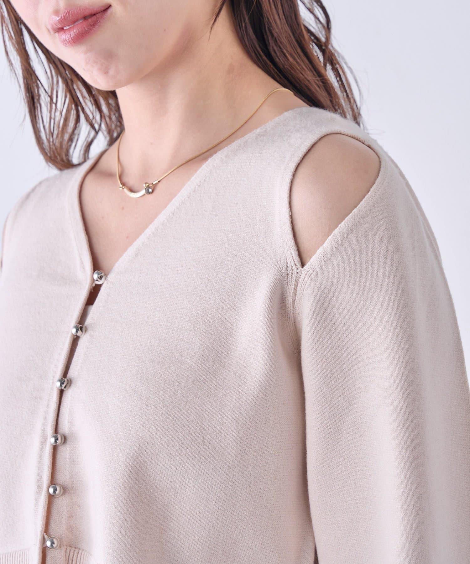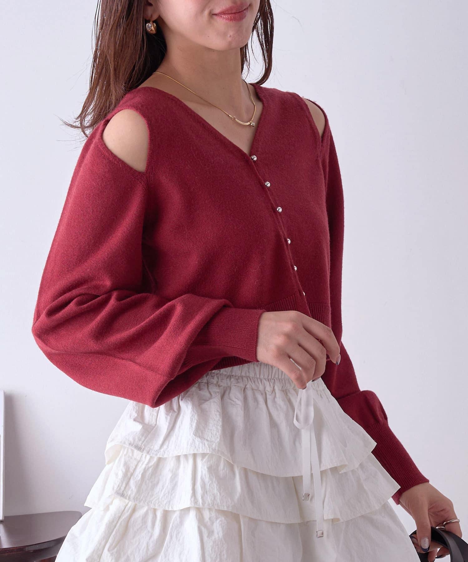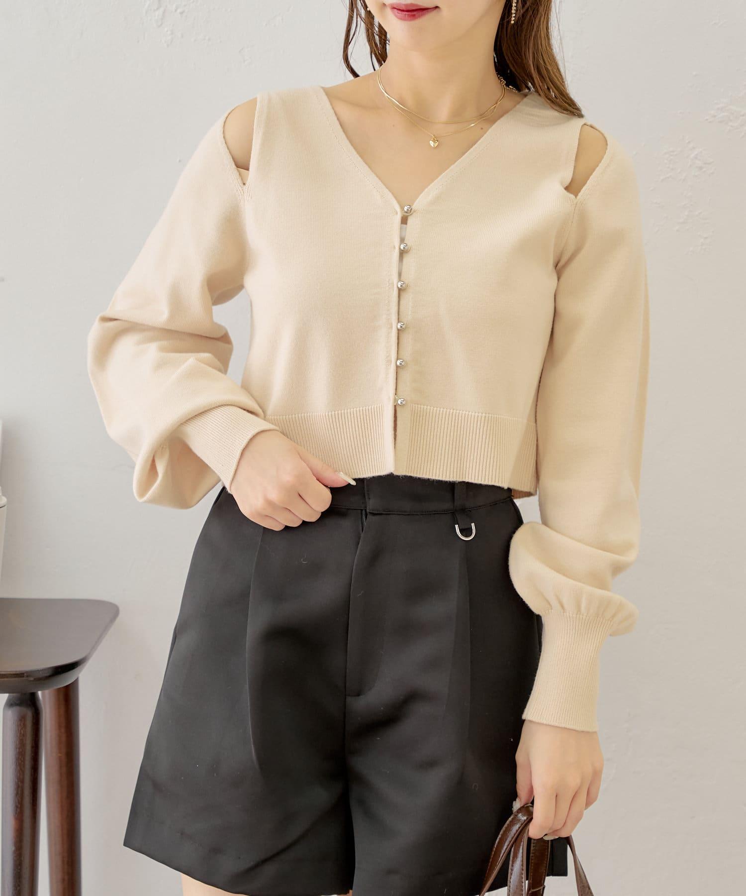 針織開衫採用開肩設計,恰到好處地展現出肌膚的完美曲線。
